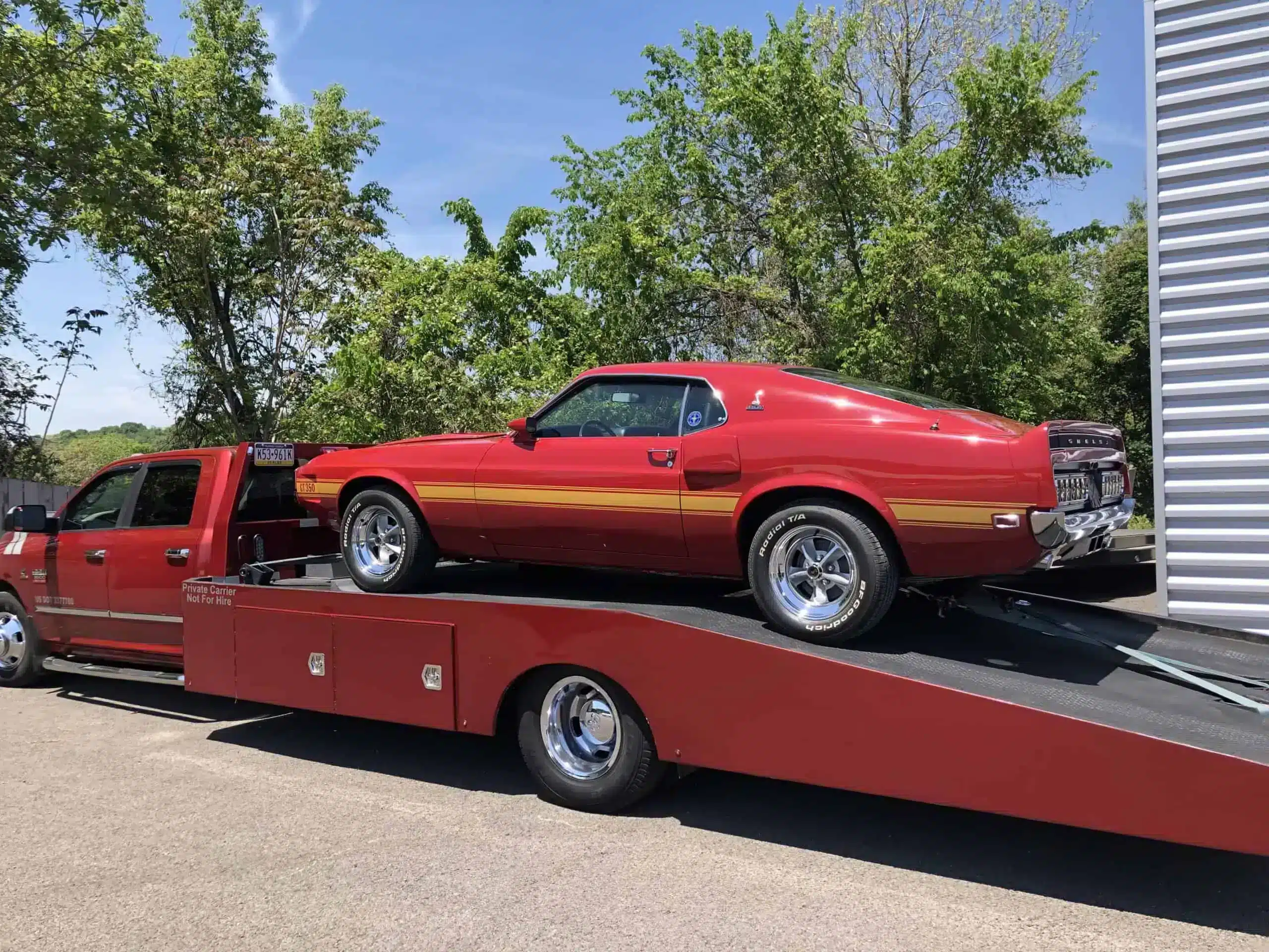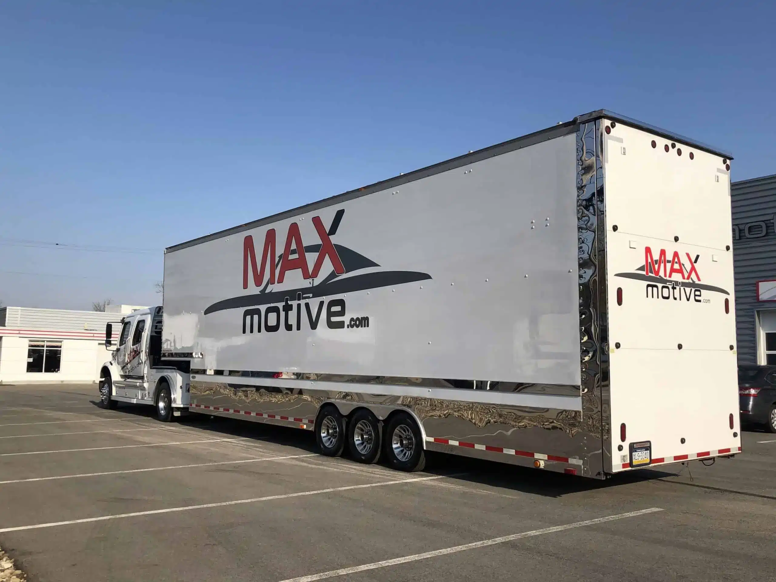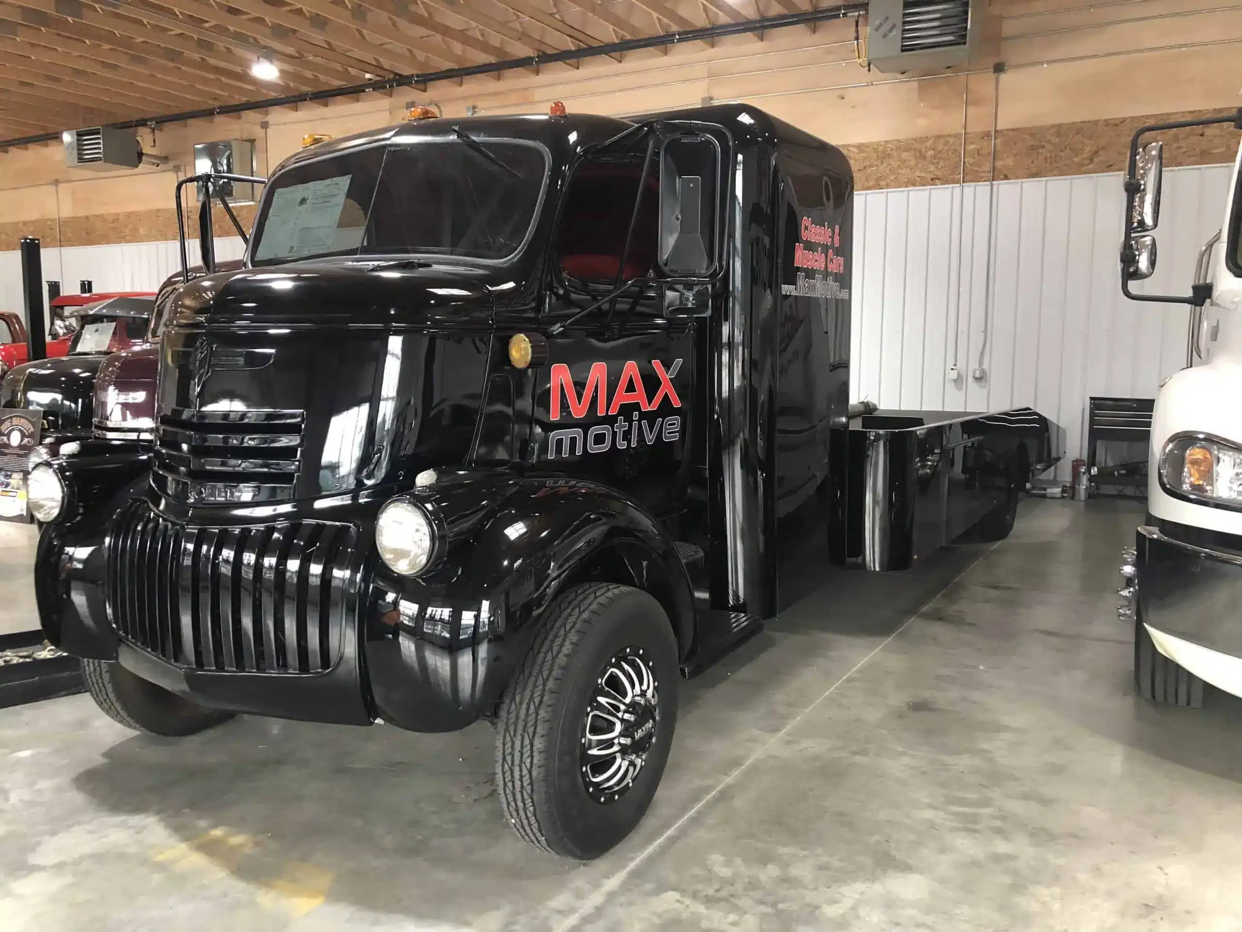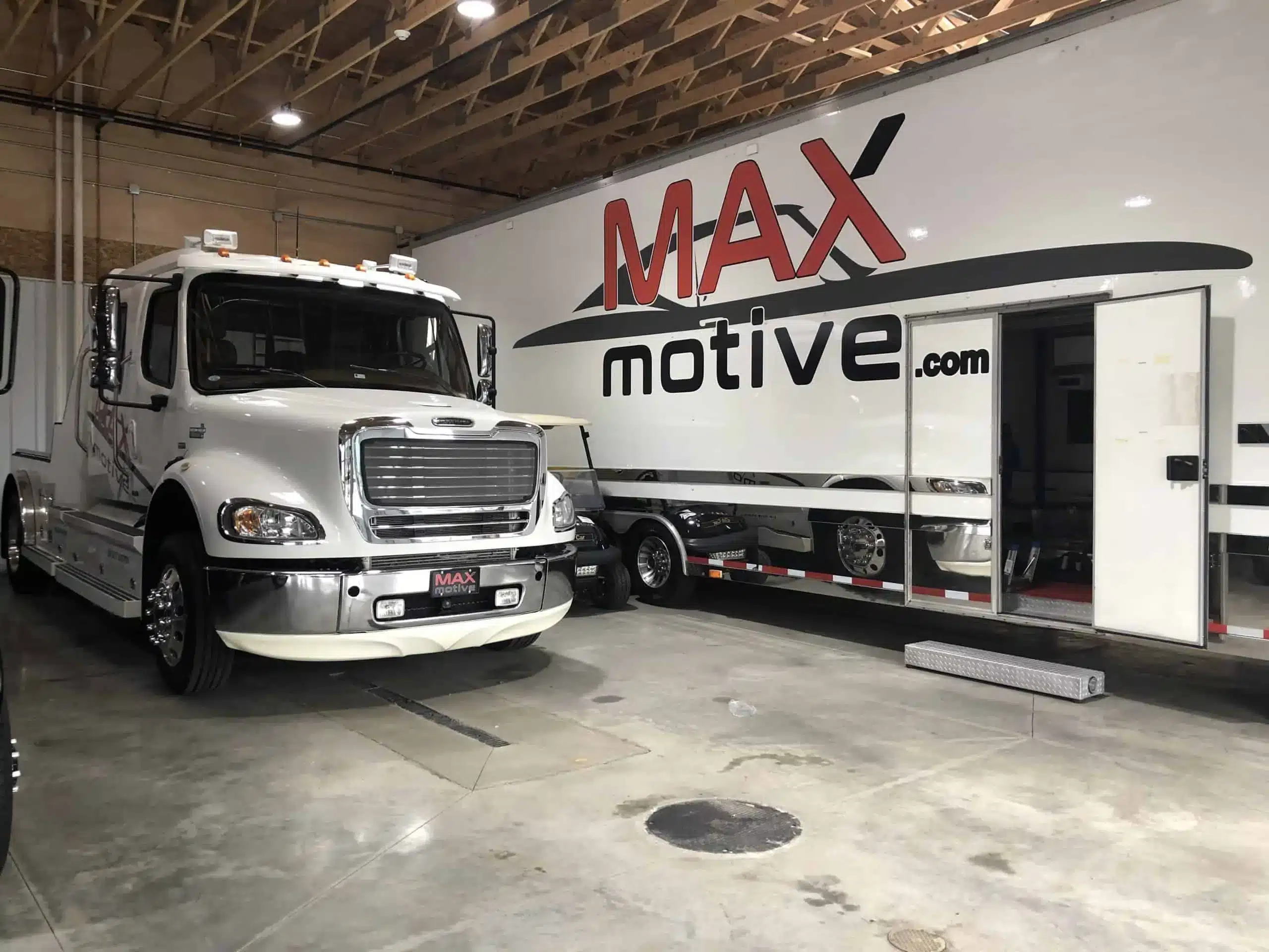 So what’s it like inside one of the higher end deals? The Maxmotive transporter is a Freightliner M2 Business Class with a Renegade stacker. The truck is just plain luxurious with its supple ostrich leather interior and beautiful cherry wood trim. It’s loaded with power options and a back-up camera. It’s stored inside and driven just 2-3 times a year. The trailer is a Renegade with A/C, lift, room for 3 cars, and fresh Hankook tires. The truck is a plush Western Hauler conversion with polished Alcoa wheels. Mr. Maxwell has just announced that it is available for sale. Your dream deal could be right here.