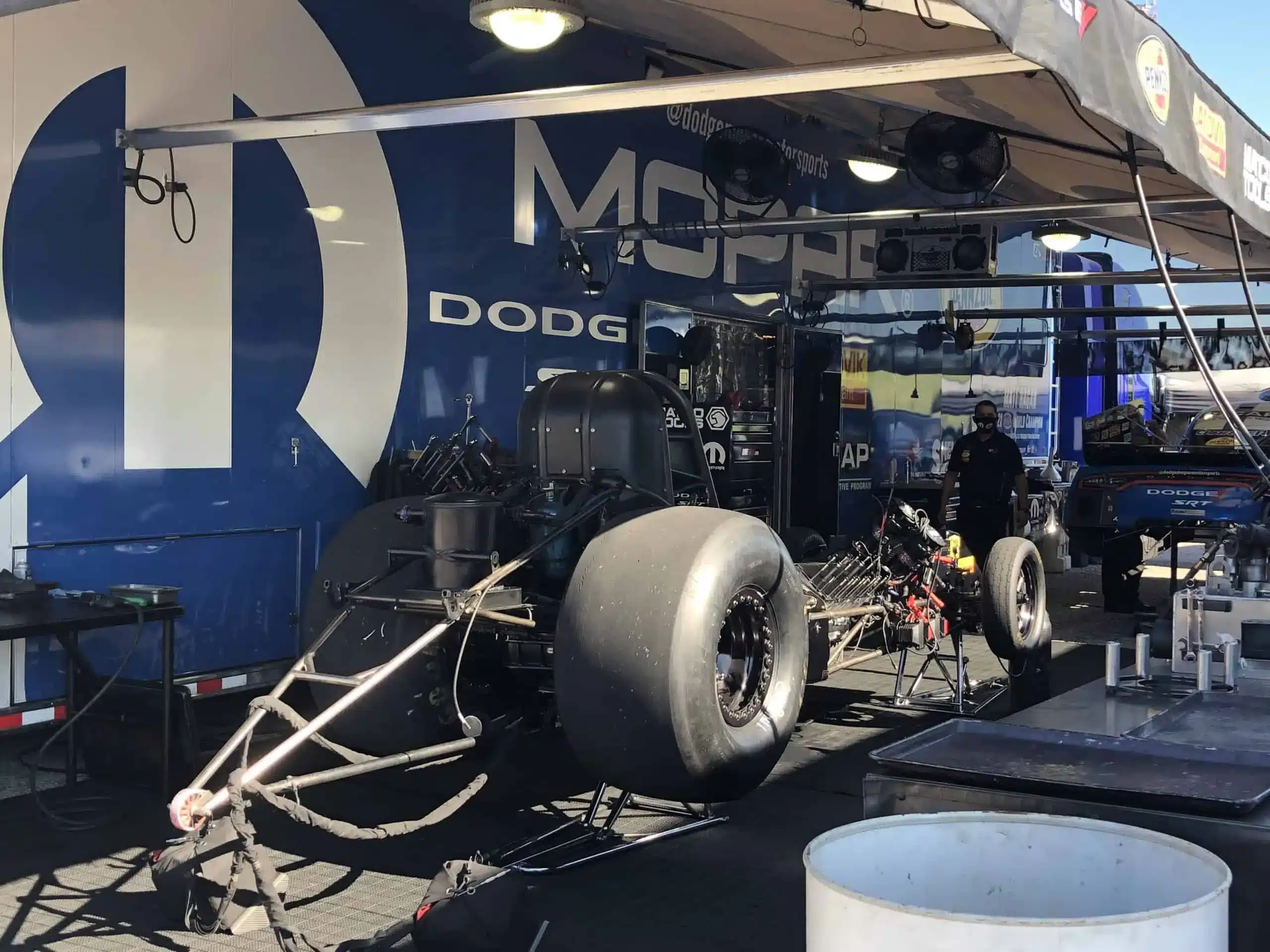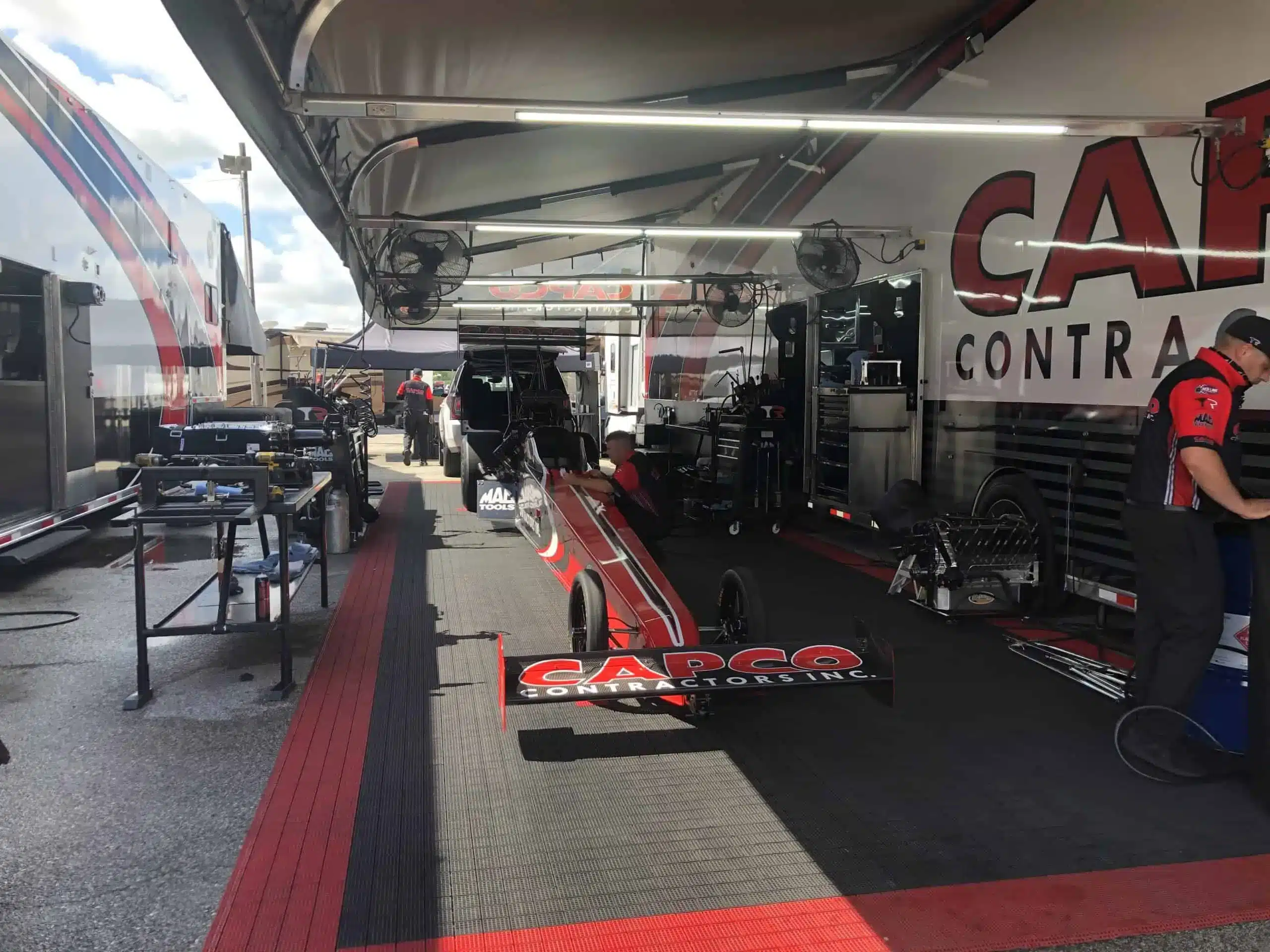 In many ways, the right race rig is a true competitive advantage. First is the statement it makes. When you pull into your pit spot and those air brakes release, everyone knows a serious competitor has just arrived. Secondly, it’s a shop on wheels. Generators and air compressors make all levels of repairs and maintenance possible right on site. You can run your car hard knowing repairs can be performed and extra parts are on hand. I saw one Pro Stock team with no fewer than 15 third members in their trailer. The hauler becomes a shop, lounge, restaurant, and motel. And it’s an impressive billboard for sponsor logos, colors, and messages.