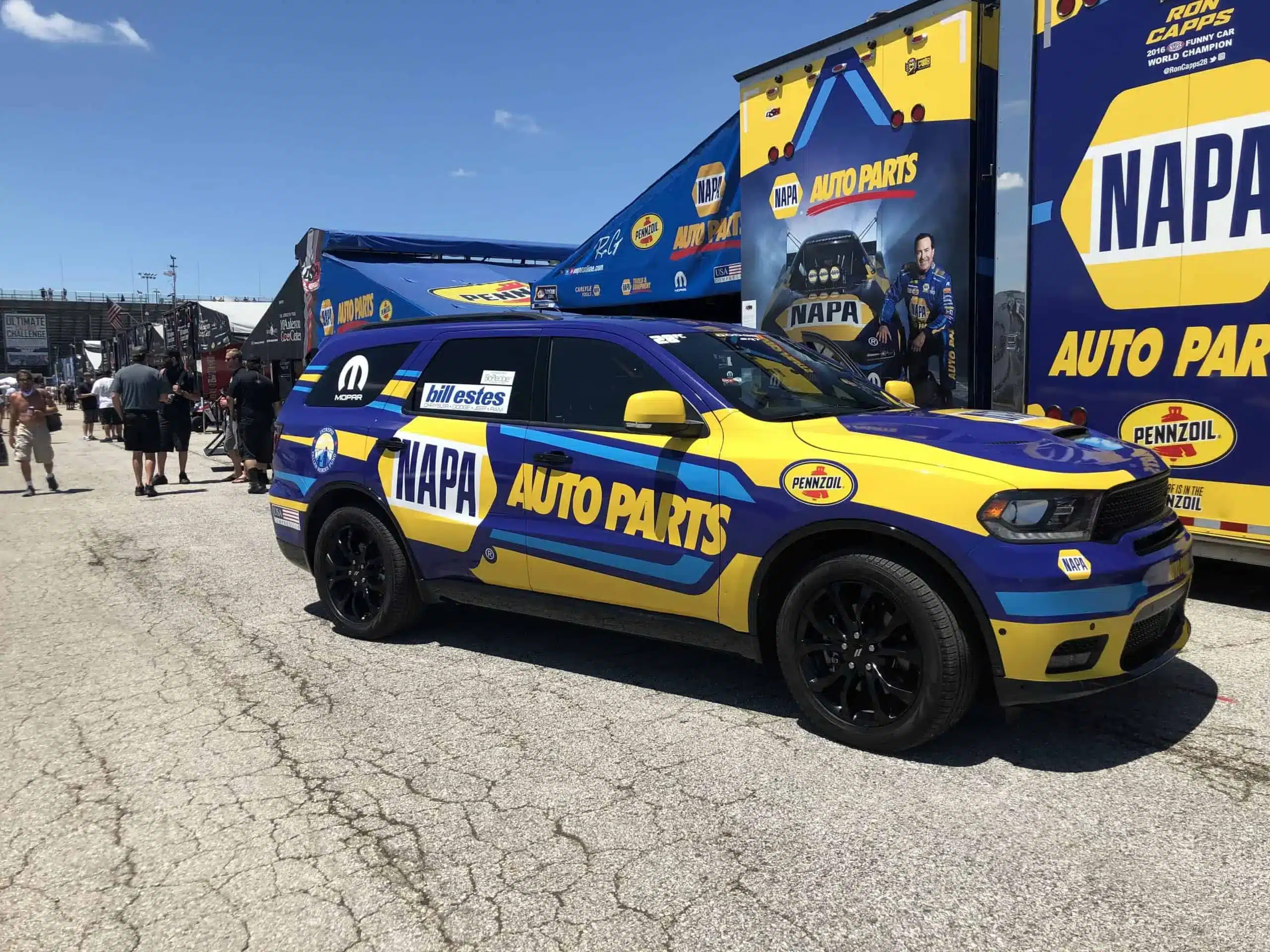 “Race Car In Tow.” In the early days, racers would flat tow their cars to the track. The only thing that made it a tow rig was a tow bar and the sticker on the back warning other drivers on the road that the vehicle they were following was being pulled by the vehicle in front of it. Soon the pros began bringing their cars on trailers, and there was more than a little bit of status associated with it. Funny Car teams used ramp trucks. Before long, with racers being the competitive lot they are, trucks or trailers that were enclosed became the rage. The big names favored the Chaparral fifth wheel rigs. Prudhomme, Blue Max, Mongoose, and many others had these. The classic Chaparrals were heavy but they could last a real long time and go lots of miles. The pits would be abuzz about who had the nicest rig. Then it happened. Billy Meyer showed up with an 18-wheeler. A major challenge for organizers today is where to park everybody. Multiple-car teams, hospitality trailers, technology trailers, toter homes, and motor homes with stacker trailers are all vying for prime spots.
