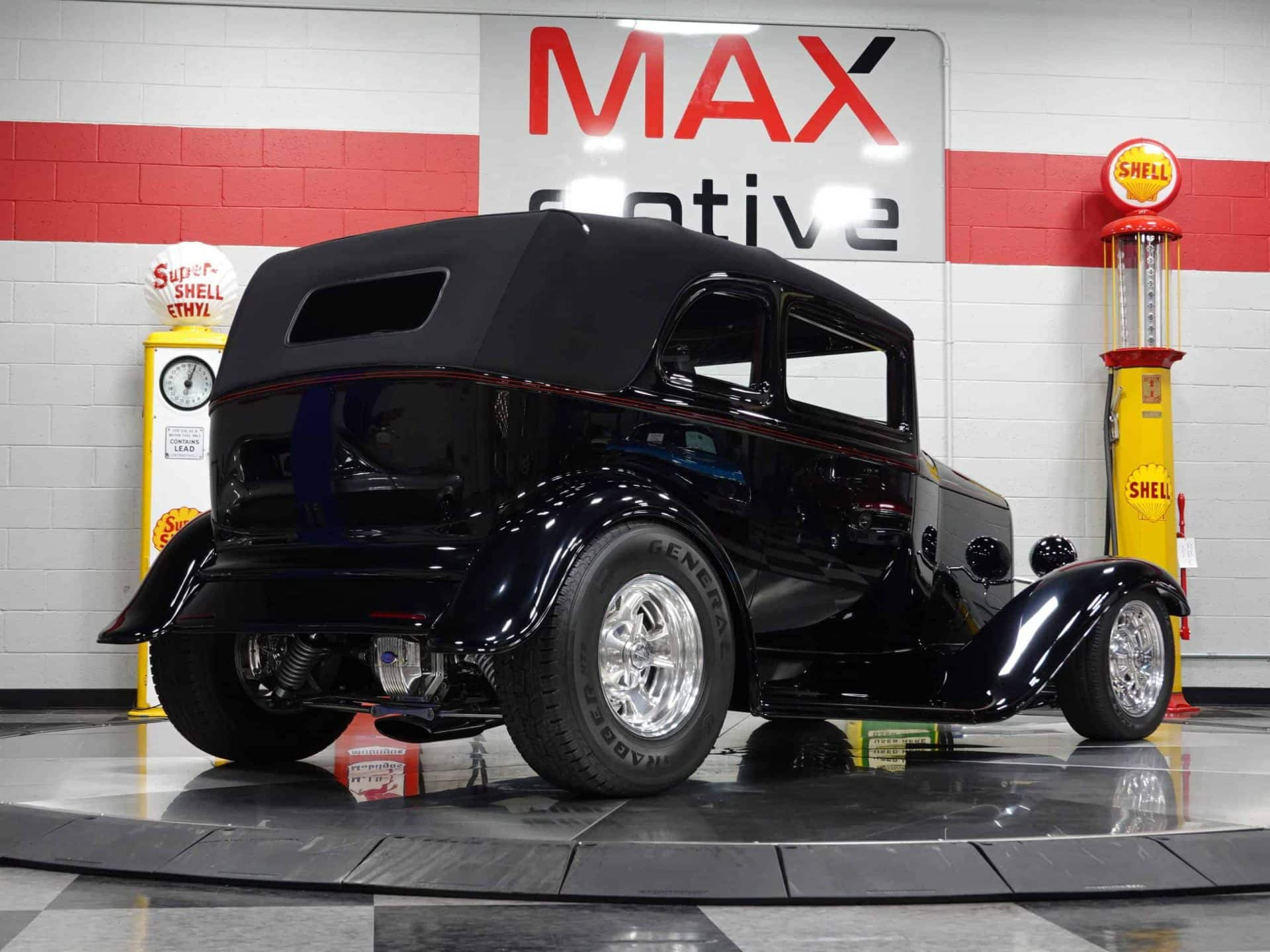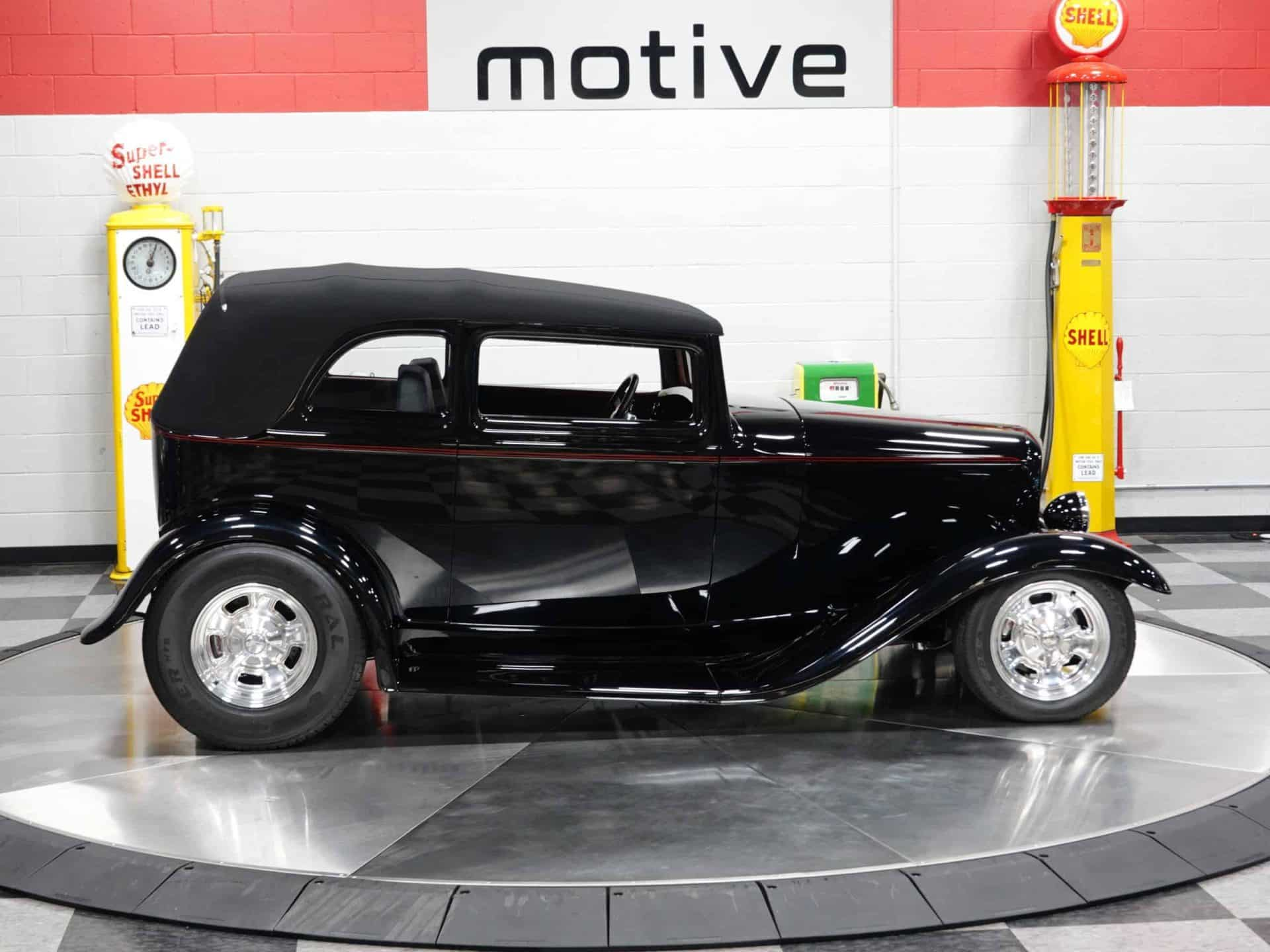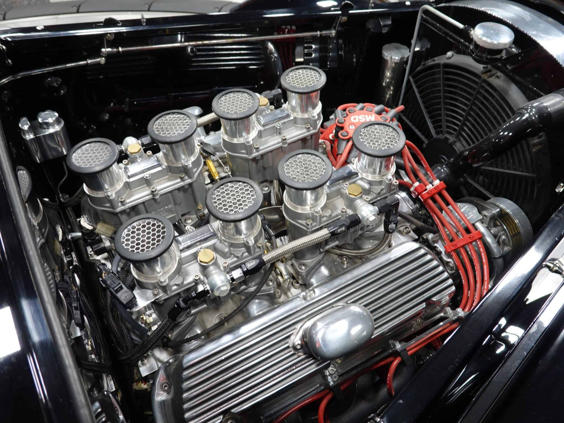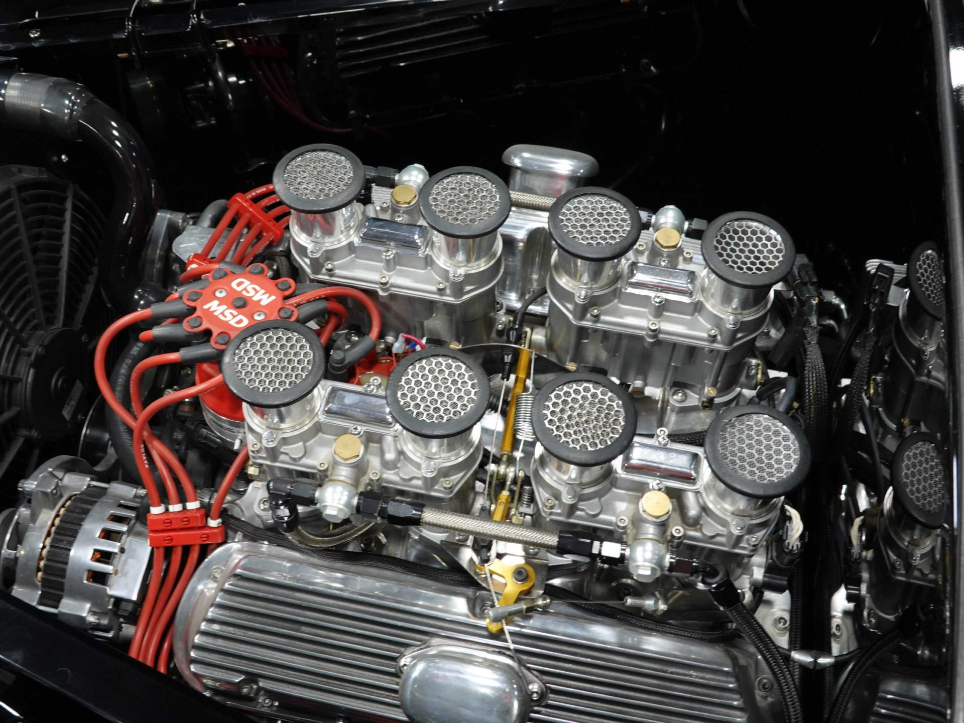 “This was one of the last cars Boyd had his mind and hands on before his passing. And just like all his projects, this ‘32 utilizes only the best products, and greatest depth of skill available.” – Roger C. Johnson. This is the car that became known as “The Master’s Last Hod Rod” after the untimely passing of master builder Boyd Coddington. Boyd was indeed a master, building cars for star personalities and launching the careers of the likes of Chip Foose, Jesse James, and Larry Erickson, Chief Designer of the Mustang and Thunderbird at Ford Motor Company. You would expect the product of Boyd’s many successful years of design and building experience to be something special – and it is. Boyd personally took the car to 90% complete status. Then, as a tribute to the legend, some of the greatest names in the custom car industry brought it to completion. The body was recreated by Coddington’s Shop of Wonders with help from Marcel’s Custom Metal Shaping, creating a longer hood and side panels, and matching stretched fenders. The finish is a simple but effective application of rich black exterior paint by Bernet Carlsen. The crowning touch is the one-of-a-kind steel lift-off top. Ample power is supplied by none other than Roush Racing – a 358 cubic inch fuel injected Ford small block with a complete roller valvetrain and custom fabbed headers. The exhaust exits in a marvelously executed single outlet that fits ingeniously beneath the chromed independent rear suspension. Ron Mangus worked his magic on the interior, which presents the luxurious high-end feel of the world’s greatest automobiles. Black high-grade leather covers the power bucket seats, and the look, feel, and that wonderful aroma confirm that only the very best made it into this build. Wool carpeting, deep, dark wood trim, and custom gauges highlight a truly decadent cabin. Superior engineering was always a Boyd trademark, and this build is a showcase. The car has fully independent suspension with coil overs at all four corners. Also all the way around are power disc brakes. Driver control is also aided by power rack & pinion steering. The closer and longer you look, the more amazing details you discover – as it is with any true masterpiece. The essence of Boyd Coddington permeates this one-of-a-kind creation. It’s a magnum opus of a beloved and respected leader, innovator, teacher, and craftsman whose work has been carefully preserved here. The odometer currently shows less than one mile. A 1932 Ford B400 Custom Convertible, verified in the Official Boyd Coddington American Registry with a Certificate of Authenticity.