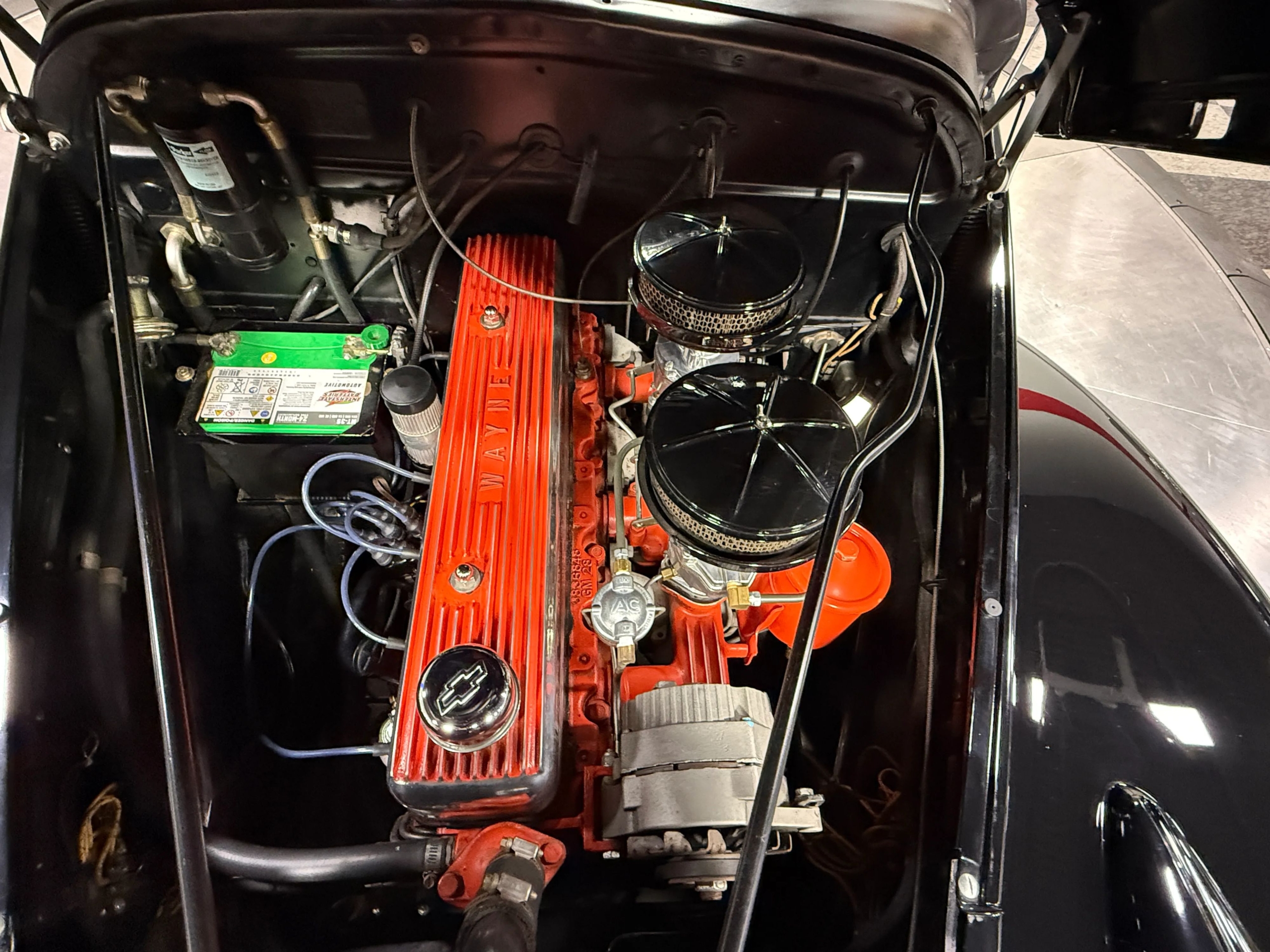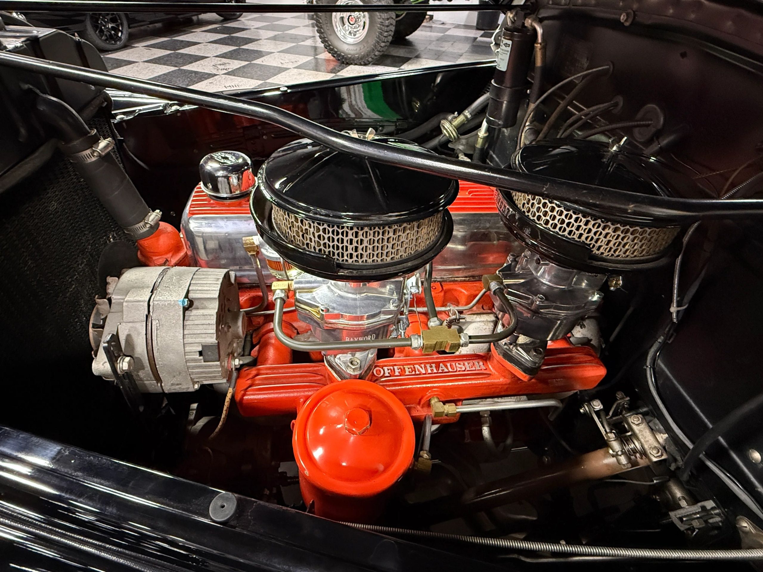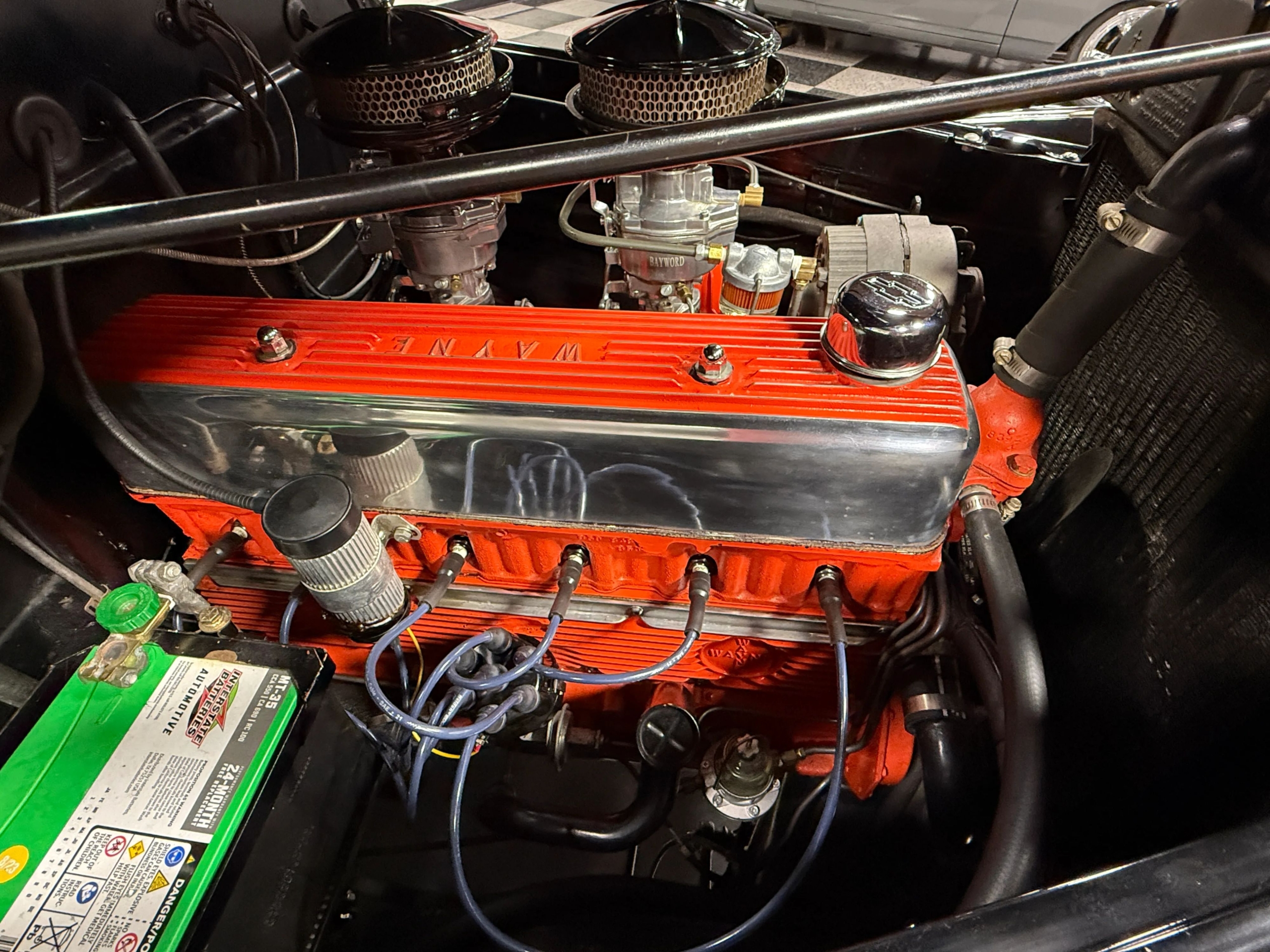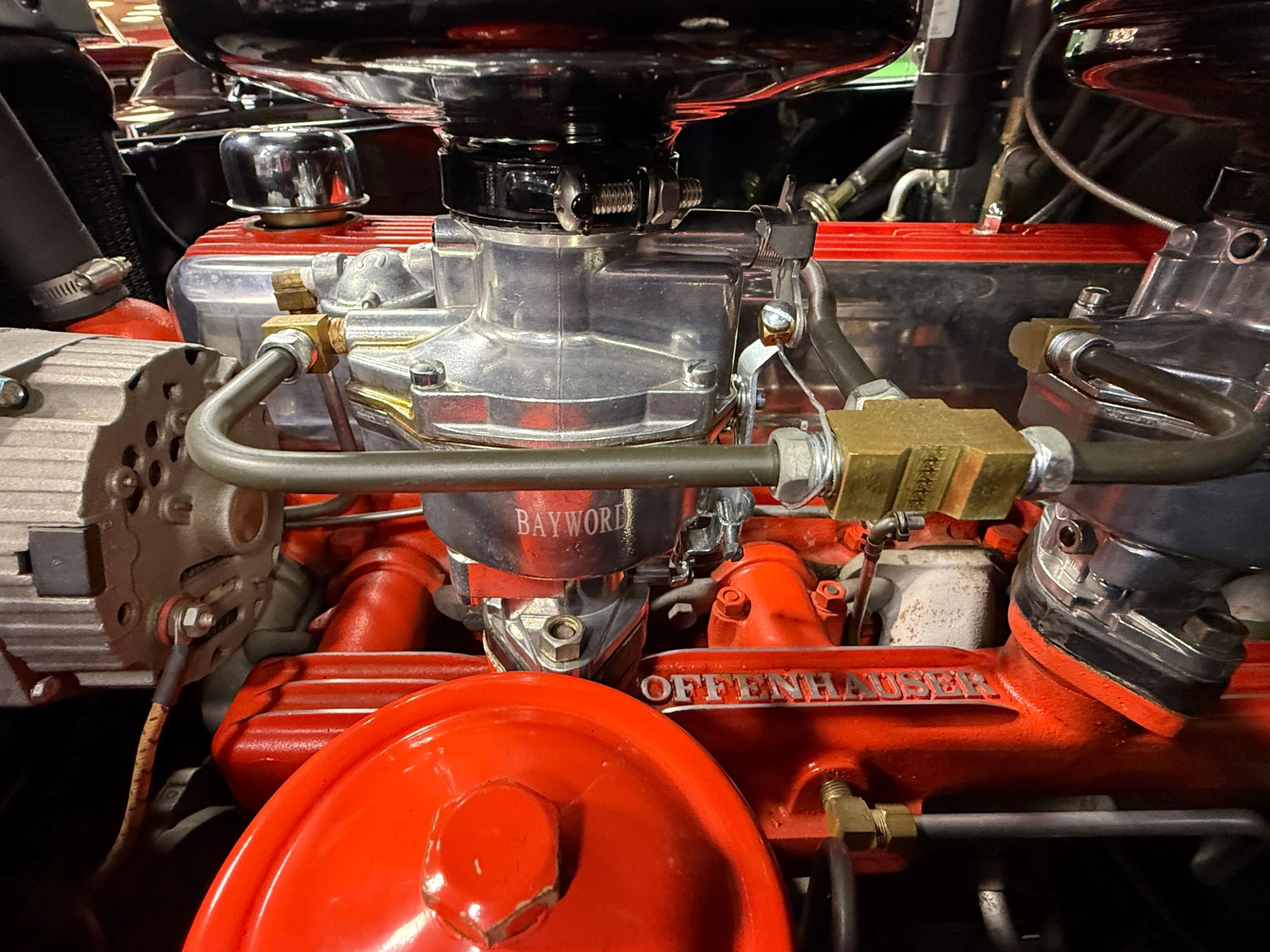 Power comes from a desirable 1960 Chevrolet 235ci inline-six with hydraulic lifters. The engine features vintage performance upgrades including an Offenhauser intake, dual Bayword single-barrel carburetors, and Wayne finned valve and side covers. The engine is finished in traditional Chevrolet orange and additional Rochester carburetors are included with the car.