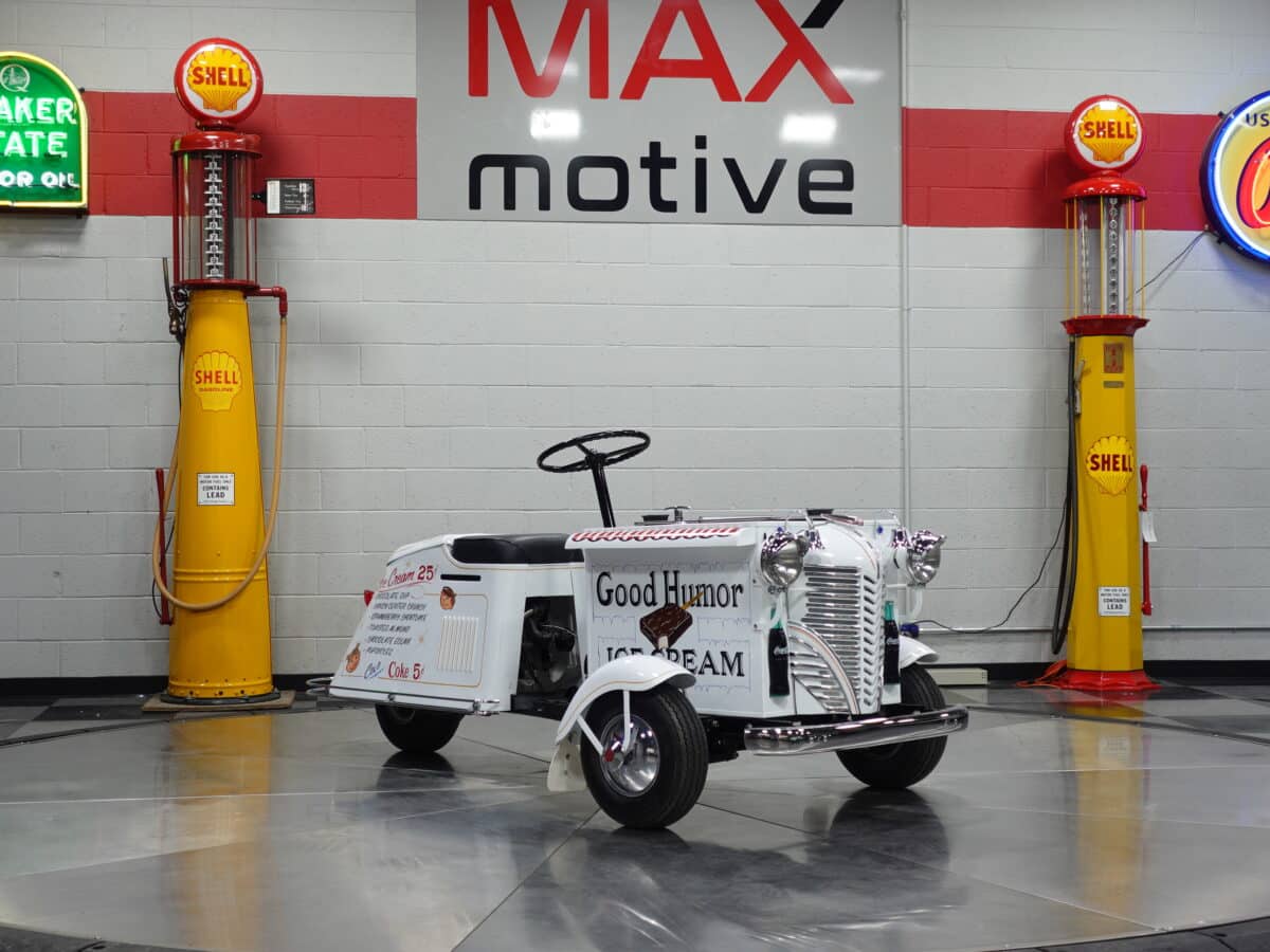 Here’s a comprehensively restored and highly detailed 40s era Cushman Good Humor 3-wheel scooter. The beautiful white paint is complemented by all-hand-painted graphics and striping that make this scooter a true work of art. It’s powered by a Cushman single cylinder engine with a 2⅞ inch bore and 2¾ inch stroke. Even the engine is pretty. A fully functional cooler box is foam insulated. Dual bells alert customers of your arrival. In back is a roomy locking storage compartment. Chrome headlight housings and bumpers add to appearance, and a coil suspension helps with the handling. A functional and charming historic vehicle, this 40s era Cushman Good Humor 3-wheel Scooter is a great addition to any collection. Be sure to see the detailed photos at www.maxmotive.com.
