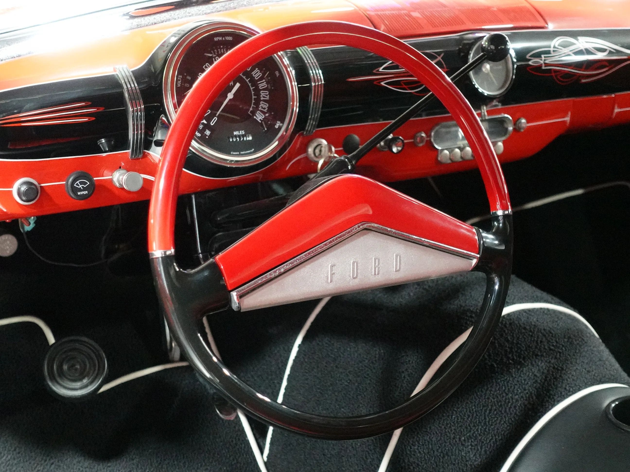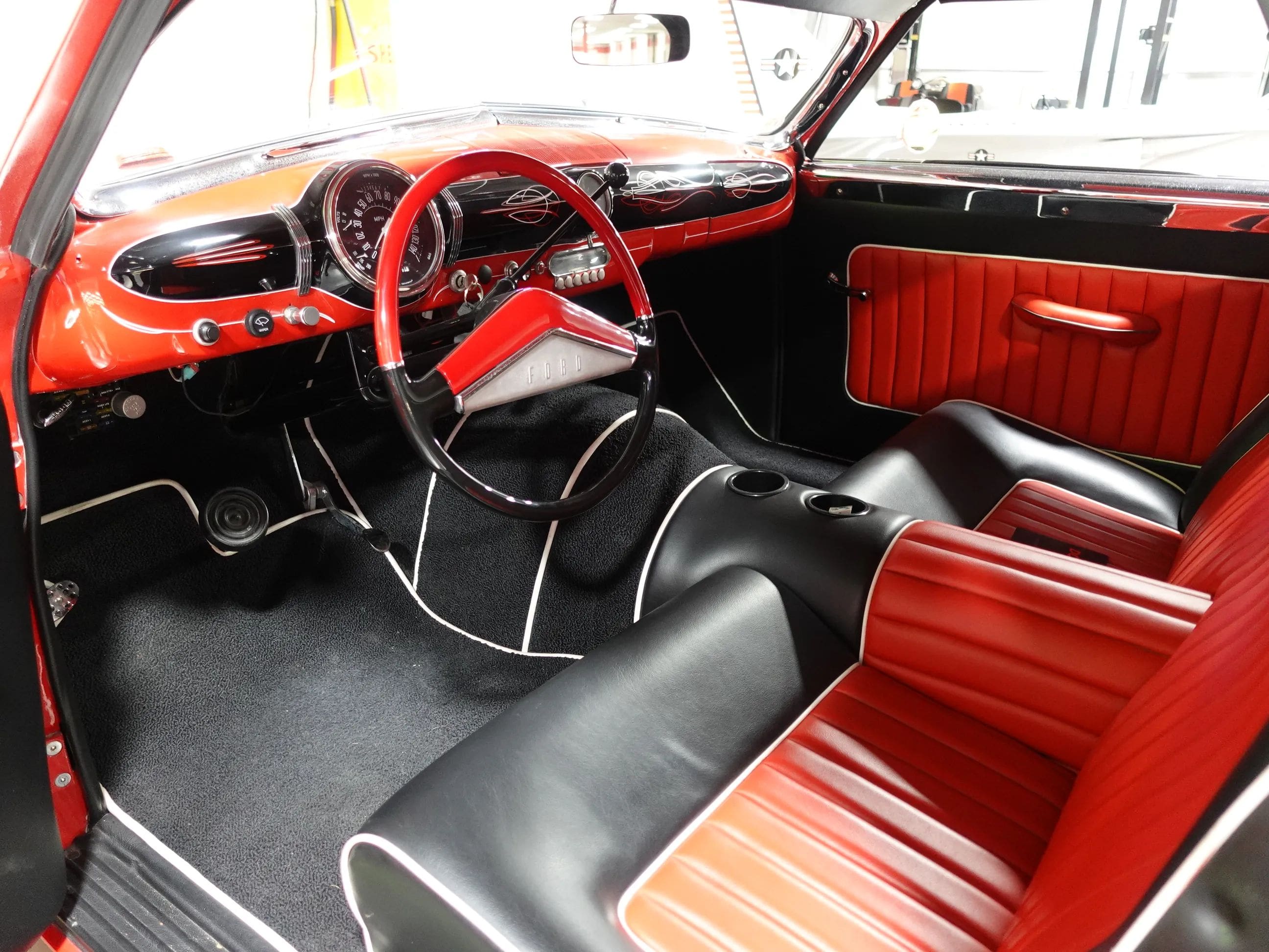 This 1949 Ford is a great example of an old-school custom and it has quite a history. Built by noted customizer Joe Bailon, it made its debut in 1954 at the legendary Oakland Roadster Show in California. This was a time when customs with radical body mods were all the rage. This one is chopped, channeled, and sectioned with frenched headlights from a Merc and tailights from a 54 Pontiac. It laid dormant for many years before being resurrected by Jeff Nickells Customs. Jeff lovingly restored the car called the Shampoo Truck due to its use as a promotional vehicle for hair-care products and it pays homage to a great period in automotive history. The PPG red and black paint is highlighted by period-correct hand pinstriping. The custom two-tone bench seat interior features more striping on the dash. A 57 Caddy V8 provides smooth torquey power just as it did back in the day. And extensive body and chassis reinforcements assure that this time capsule piece can be driven and enjoyed.