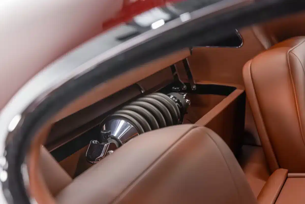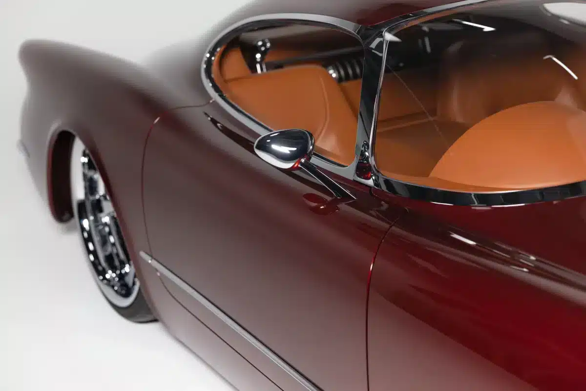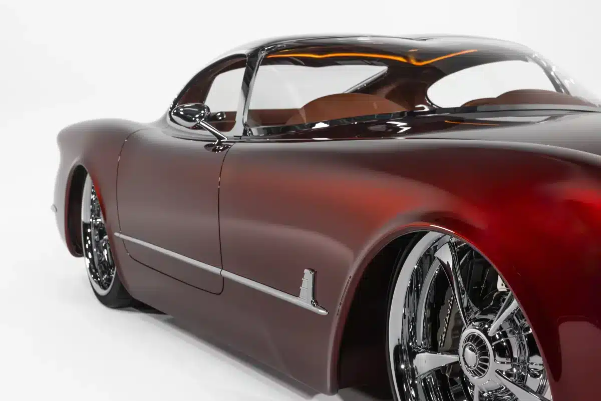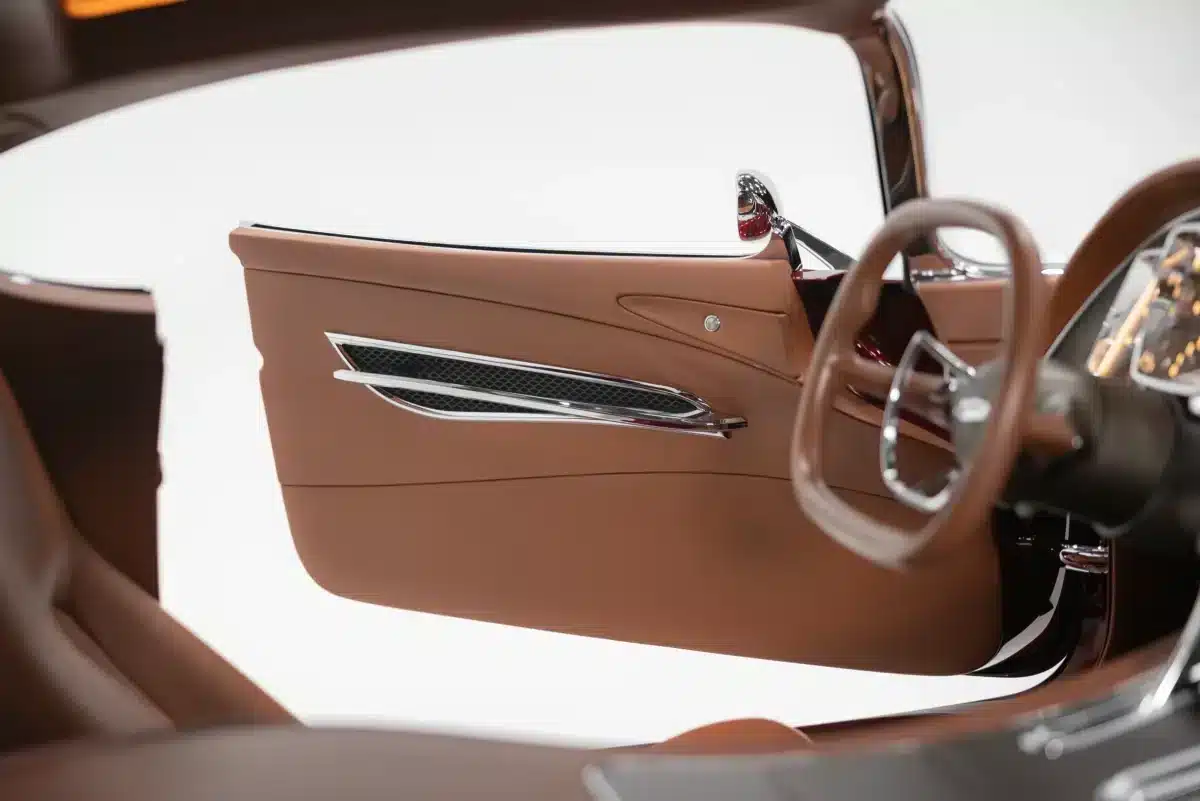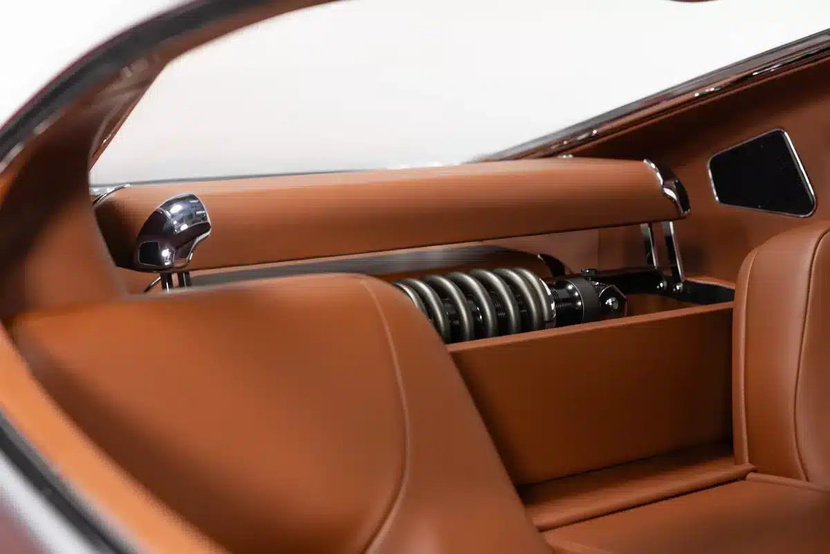 Most of the interior is 3D printed and wrapped in a Sienna-colored leather. The dash coves/pods were inspired by early Corvettes, while the center console and overall cockpit feel took inspiration from later Corvettes. The one-off aluminum steering wheel takes inspiration from both the squared shape of the C8 but takes the overall styling from the C1. The gauge cluster has white gold inlaid with diamonds for the markings. The upper rear suspension components are hidden within the faux luggage in the rear. The top of the luggage can be opened to reveal the components. All the custom polycarbonate and trim are all perfectly flush with the painted body. The taillights are automated to pop up with the control unit in the center console to reveal the plug-in for the battery tender and the fuel filler.