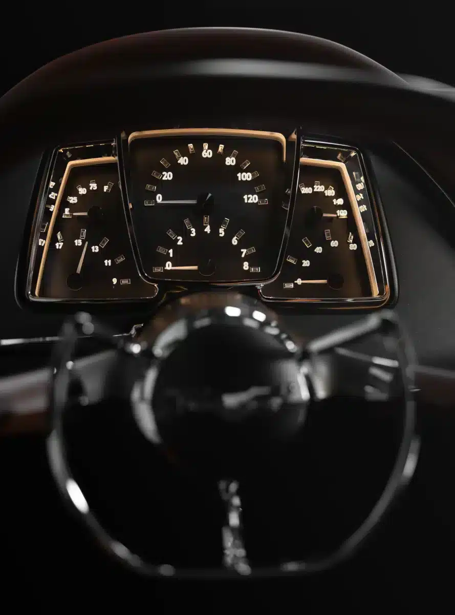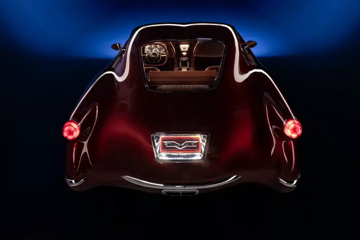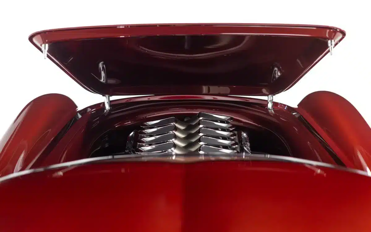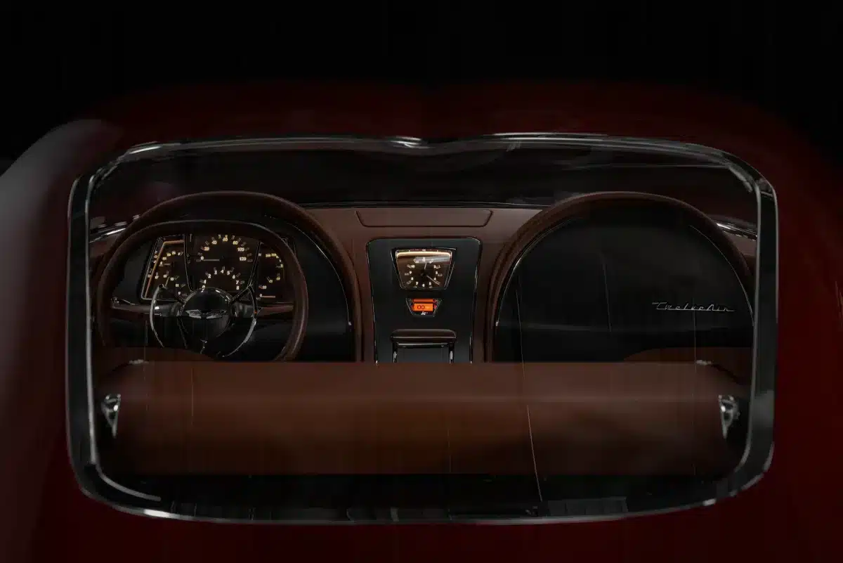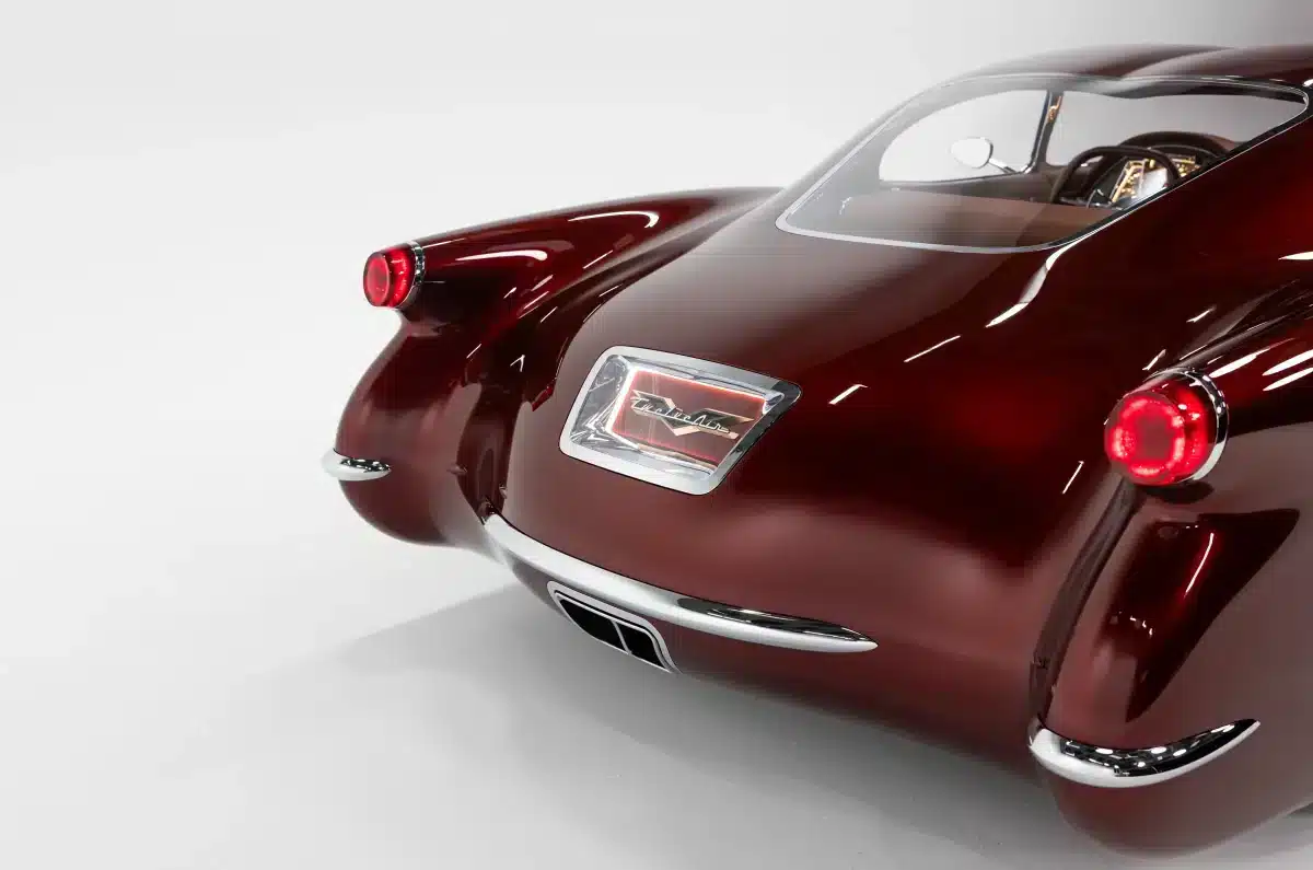 Most of the interior is 3D printed and wrapped in a Sienna-colored leather. The dash coves/pods were inspired by early Corvettes, while the center console and overall cockpit feel took inspiration from later Corvettes. The one-off aluminum steering wheel takes inspiration from both the squared shape of the C8 but takes the overall styling from the C1. The gauge cluster has white gold inlaid with diamonds for the markings. The upper rear suspension components are hidden within the faux luggage in the rear. The top of the luggage can be opened to reveal the components. All the custom polycarbonate and trim are all perfectly flush with the painted body. The taillights are automated to pop up with the control unit in the center console to reveal the plug-in for the battery tender and the fuel filler.