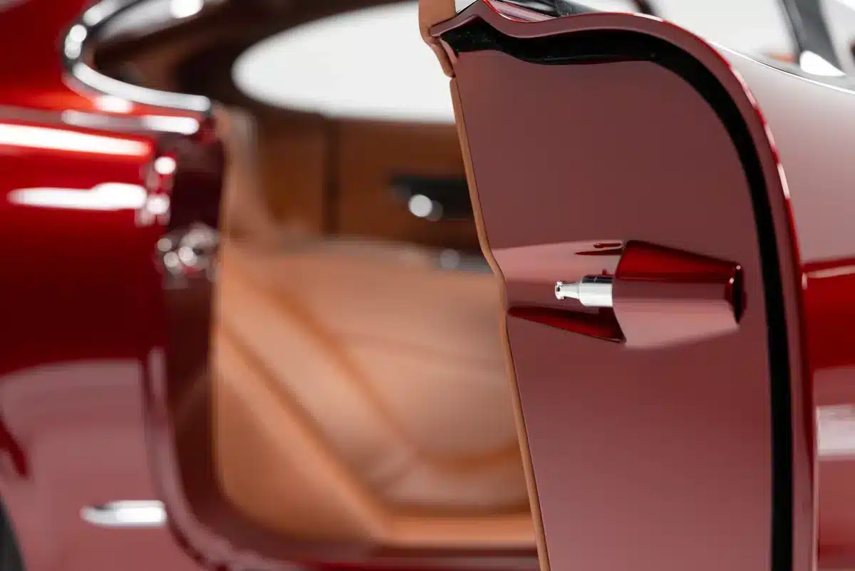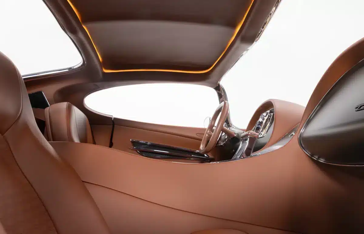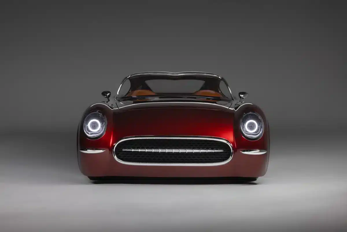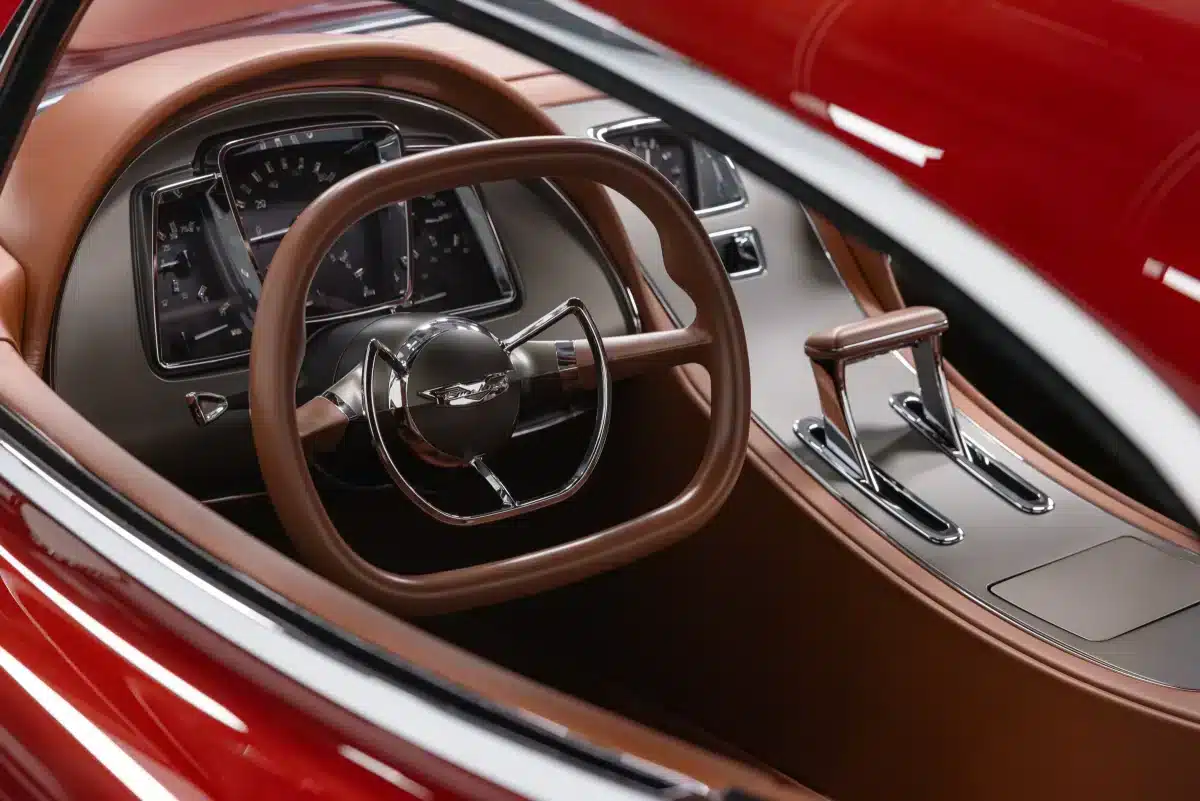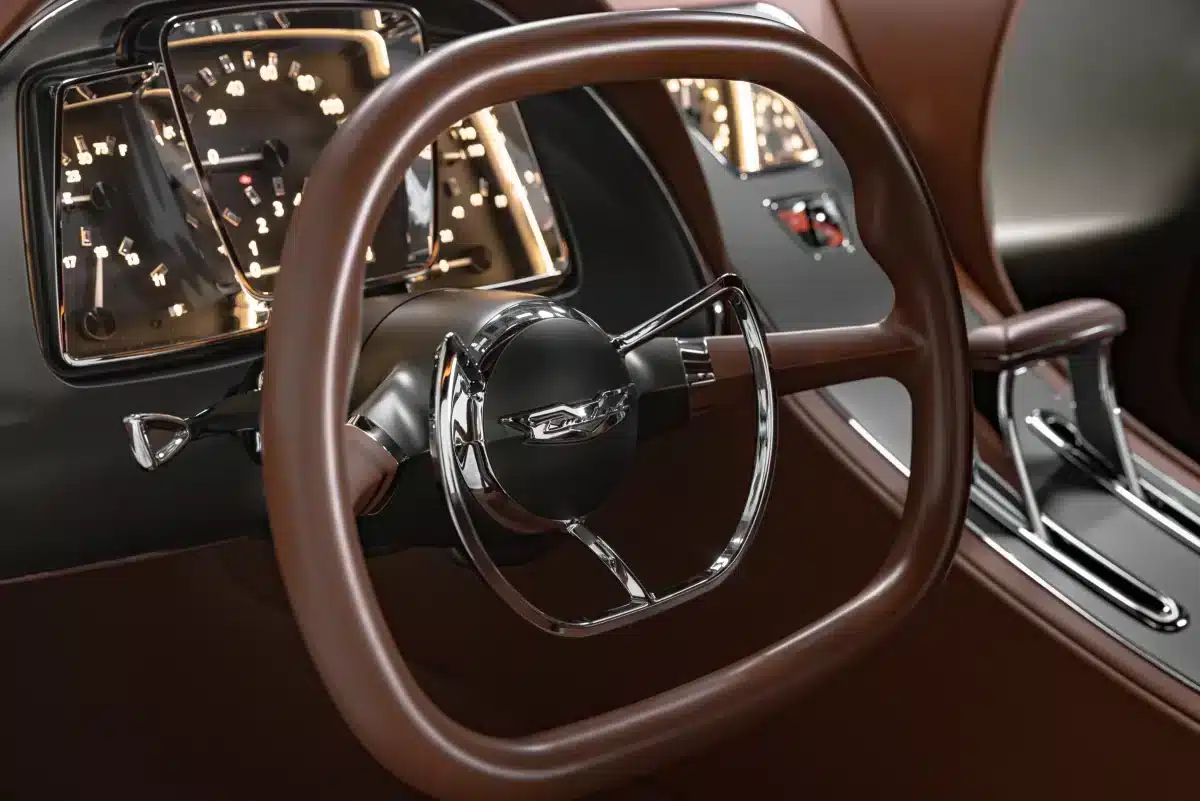 Most of the interior is 3D printed and wrapped in a Sienna-colored leather. The dash coves/pods were inspired by early Corvettes, while the center console and overall cockpit feel took inspiration from later Corvettes. The one-off aluminum steering wheel takes inspiration from both the squared shape of the C8 but takes the overall styling from the C1. The gauge cluster has white gold inlaid with diamonds for the markings. The upper rear suspension components are hidden within the faux luggage in the rear. The top of the luggage can be opened to reveal the components. All the custom polycarbonate and trim are all perfectly flush with the painted body. The taillights are automated to pop up with the control unit in the center console to reveal the plug-in for the battery tender and the fuel filler.