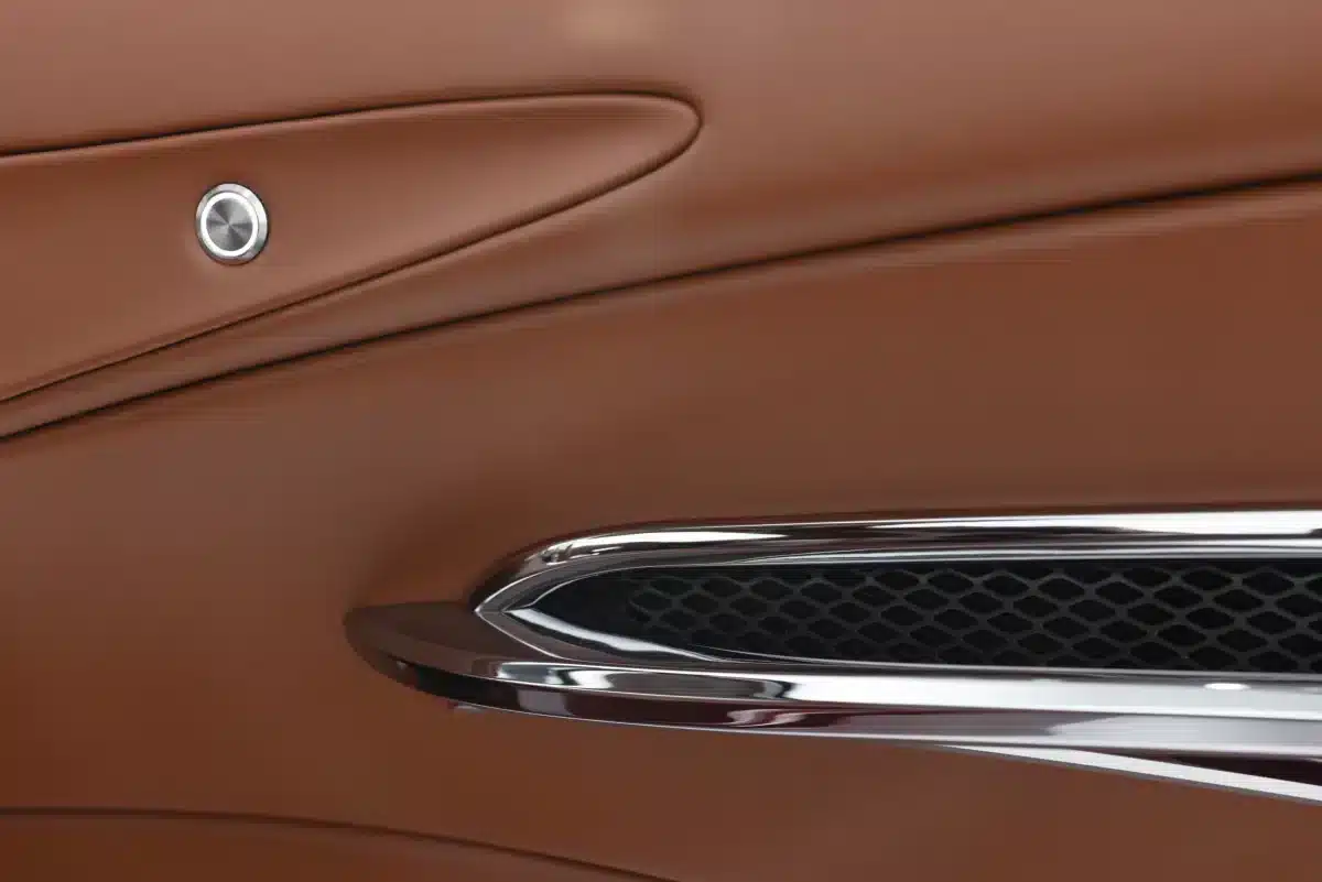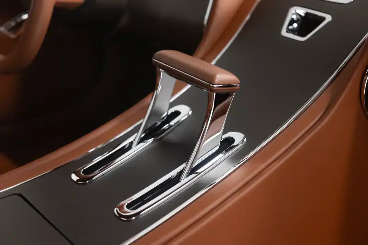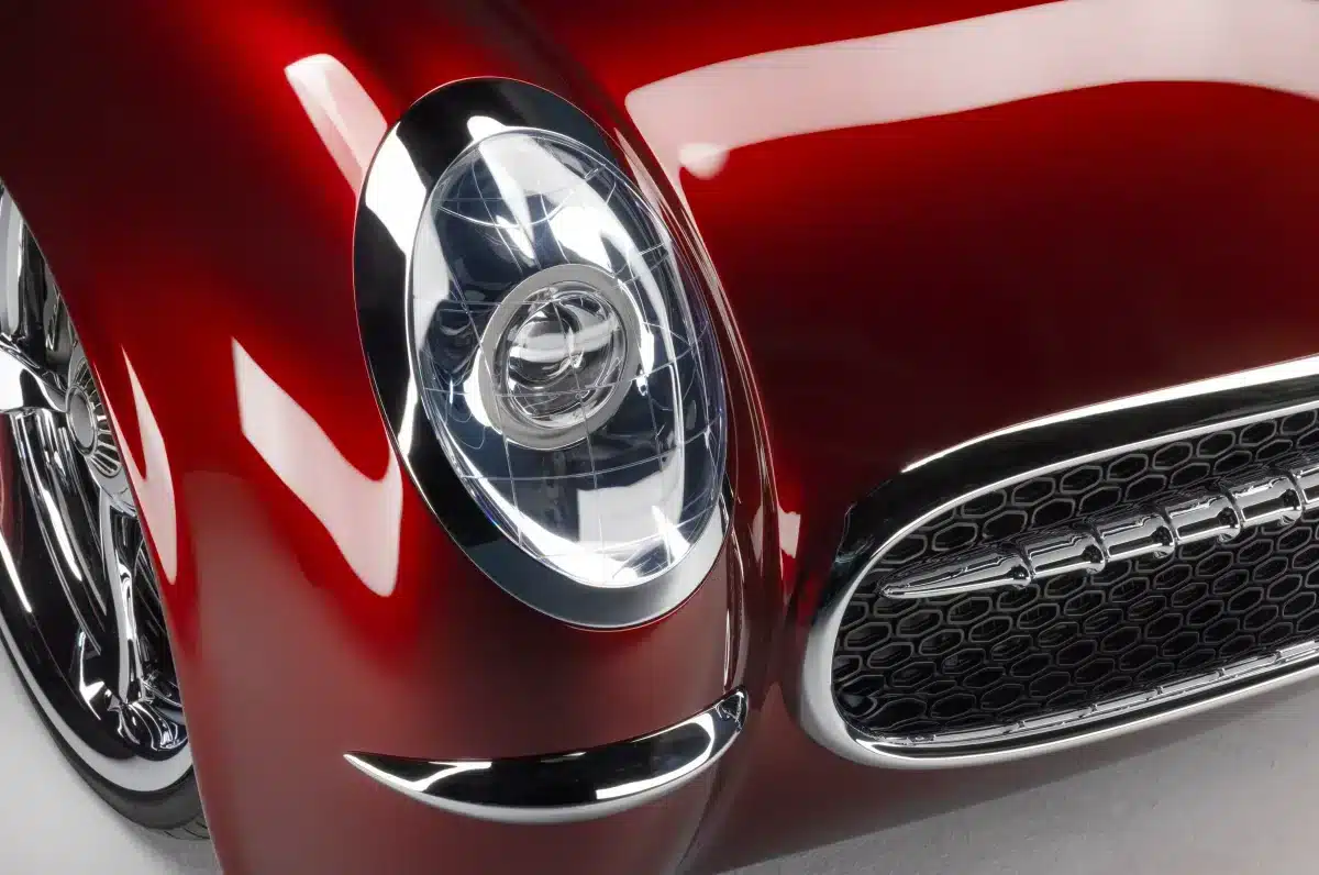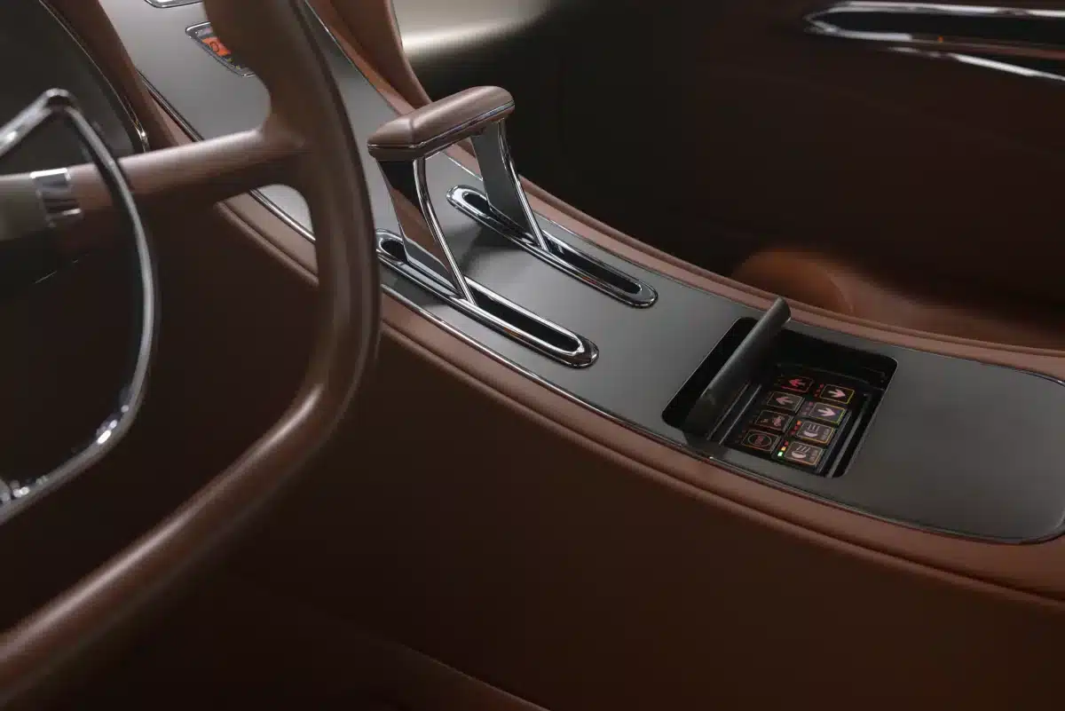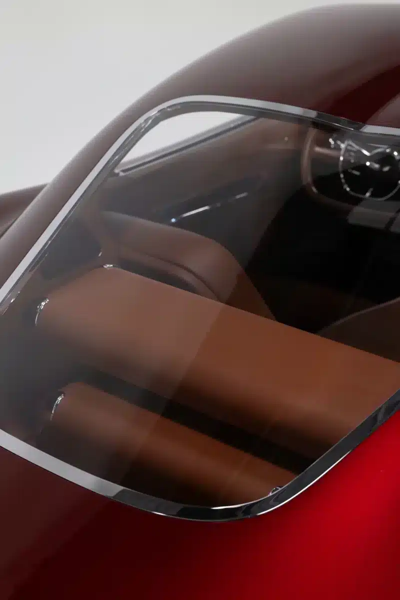 Most of the interior is 3D printed and wrapped in a Sienna-colored leather. The dash coves/pods were inspired by early Corvettes, while the center console and overall cockpit feel took inspiration from later Corvettes. The one-off aluminum steering wheel takes inspiration from both the squared shape of the C8 but takes the overall styling from the C1. The gauge cluster has white gold inlaid with diamonds for the markings. The upper rear suspension components are hidden within the faux luggage in the rear. The top of the luggage can be opened to reveal the components. All the custom polycarbonate and trim are all perfectly flush with the painted body. The taillights are automated to pop up with the control unit in the center console to reveal the plug-in for the battery tender and the fuel filler.