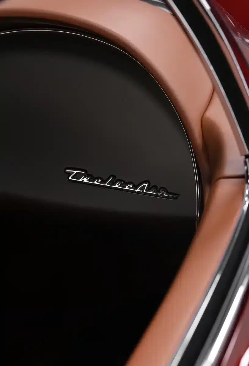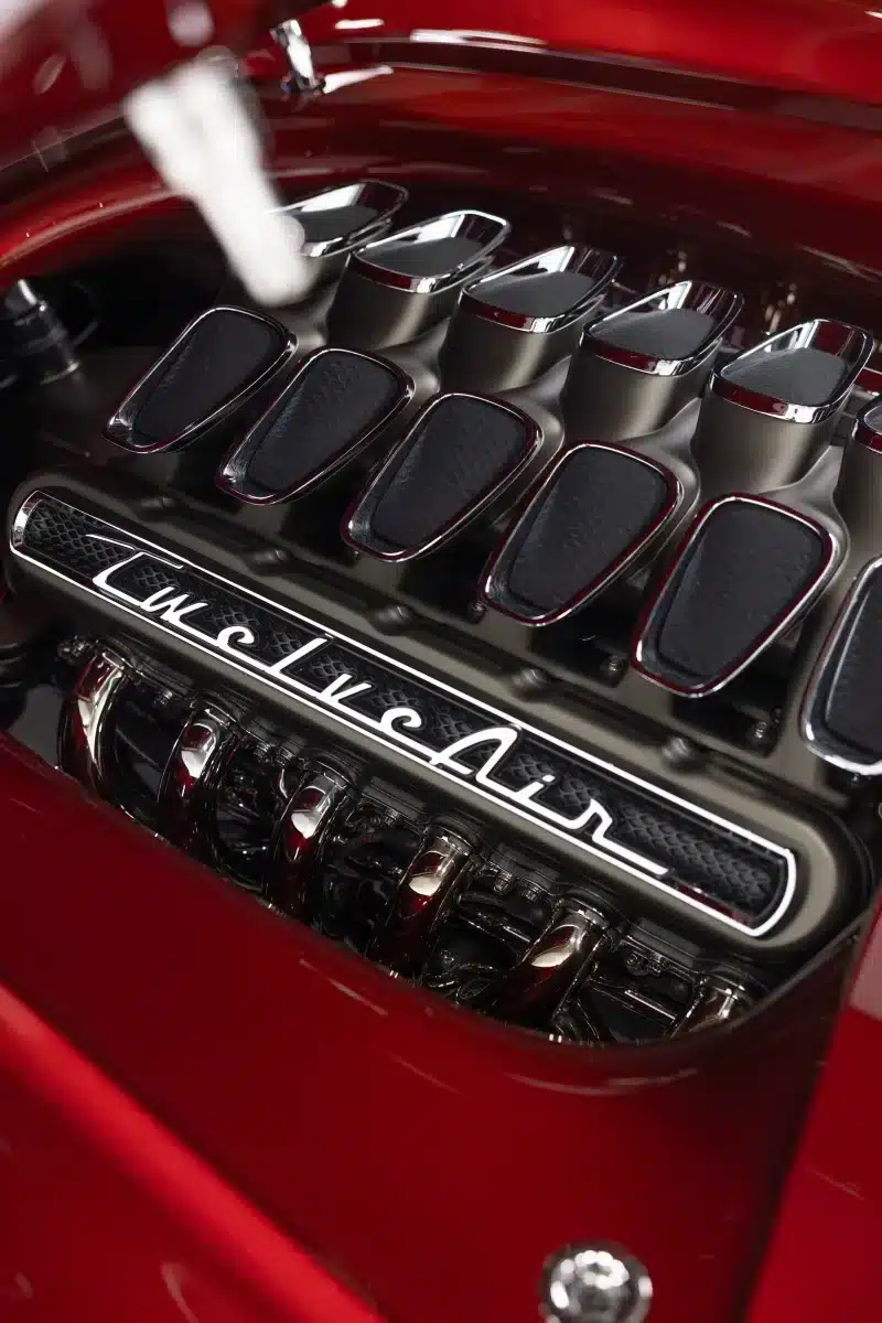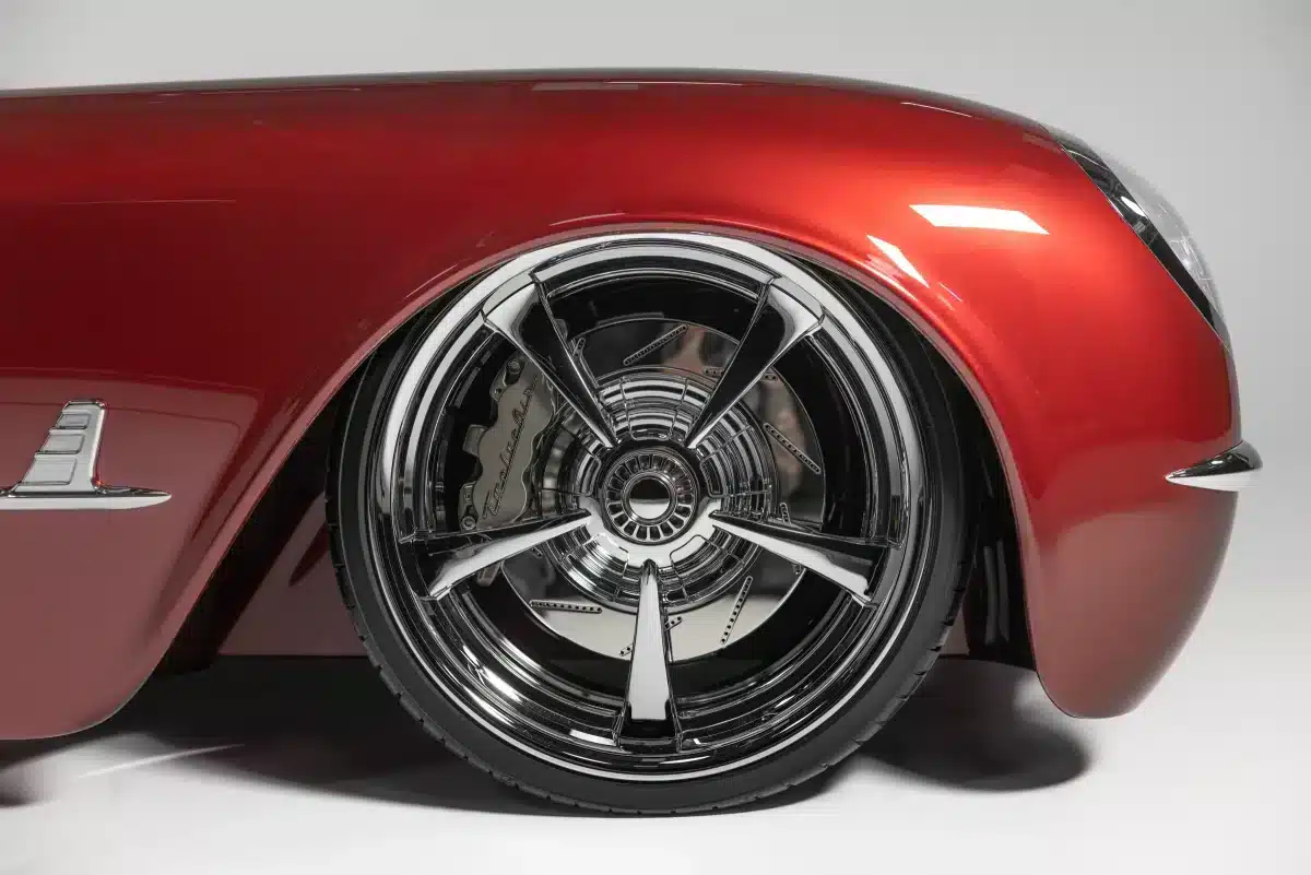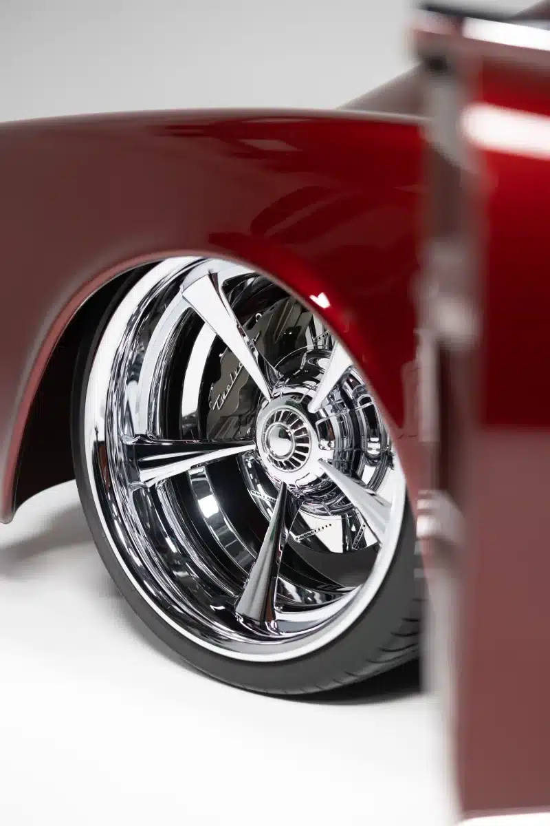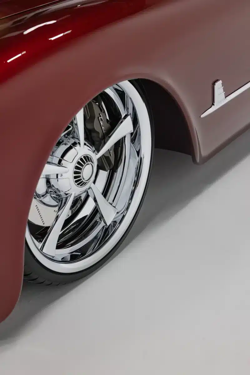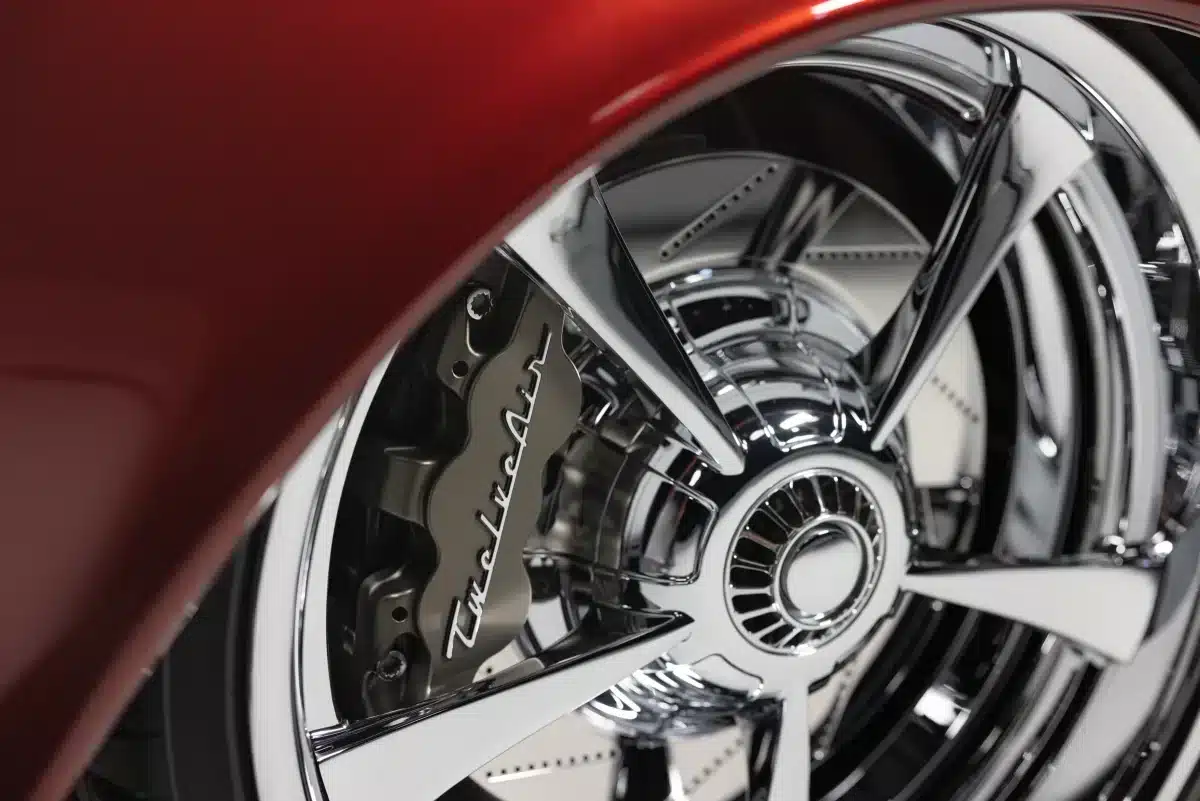Evod was responsible for machining the wheels. 19×8 front, 20×12 rear. They are a monolug, 5-spoke design and utilize a proprietary design Dave came up with to hide all the hardware. They were chromed by Ogden Chrome. Diamond Back Classics shaved the Michelin Pilot Sport tires. Wilwood Aero6 front, Aero4 rear that were painted to match the engine with chrome Twelvair logos.