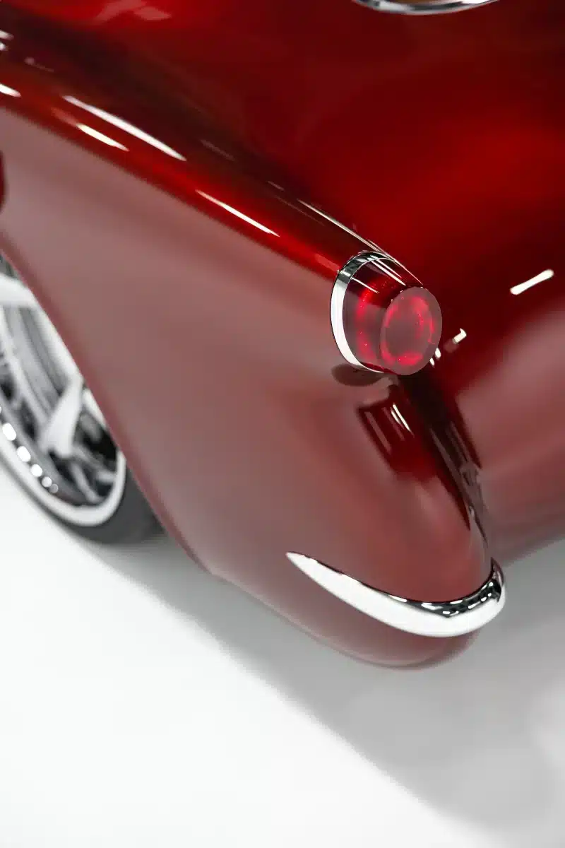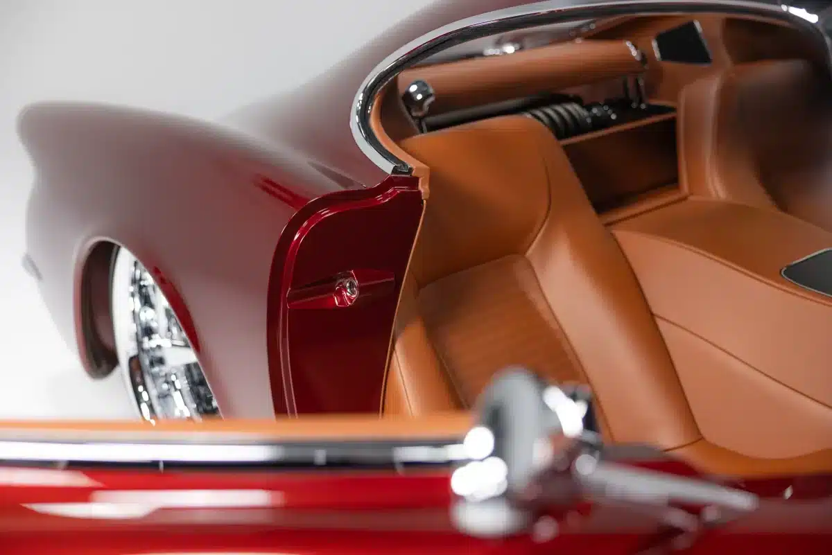 Our body and paint team finished every surface to the same degree top to bottom, even areas hidden by the drivetrain that aren’t even visible. The color is Modern Classikk “Infrared”, and the accent color found throughout the interior, engine, drivetrain, etc., is a custom mix called “Sagebrushed,” which is a satin bronze color.