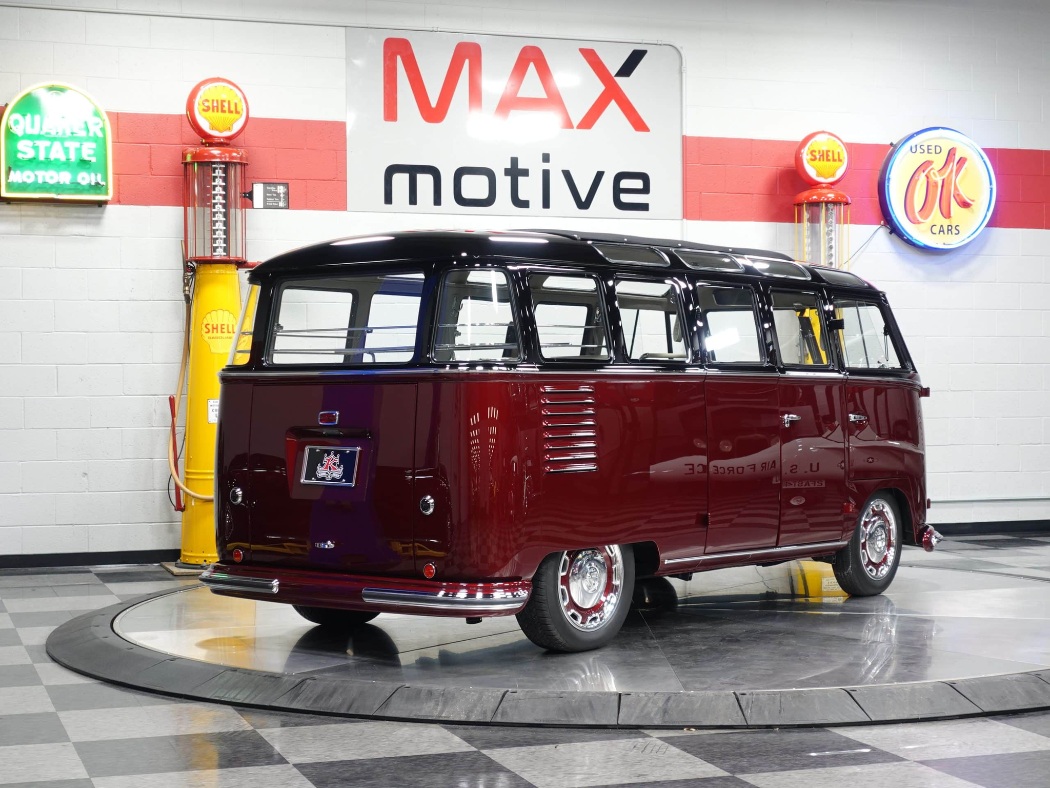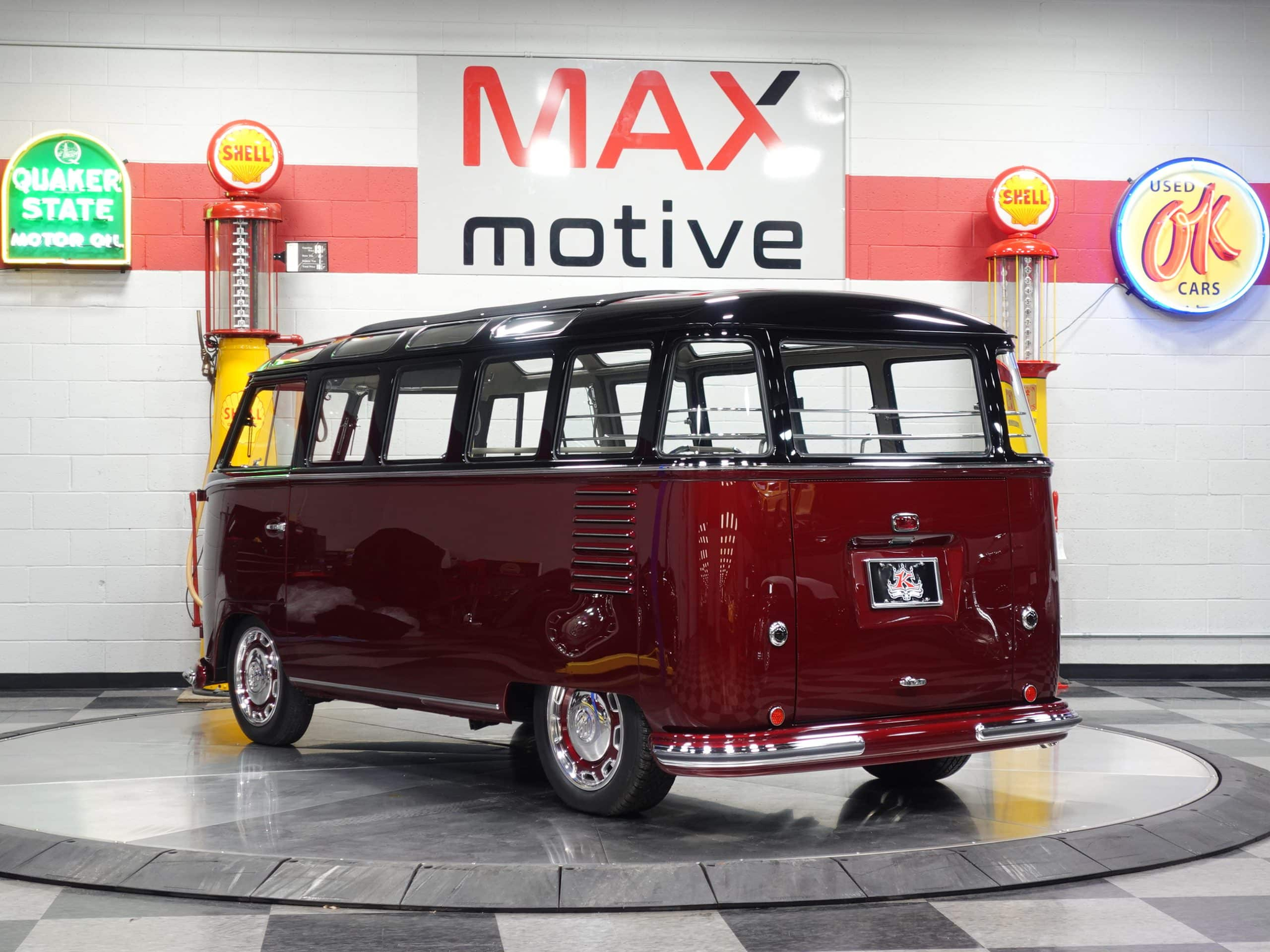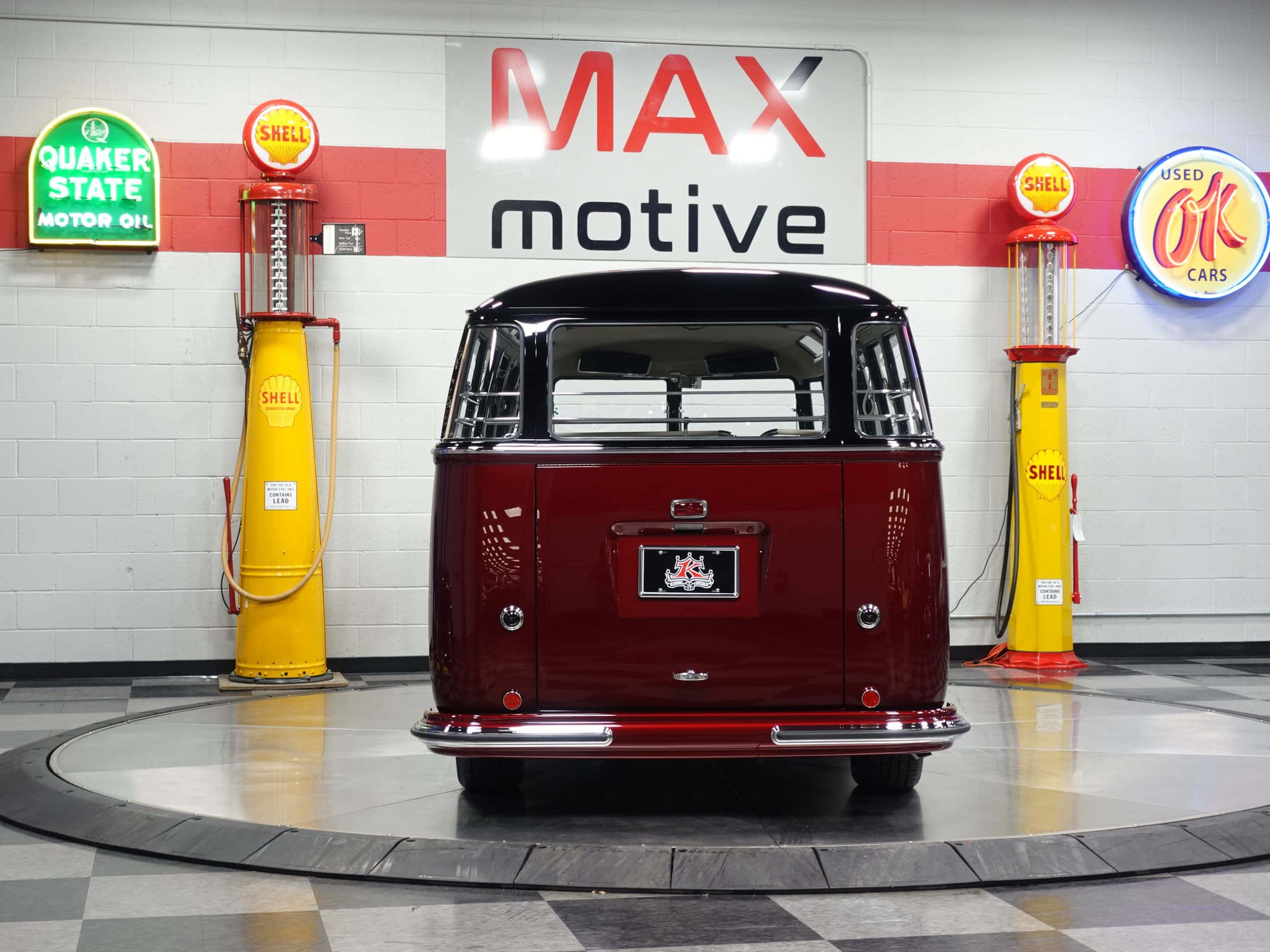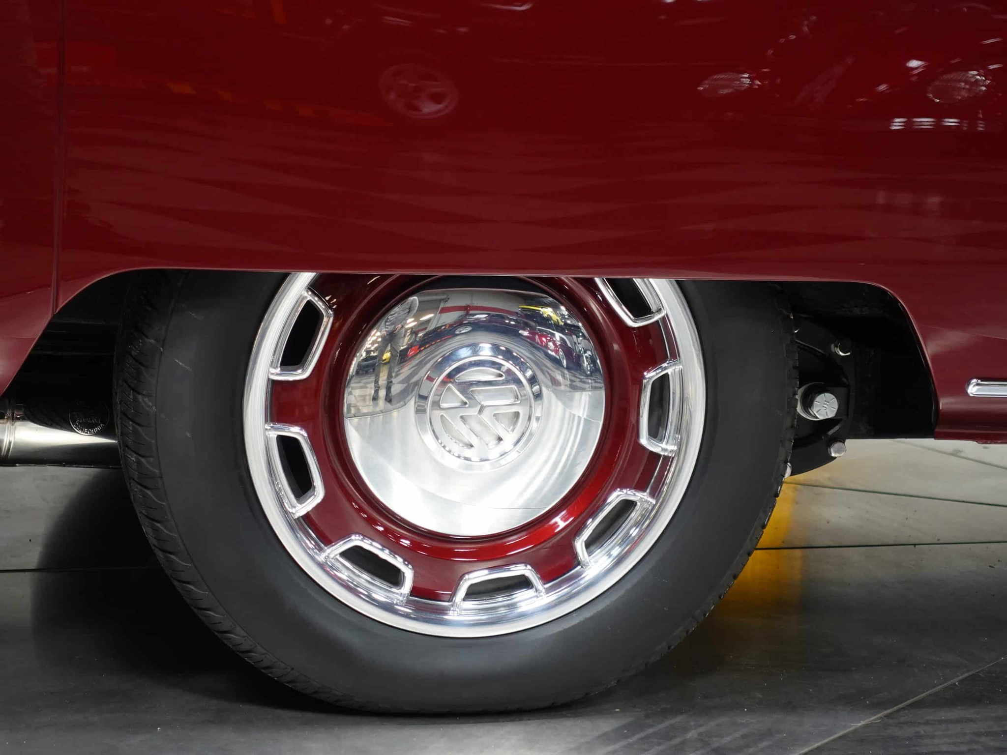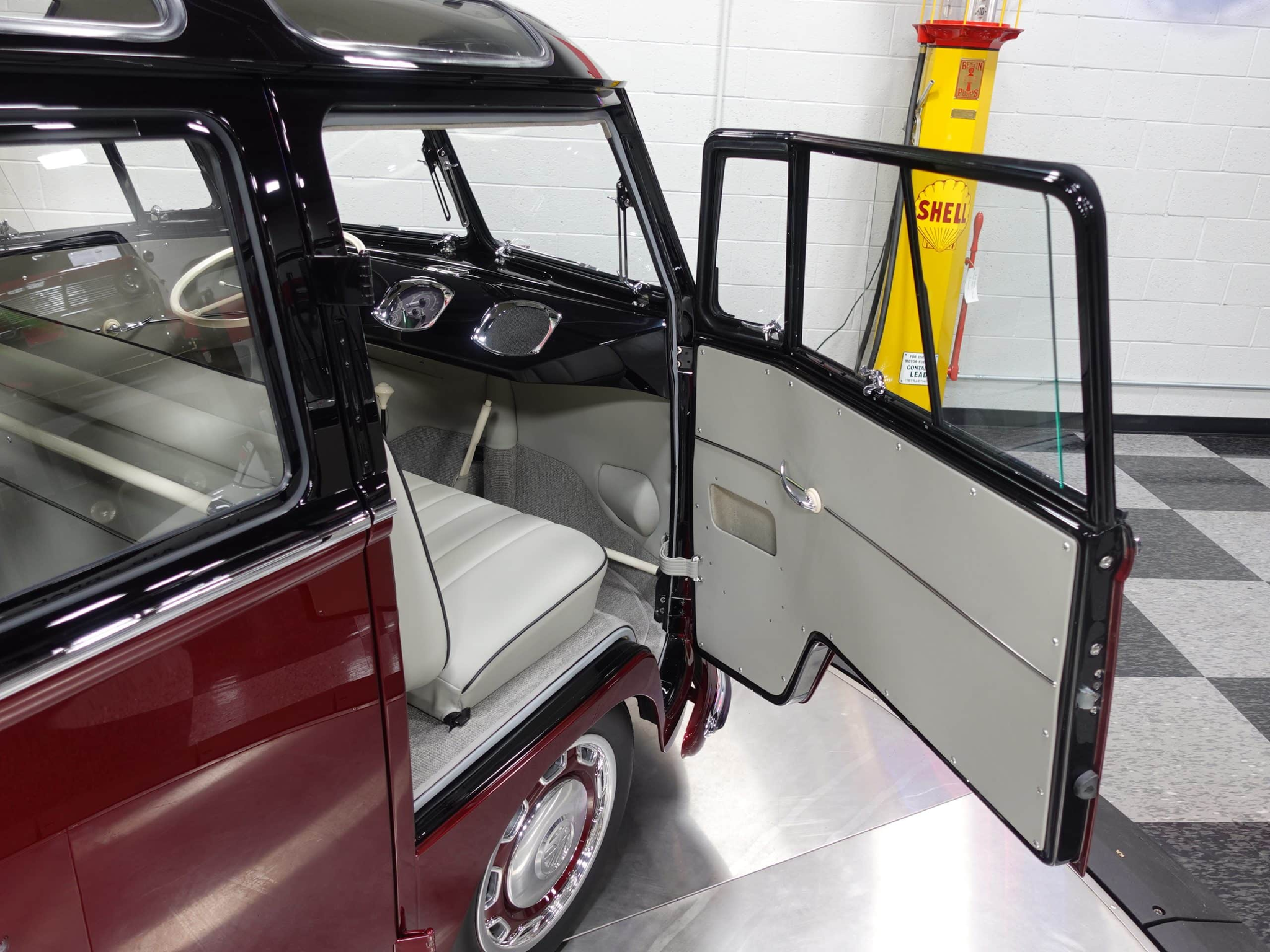 Renowned custom designer and automotive artist Dave Kindig and his team performed a complete custom build to create a one-of-a-kind 1953 Volkswagen Barn Door Deluxe 23-window Bus. The team started with a complete genuine 1953 BarnDoor 23-window VW Bus. The Kindig team started by installing a custom VW engine with twin Weber 48 carbs generating 176 horsepower. Then they installed a 1987 Vanagon automatic transmission for driving ease and to handle the extra power. The sheet metal was stripped, custom metalwork performed, and custom paint applied. The two-tone paint colors are Kindig’s own mixes of Bad Blood Red and Black Hole Black. Solid stock aluminum was hand formed and triple chrome plated to create the trim Soft leather seats in pale gray complement the rich gray German wool carpeting and custom headliner. The chrome Jail Bar luggage containment is a genuine feature of the Barn Door buses. A modern touch is a handsome Dakota digital gauge package. It rides on a lowered suspension with 4-wheel slotted disc brakes and staggered custom Kindig wheels. It was designed as a companion to the Collection’s 1950 VW Hebmuller Cabriolet. Please be sure to see the detailed photos at www.maxmotive.com.