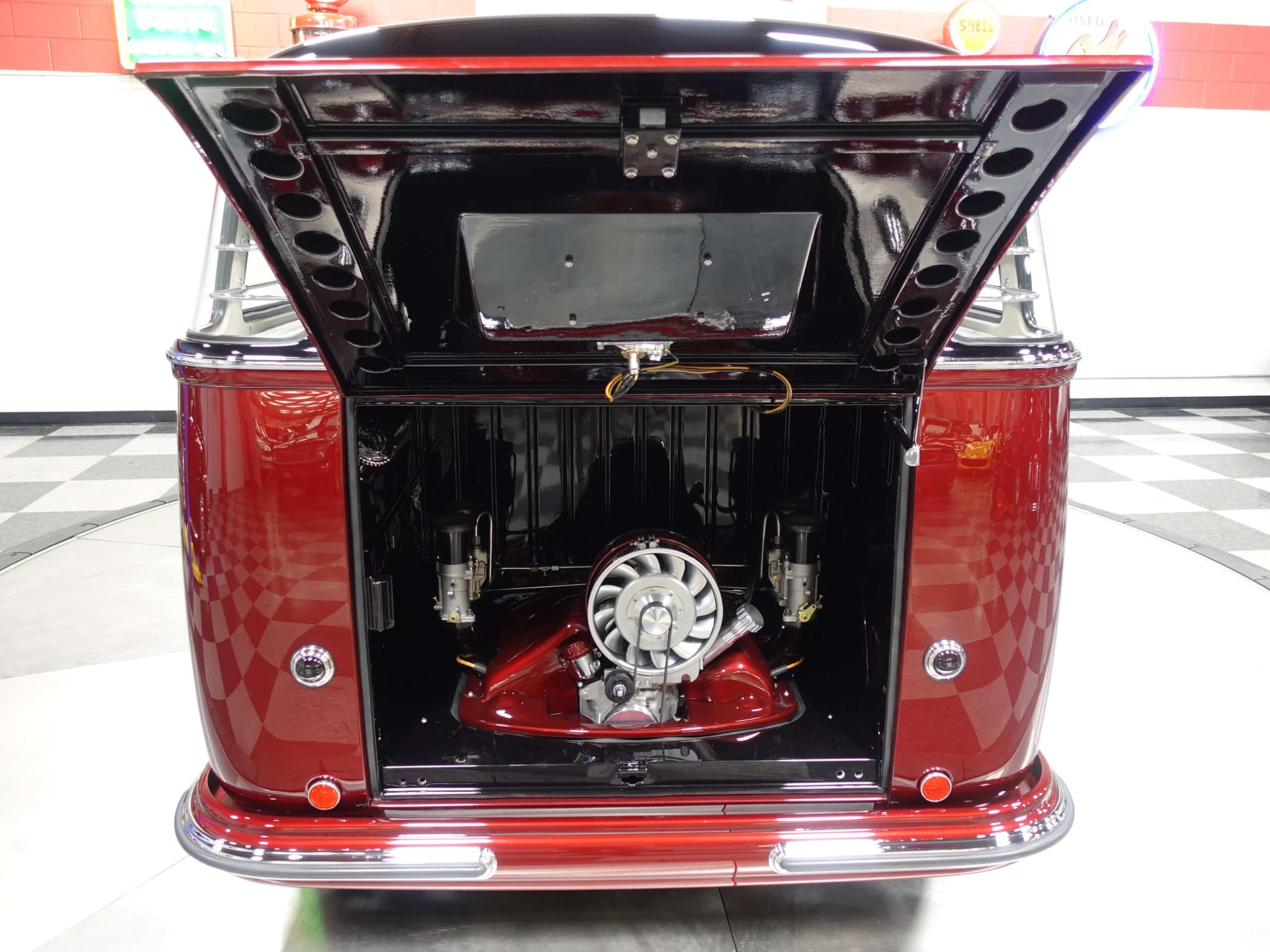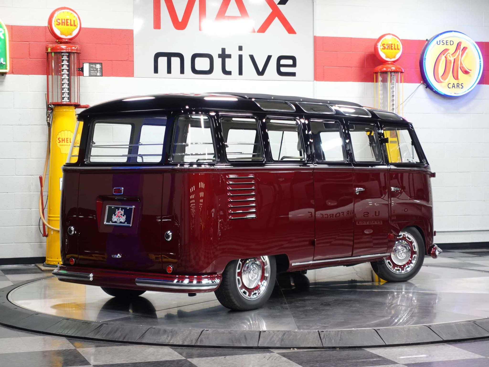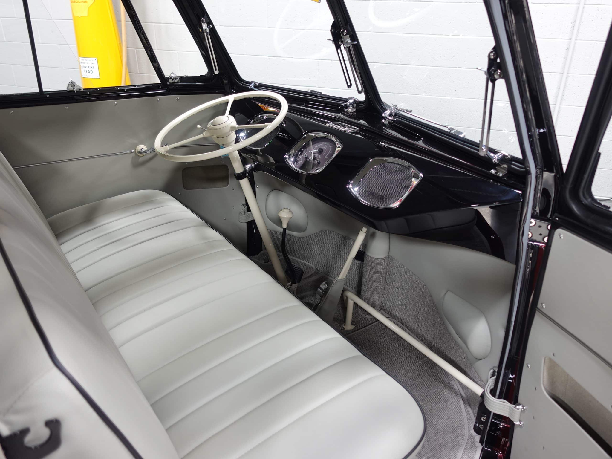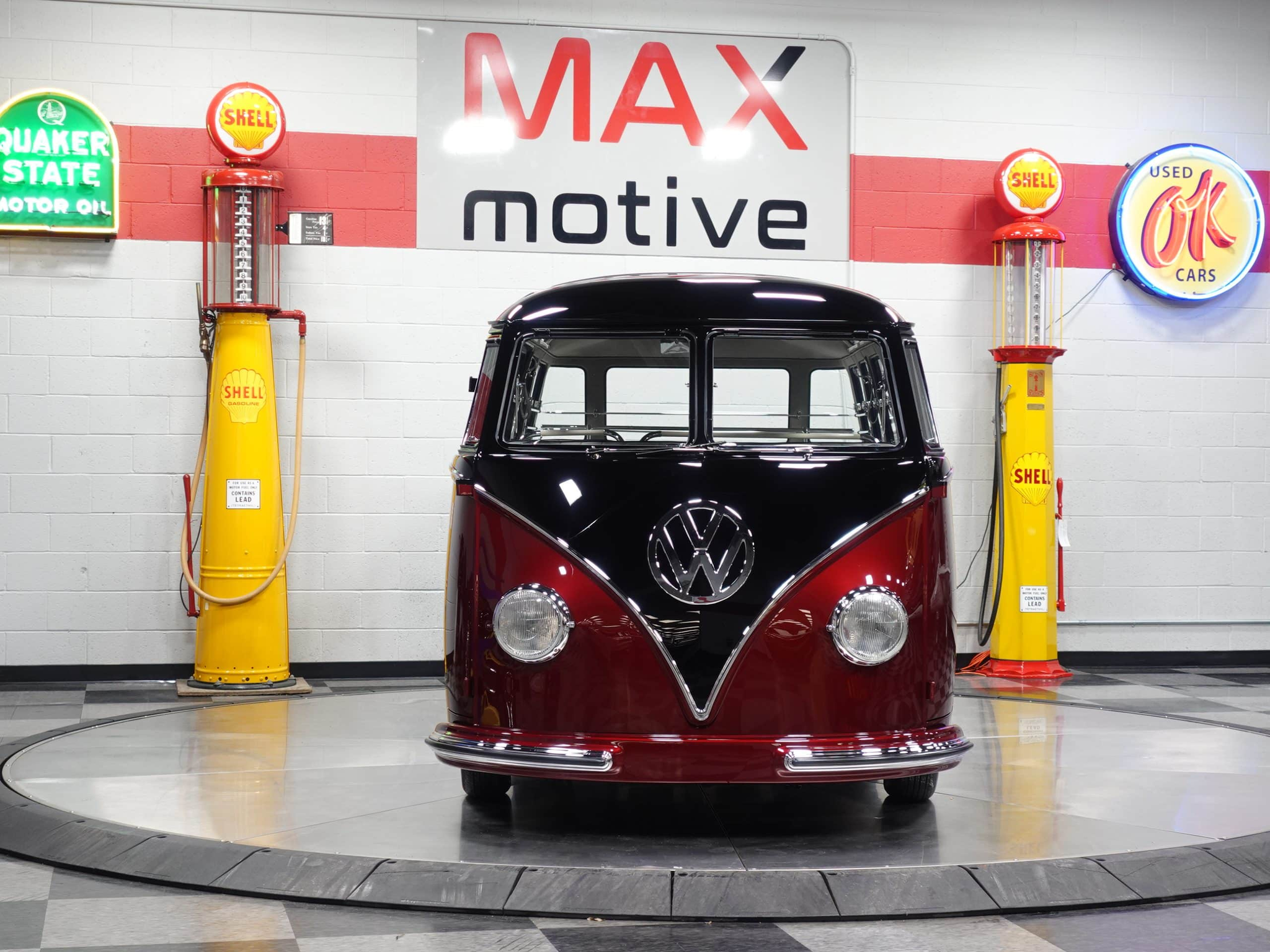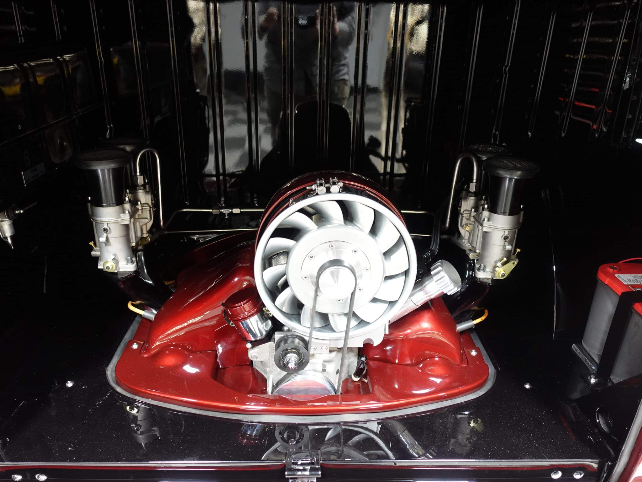 Renowned custom designer and automotive artist Dave Kindig and his team performed a complete custom build to create a one-of-a-kind 1953 Volkswagen Barn Door Deluxe 23-window Bus. The team started with a complete genuine 1953 BarnDoor 23-window VW Bus. The Kindig team started by installing a custom VW engine with twin Weber 48 carbs generating 176 horsepower. Then they installed a 1987 Vanagon automatic transmission for driving ease and to handle the extra power. The sheet metal was stripped, custom metalwork performed, and custom paint applied. The two-tone paint colors are Kindig’s own mixes of Bad Blood Red and Black Hole Black. Solid stock aluminum was hand formed and triple chrome plated to create the trim Soft leather seats in pale gray complement the rich gray German wool carpeting and custom headliner. The chrome Jail Bar luggage containment is a genuine feature of the Barn Door buses. A modern touch is a handsome Dakota digital gauge package. It rides on a lowered suspension with 4-wheel slotted disc brakes and staggered custom Kindig wheels. It was designed as a companion to the Collection’s 1950 VW Hebmuller Cabriolet. Please be sure to see the detailed photos at www.maxmotive.com.