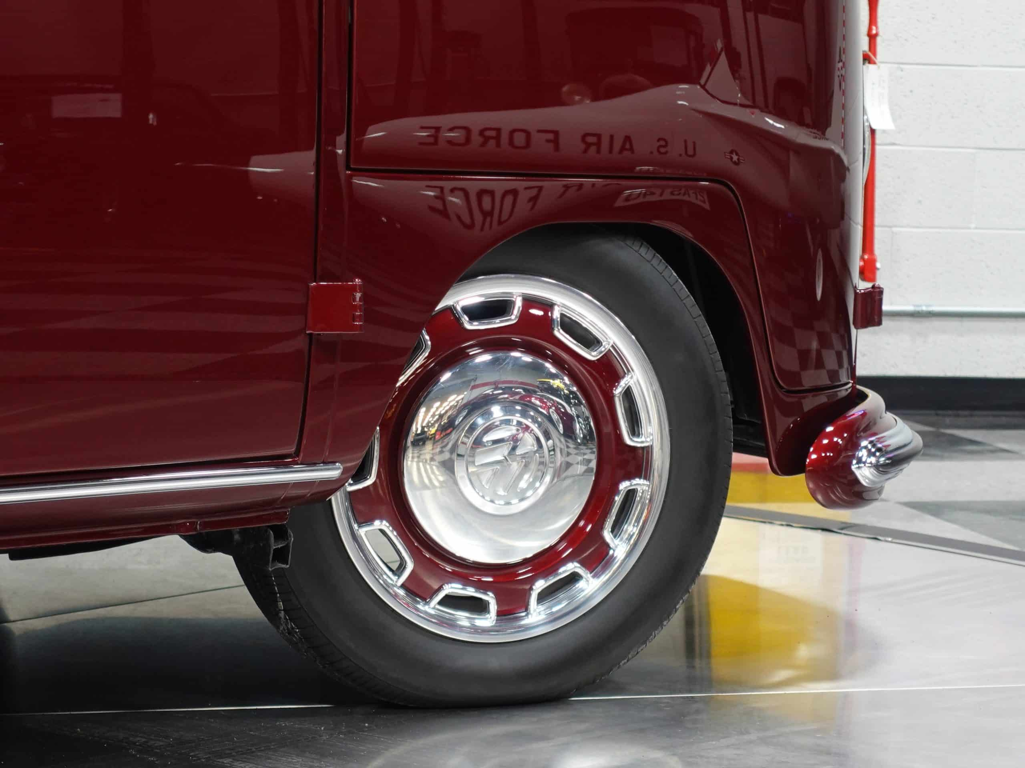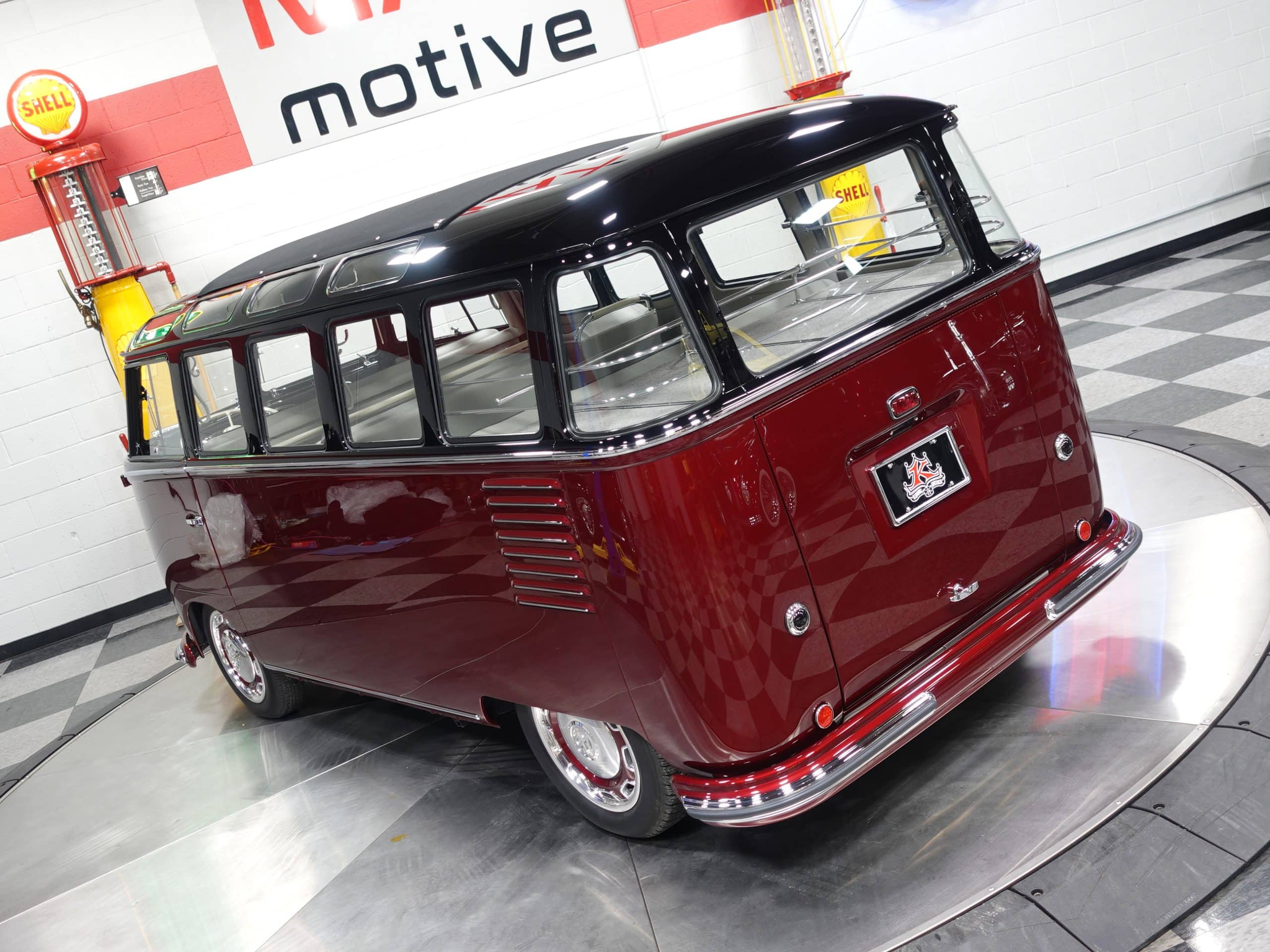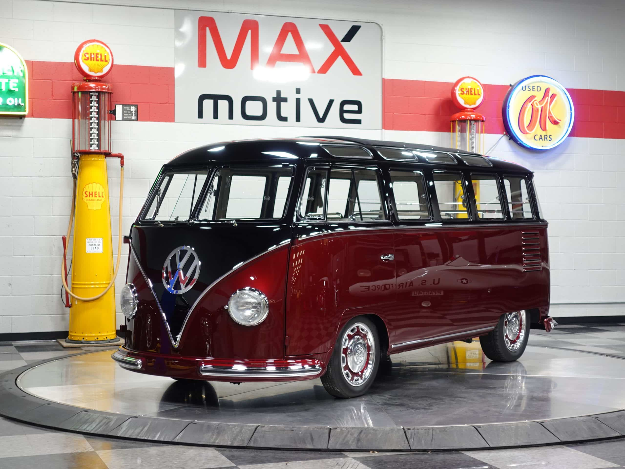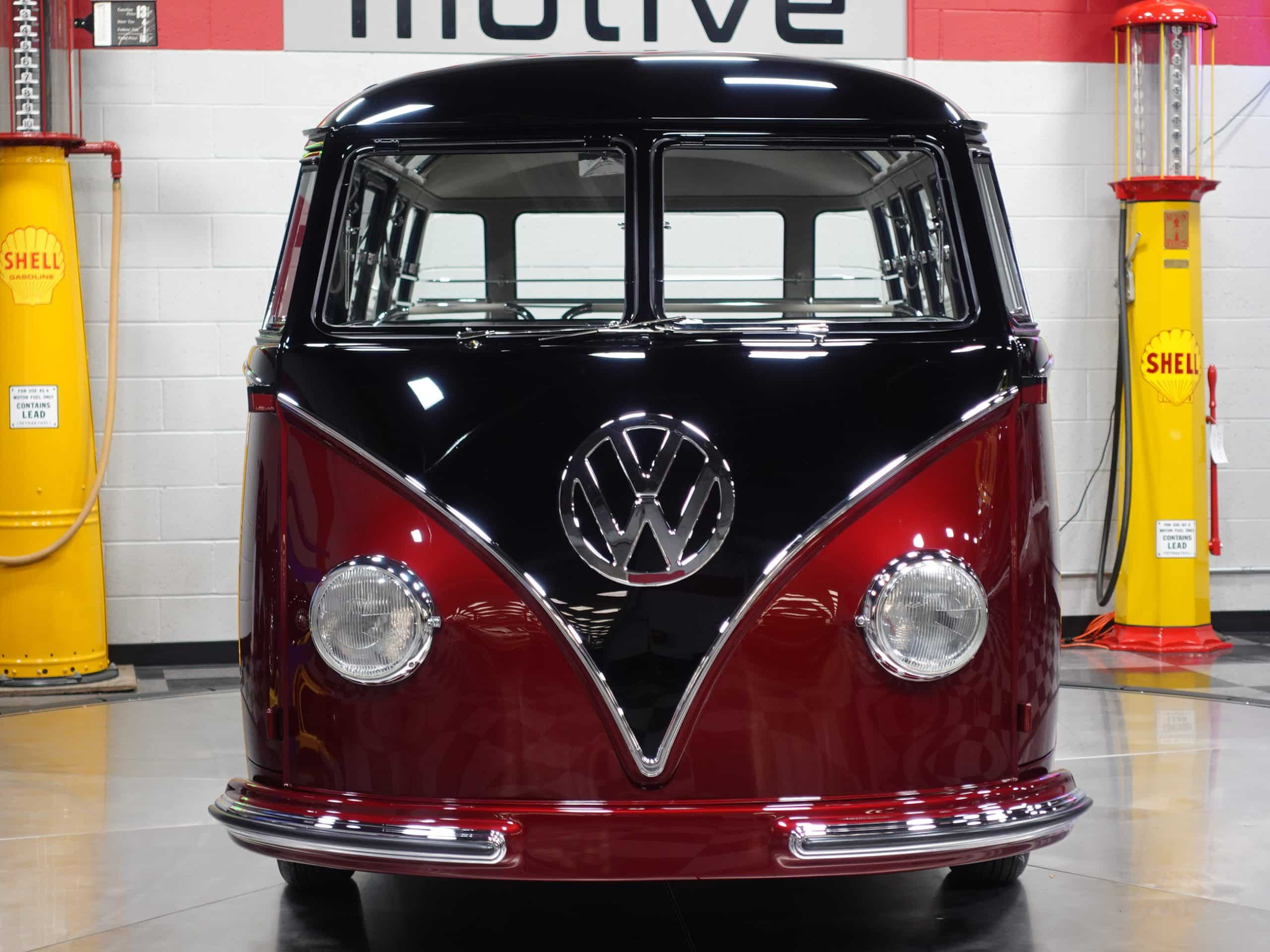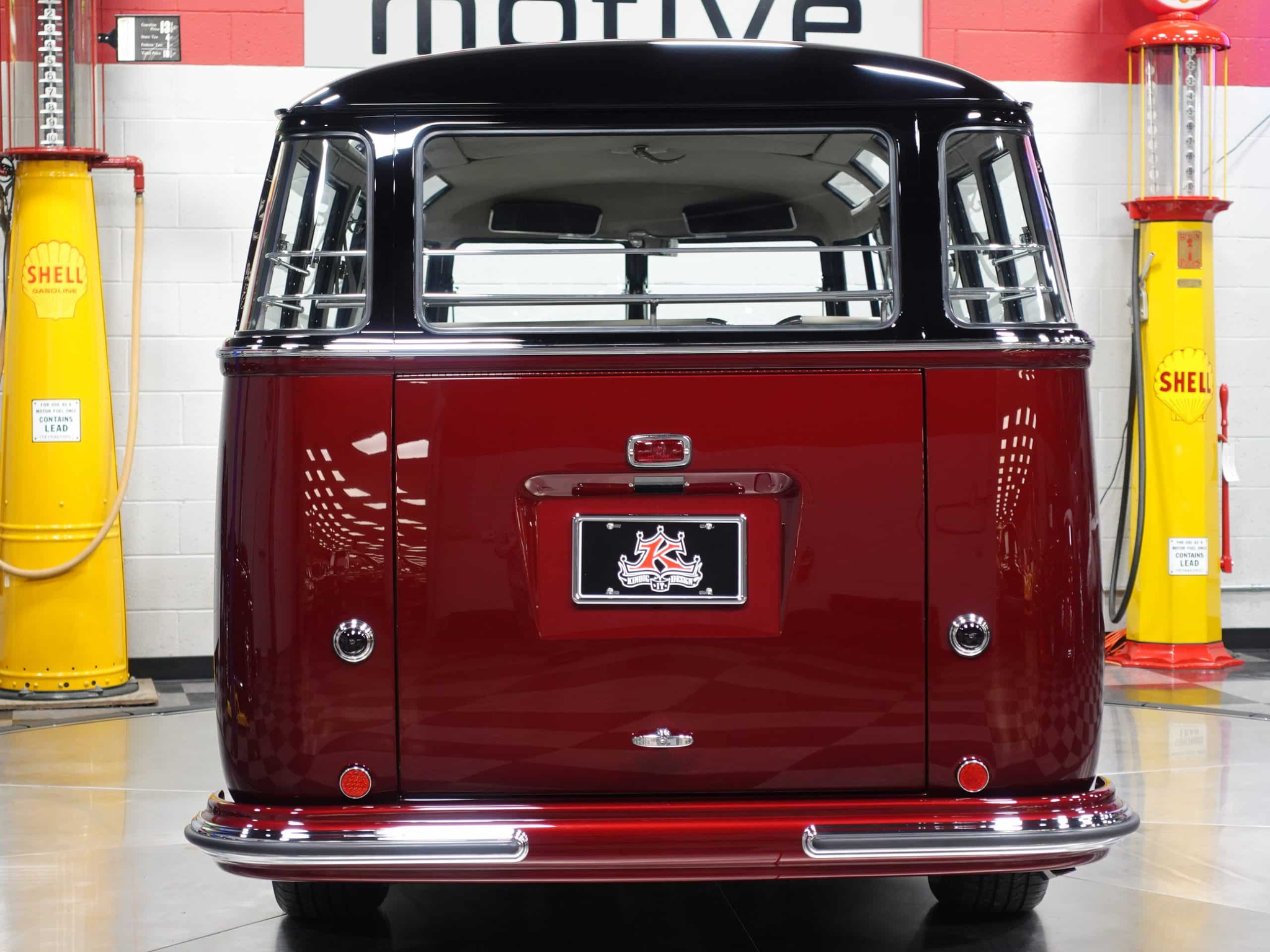 Renowned custom designer and automotive artist Dave Kindig and his team performed a complete custom build to create a one-of-a-kind 1953 Volkswagen Barn Door Deluxe 23-window Bus. The team started with a complete genuine 1953 BarnDoor 23-window VW Bus. The Kindig team started by installing a custom VW engine with twin Weber 48 carbs generating 176 horsepower. Then they installed a 1987 Vanagon automatic transmission for driving ease and to handle the extra power. The sheet metal was stripped, custom metalwork performed, and custom paint applied. The two-tone paint colors are Kindig’s own mixes of Bad Blood Red and Black Hole Black. Solid stock aluminum was hand formed and triple chrome plated to create the trim Soft leather seats in pale gray complement the rich gray German wool carpeting and custom headliner. The chrome Jail Bar luggage containment is a genuine feature of the Barn Door buses. A modern touch is a handsome Dakota digital gauge package. It rides on a lowered suspension with 4-wheel slotted disc brakes and staggered custom Kindig wheels. It was designed as a companion to the Collection’s 1950 VW Hebmuller Cabriolet. Please be sure to see the detailed photos at www.maxmotive.com.
