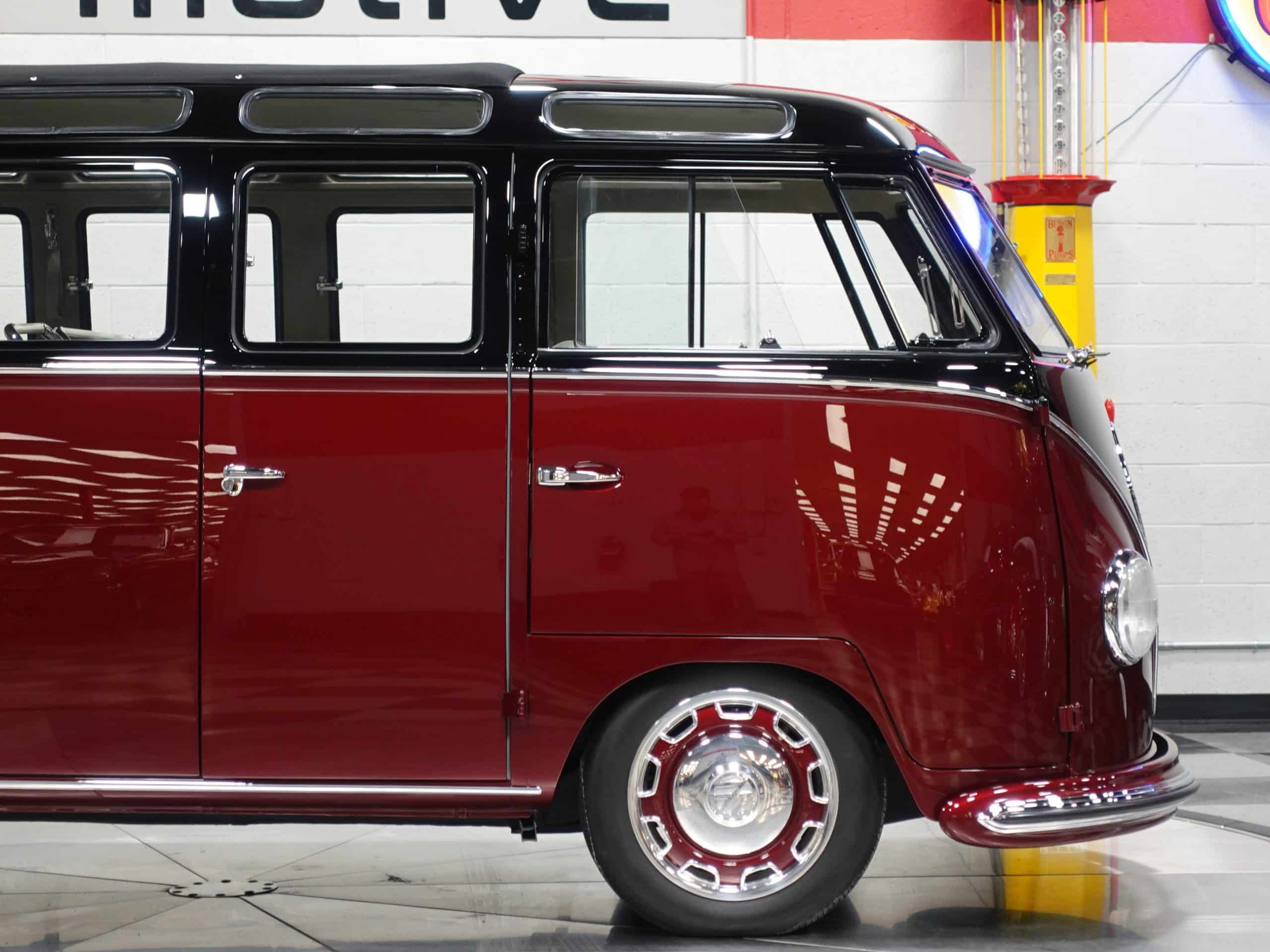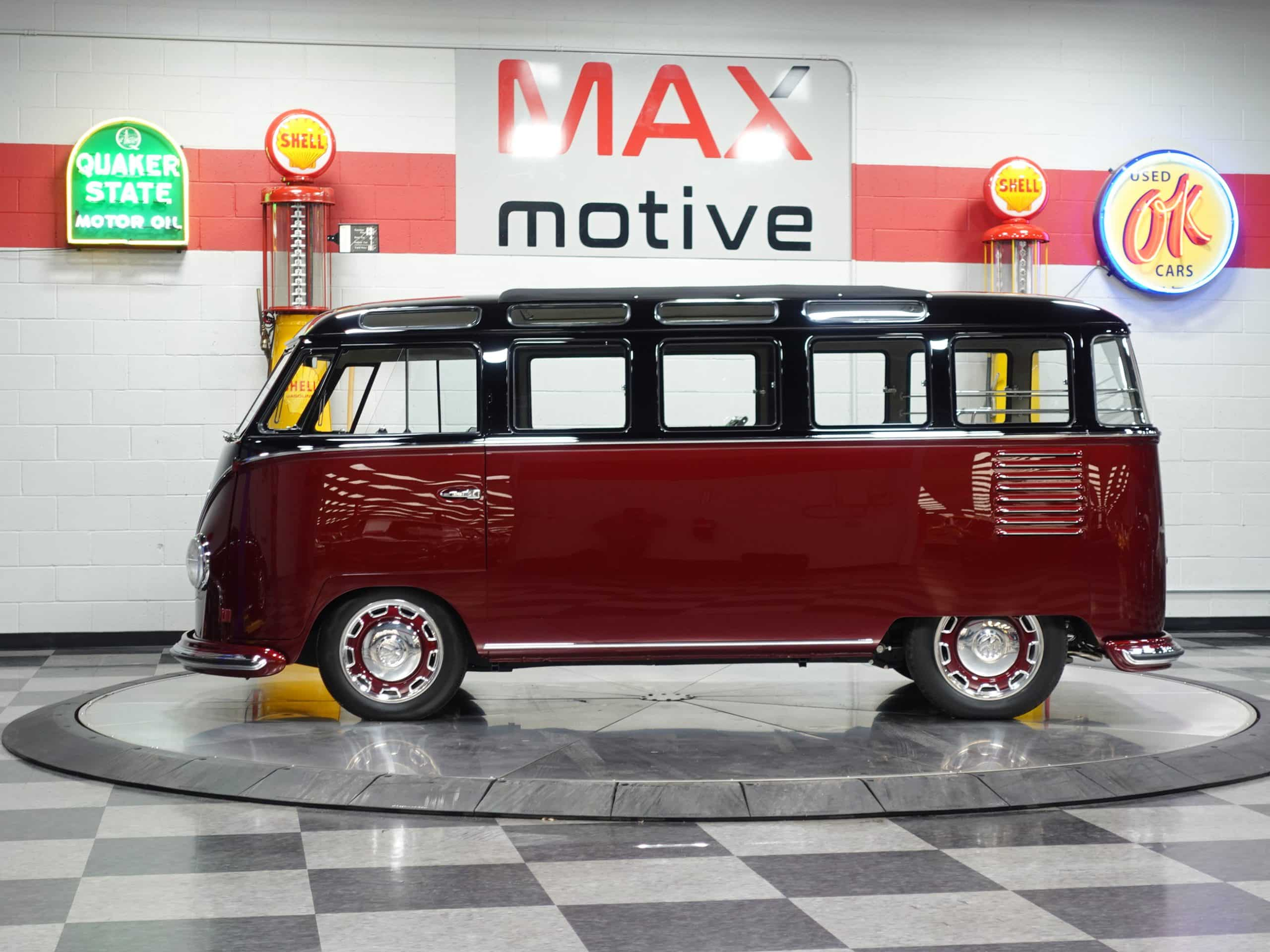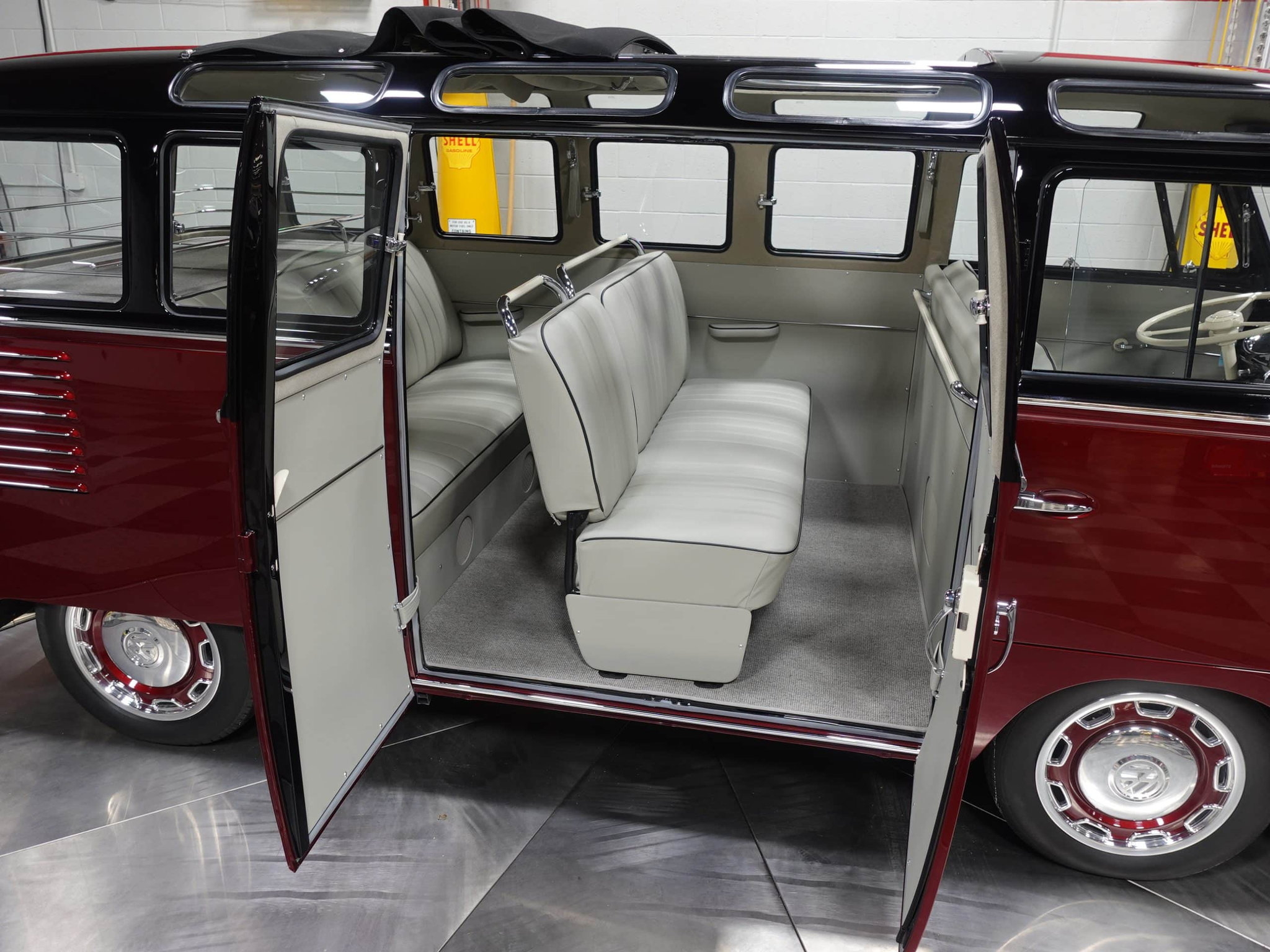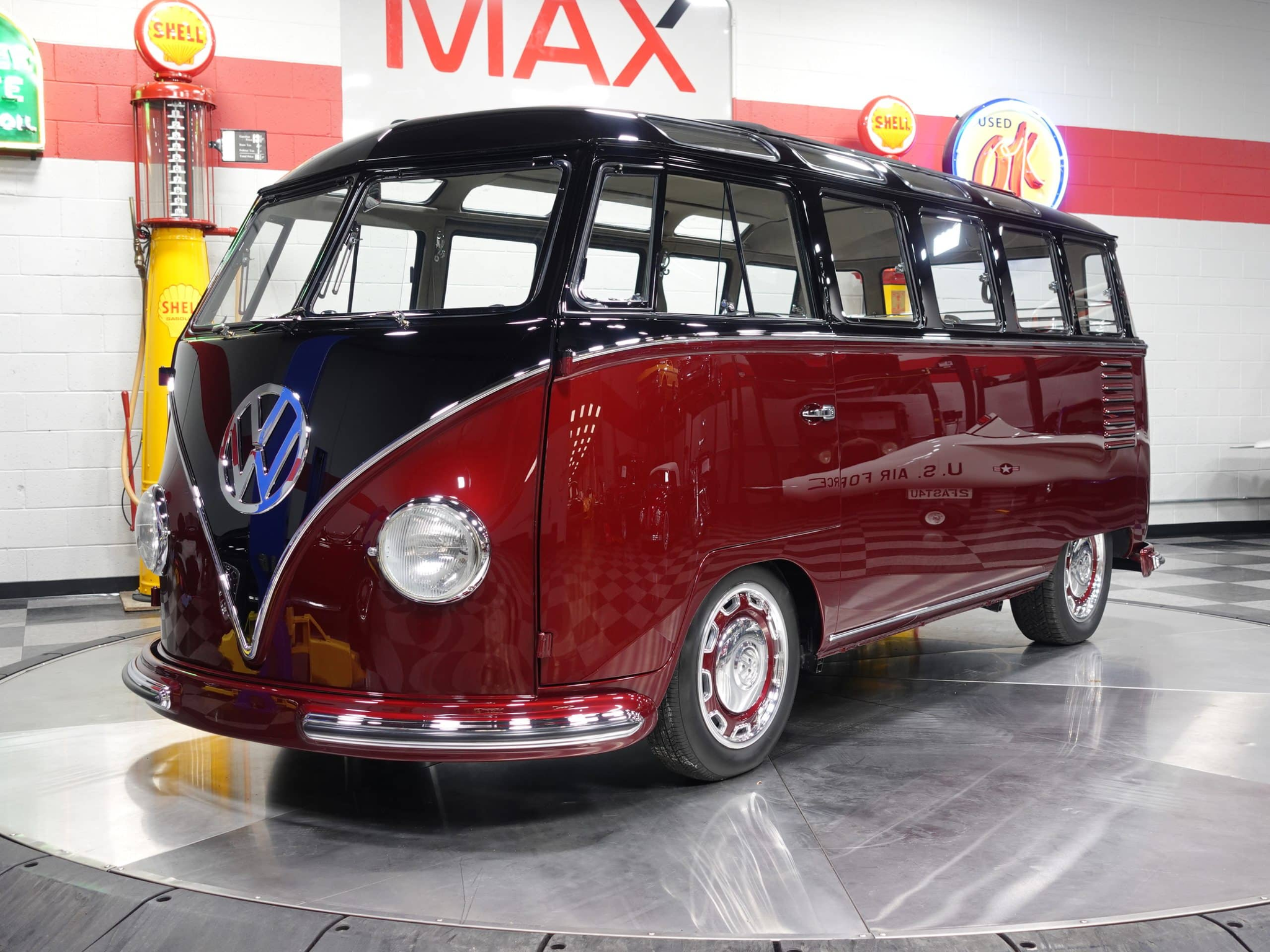 Renowned custom designer and automotive artist Dave Kindig and his team performed a complete custom build to create a one-of-a-kind 1953 Volkswagen Barn Door Deluxe 23-window Bus. The team started with a complete genuine 1953 BarnDoor 23-window VW Bus. The Kindig team started by installing a custom VW engine with twin Weber 48 carbs generating 176 horsepower. Then they installed a 1987 Vanagon automatic transmission for driving ease and to handle the extra power. The sheet metal was stripped, custom metalwork performed, and custom paint applied. The two-tone paint colors are Kindig’s own mixes of Bad Blood Red and Black Hole Black. Solid stock aluminum was hand formed and triple chrome plated to create the trim Soft leather seats in pale gray complement the rich gray German wool carpeting and custom headliner. The chrome Jail Bar luggage containment is a genuine feature of the Barn Door buses. A modern touch is a handsome Dakota digital gauge package. It rides on a lowered suspension with 4-wheel slotted disc brakes and staggered custom Kindig wheels. It was designed as a companion to the Collection’s 1950 VW Hebmuller Cabriolet. Please be sure to see the detailed photos at www.maxmotive.com.