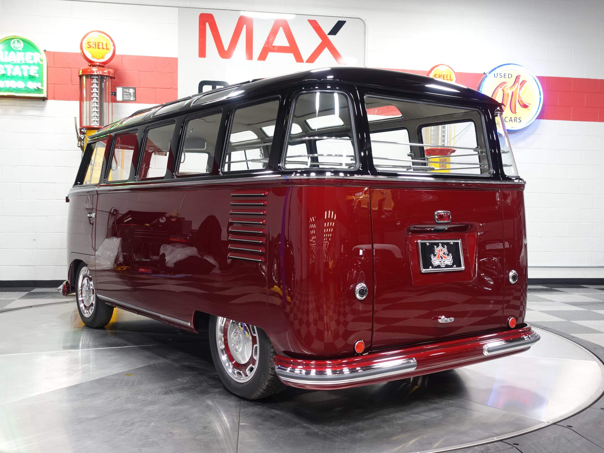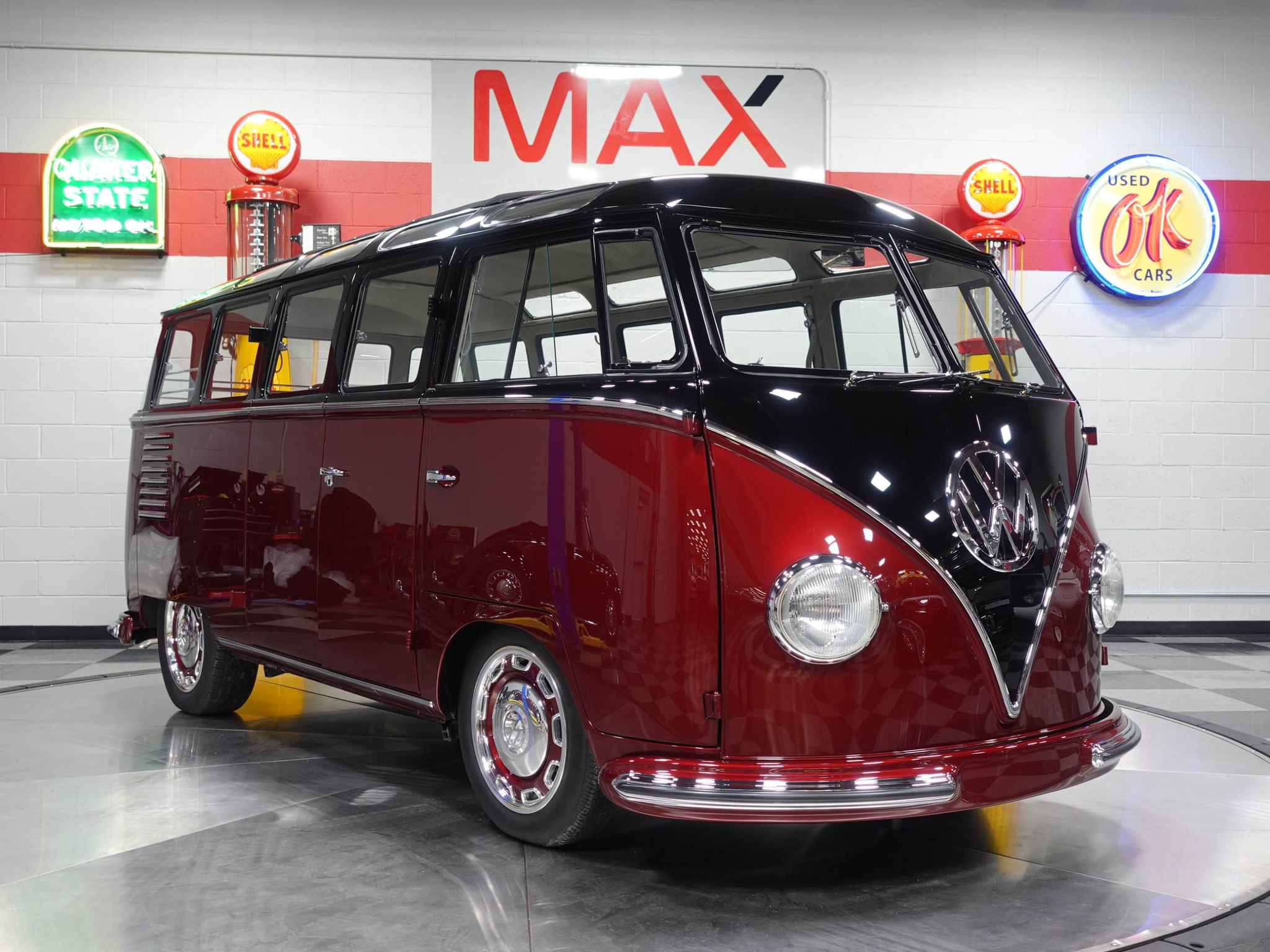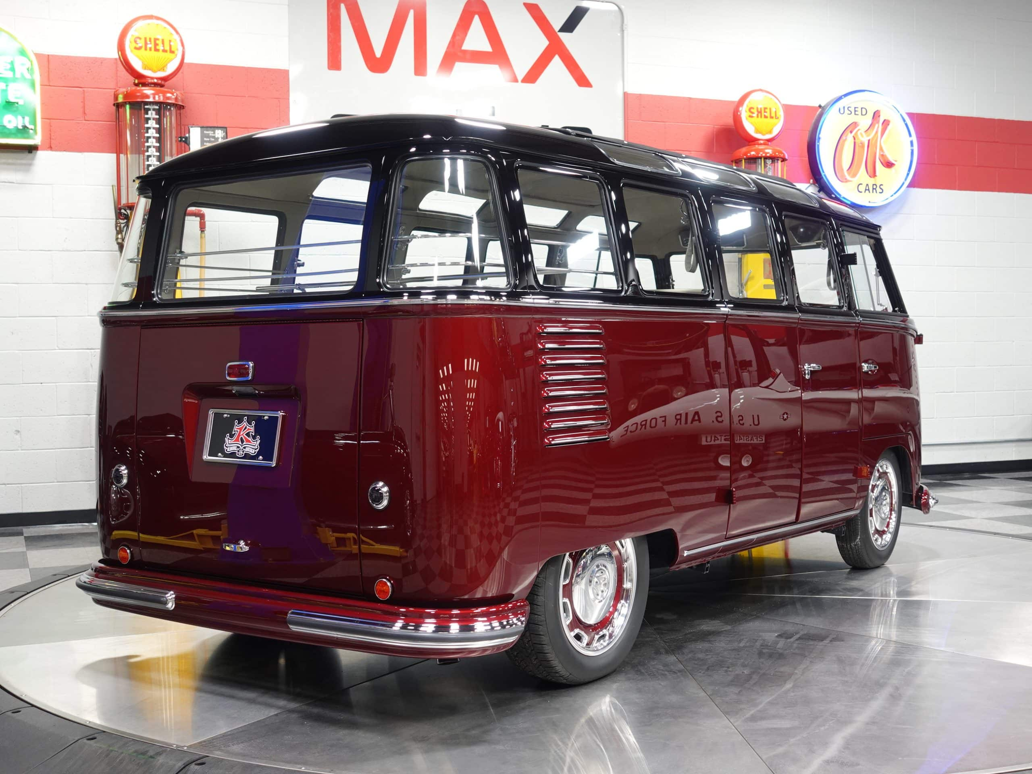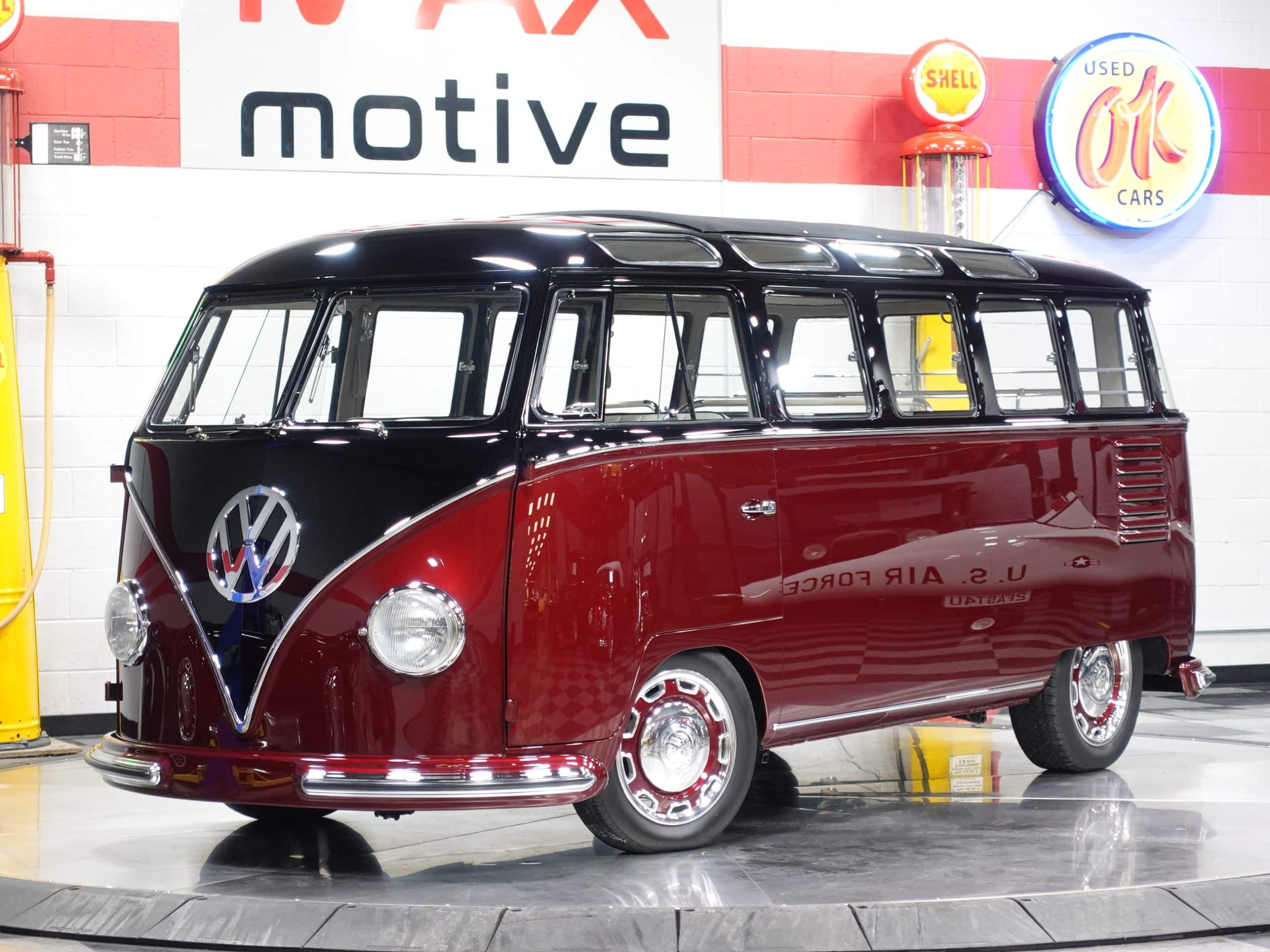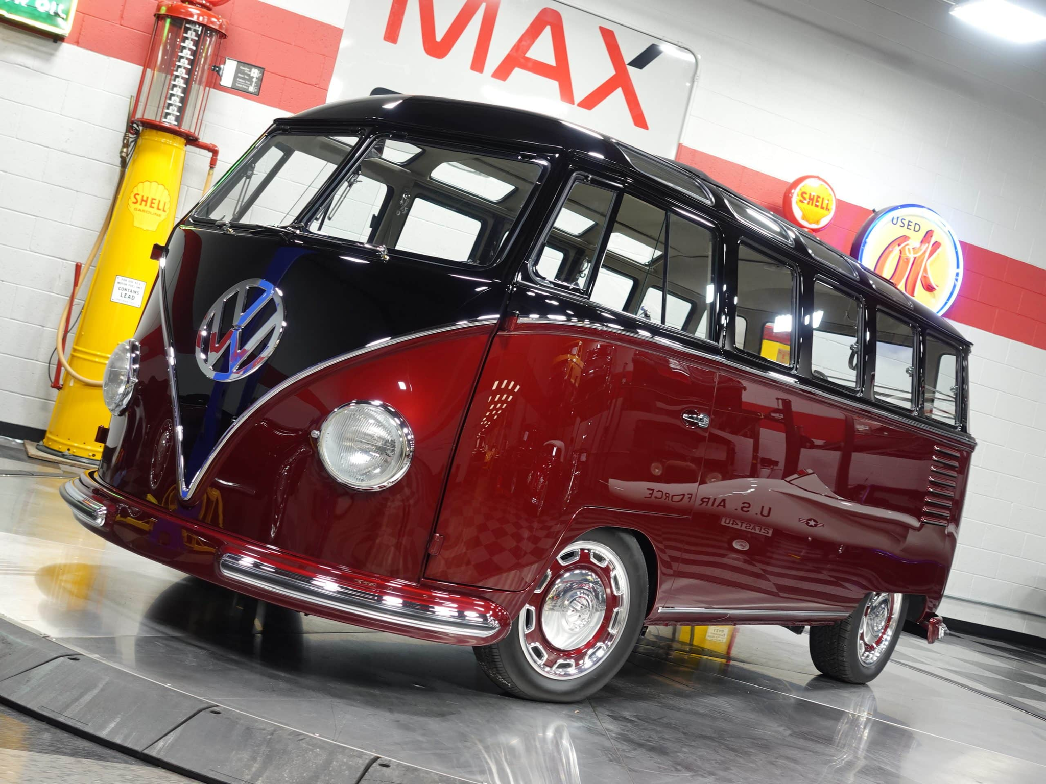 Renowned custom designer and automotive artist Dave Kindig and his team performed a complete custom build to create a one-of-a-kind 1953 Volkswagen Barn Door Deluxe 23-window Bus. The team started with a complete genuine 1953 BarnDoor 23-window VW Bus. The Kindig team started by installing a custom VW engine with twin Weber 48 carbs generating 176 horsepower. Then they installed a 1987 Vanagon automatic transmission for driving ease and to handle the extra power. The sheet metal was stripped, custom metalwork performed, and custom paint applied. The two-tone paint colors are Kindig’s own mixes of Bad Blood Red and Black Hole Black. Solid stock aluminum was hand formed and triple chrome plated to create the trim Soft leather seats in pale gray complement the rich gray German wool carpeting and custom headliner. The chrome Jail Bar luggage containment is a genuine feature of the Barn Door buses. A modern touch is a handsome Dakota digital gauge package. It rides on a lowered suspension with 4-wheel slotted disc brakes and staggered custom Kindig wheels. It was designed as a companion to the Collection’s 1950 VW Hebmuller Cabriolet. Please be sure to see the detailed photos at www.maxmotive.com.