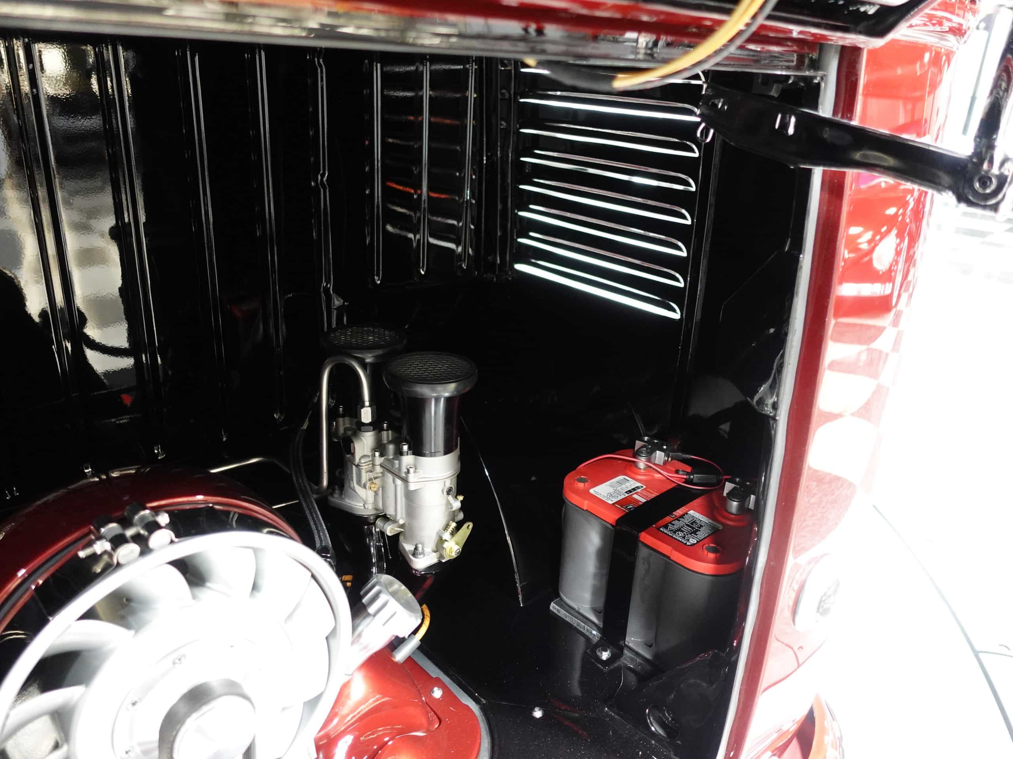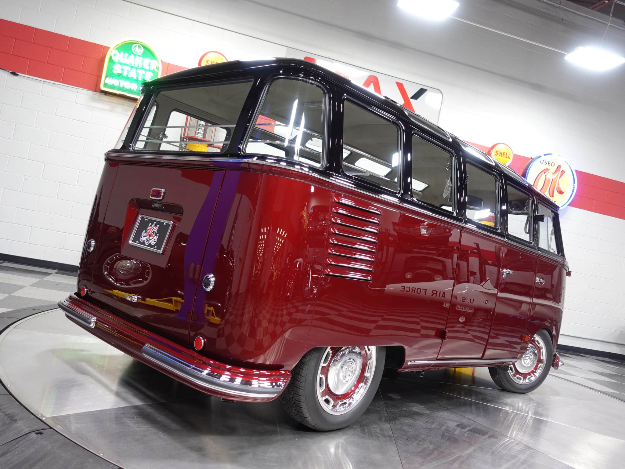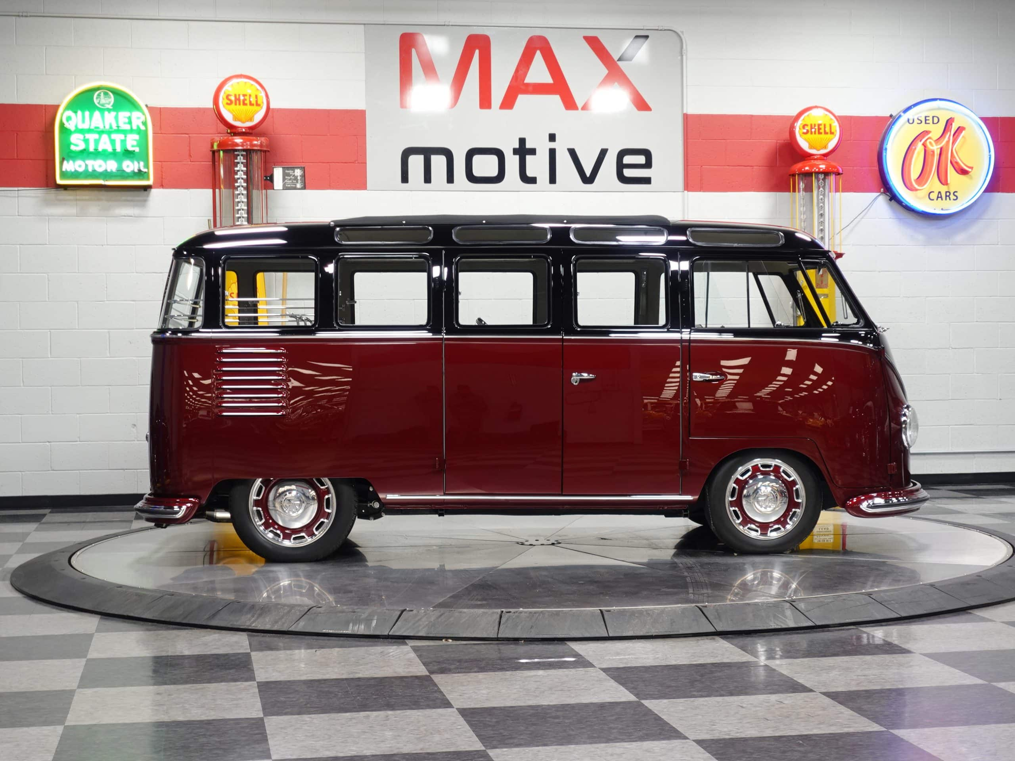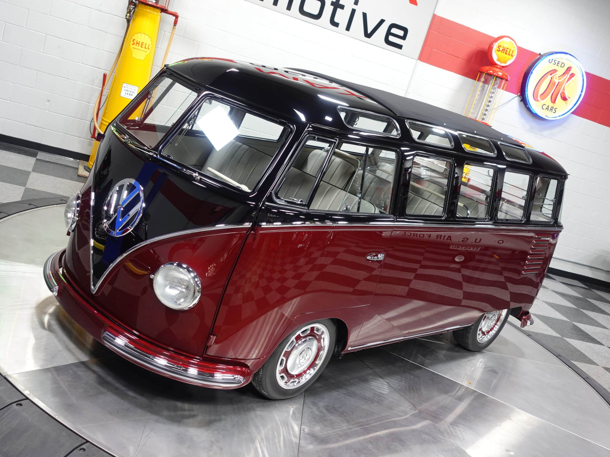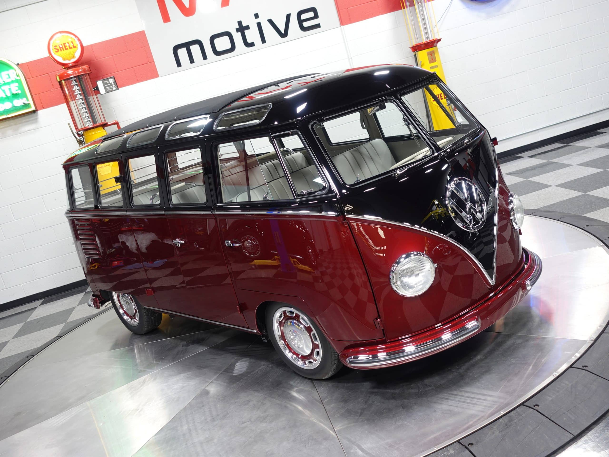 Renowned custom designer and automotive artist Dave Kindig and his team performed a complete custom build to create a one-of-a-kind 1953 Volkswagen Barn Door Deluxe 23-window Bus. The team started with a complete genuine 1953 BarnDoor 23-window VW Bus. The Kindig team started by installing a custom VW engine with twin Weber 48 carbs generating 176 horsepower. Then they installed a 1987 Vanagon automatic transmission for driving ease and to handle the extra power. The sheet metal was stripped, custom metalwork performed, and custom paint applied. The two-tone paint colors are Kindig’s own mixes of Bad Blood Red and Black Hole Black. Solid stock aluminum was hand formed and triple chrome plated to create the trim Soft leather seats in pale gray complement the rich gray German wool carpeting and custom headliner. The chrome Jail Bar luggage containment is a genuine feature of the Barn Door buses. A modern touch is a handsome Dakota digital gauge package. It rides on a lowered suspension with 4-wheel slotted disc brakes and staggered custom Kindig wheels. It was designed as a companion to the Collection’s 1950 VW Hebmuller Cabriolet. Please be sure to see the detailed photos at www.maxmotive.com.