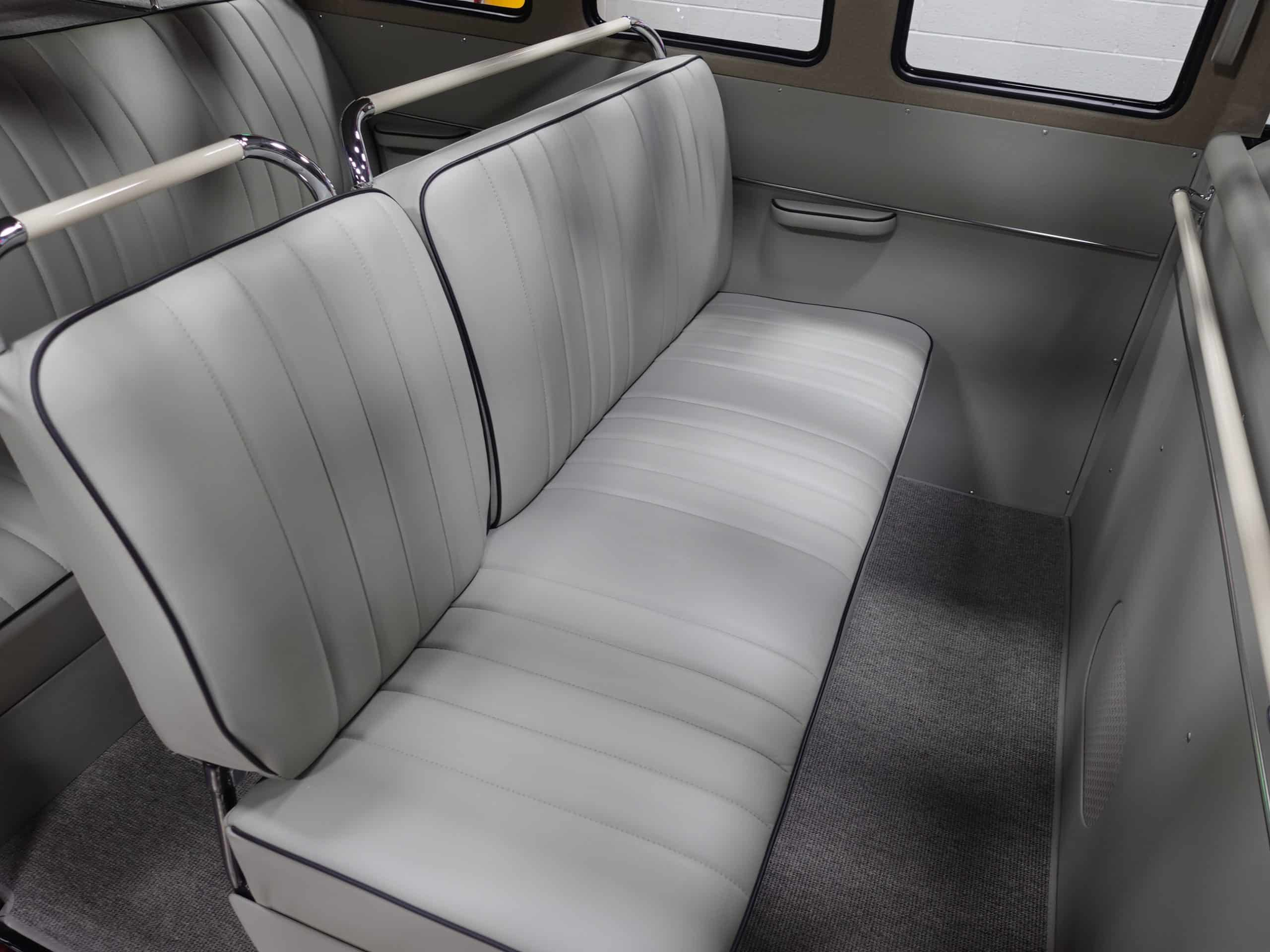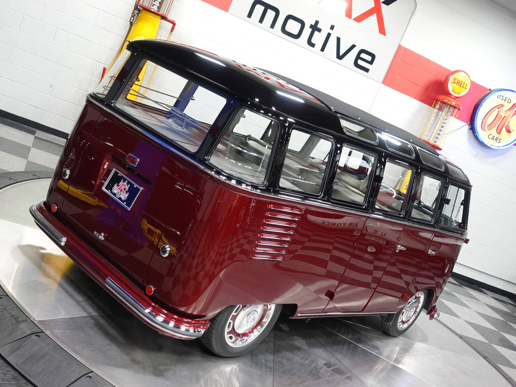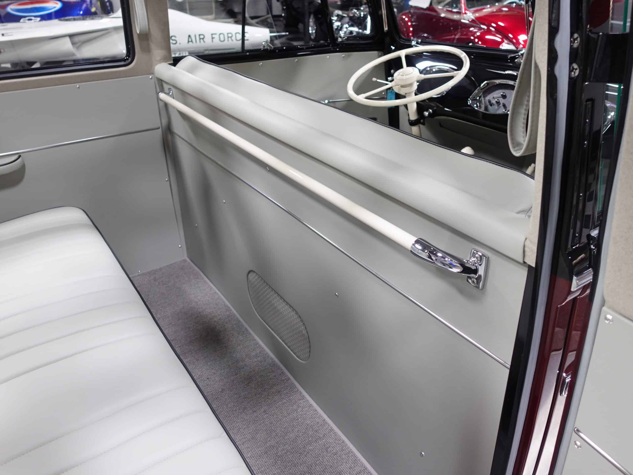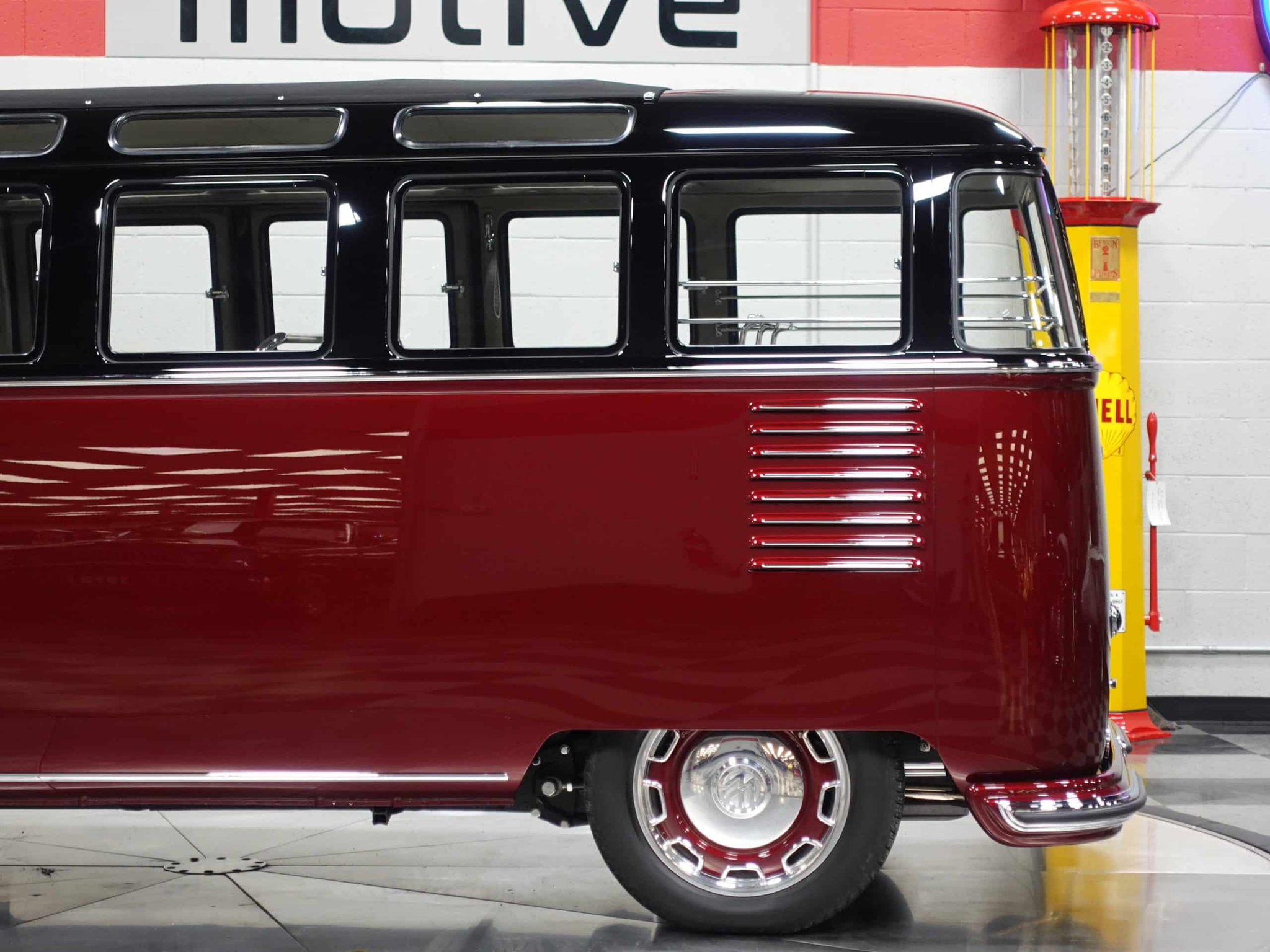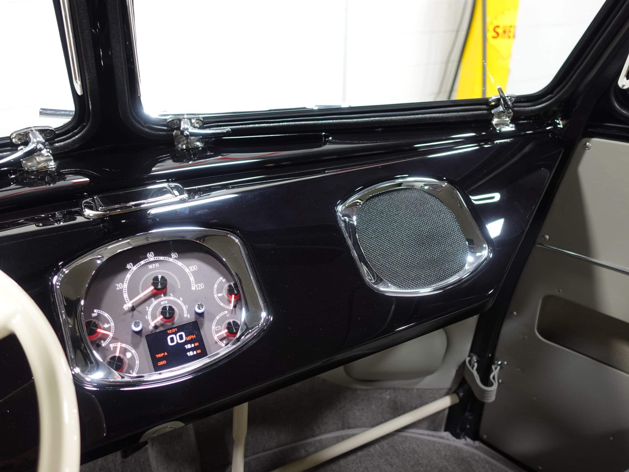 Renowned custom designer and automotive artist Dave Kindig and his team performed a complete custom build to create a one-of-a-kind 1953 Volkswagen Barn Door Deluxe 23-window Bus. The team started with a complete genuine 1953 BarnDoor 23-window VW Bus. The Kindig team started by installing a custom VW engine with twin Weber 48 carbs generating 176 horsepower. Then they installed a 1987 Vanagon automatic transmission for driving ease and to handle the extra power. The sheet metal was stripped, custom metalwork performed, and custom paint applied. The two-tone paint colors are Kindig’s own mixes of Bad Blood Red and Black Hole Black. Solid stock aluminum was hand formed and triple chrome plated to create the trim Soft leather seats in pale gray complement the rich gray German wool carpeting and custom headliner. The chrome Jail Bar luggage containment is a genuine feature of the Barn Door buses. A modern touch is a handsome Dakota digital gauge package. It rides on a lowered suspension with 4-wheel slotted disc brakes and staggered custom Kindig wheels. It was designed as a companion to the Collection’s 1950 VW Hebmuller Cabriolet. Please be sure to see the detailed photos at www.maxmotive.com.