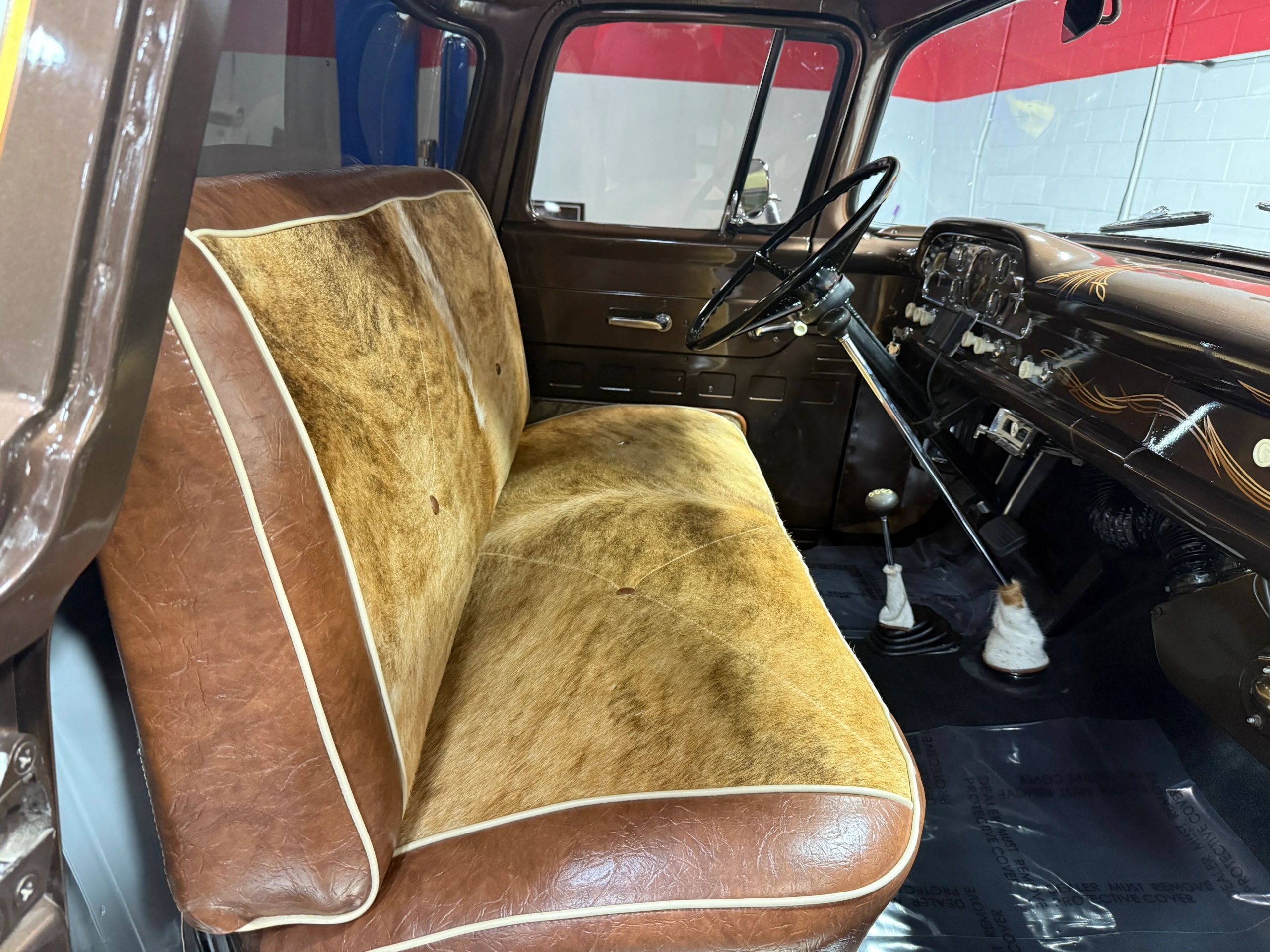 The cabin is a masterclass in custom craftsmanship. Stepping inside, you are greeted by a one-of-a-kind deer hide bench seat and matching deer hide side panels. This high-end, textured upholstery provides a rustic, premium feel that perfectly complements the trucks outdoorsman heritage.
