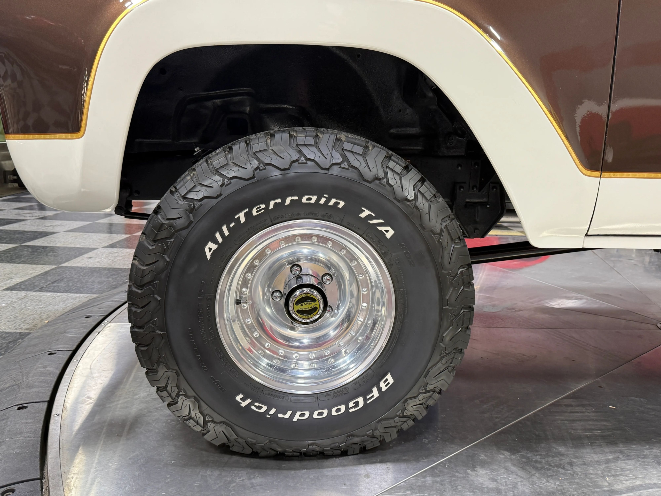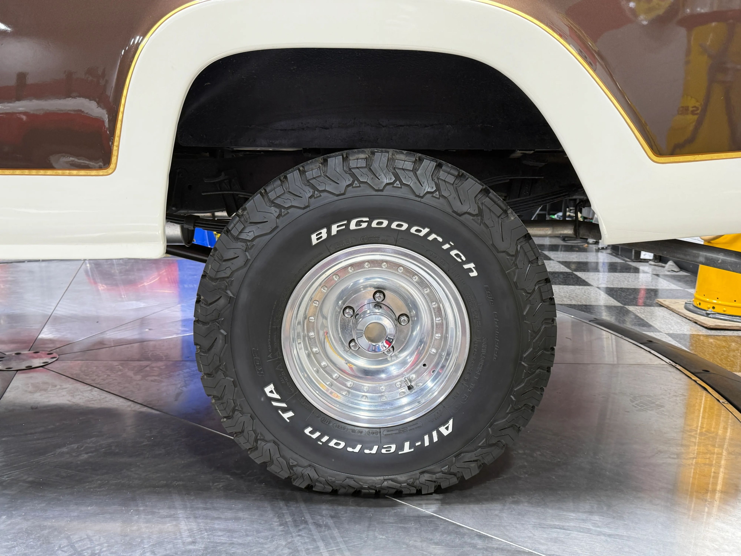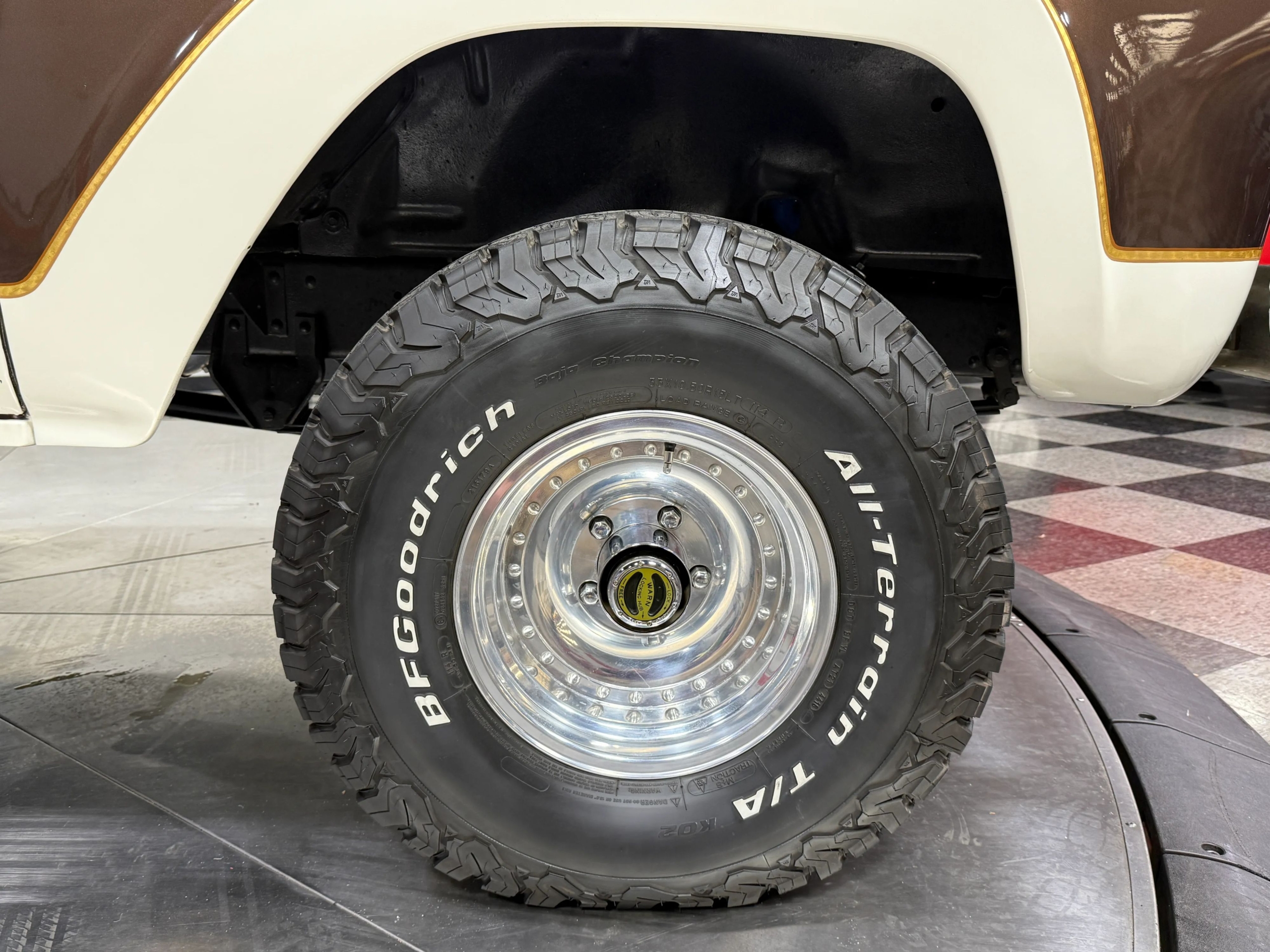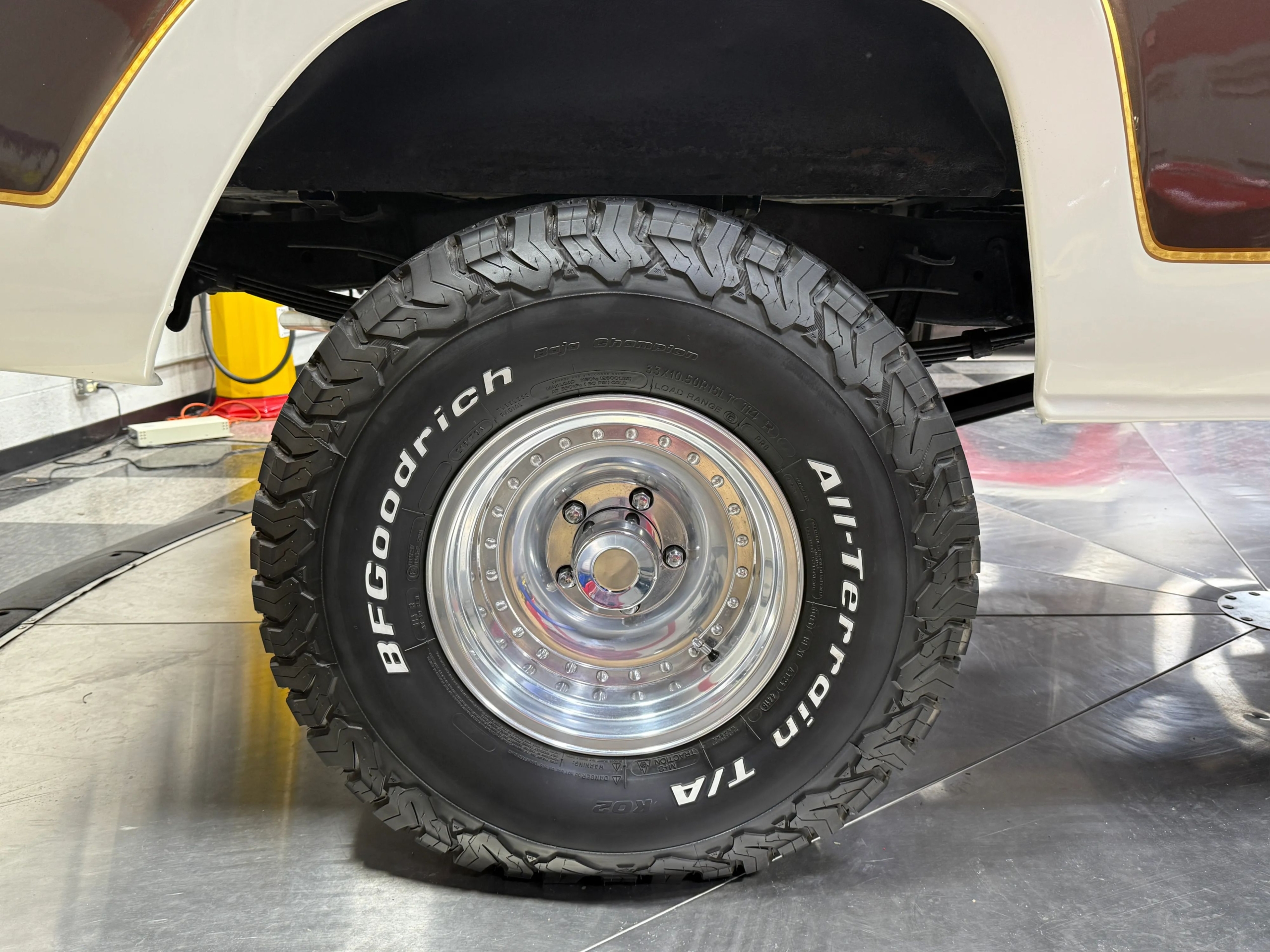 The truck makes a bold statement with its two-tone Brown and White finish, elevated by custom Gold leaf pinstriping. It sits with an aggressive, go-anywhere stance thanks to 15 wheels wrapped in beefy 33 BFGoodrich All-Terrain tires. To ensure the ride is as smooth as it is rugged, it has been outfitted with Monroe OESpectrum shocks, while the bed remains in excellent condition with a durable bedliner.