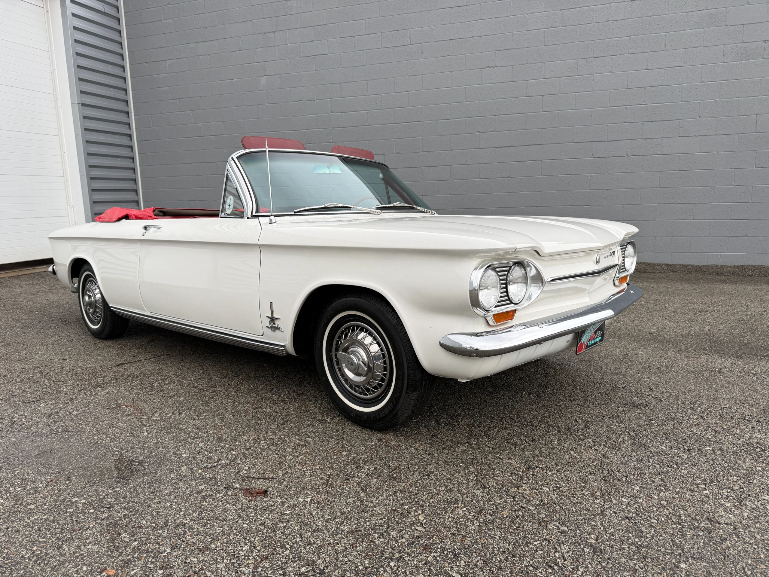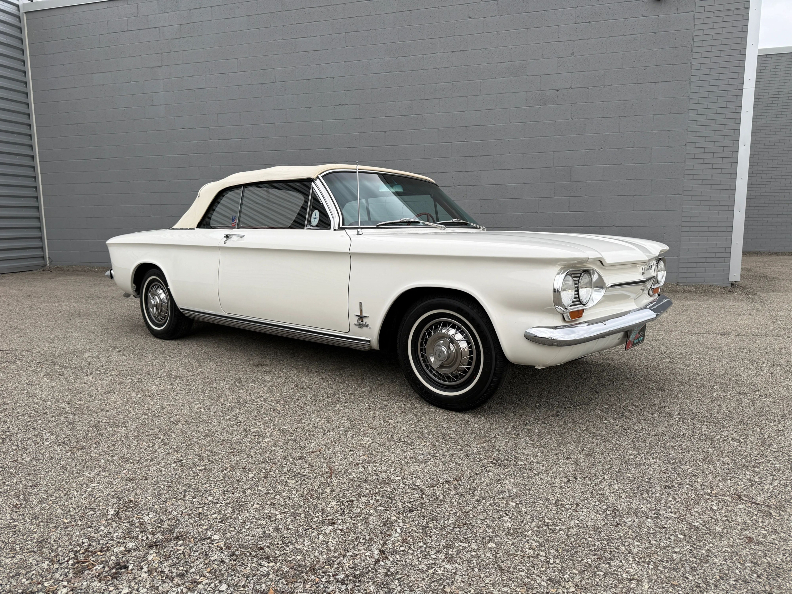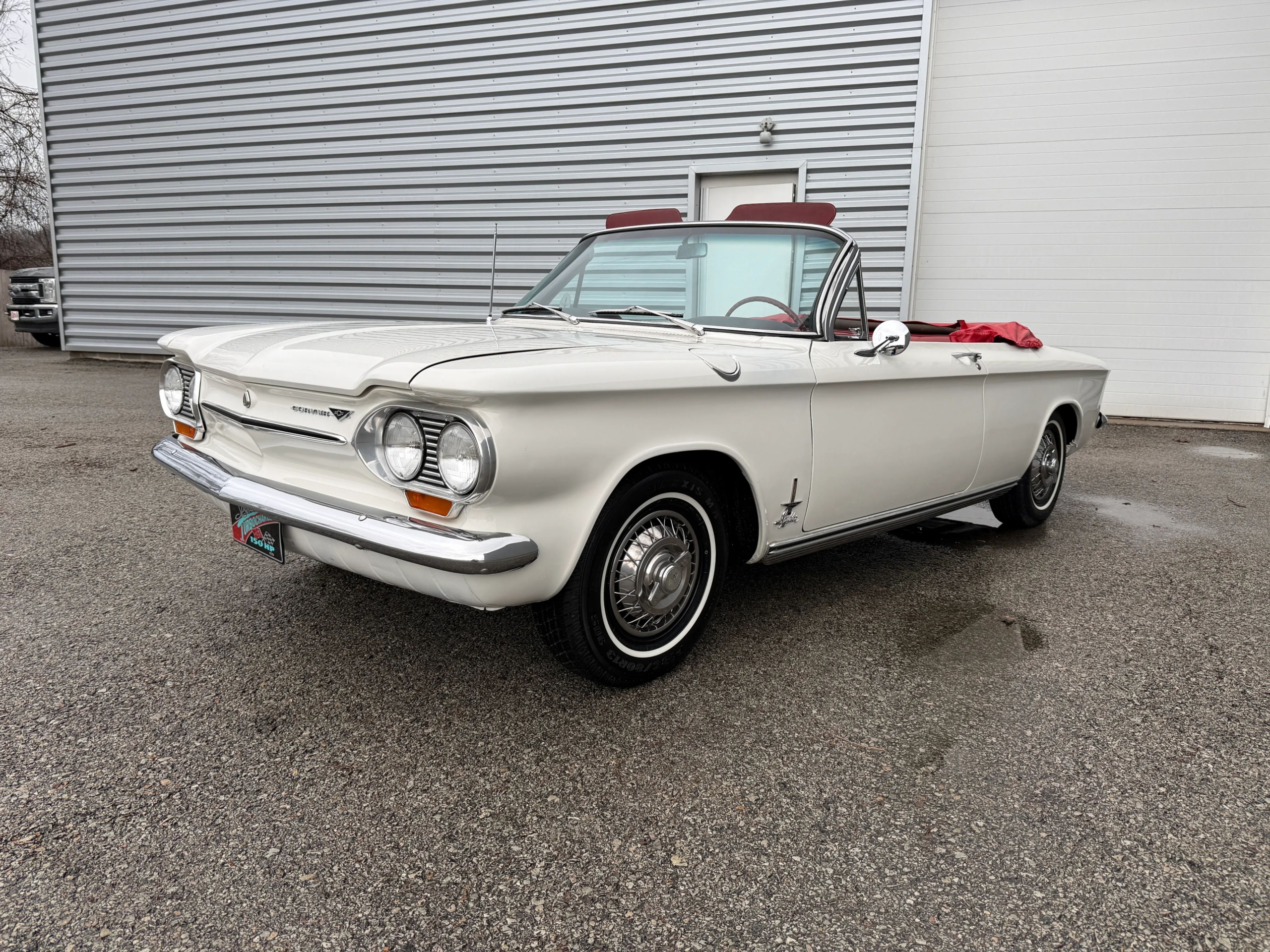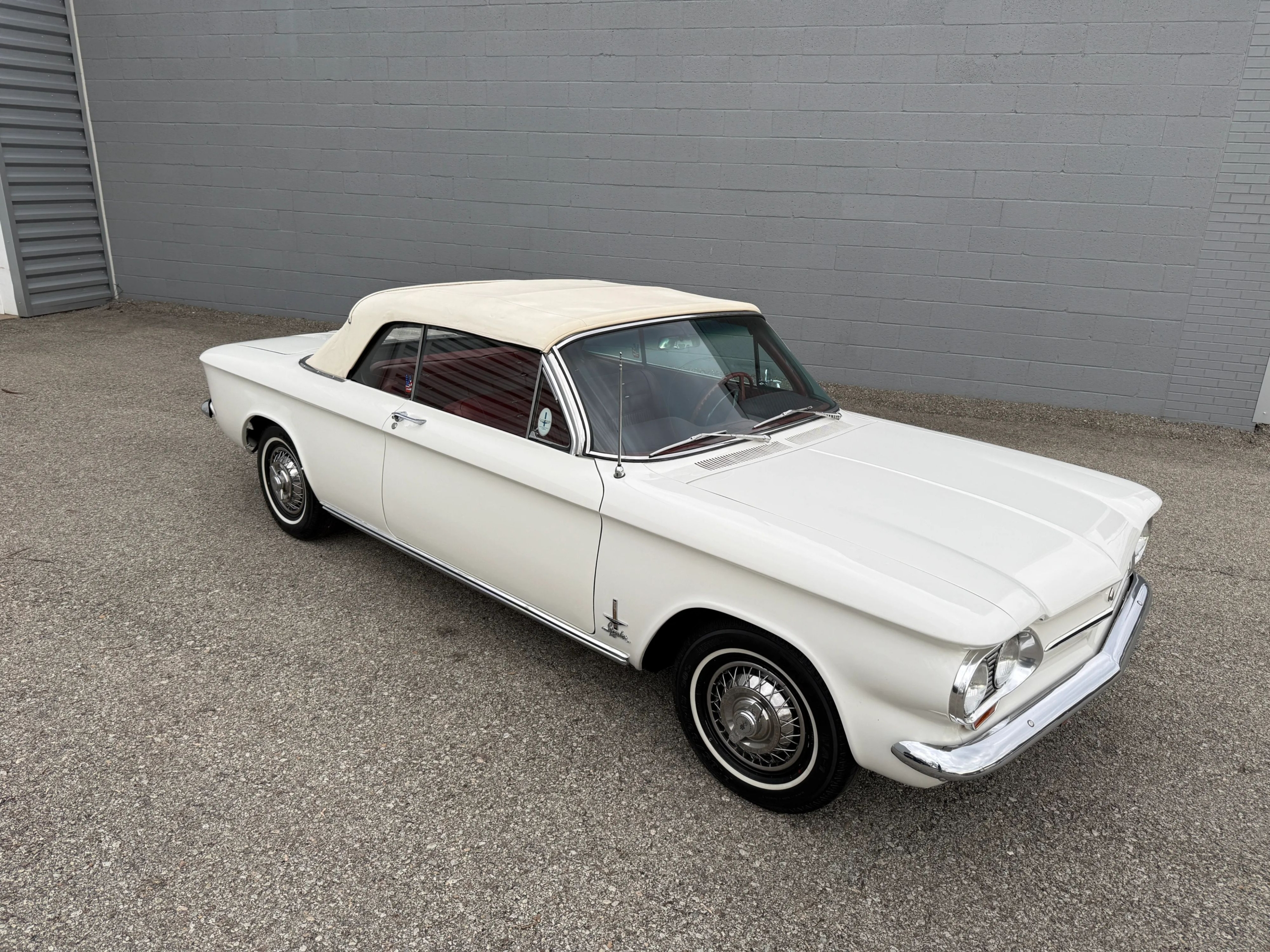 This 1963 Chevrolet Corvair Monza 900 Spyder is a classic rear-engine American convertible finished in a white exterior with a red vinyl interior. This specific model features the 2.4L Turbocharged engine paired with a 4-speed manual transmission, offering a unique, sporty driving experience. The car sits on 13 wire wheels with iconic Chevy spinner hubs and includes rear wheel skirts for a sleek, aerodynamic look. The white soft top is in good condition, and the vehicle retains its original swing-axle rear suspension setup. To provide peace of mind for collectors, it comes with a documented history of repairs and parts replacements.