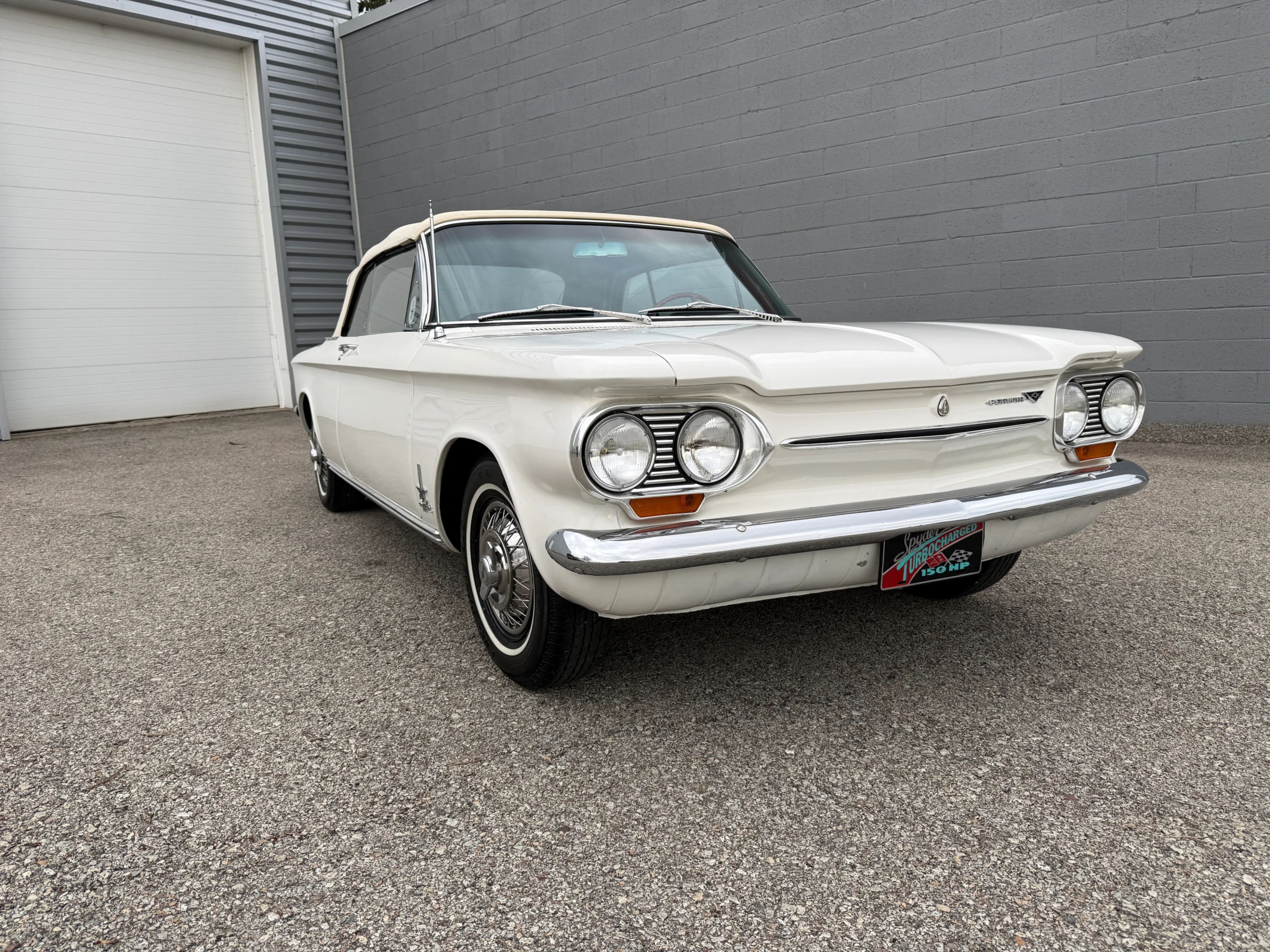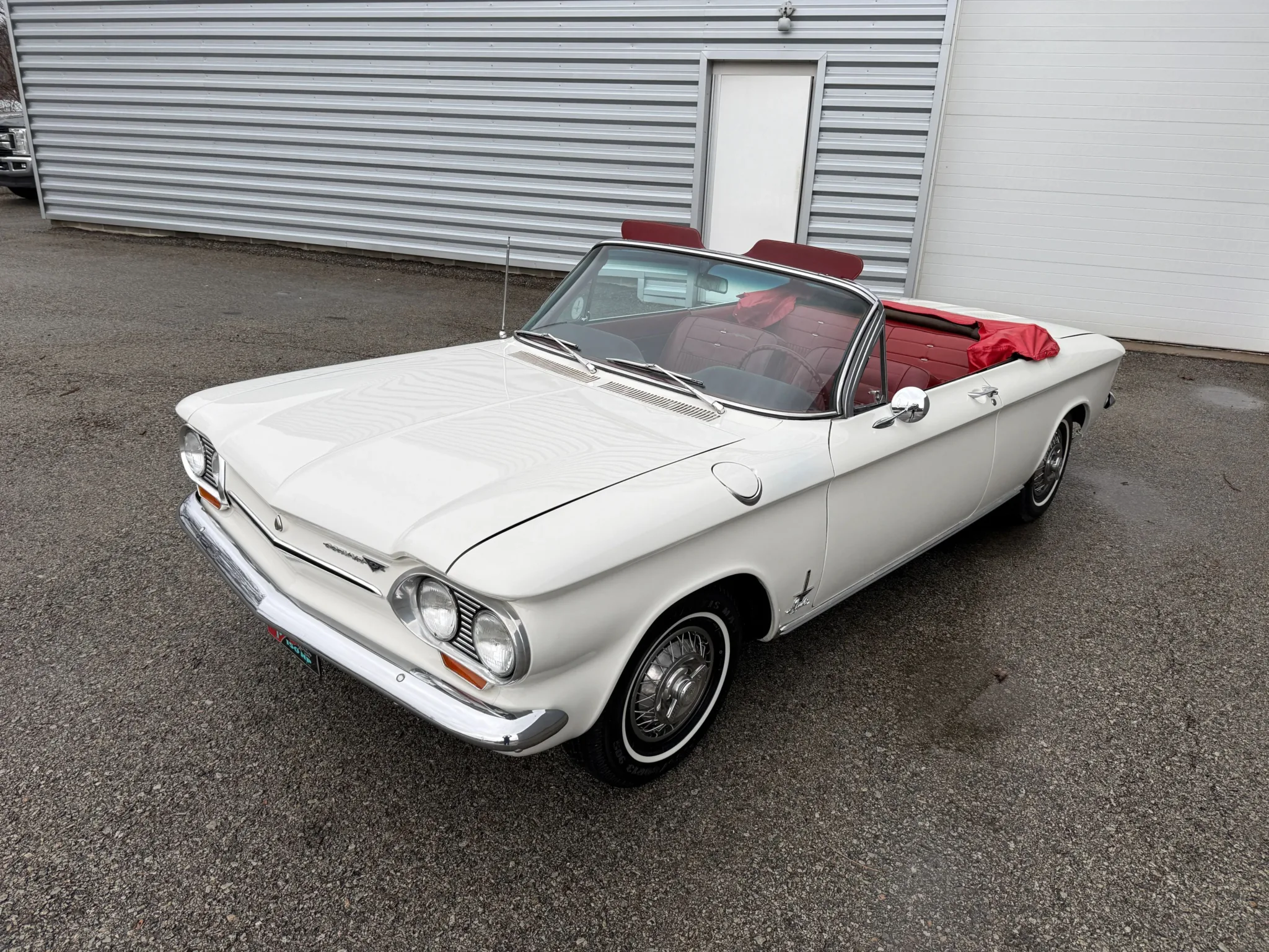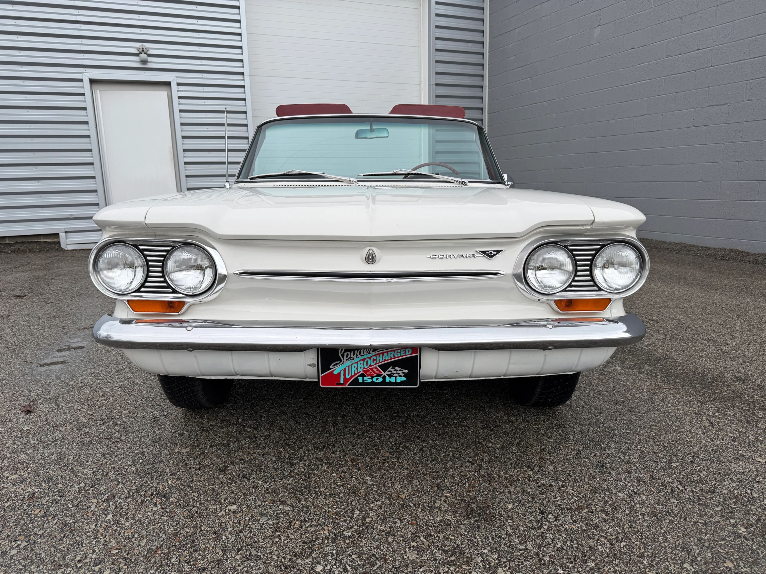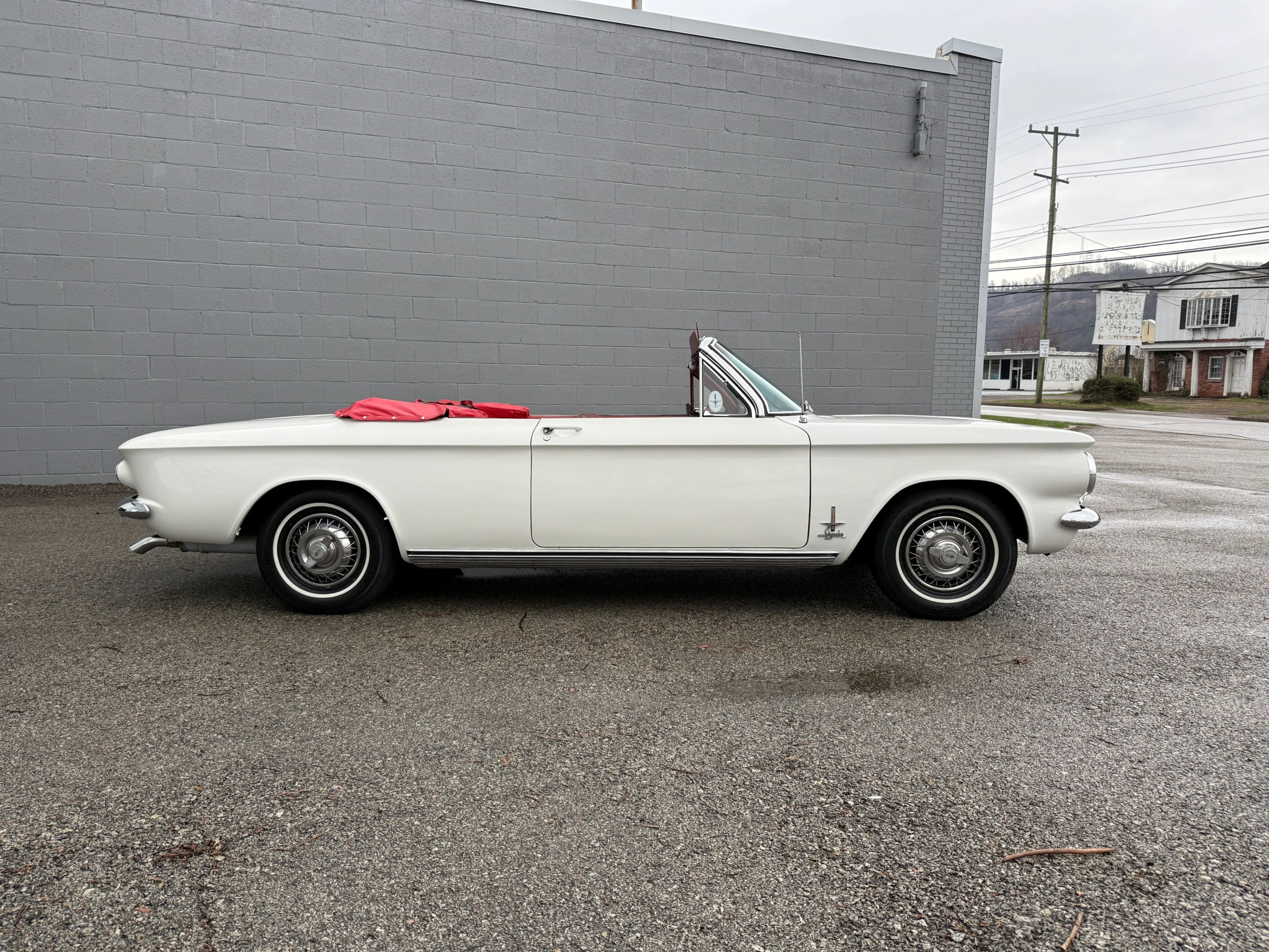 This 1963 Chevrolet Corvair Monza 900 Spyder is a classic rear-engine American convertible finished in a white exterior with a red vinyl interior. This specific model features the 2.4L Turbocharged engine paired with a 4-speed manual transmission, offering a unique, sporty driving experience. The car sits on 13 wire wheels with iconic Chevy spinner hubs and includes rear wheel skirts for a sleek, aerodynamic look. The white soft top is in good condition, and the vehicle retains its original swing-axle rear suspension setup. To provide peace of mind for collectors, it comes with a documented history of repairs and parts replacements.