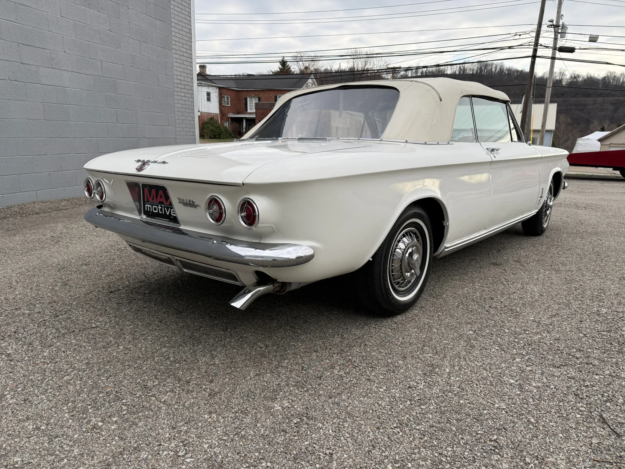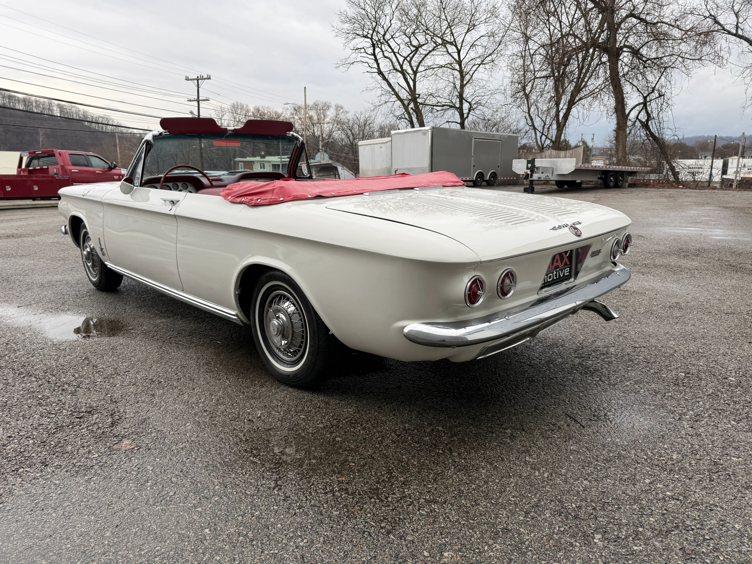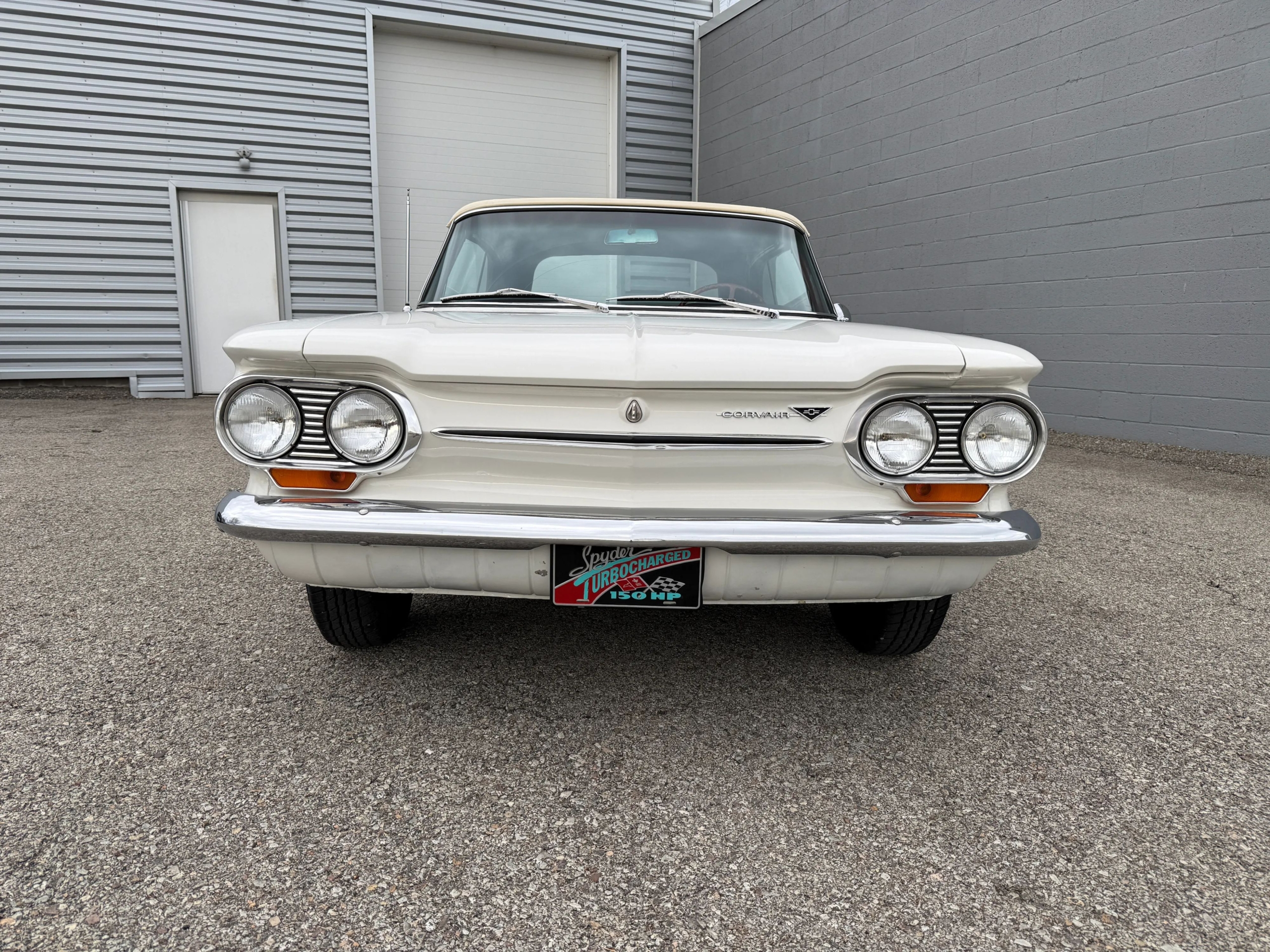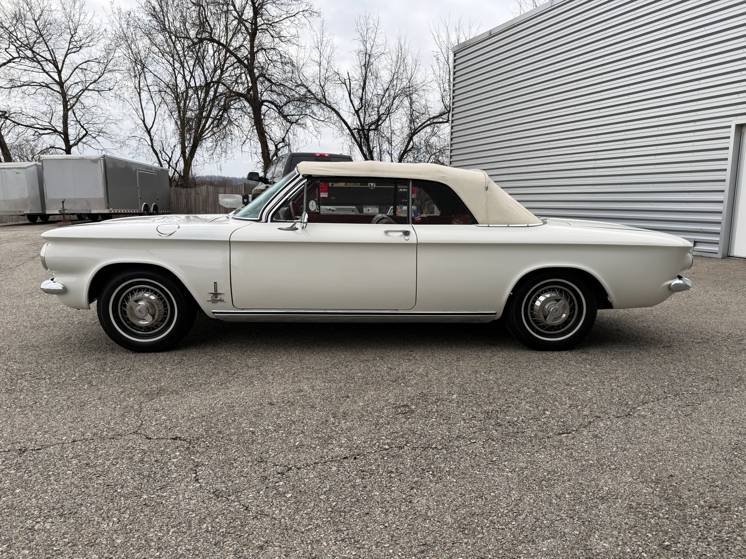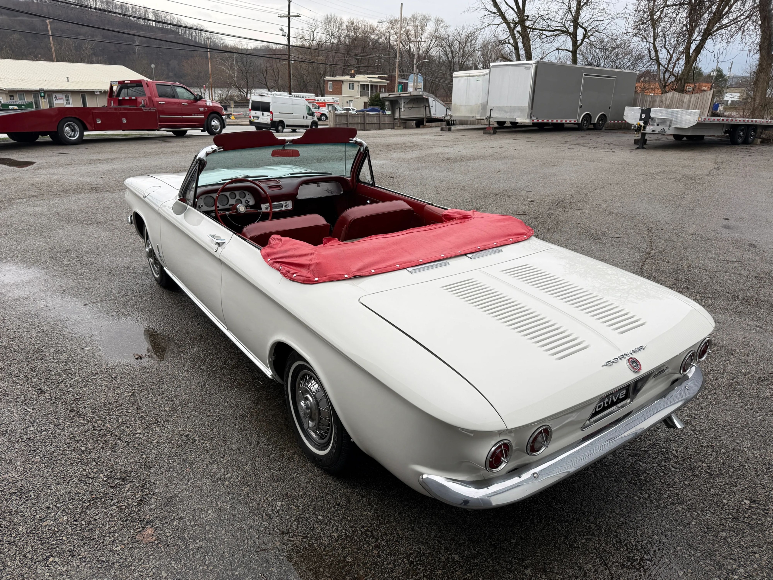 This 1963 Chevrolet Corvair Monza 900 Spyder is a classic rear-engine American convertible finished in a white exterior with a red vinyl interior. This specific model features the 2.4L Turbocharged engine paired with a 4-speed manual transmission, offering a unique, sporty driving experience. The car sits on 13 wire wheels with iconic Chevy spinner hubs and includes rear wheel skirts for a sleek, aerodynamic look. The white soft top is in good condition, and the vehicle retains its original swing-axle rear suspension setup. To provide peace of mind for collectors, it comes with a documented history of repairs and parts replacements.