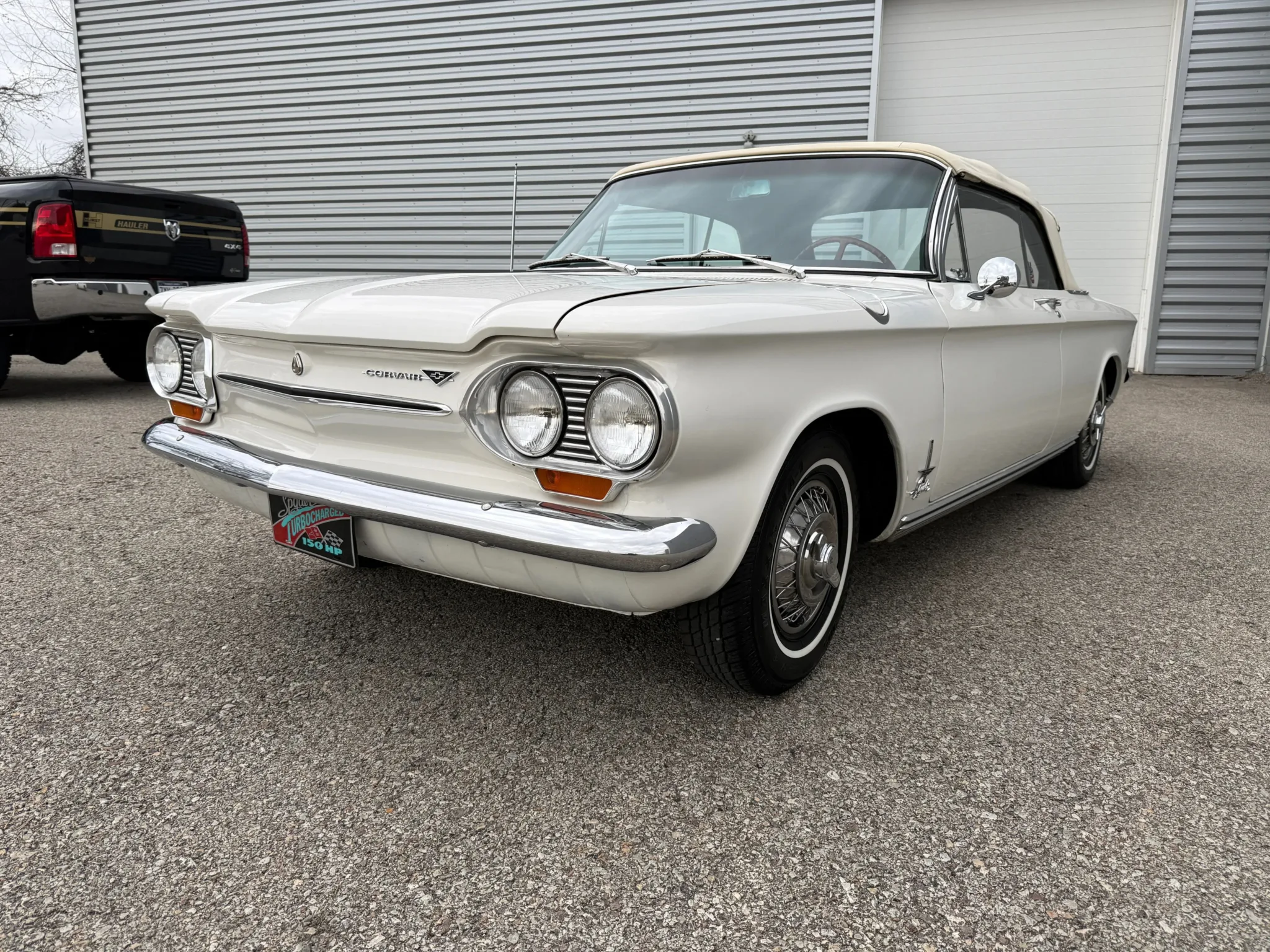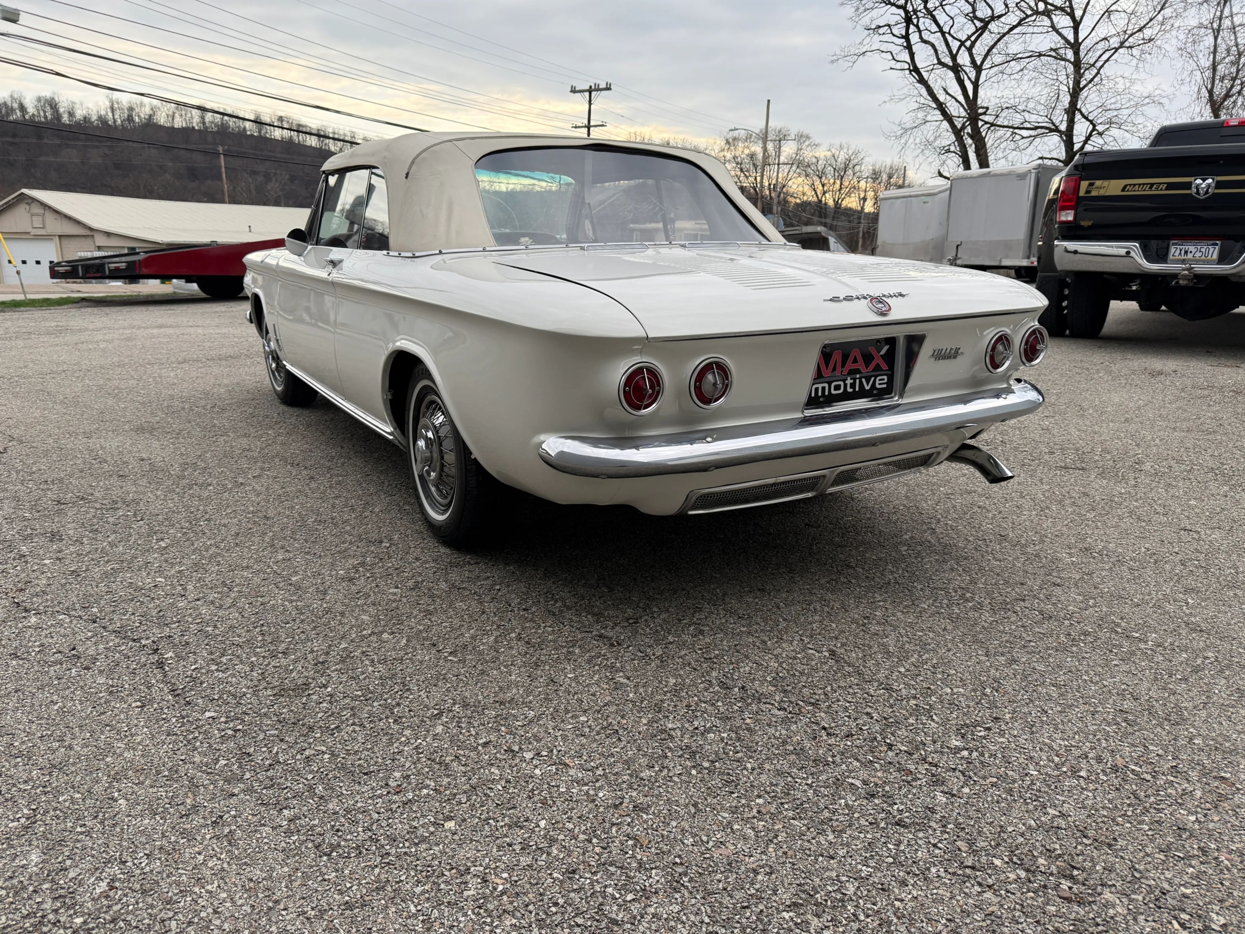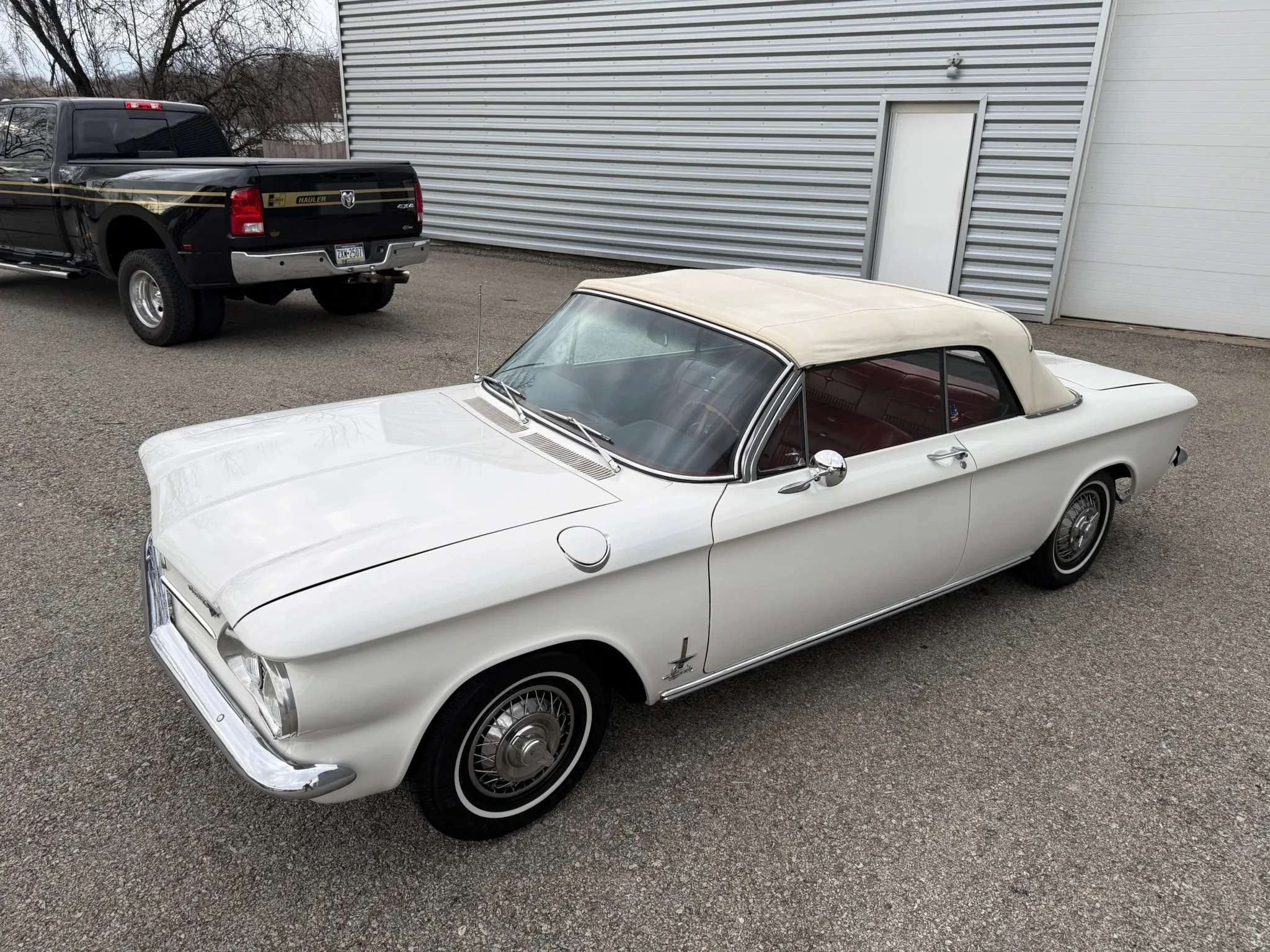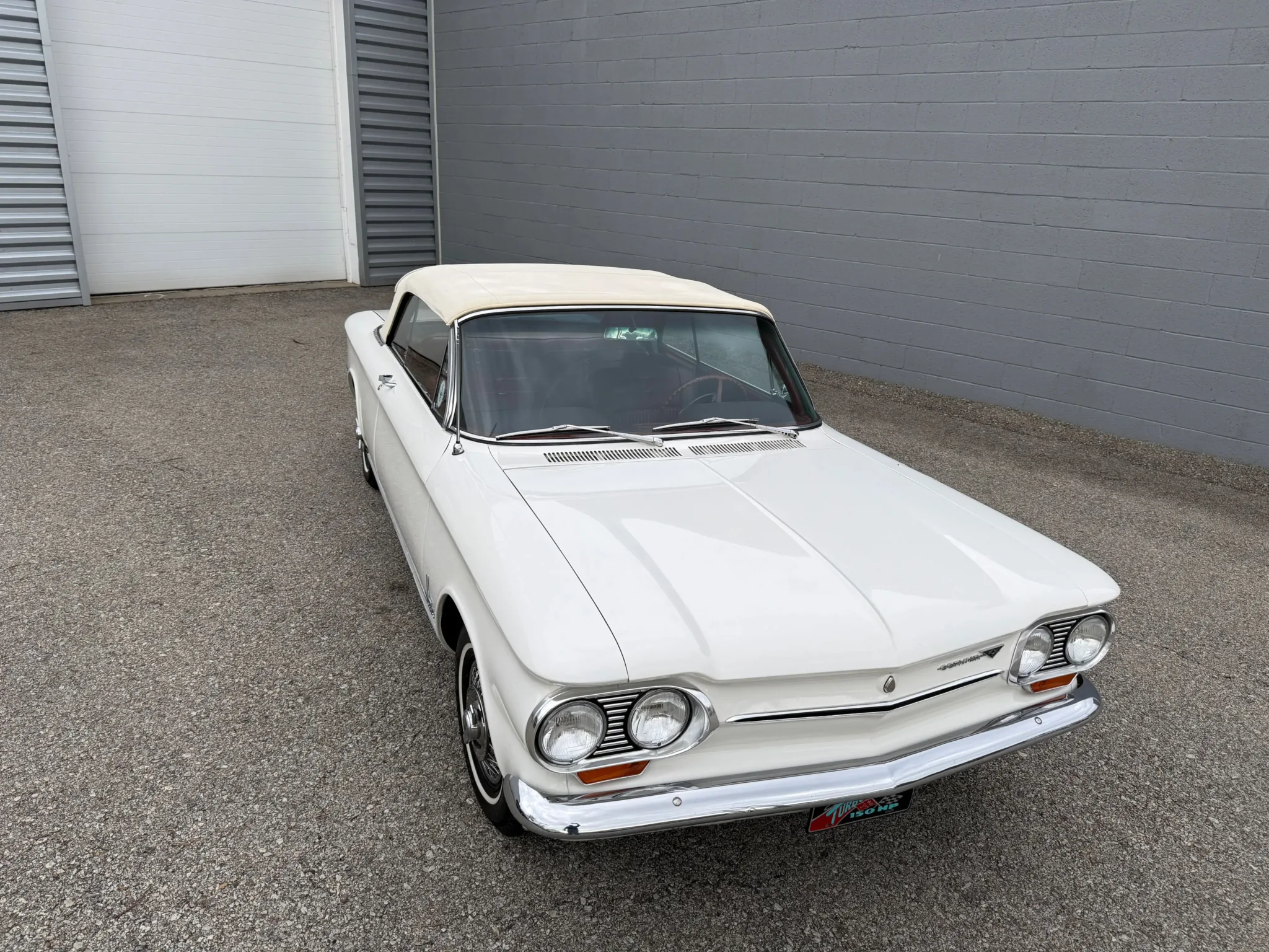 This 1963 Chevrolet Corvair Monza 900 Spyder is a classic rear-engine American convertible finished in a white exterior with a red vinyl interior. This specific model features the 2.4L Turbocharged engine paired with a 4-speed manual transmission, offering a unique, sporty driving experience. The car sits on 13 wire wheels with iconic Chevy spinner hubs and includes rear wheel skirts for a sleek, aerodynamic look. The white soft top is in good condition, and the vehicle retains its original swing-axle rear suspension setup. To provide peace of mind for collectors, it comes with a documented history of repairs and parts replacements.