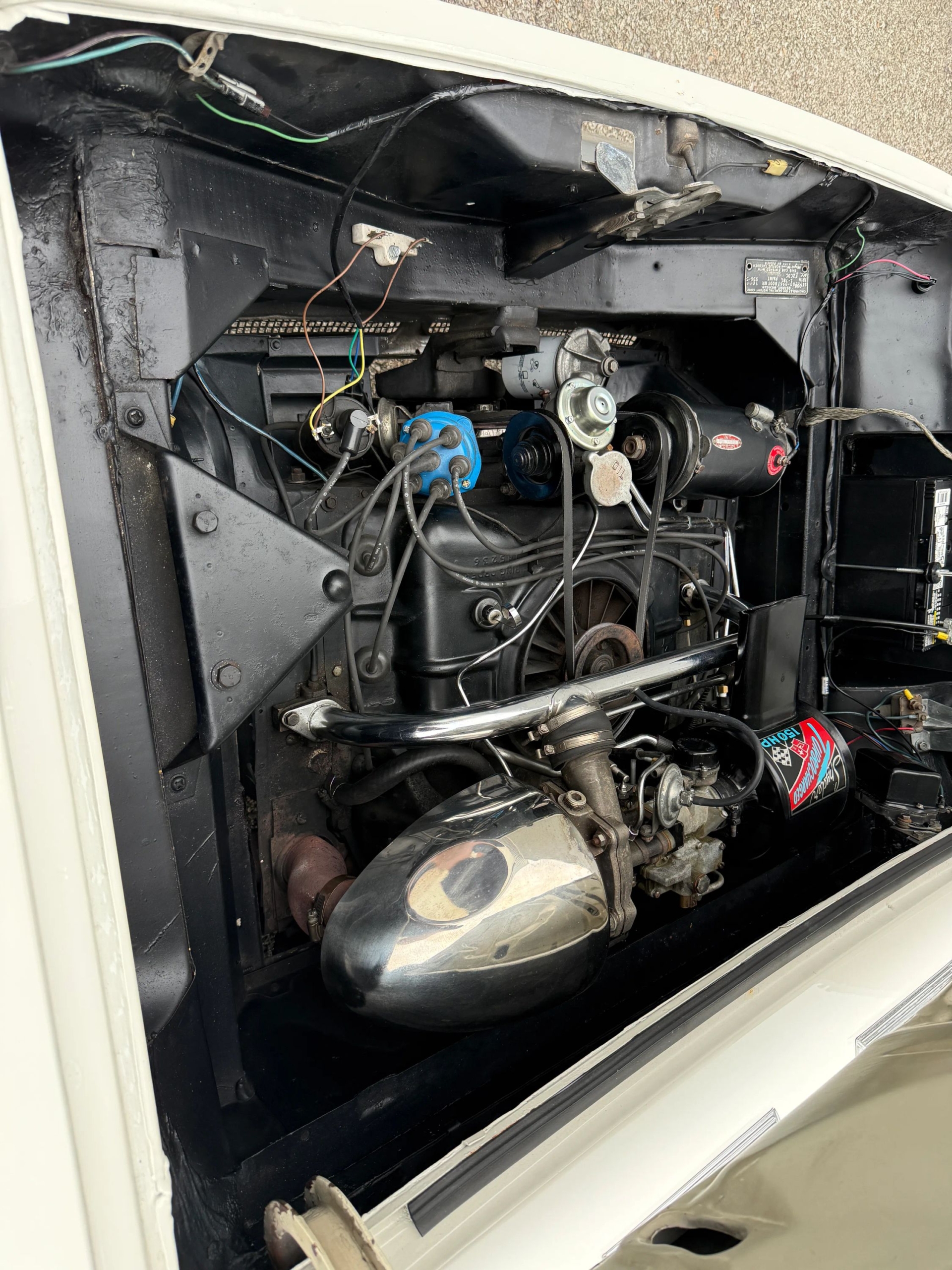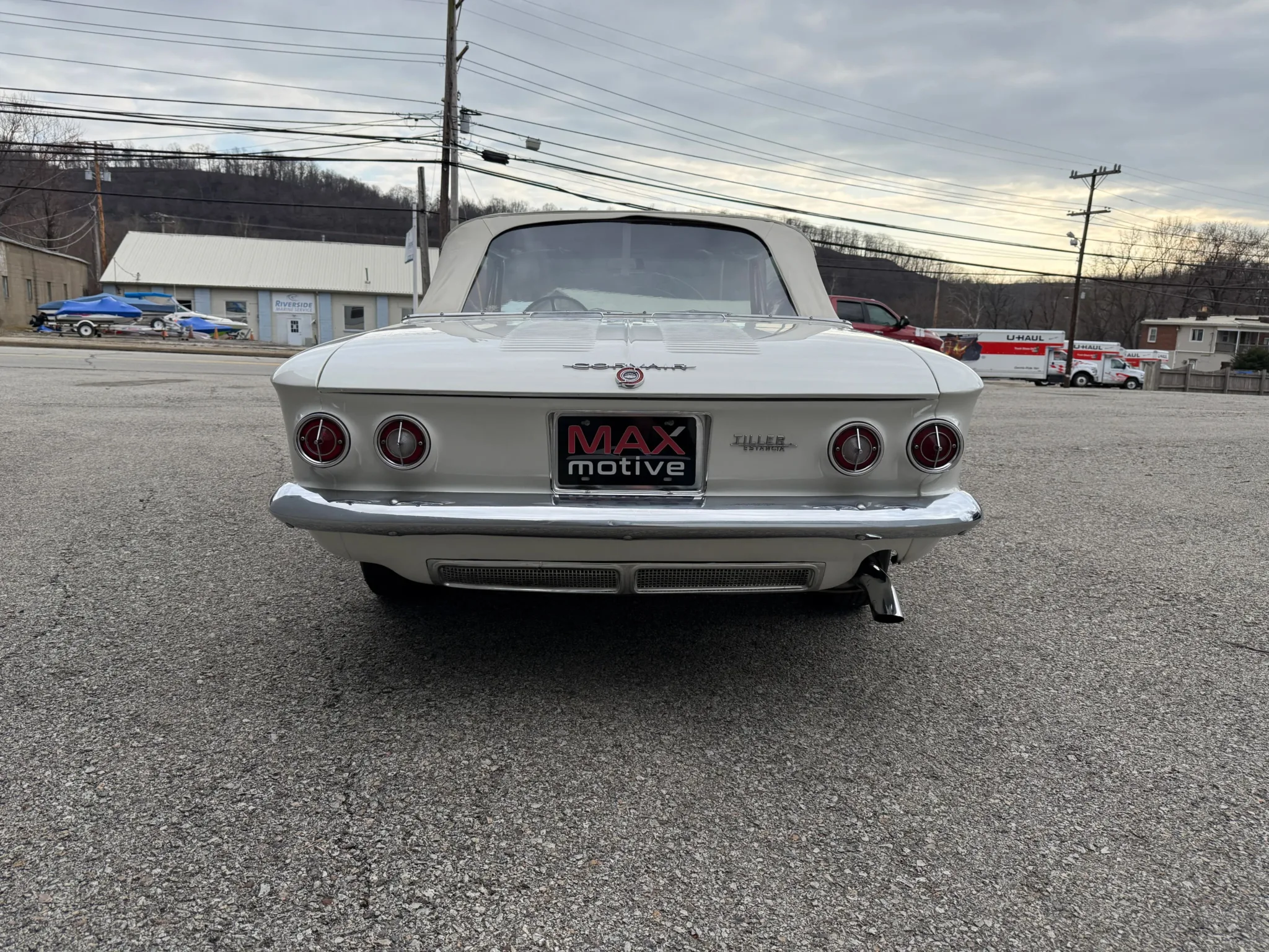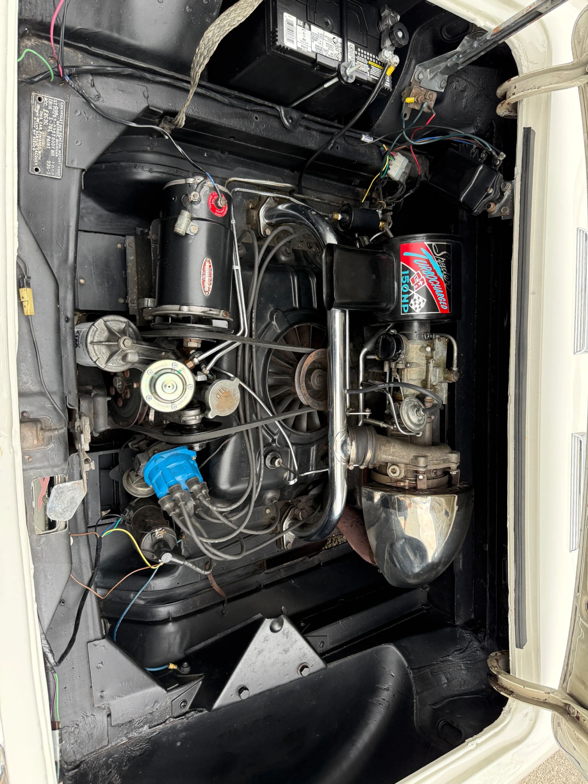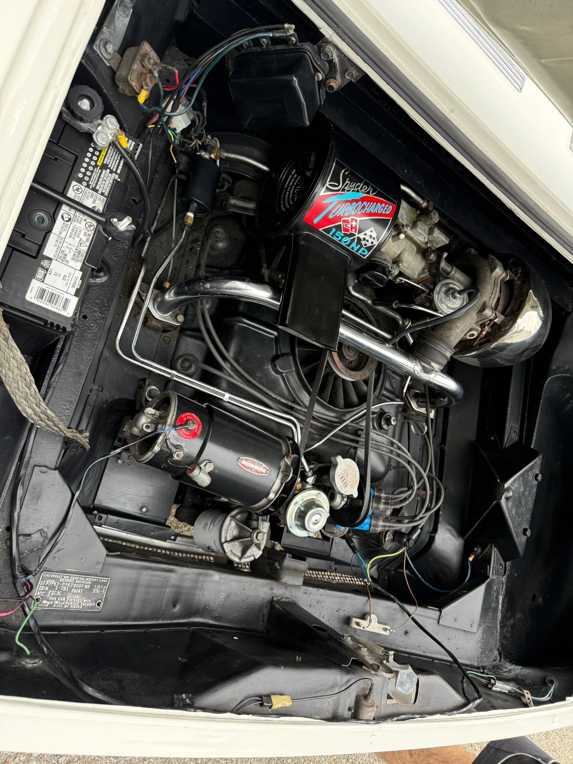 This 1963 Chevrolet Corvair Monza 900 Spyder is a classic rear-engine American convertible finished in a white exterior with a red vinyl interior. This specific model features the 2.4L Turbocharged engine paired with a 4-speed manual transmission, offering a unique, sporty driving experience. The car sits on 13 wire wheels with iconic Chevy spinner hubs and includes rear wheel skirts for a sleek, aerodynamic look. The white soft top is in good condition, and the vehicle retains its original swing-axle rear suspension setup. To provide peace of mind for collectors, it comes with a documented history of repairs and parts replacements.