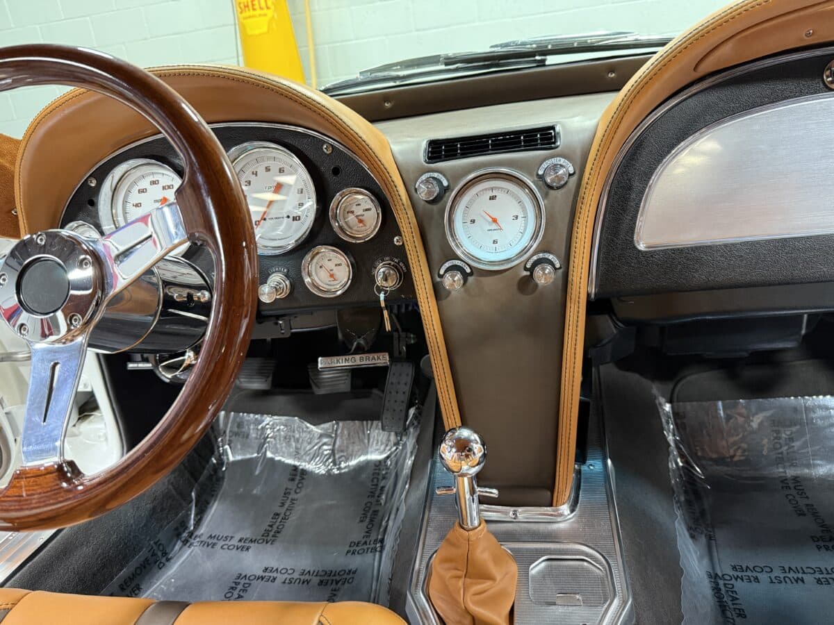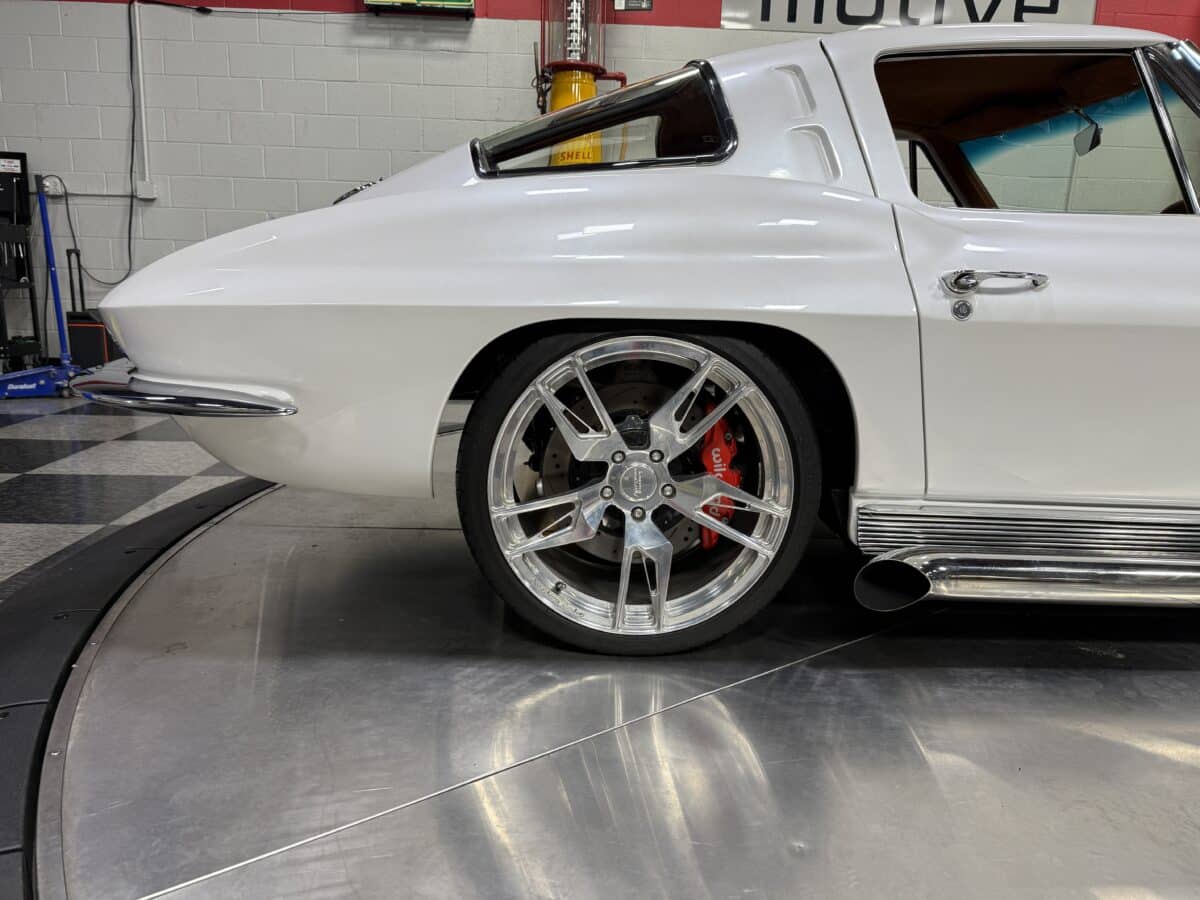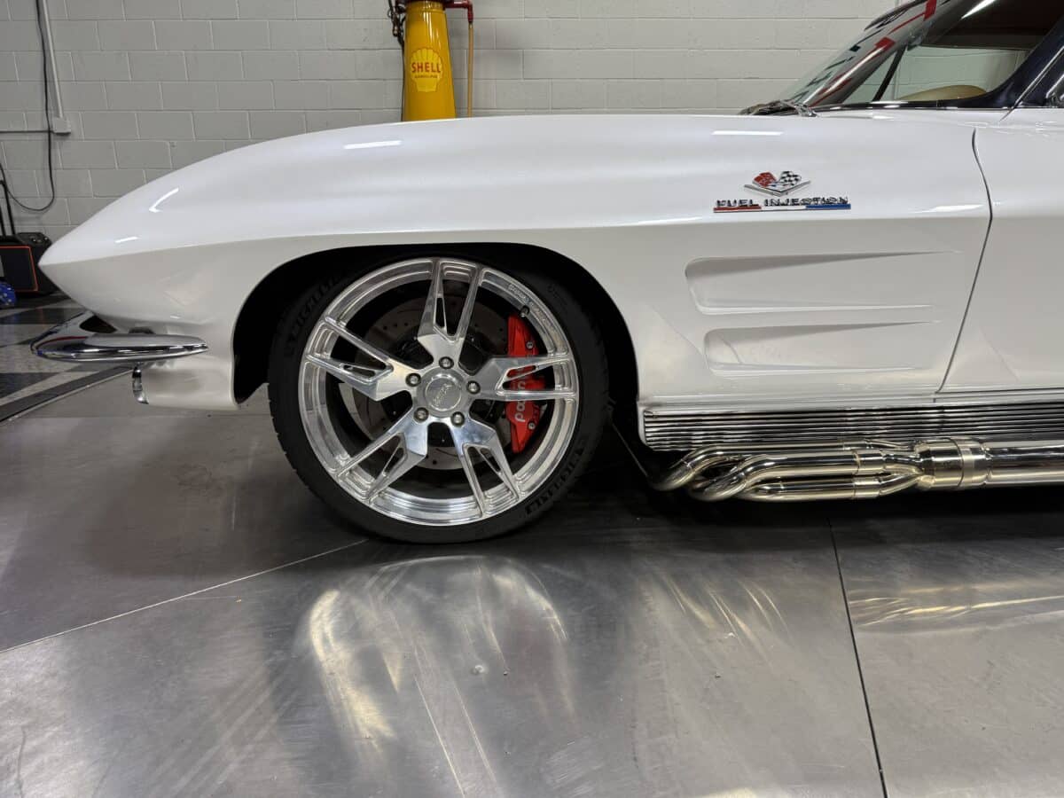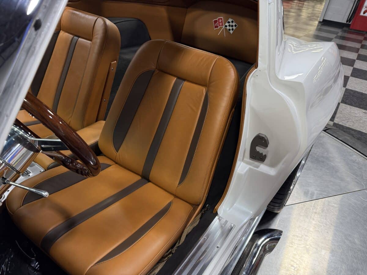 Underneath, a custom mandrel-bent chassis from Street Shop Inc., designed for C7 suspension components, provides a modern driving experience. The chassis features a semi-gloss black powder coated finish for durability and style. Handling and stopping power come courtesy of adjustable QA1 Ultra Ride coil over shocks, Hydro-Boost power rack-and-pinion steering, and Wilwood 4-wheel disc brakes with slotted and drilled rotors, red Wilwood calipers, and a tandem master cylinder. The Tri-coat Metallic White exterior with Gunmetal Grey Metallic stripes perfectly complements the custom Saddle leather interior with Chocolate trim, Vintage Air climate control, Classic Instruments Velocity Series gauges, and striking American Racing chrome wheels (19-inch front, 20-inch rear) wrapped in Michelin Pilot Sport 4S tires. This Corvette embodies the perfect marriage of timeless design and modern engineering.