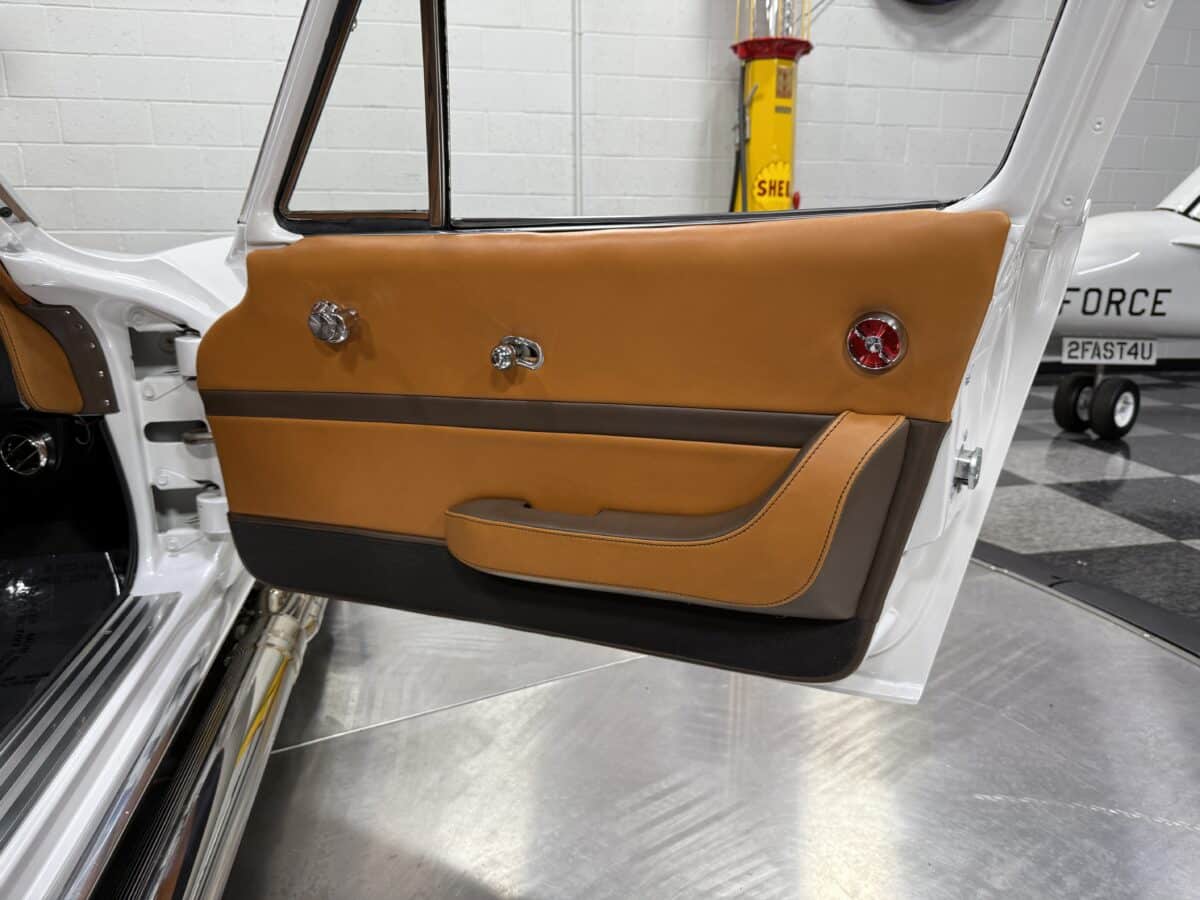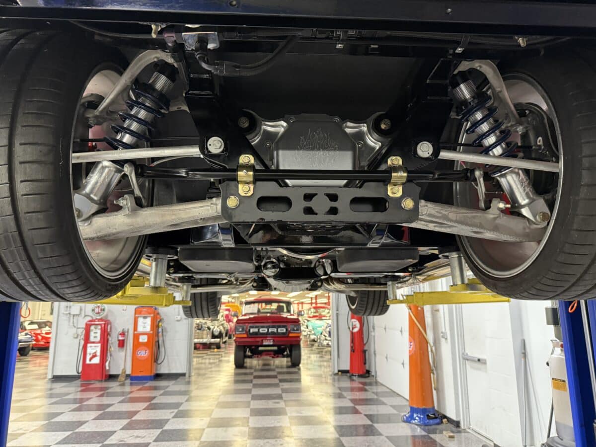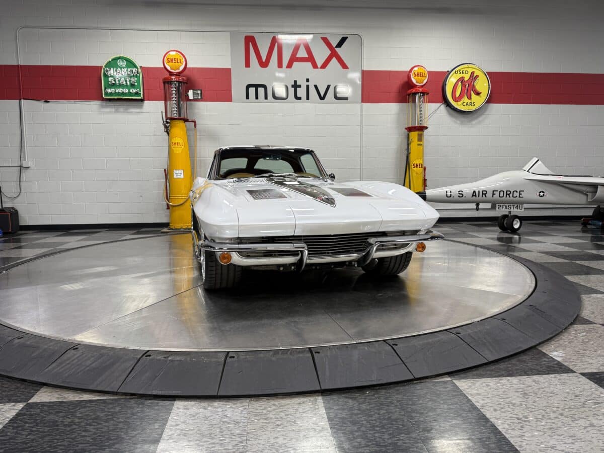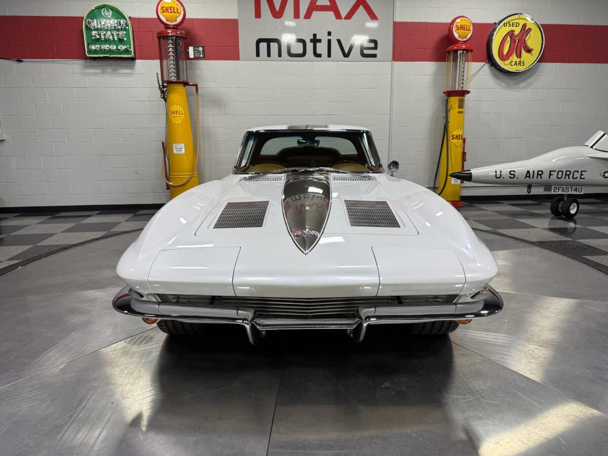 Underneath, a custom mandrel-bent chassis from Street Shop Inc., designed for C7 suspension components, provides a modern driving experience. The chassis features a semi-gloss black powder coated finish for durability and style. Handling and stopping power come courtesy of adjustable QA1 Ultra Ride coil over shocks, Hydro-Boost power rack-and-pinion steering, and Wilwood 4-wheel disc brakes with slotted and drilled rotors, red Wilwood calipers, and a tandem master cylinder. The Tri-coat Metallic White exterior with Gunmetal Grey Metallic stripes perfectly complements the custom Saddle leather interior with Chocolate trim, Vintage Air climate control, Classic Instruments Velocity Series gauges, and striking American Racing chrome wheels (19-inch front, 20-inch rear) wrapped in Michelin Pilot Sport 4S tires. This Corvette embodies the perfect marriage of timeless design and modern engineering.