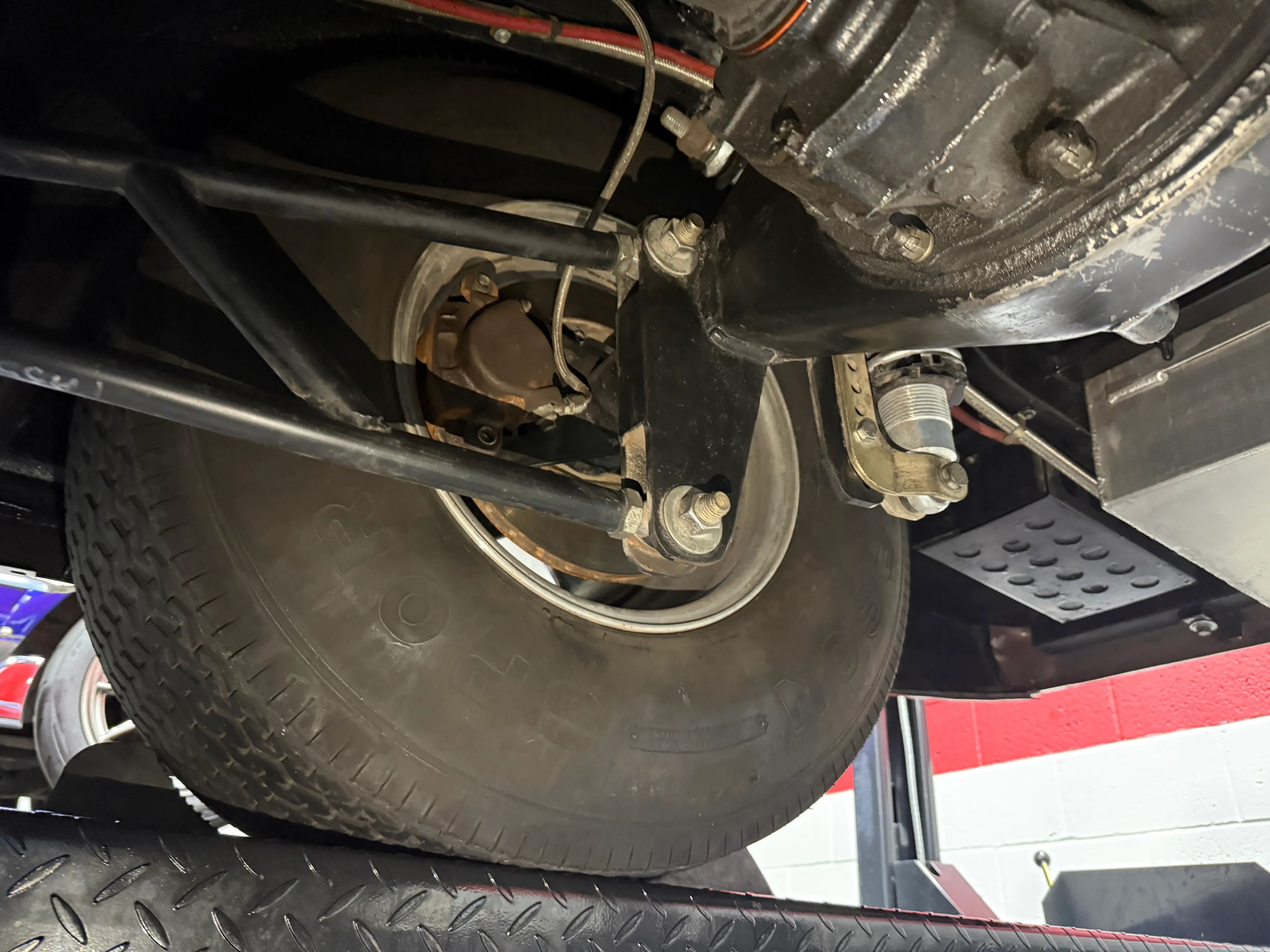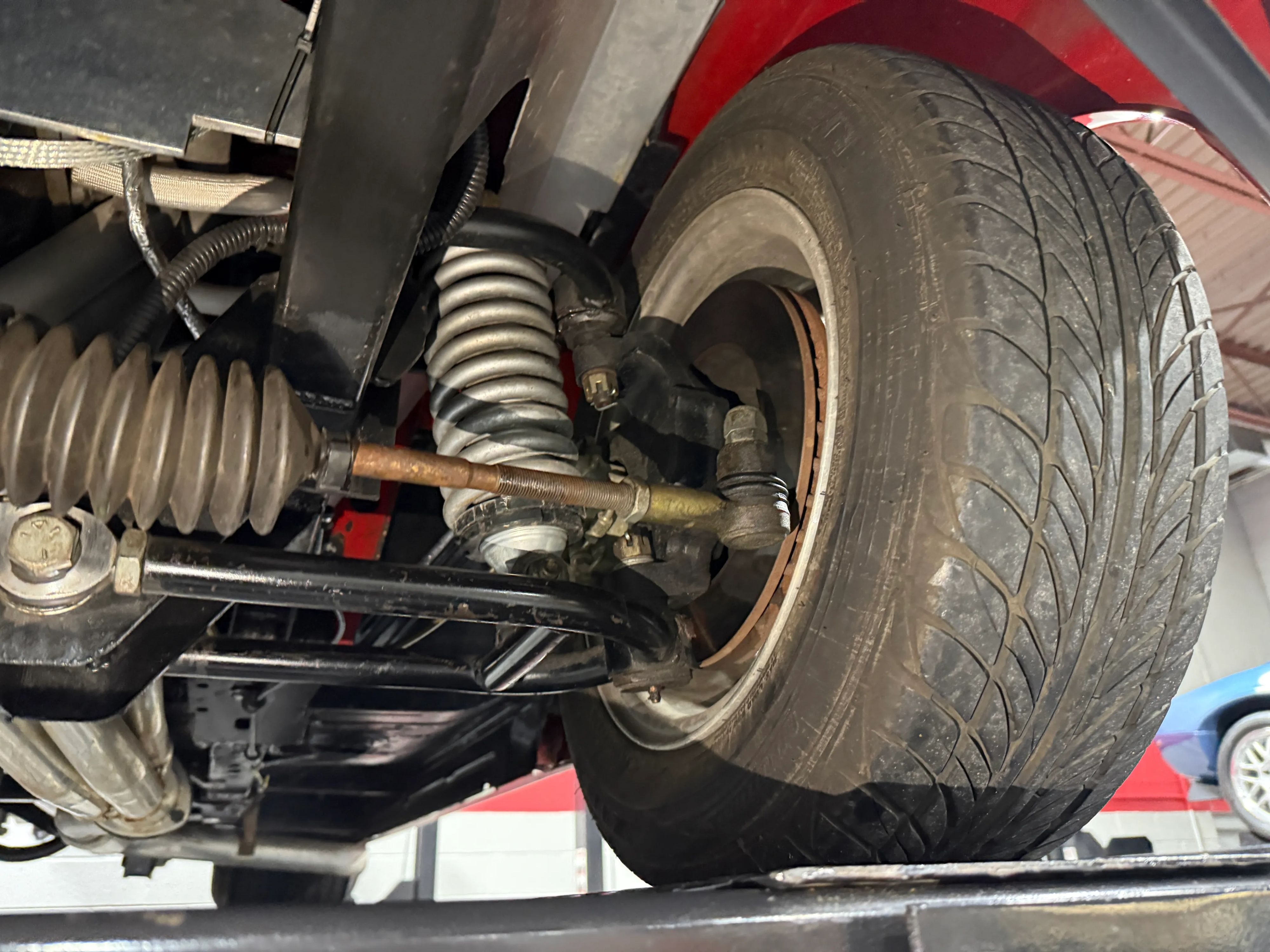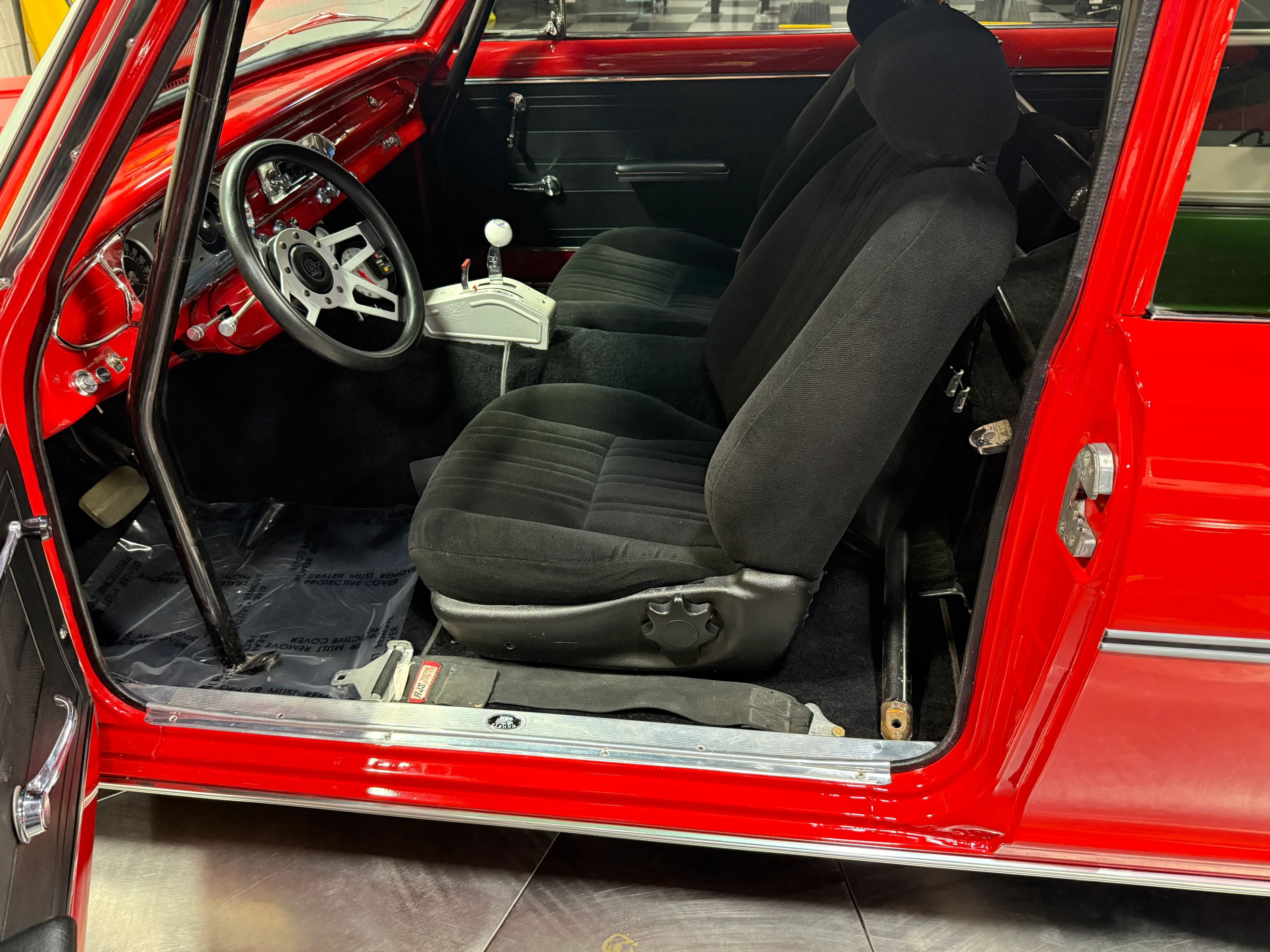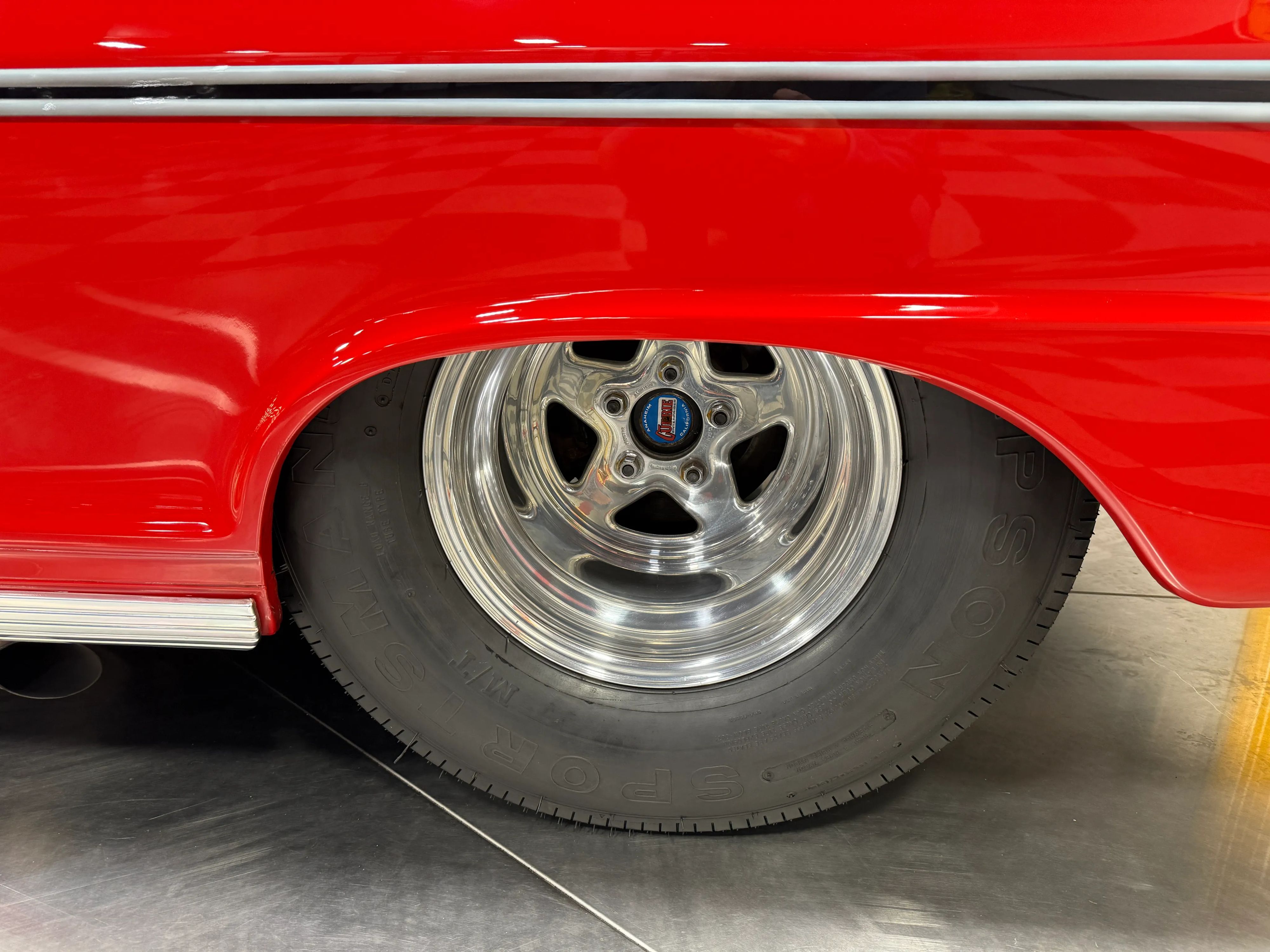 Underneath, a Mustang II front suspension with tubular control arms and coil-overs, paired with a back-half chassis, ladder-bar rear suspension, panhard bar, and rear coil-overs, provides excellent ride quality and traction. The car uses a manual steering rack and four-wheel disc brakes with vacuum assist for confident control.