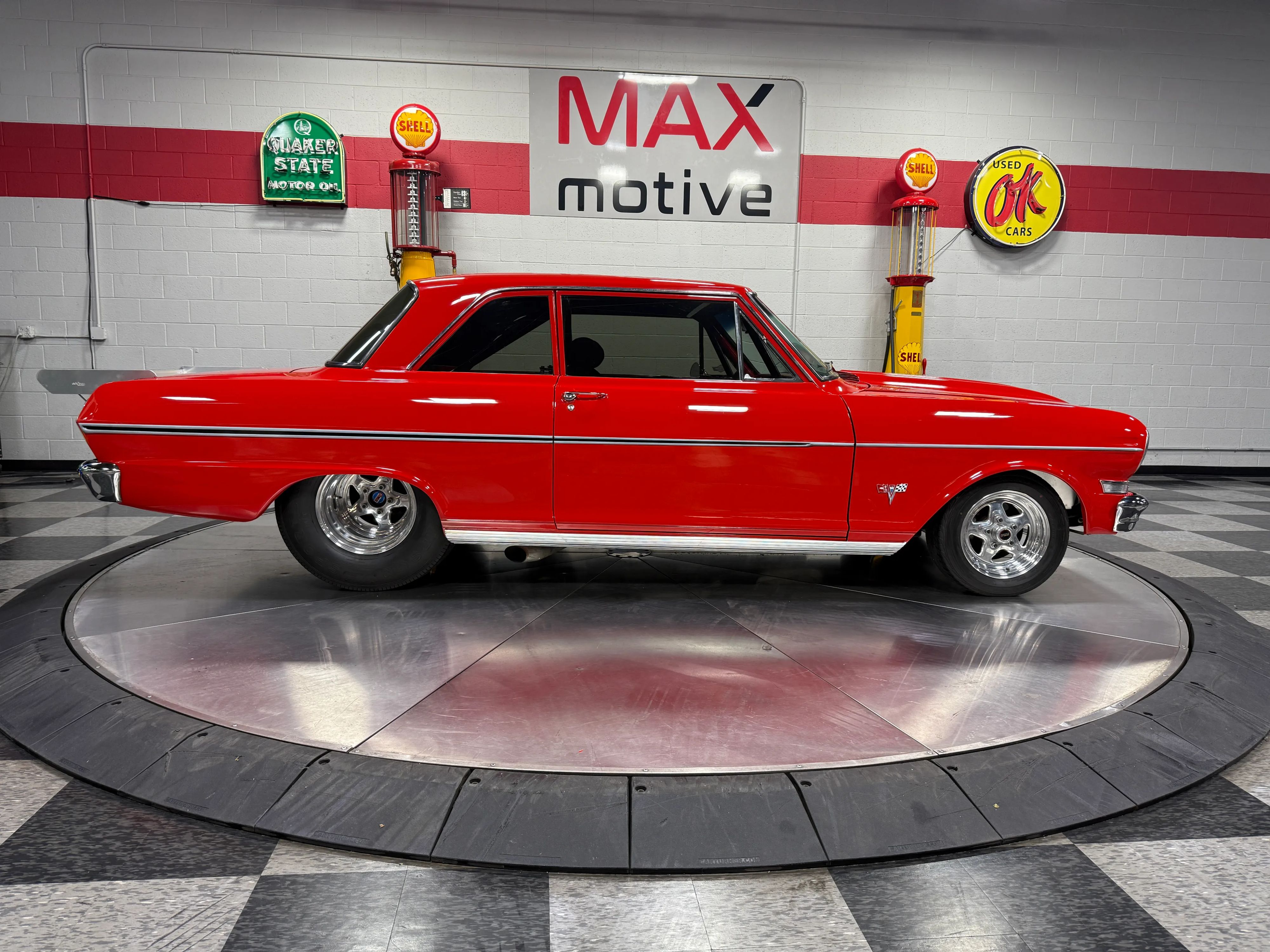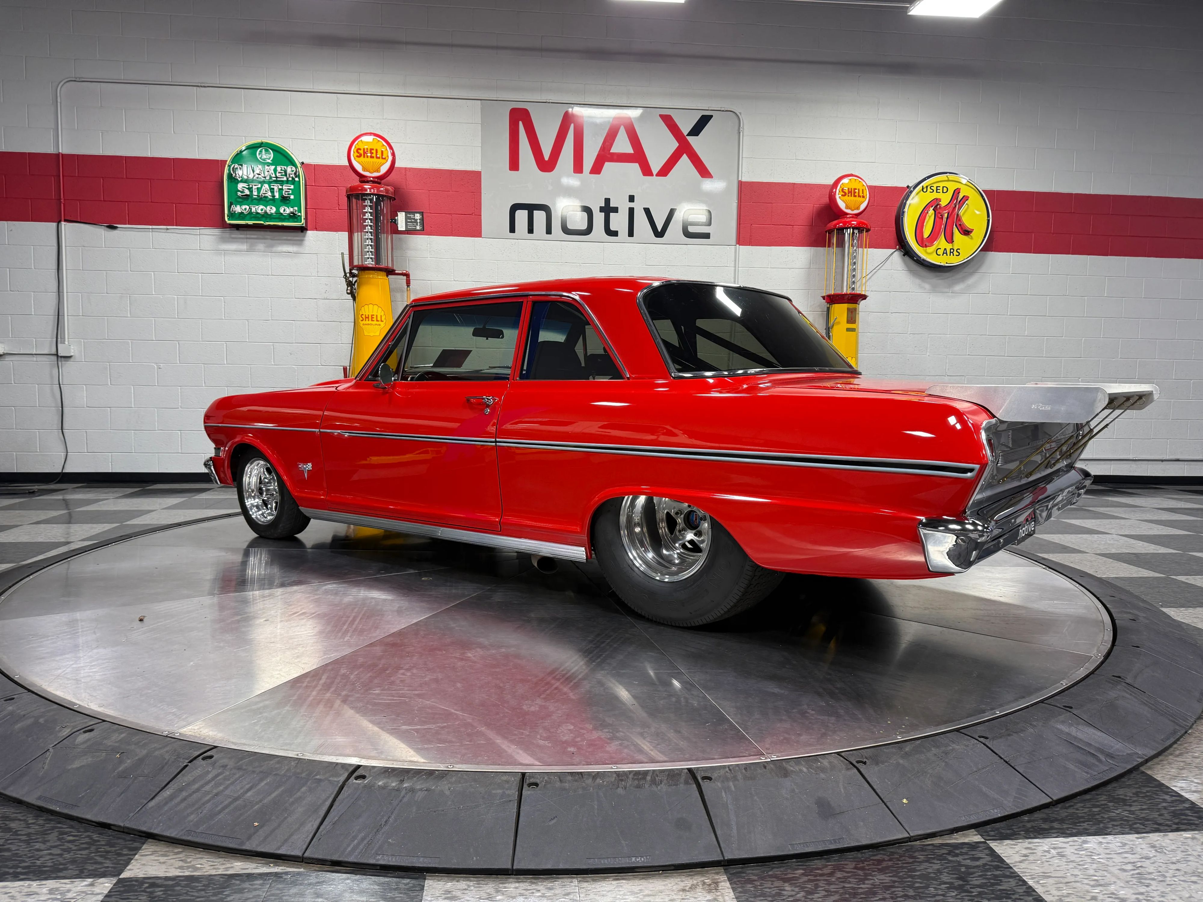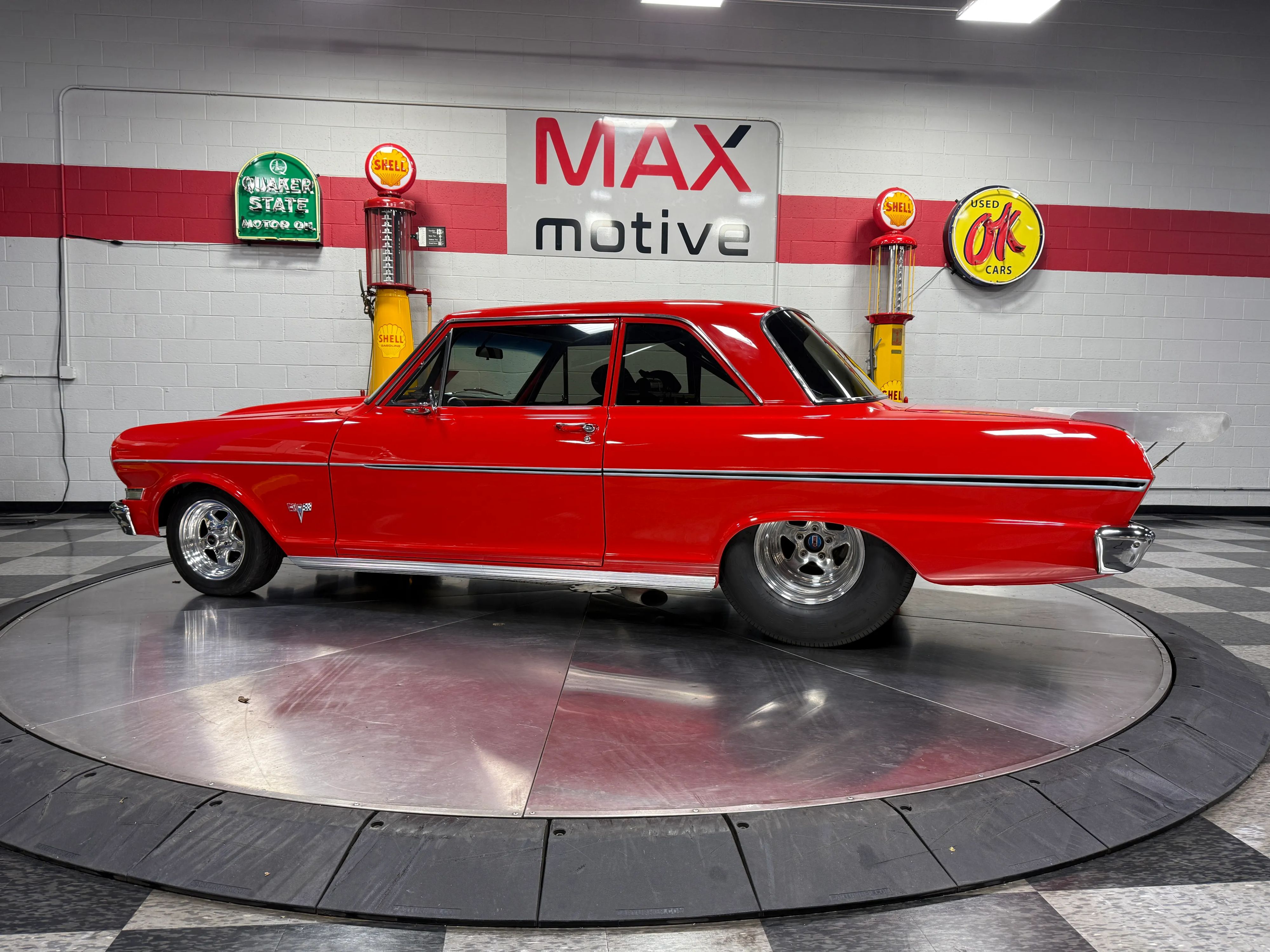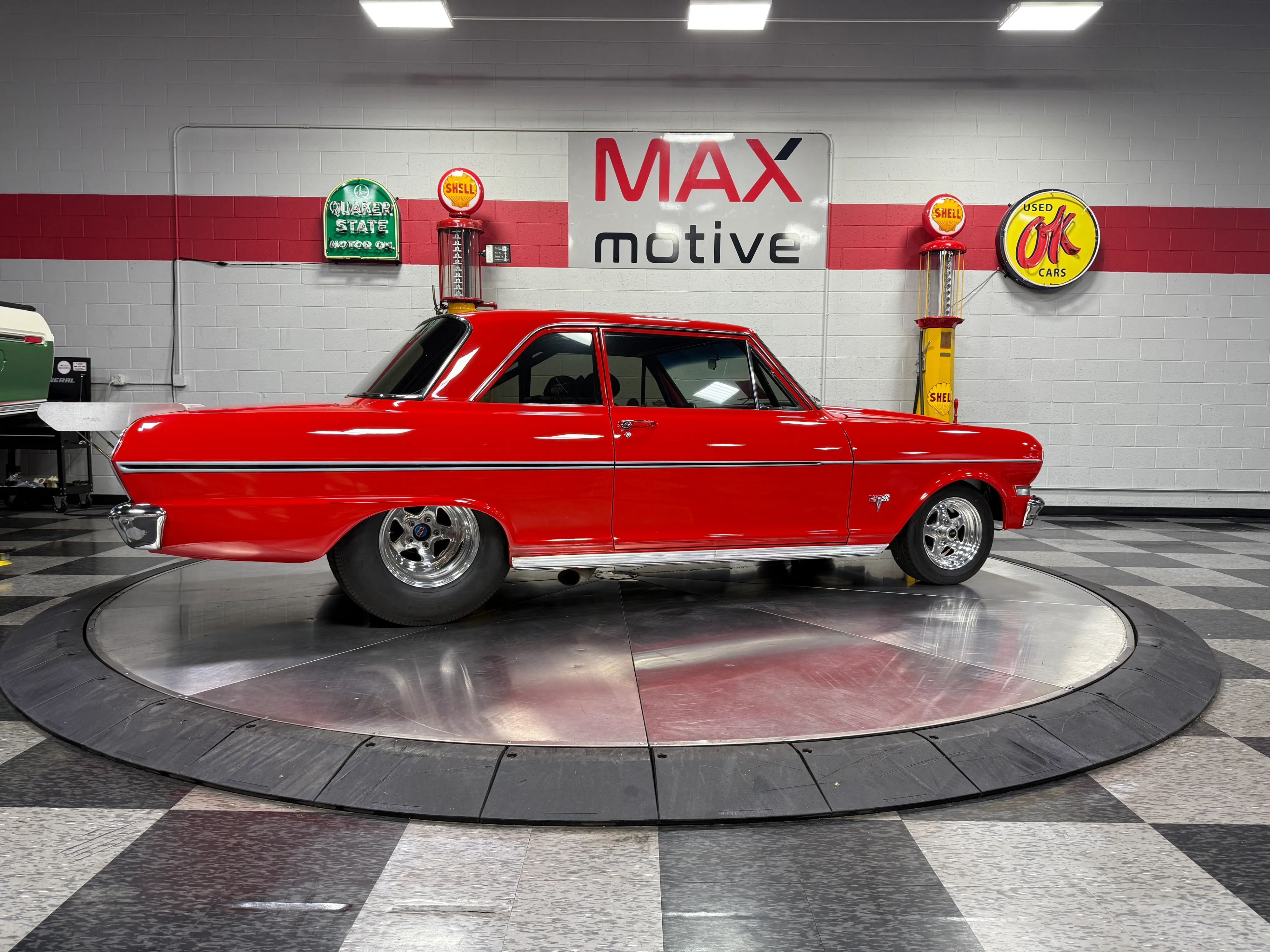 MaxMotive is proud to offer this 1964 Chevrolet Nova Pro Street. Originally a California car, this Nova retains its classic Chevy appeal while incorporating the right performance upgrades for street and show enjoyment. The exterior presents in bright red with airbrushed body side moldings and chrome bumpers and trim. The stance immediately sets the tone, thanks to a tubbed rear, narrowed Currie 9-inch rear, and Weld Racing ProStar wheels wrapped in Mickey Thompson Sportsman tires.