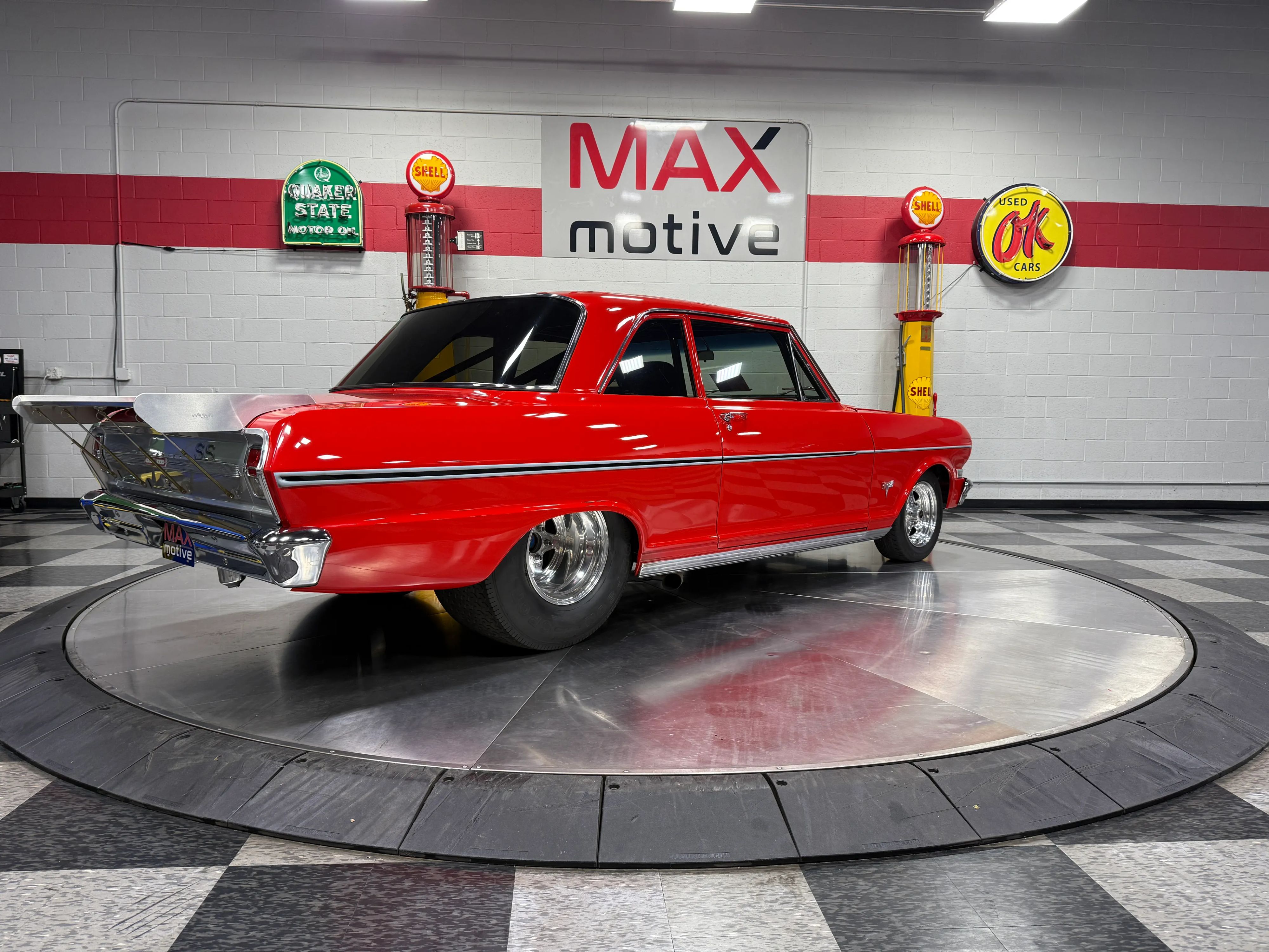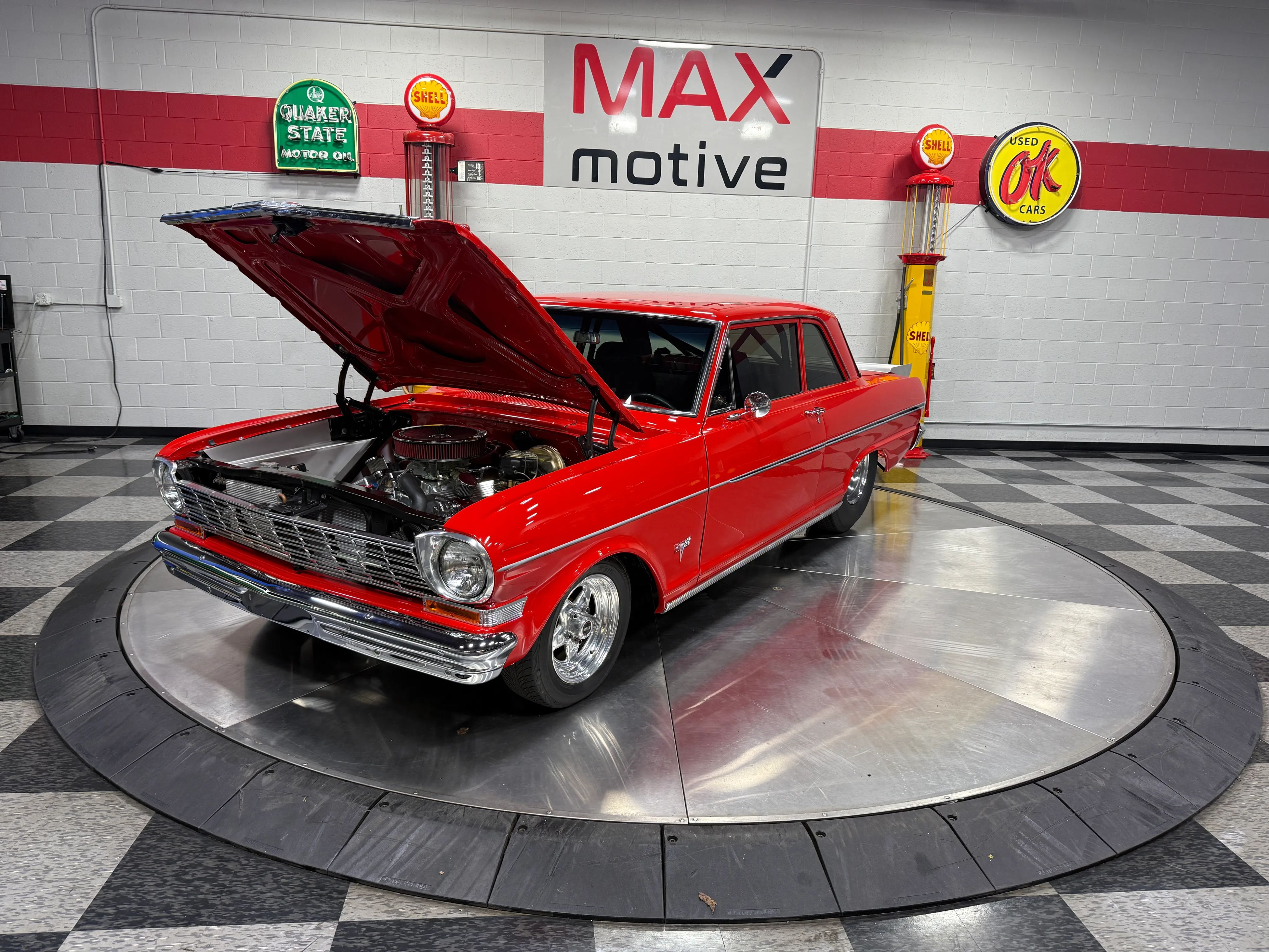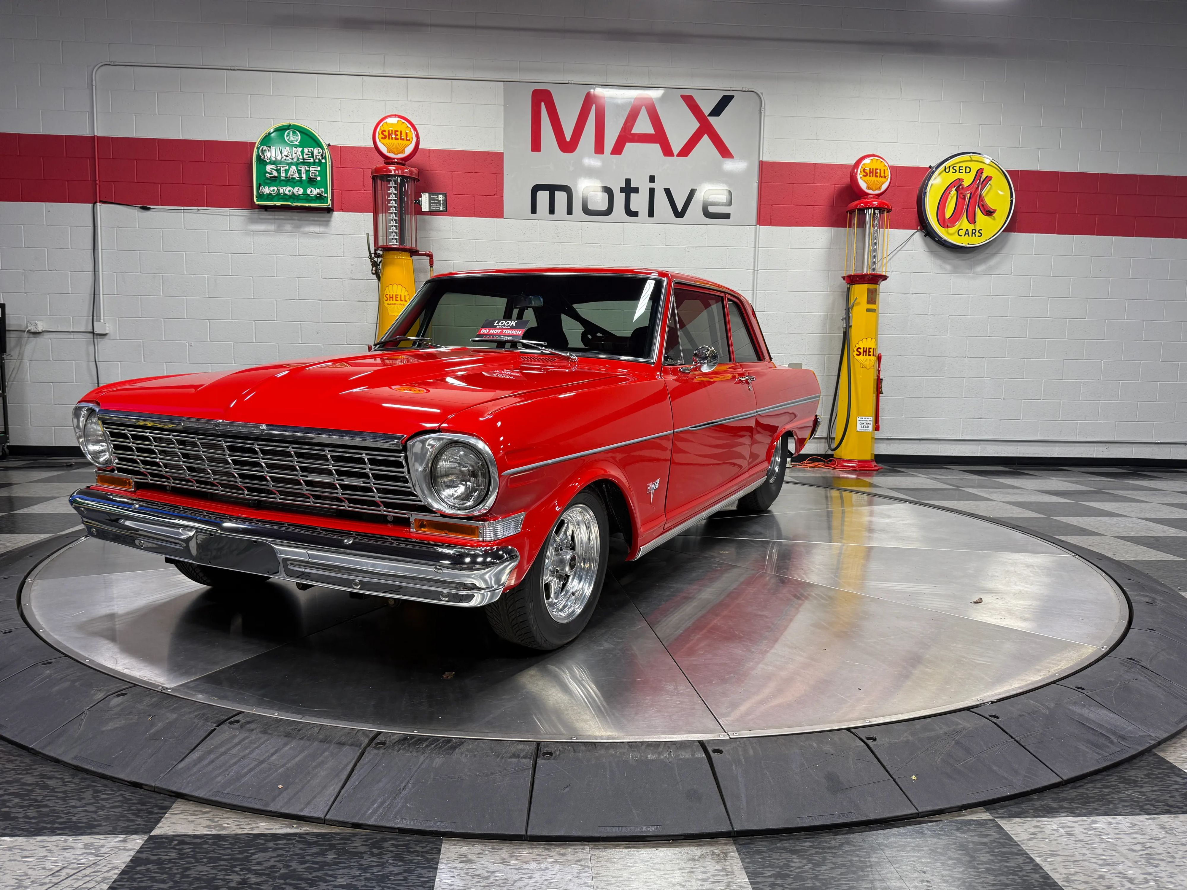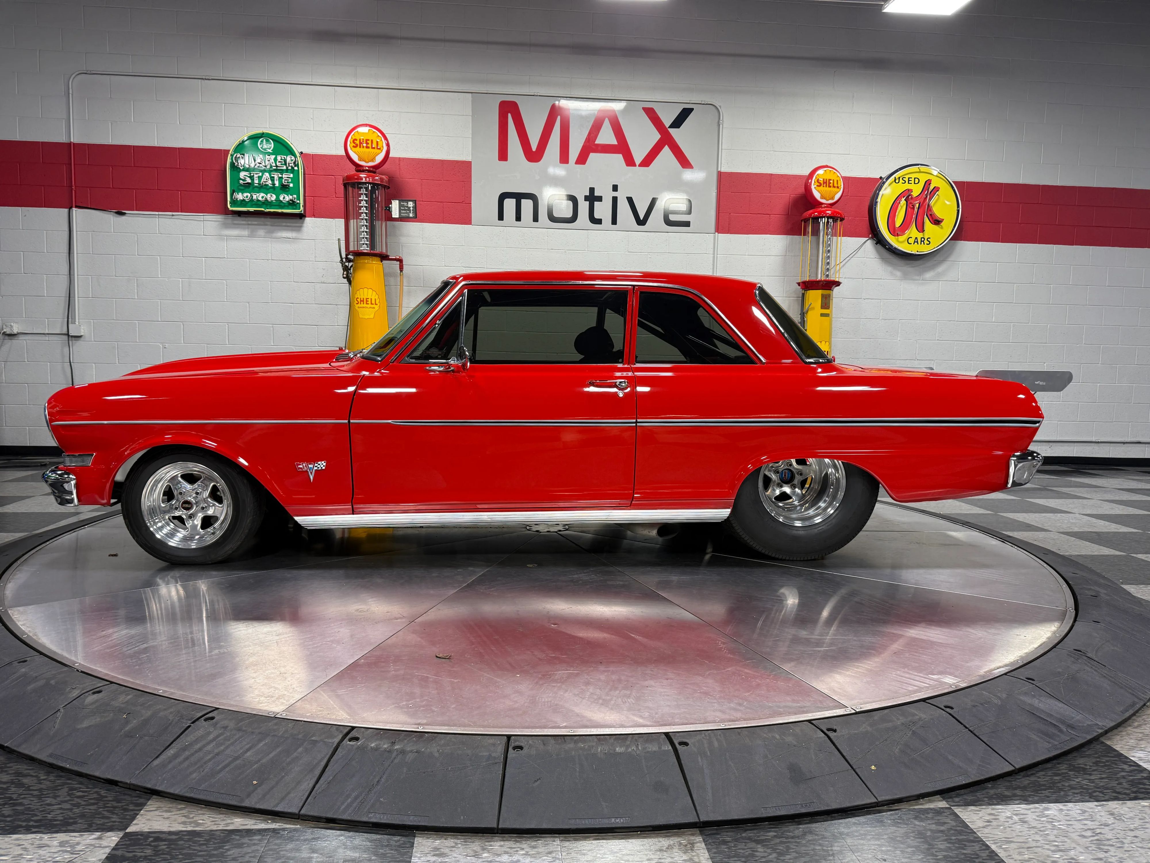 MaxMotive is proud to offer this 1964 Chevrolet Nova Pro Street. Originally a California car, this Nova retains its classic Chevy appeal while incorporating the right performance upgrades for street and show enjoyment. The exterior presents in bright red with airbrushed body side moldings and chrome bumpers and trim. The stance immediately sets the tone, thanks to a tubbed rear, narrowed Currie 9-inch rear, and Weld Racing ProStar wheels wrapped in Mickey Thompson Sportsman tires.