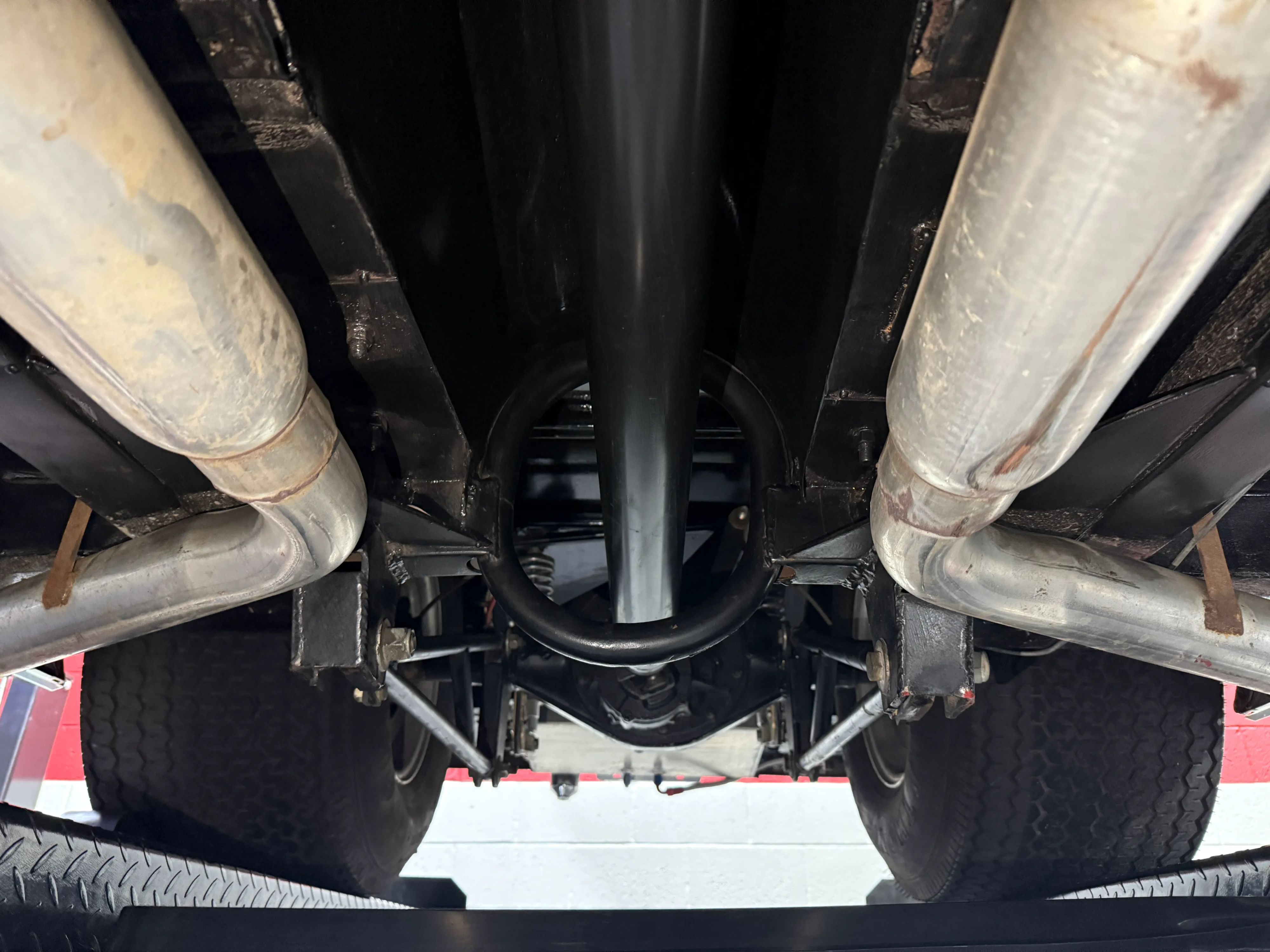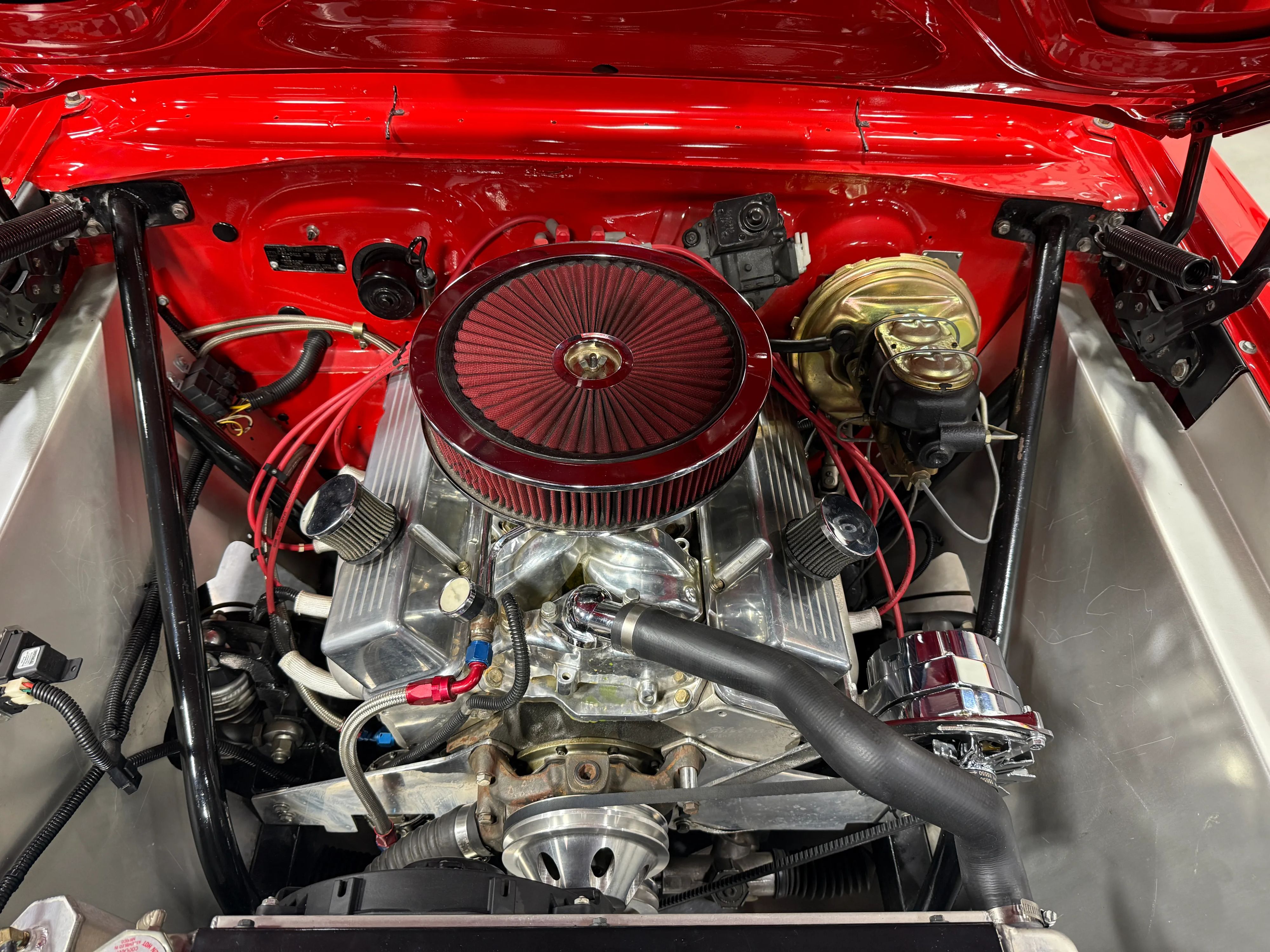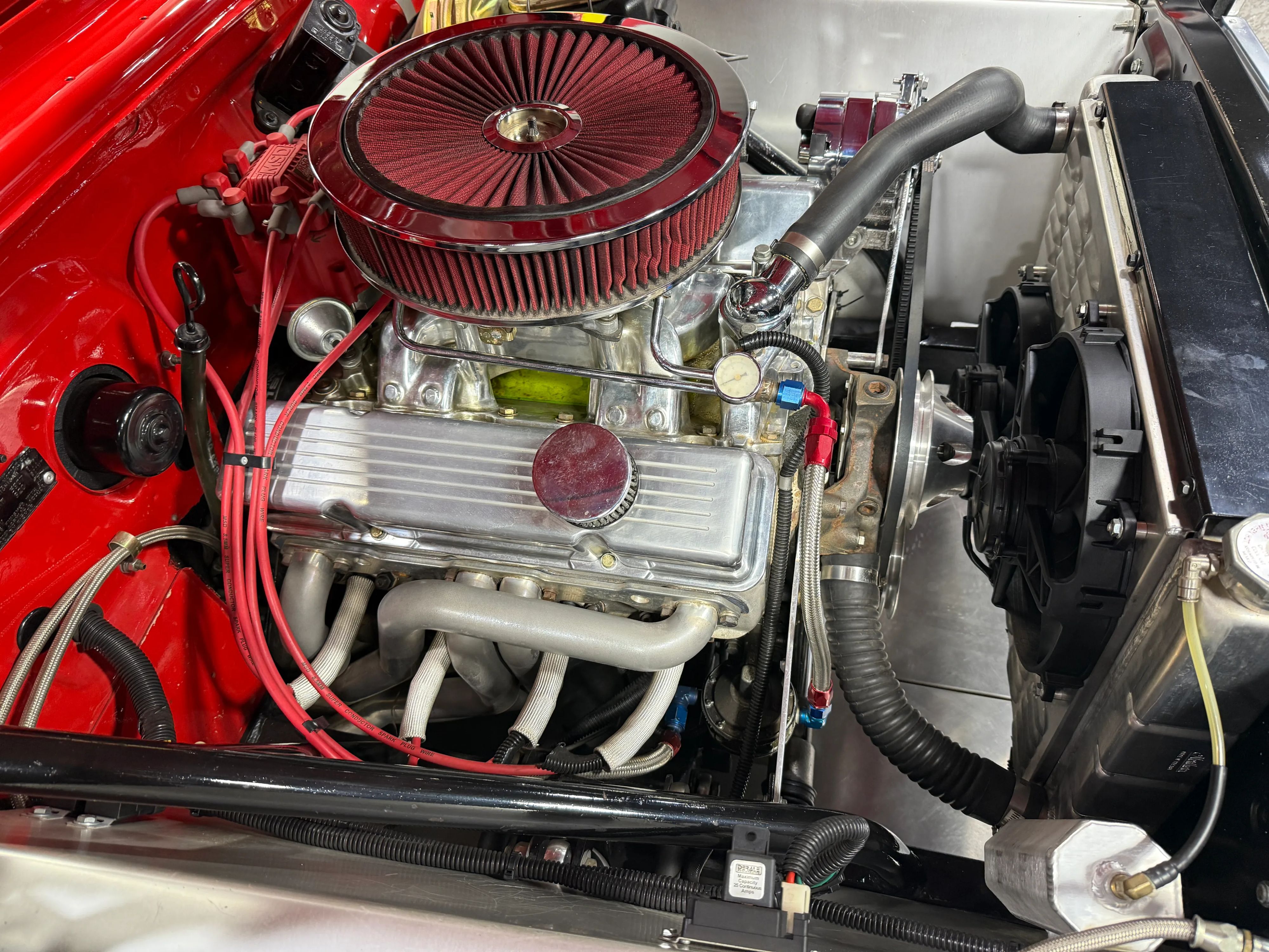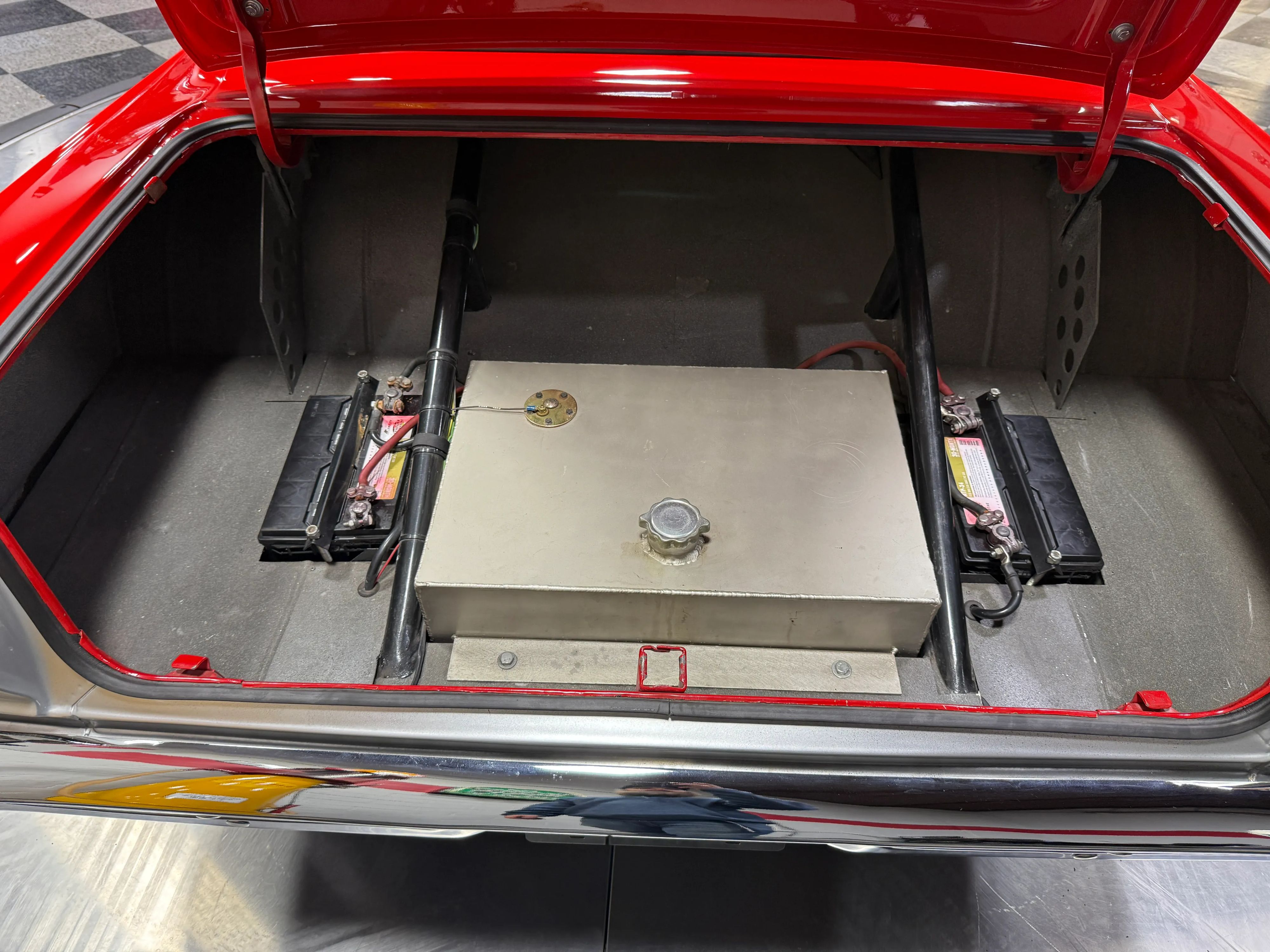 Power comes from a 400ci small-block Chevy equipped with Edelbrock Performer RPM aluminum heads, Holley carburetor, MSD ignition, and Hooker headers feeding a 3-inch dual exhaust that exits neatly ahead of the rear tires. Cooling and fuel delivery are handled by an aluminum radiator with electric fans and an aluminum fuel cell mounted through the trunk floor with a Holley electric fuel pump.