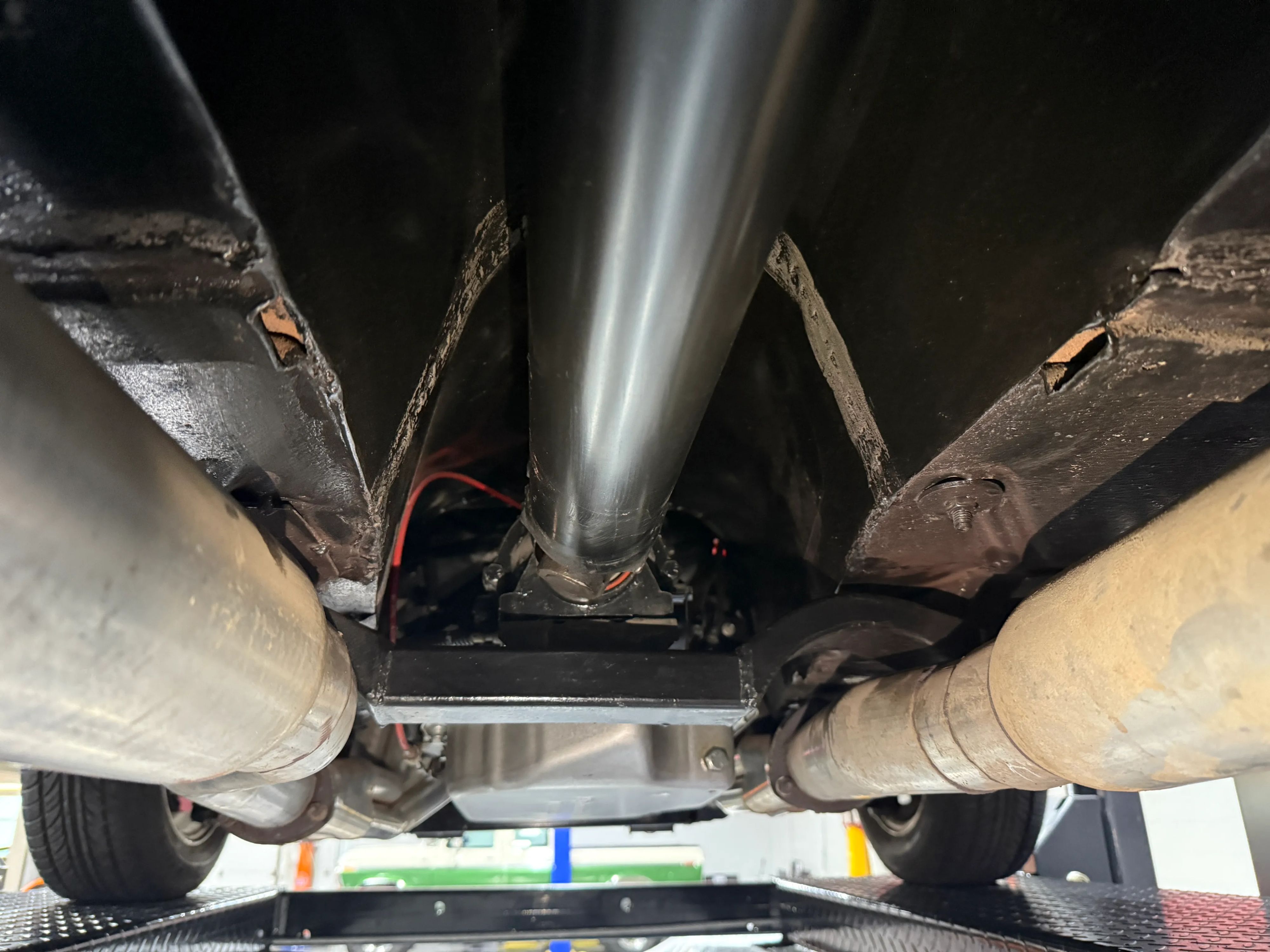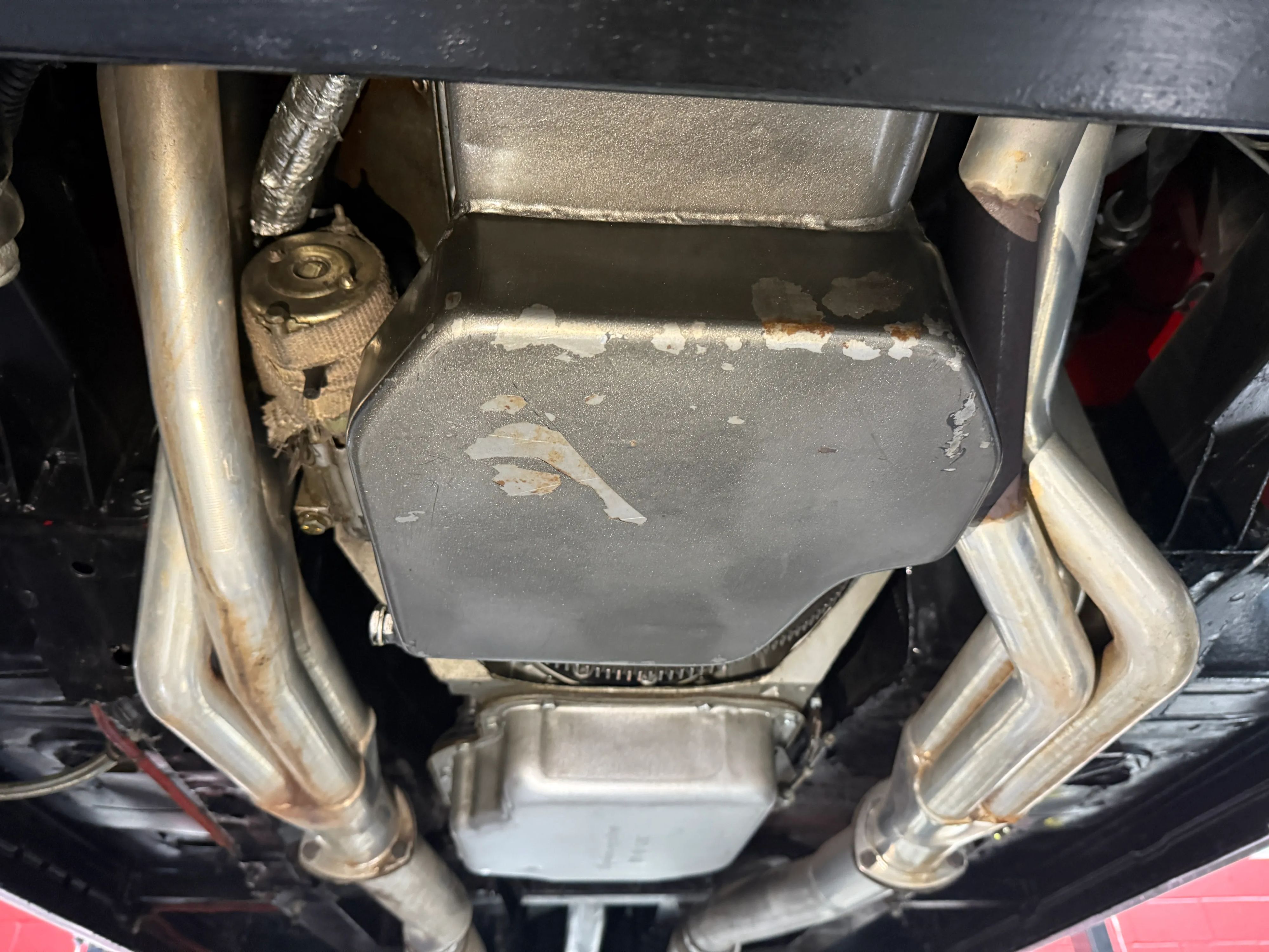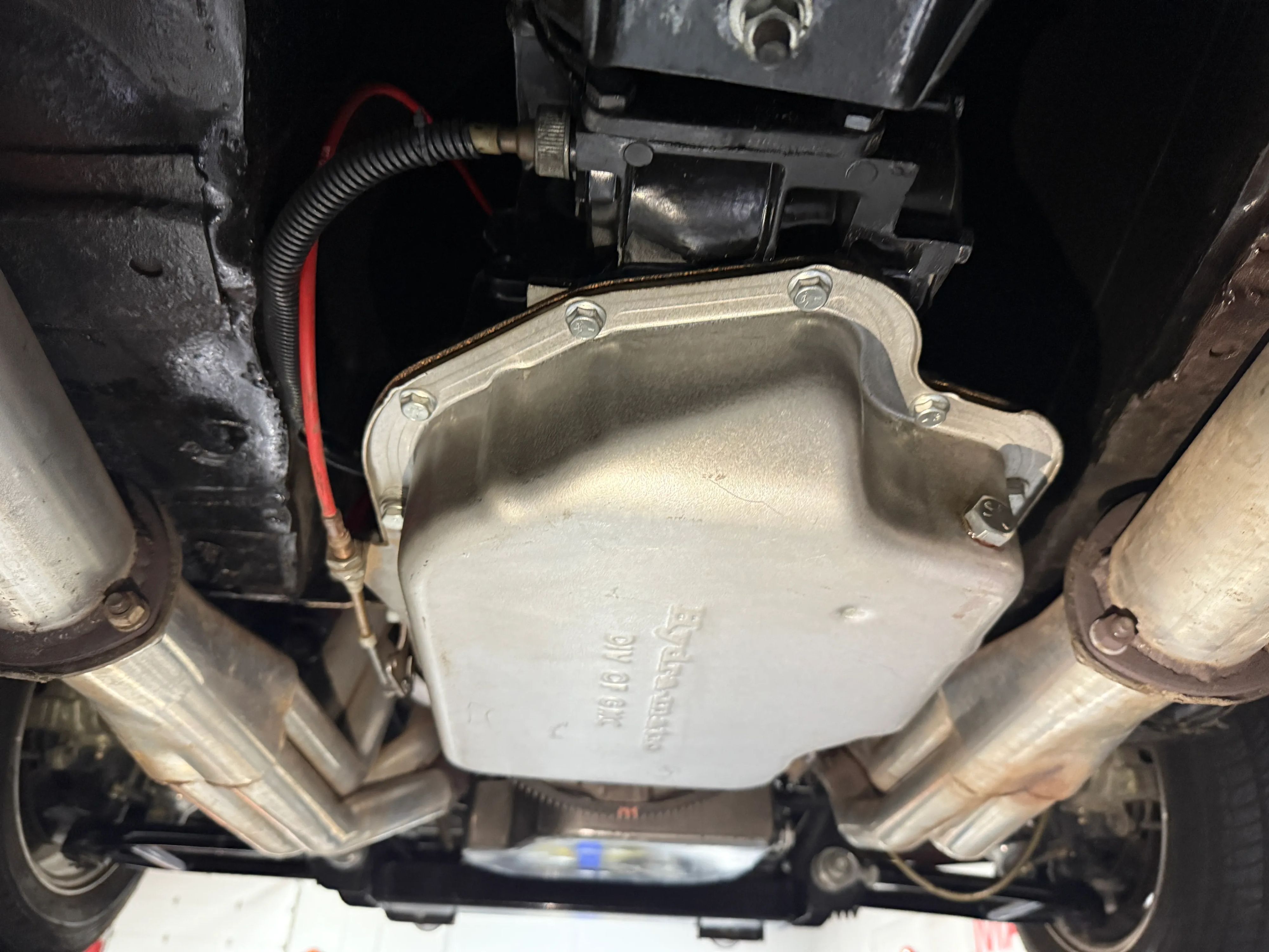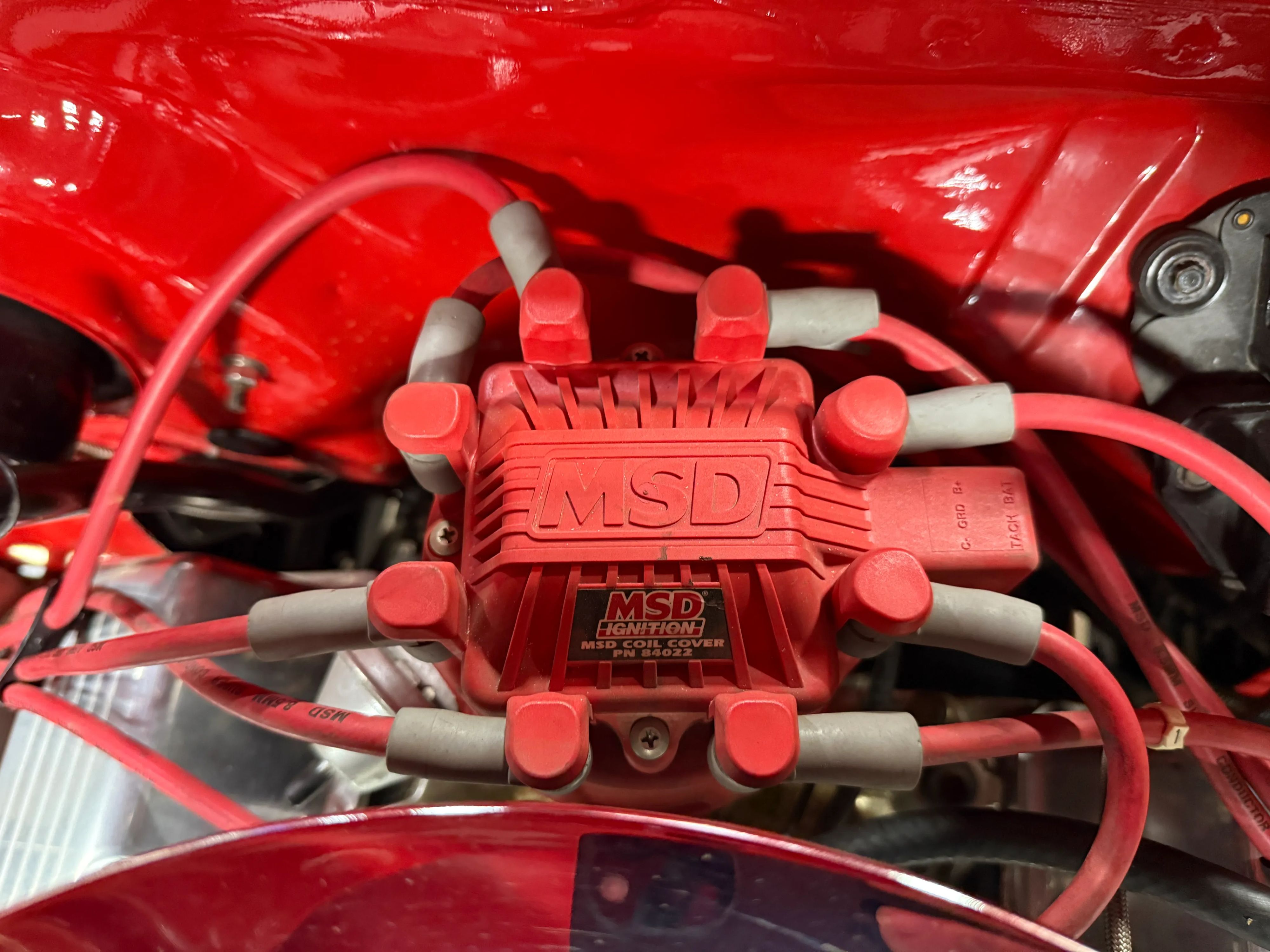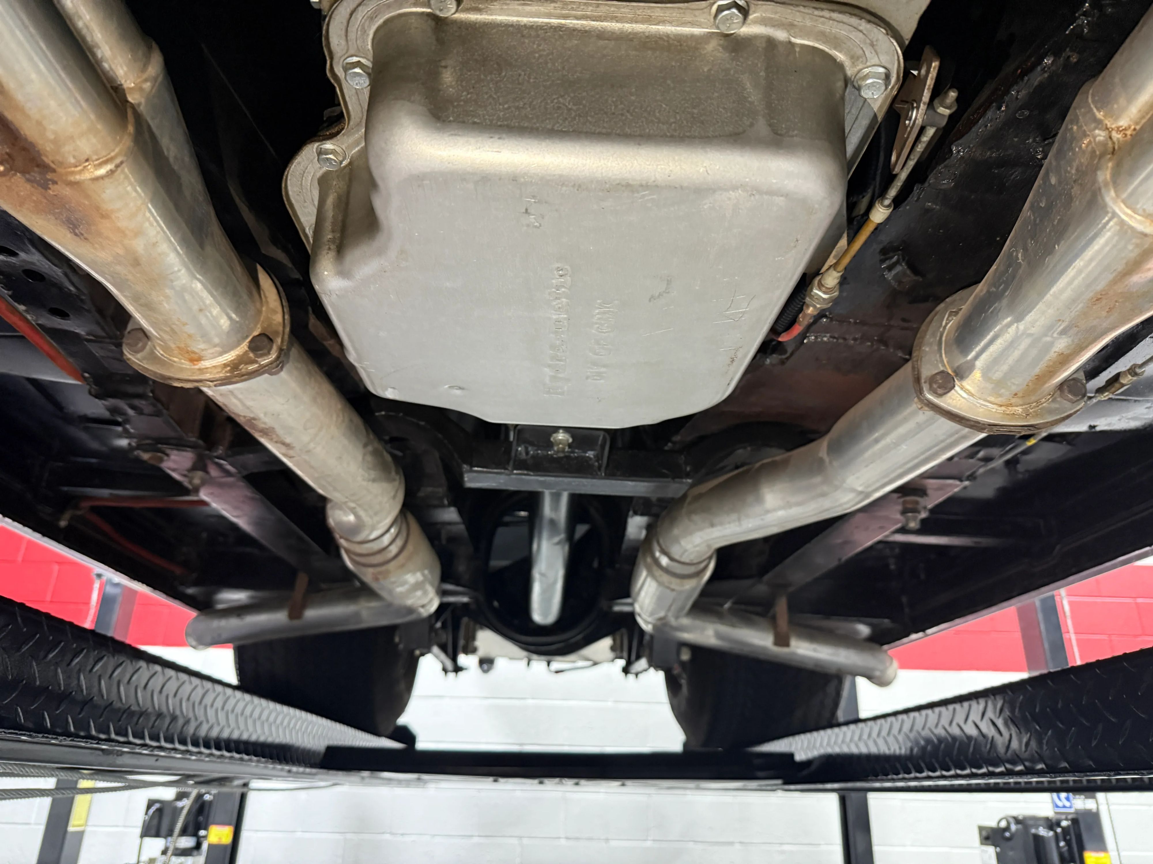 Power comes from a 400ci small-block Chevy equipped with Edelbrock Performer RPM aluminum heads, Holley carburetor, MSD ignition, and Hooker headers feeding a 3-inch dual exhaust that exits neatly ahead of the rear tires. Cooling and fuel delivery are handled by an aluminum radiator with electric fans and an aluminum fuel cell mounted through the trunk floor with a Holley electric fuel pump.