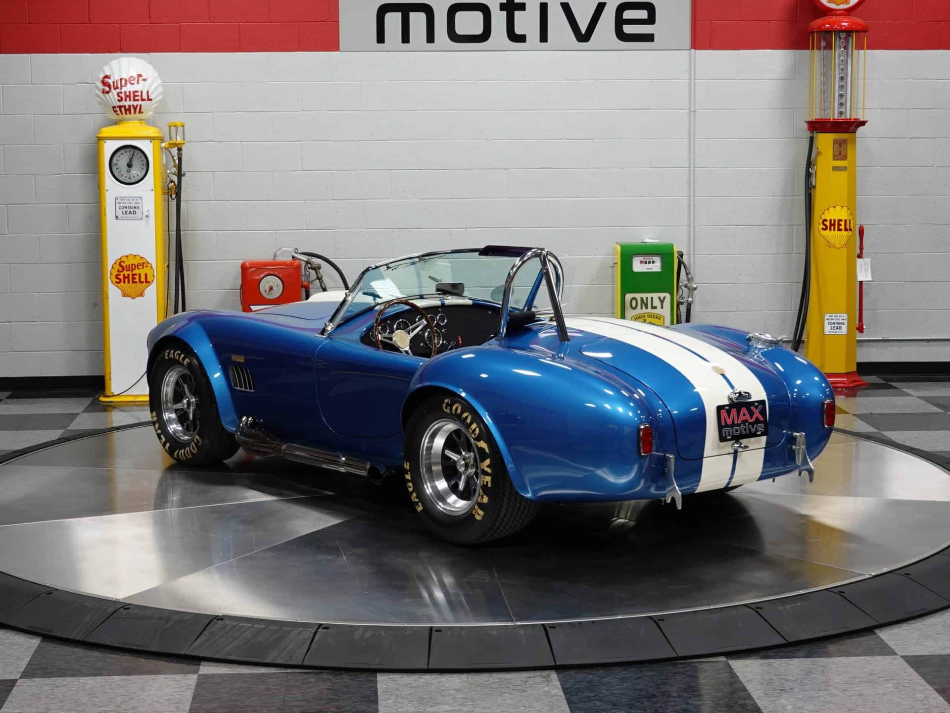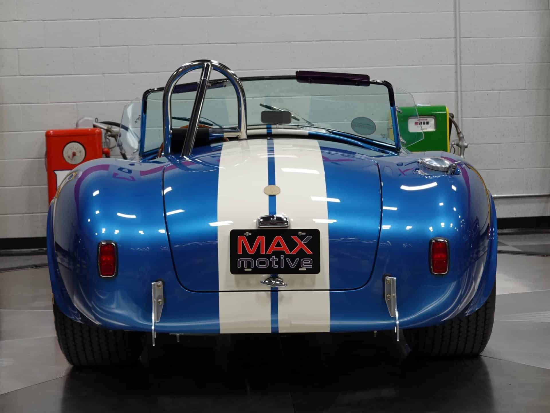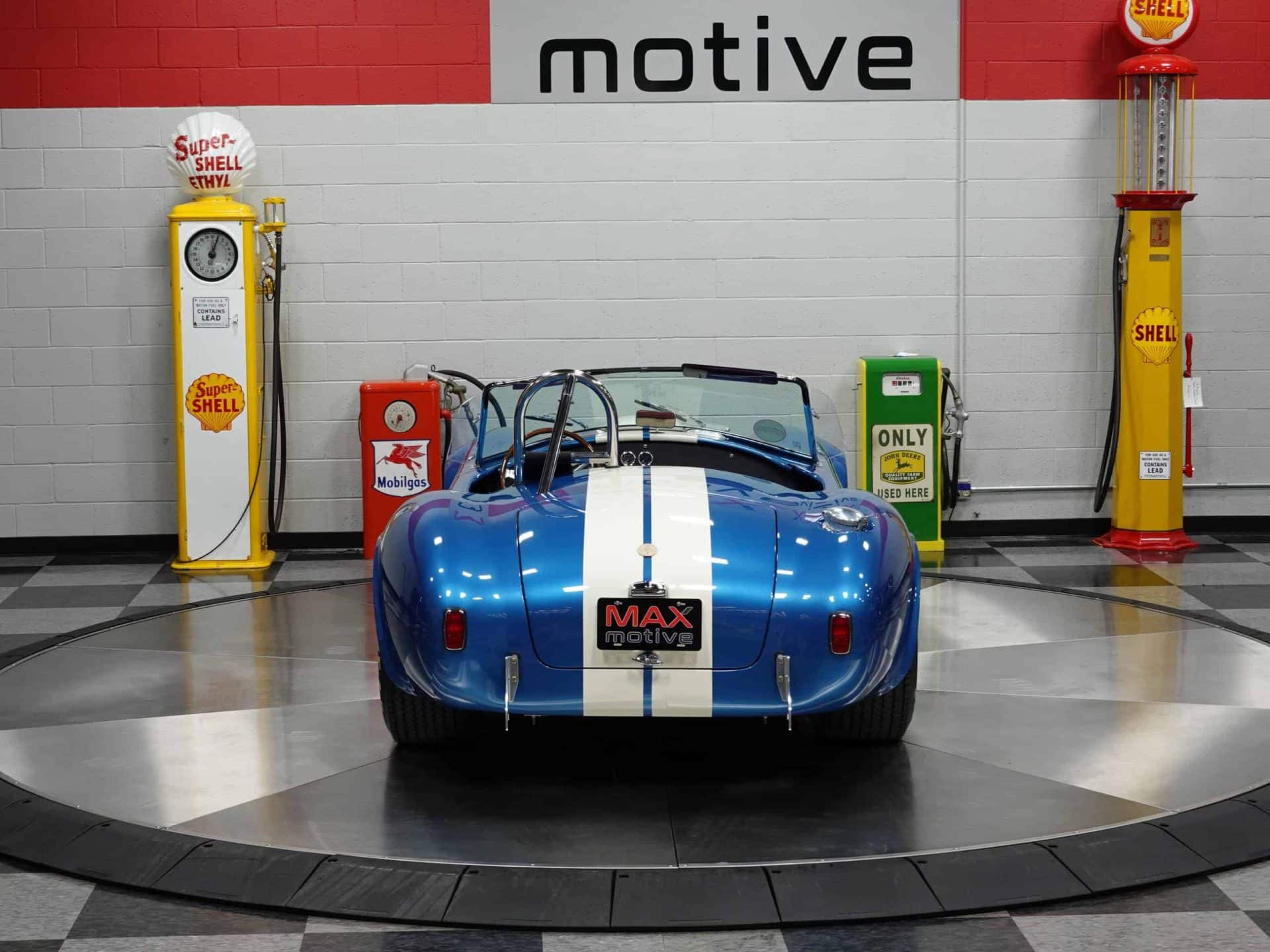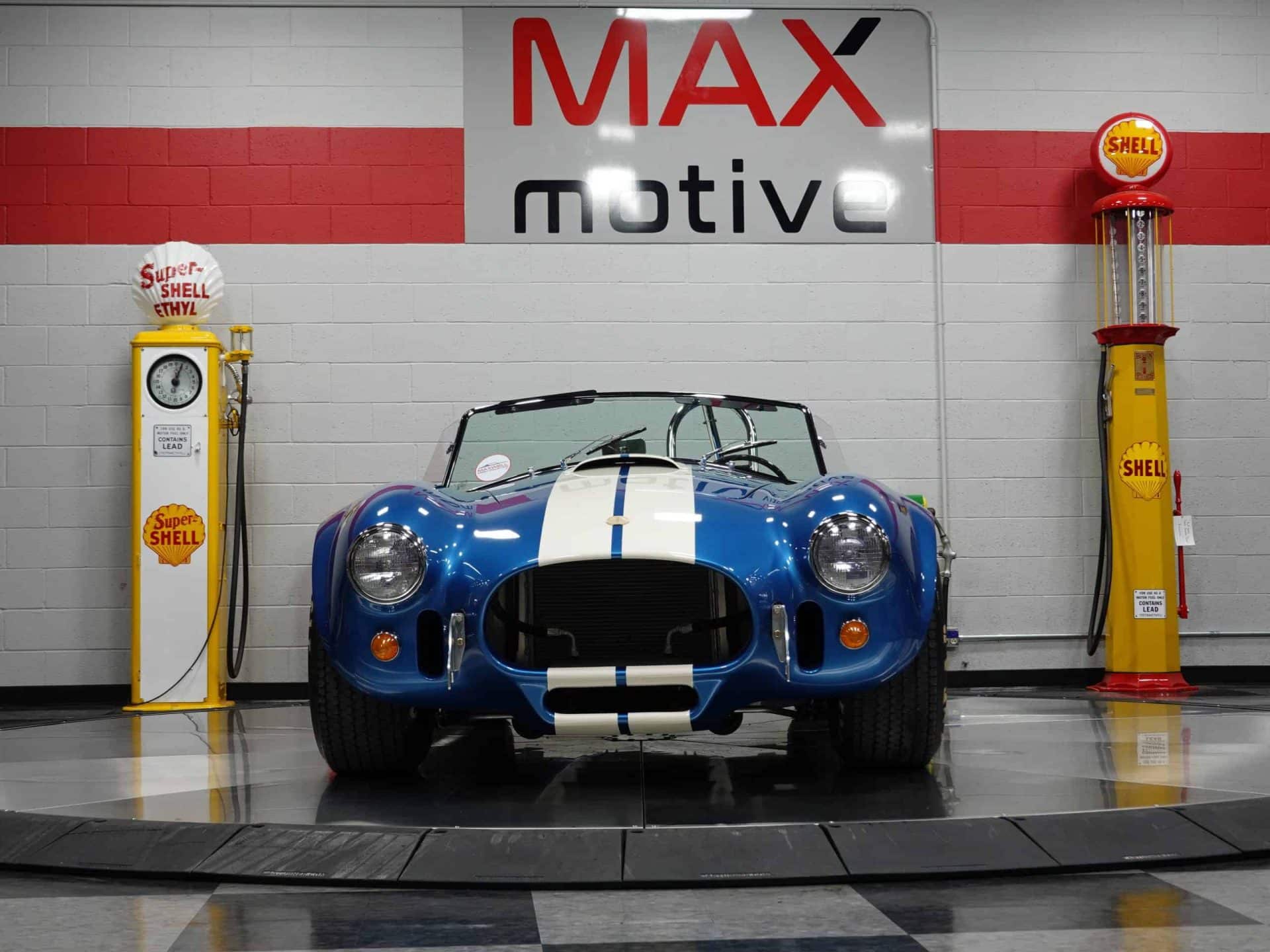 The Shelby Cobra is one of the world’s most famous and recognizable sports cars. Like Carroll Shelby himself, the car is a true icon in the world of high performance. It spawned other great nameplates like the Shelby GT500, Torino Cobra, and the 428 Cobra Jet engine. This CSX4000 Series 427 S/C from Shelby Automobiles Inc. is everything the 1965 models were, and more. The authenticity is documented by Shelby CSX numbers and a manufacturer’s statement of origin (MSO) from Shelby Automobiles. Improvements include a stronger steel frame and better alloys used in the components, plus better cooling and additional heat shielding to make the car safer and more driveable without losing any of its original character. This 1965 Shelby Cobra SC is one of fifty 50th Anniversary Editions. It’s one of 29 with an aluminum body, and one of only three that were painted. The stripes harken back to Carroll Shelby’s history at LeMans. The aluminum block 427 is the product of the combined efforts of Shelby Motor Company and Roush-Yates. With it comes a complete dyno sheet documenting the brutal output of the engine at near 600 horsepower. There’s also a build book showing you exactly how the car was built and how it’s equipped, fascinating and enjoyable reading for sure. But there’s nothing that compares with getting in the seat behind all those gauges with Carroll Shelby’s signature and firing it up. The ultra-high-performance intent is clear. Big Stroud safety harnesses, a fire suppression system, 10½ inch Goodyear Eagles, Halibrand-style wheels with knock-off spinners, and chrome roll bar are obvious clues. Then when you hear this beast run, you’ll know. The storied history and pedigree of the Shelby Cobra is unmatched. And the power to weight ratio on this car takes you to performance levels approached by few other cars in the world. With just 60 test-only miles on it, we at MAXmotive are absolutely thrilled to offer you this spectacular new 50th Anniversary Edition 1965 Shelby Cobra CSX4000 Roadster.
