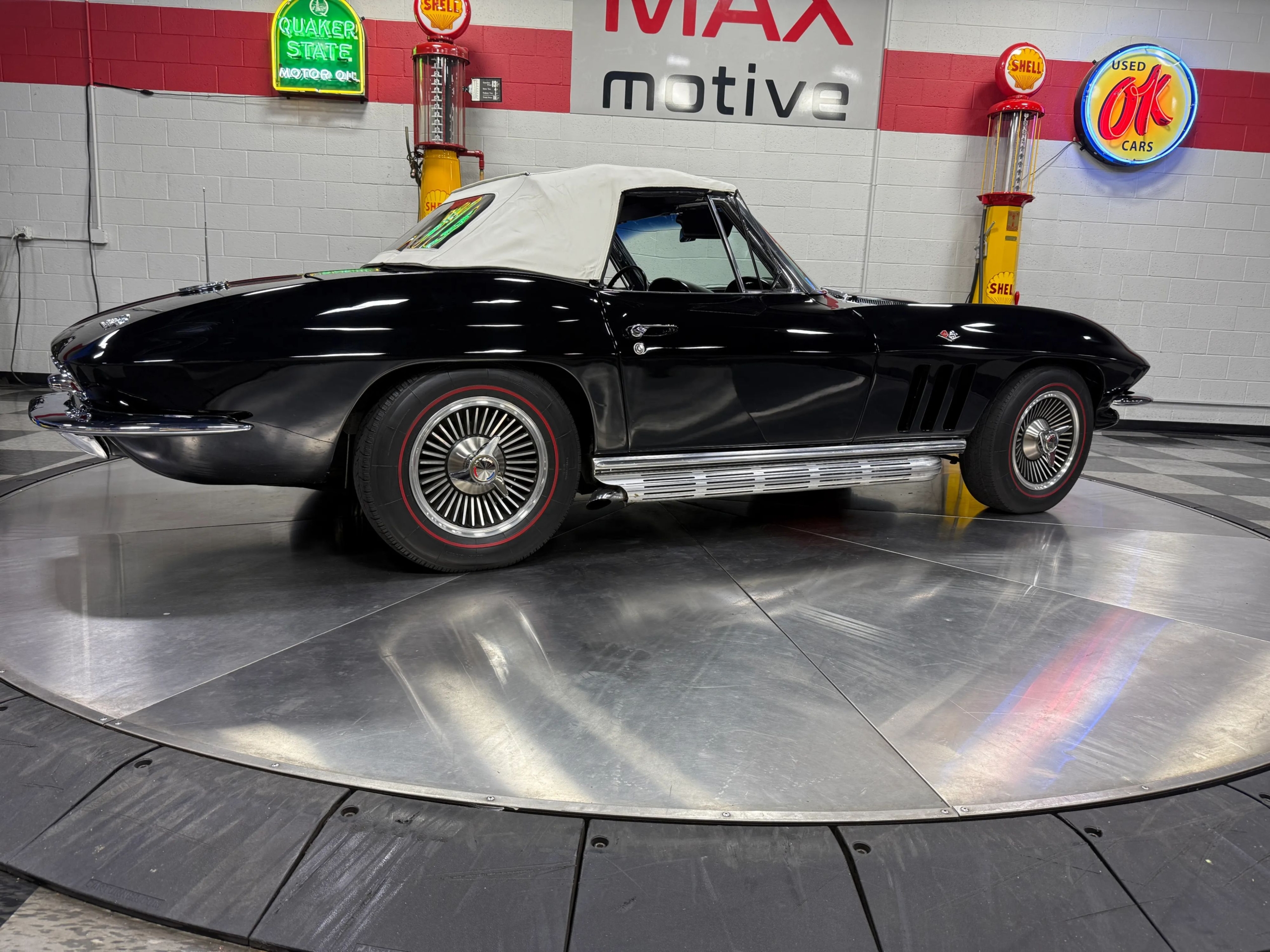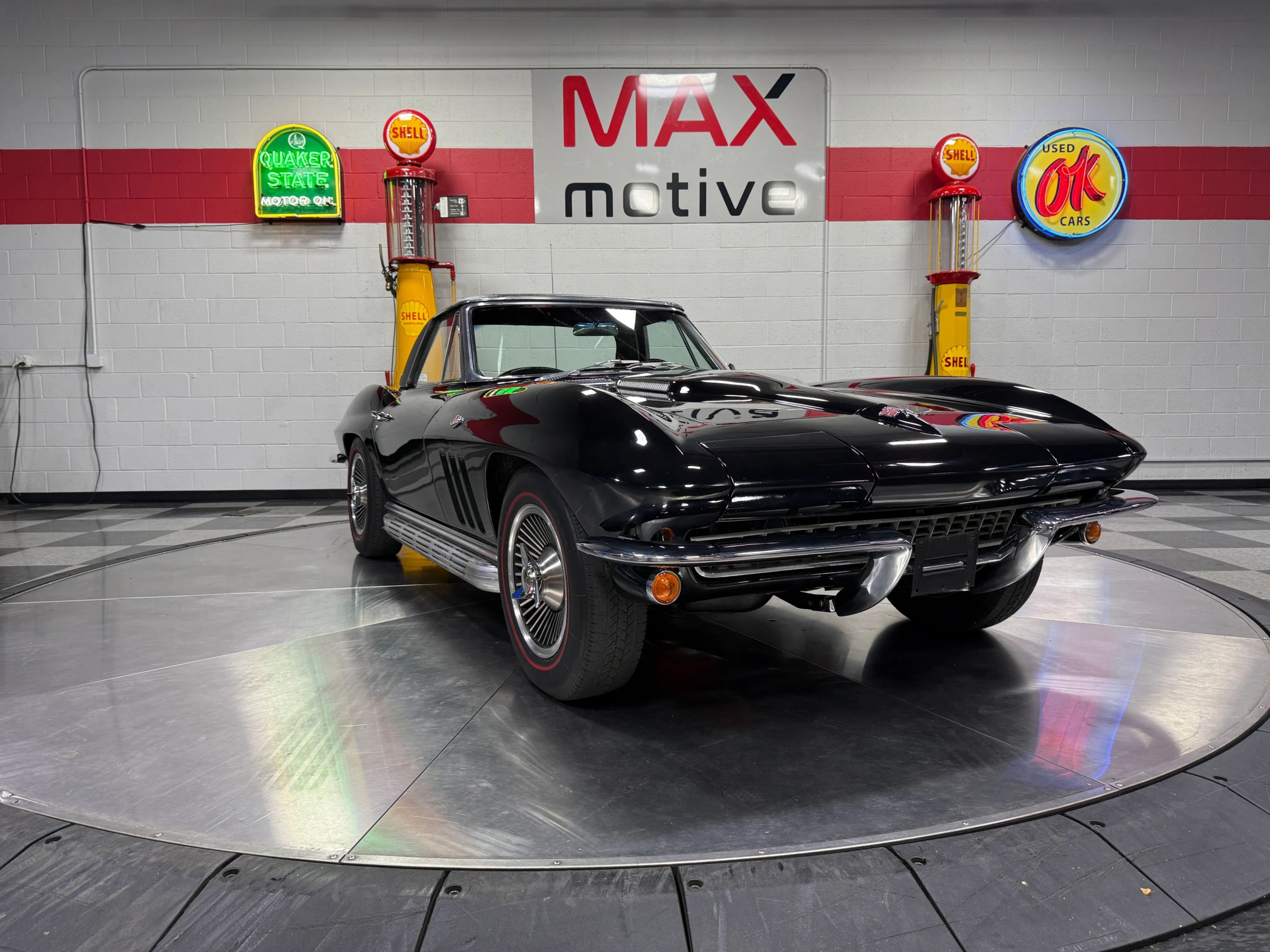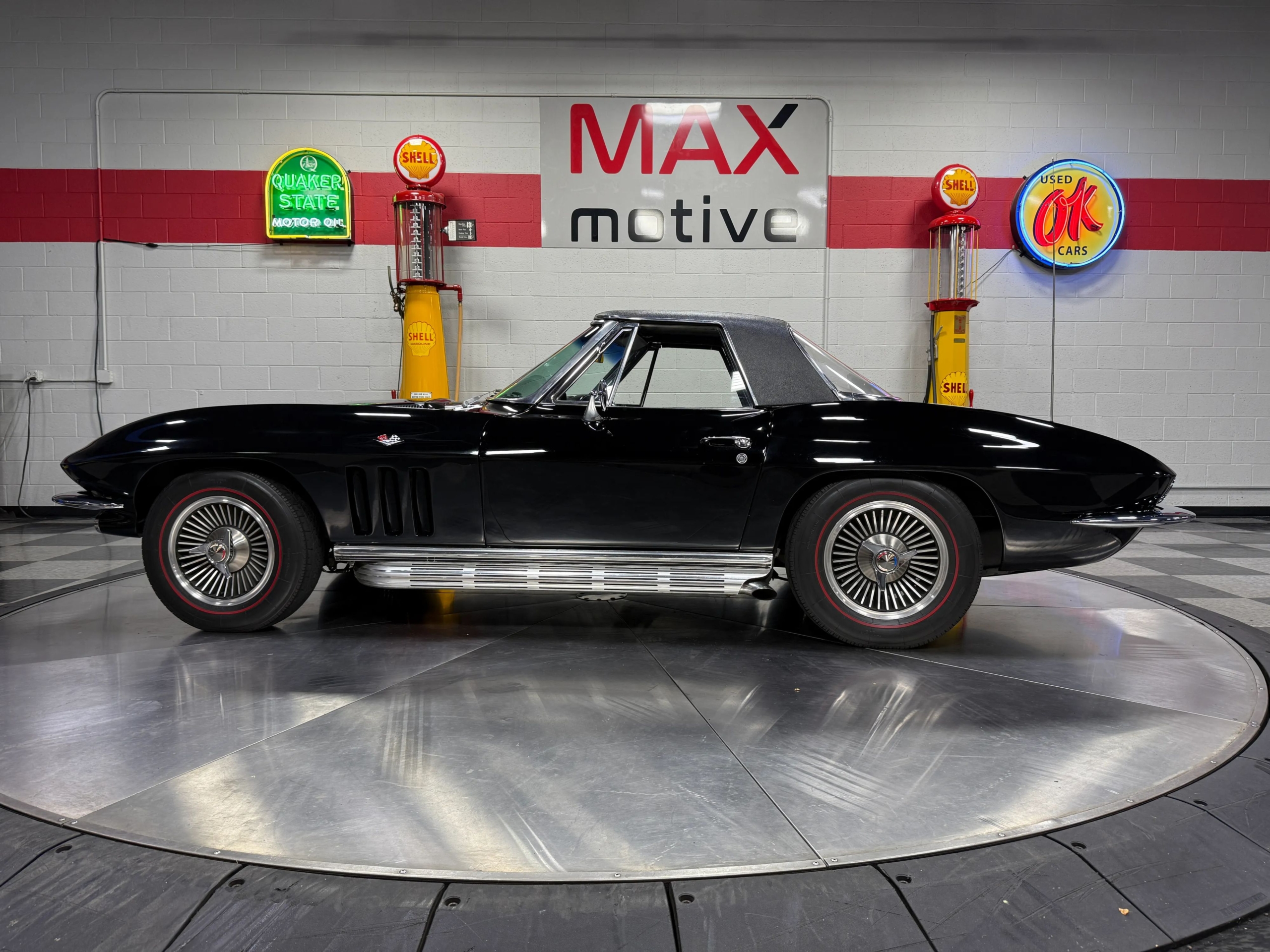 Maxmotive is pleased to offer this gorgeous 1966 Corvette C2 for sale. This Corvette has a 327 V-8 producing 350 horsepower engine. Although this is a non numbers matching engine block, the block numbers are shown in the photos. The small block proudly sports an Edelbrock carburetor. The engine is paired to a Muncie 4 speed manual transmission, with a new clutch installed recently. Exterior looks on this black beauty are accented by a big block hood, beautifully offset by iconic Corvette side pipes. 15 Kelsey Hayes wheels matched to Coker classic tires set up the stance of the Corvette. Two tops are included with this stunner, a black hard top, and a white soft top with a plastic back window. Power steering and power disc brakes make driving this piece of Americana a breeze. It is noted the clock, fuel gauge, and power antenna are non operational. For more pictures and information, check out our website www.maxmotive.com