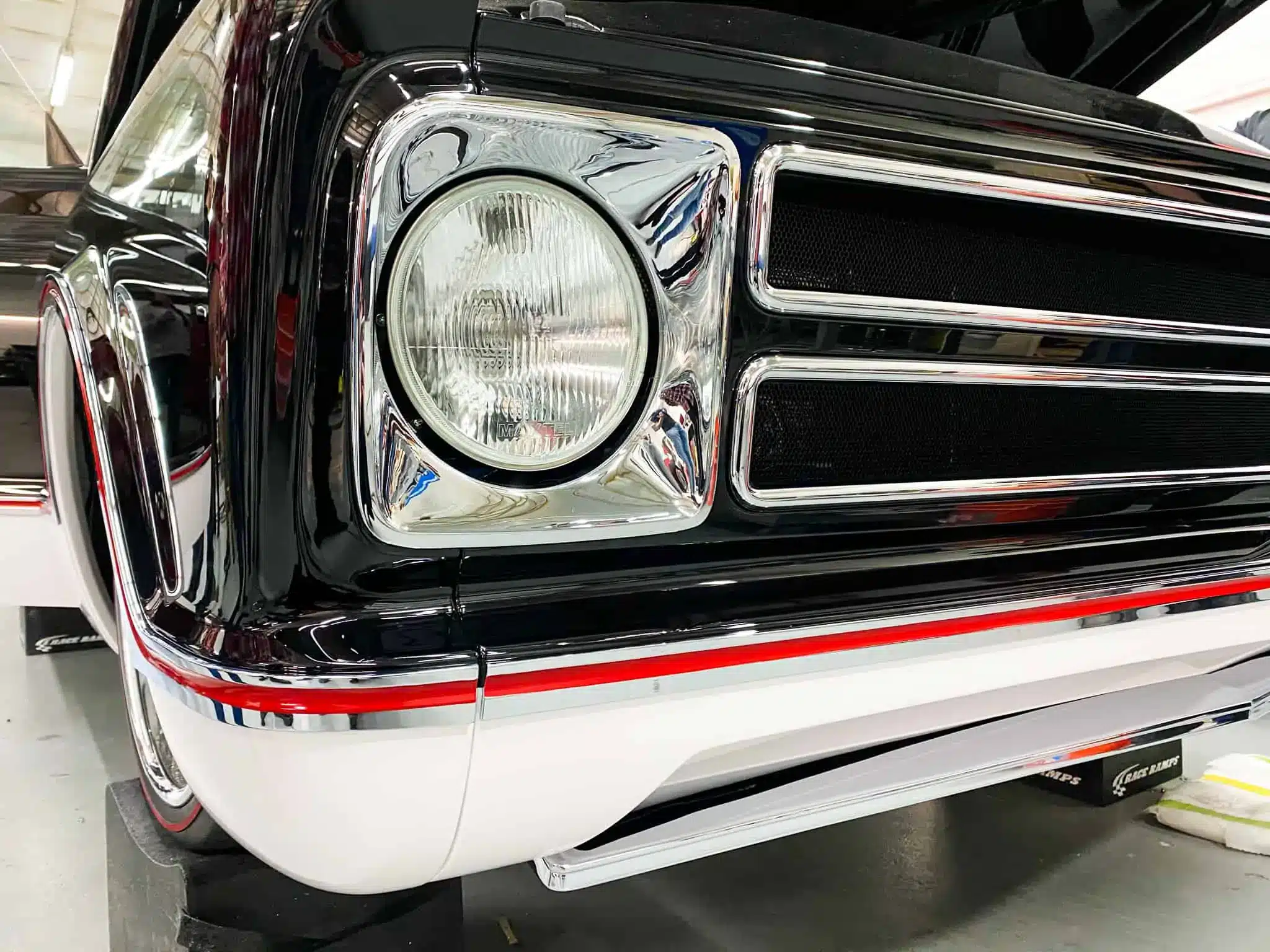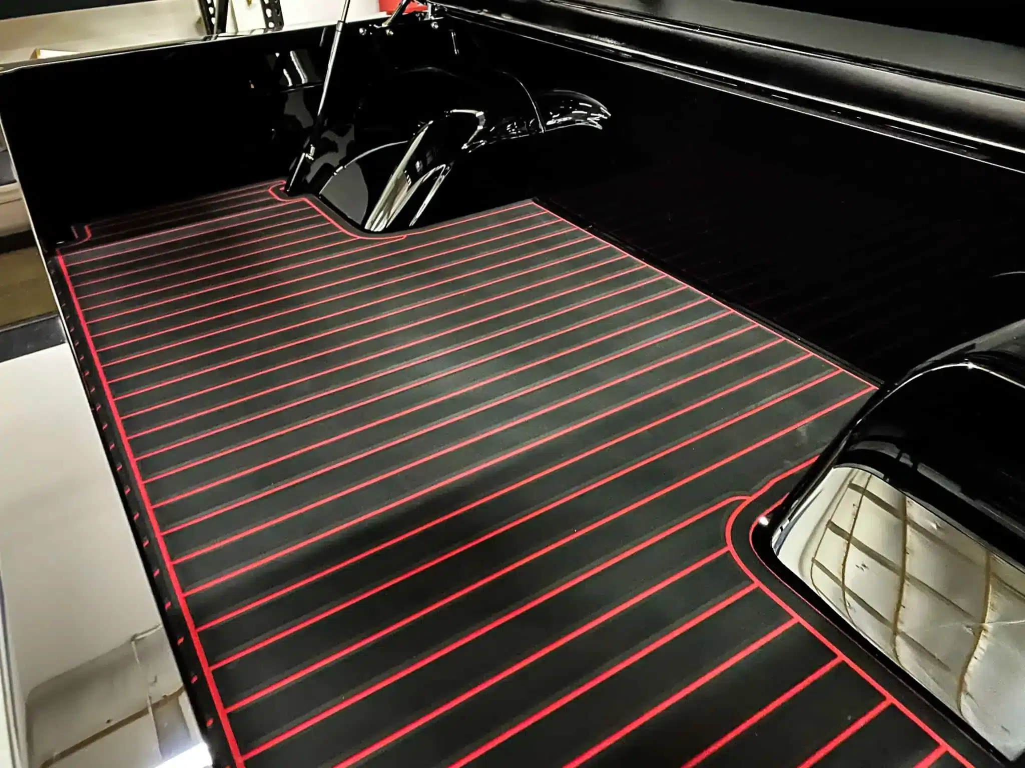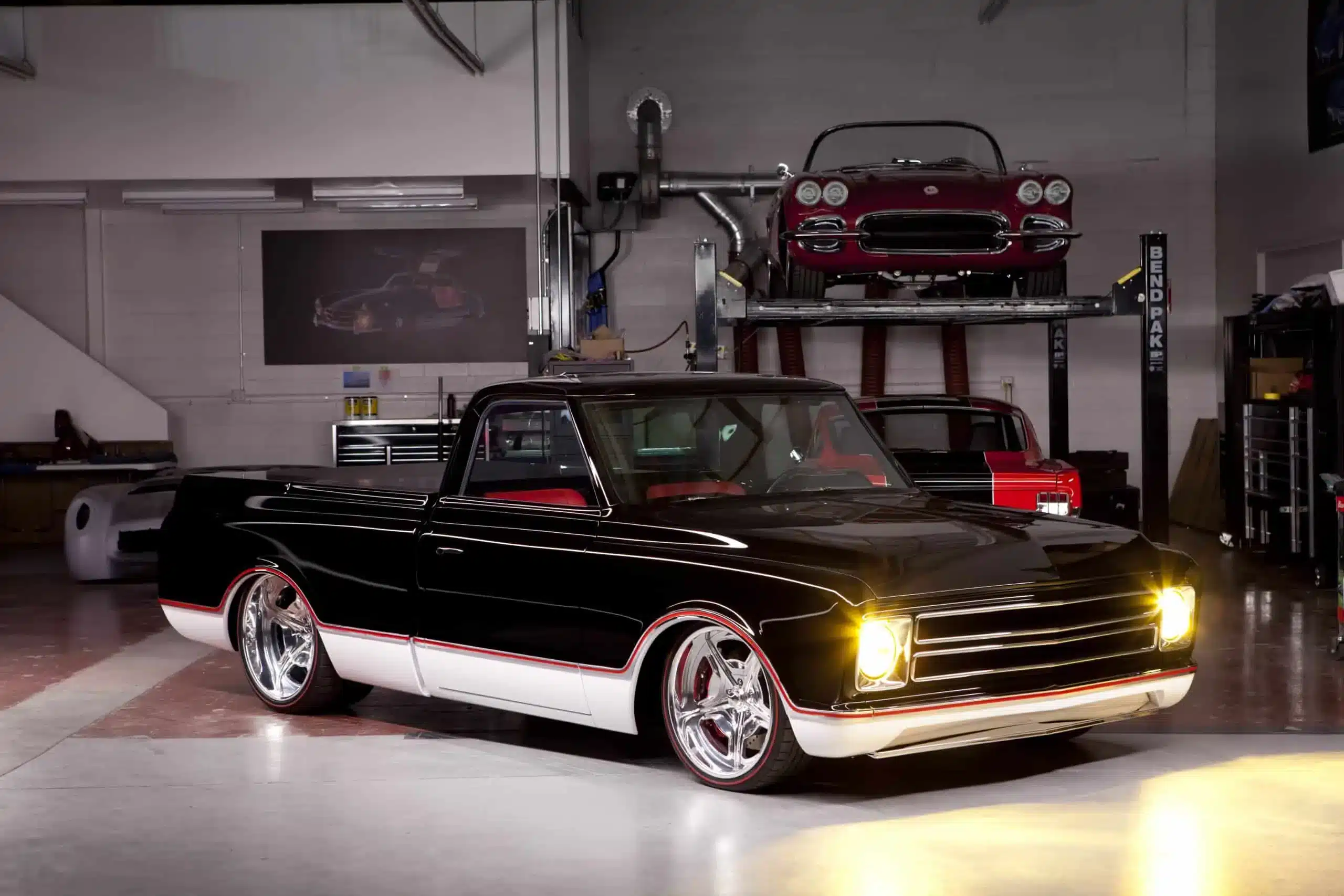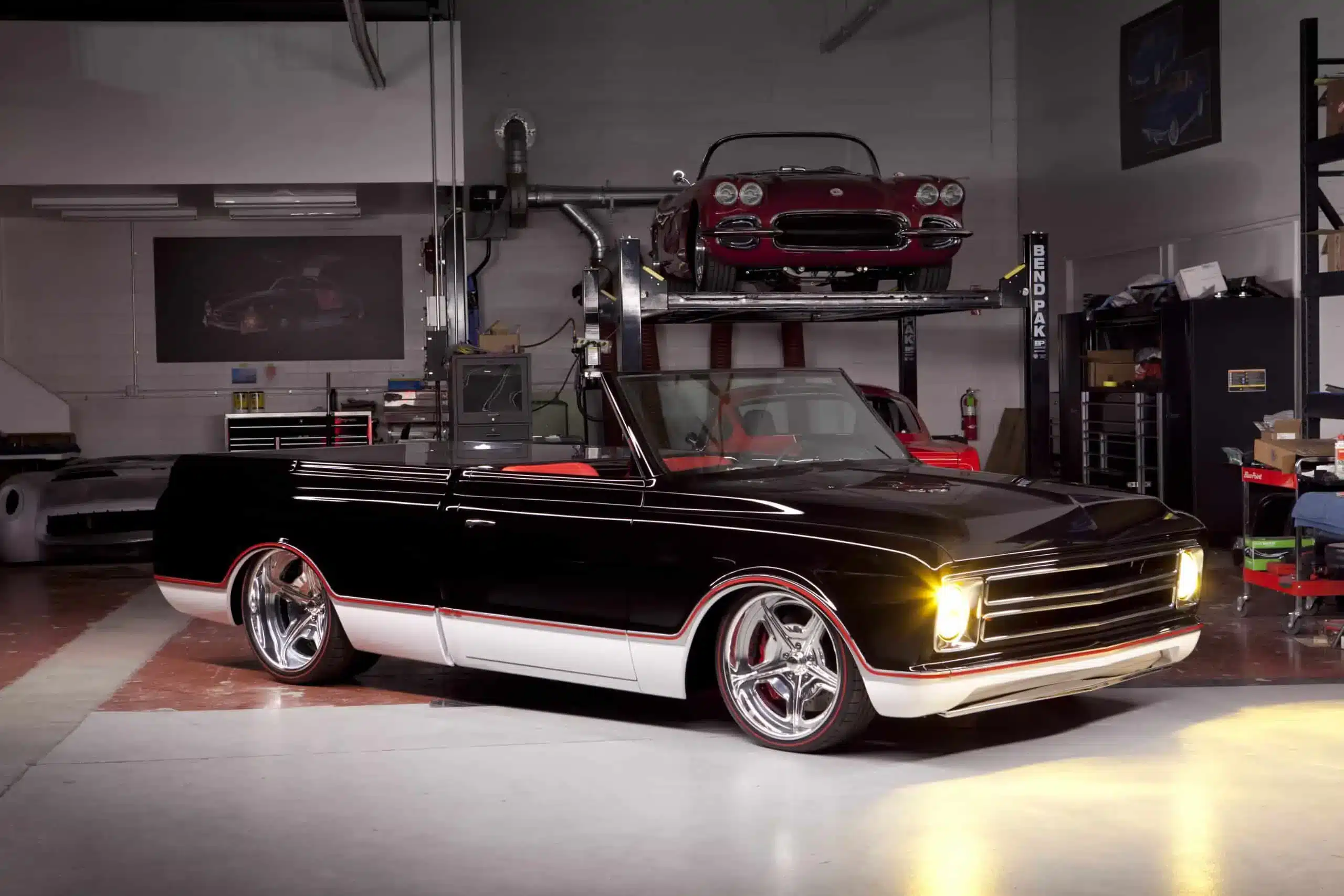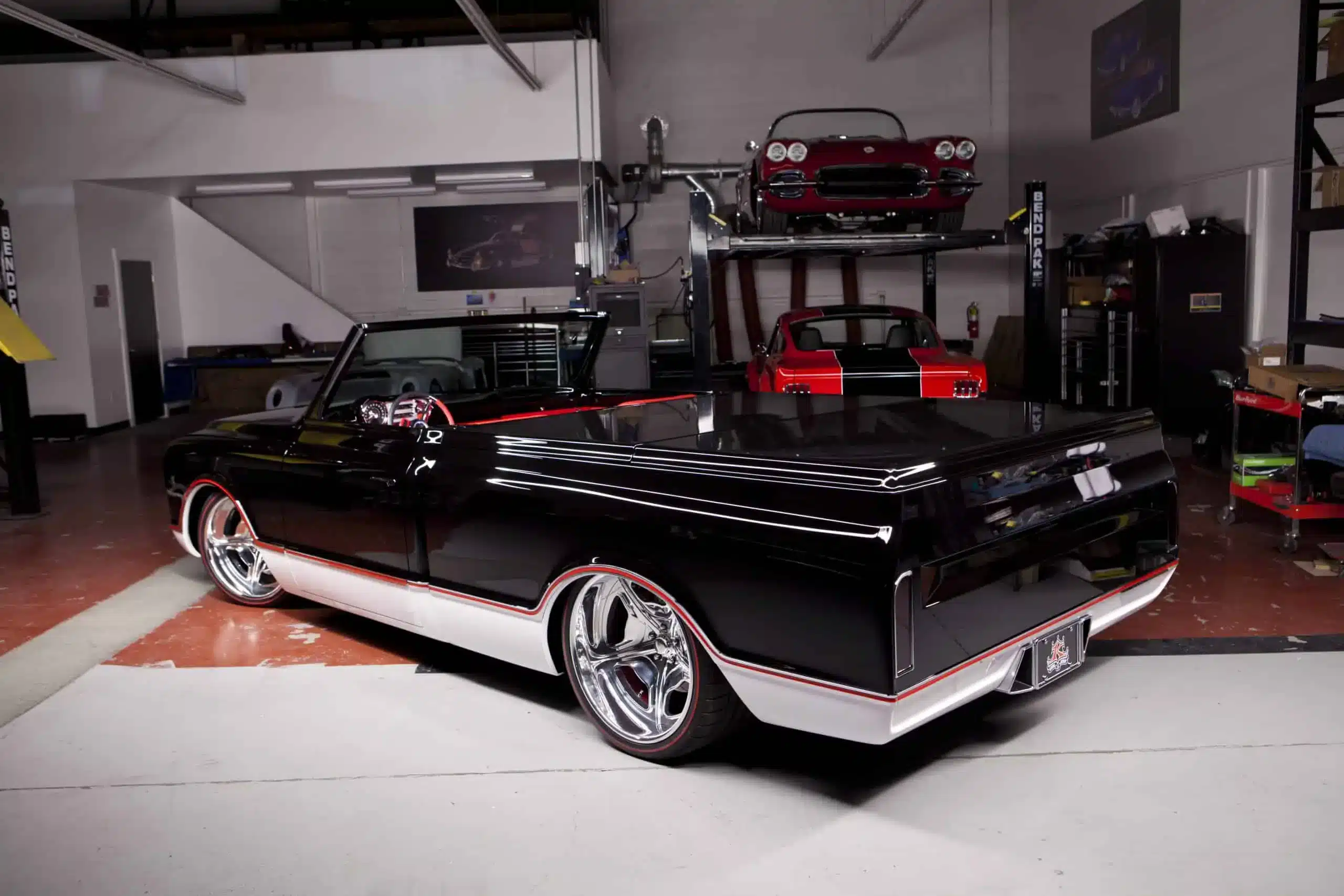 - Body: Custom Front Roll Pan Stretched Hood, 2 ½” Chop Top With A Full Length Stock Windshield Lowered Below The Hood Line, Custom Engine Bay and Firewall, Kindig-IT Design Smooth Door Handles, Bed Pushed Forward With A Custom Tonneau Cover, Custom Rear Roll Pan and Shaved Tailgate, and Retractable Two Piece Hardtop That Folds Into The Front Half of The Bed.