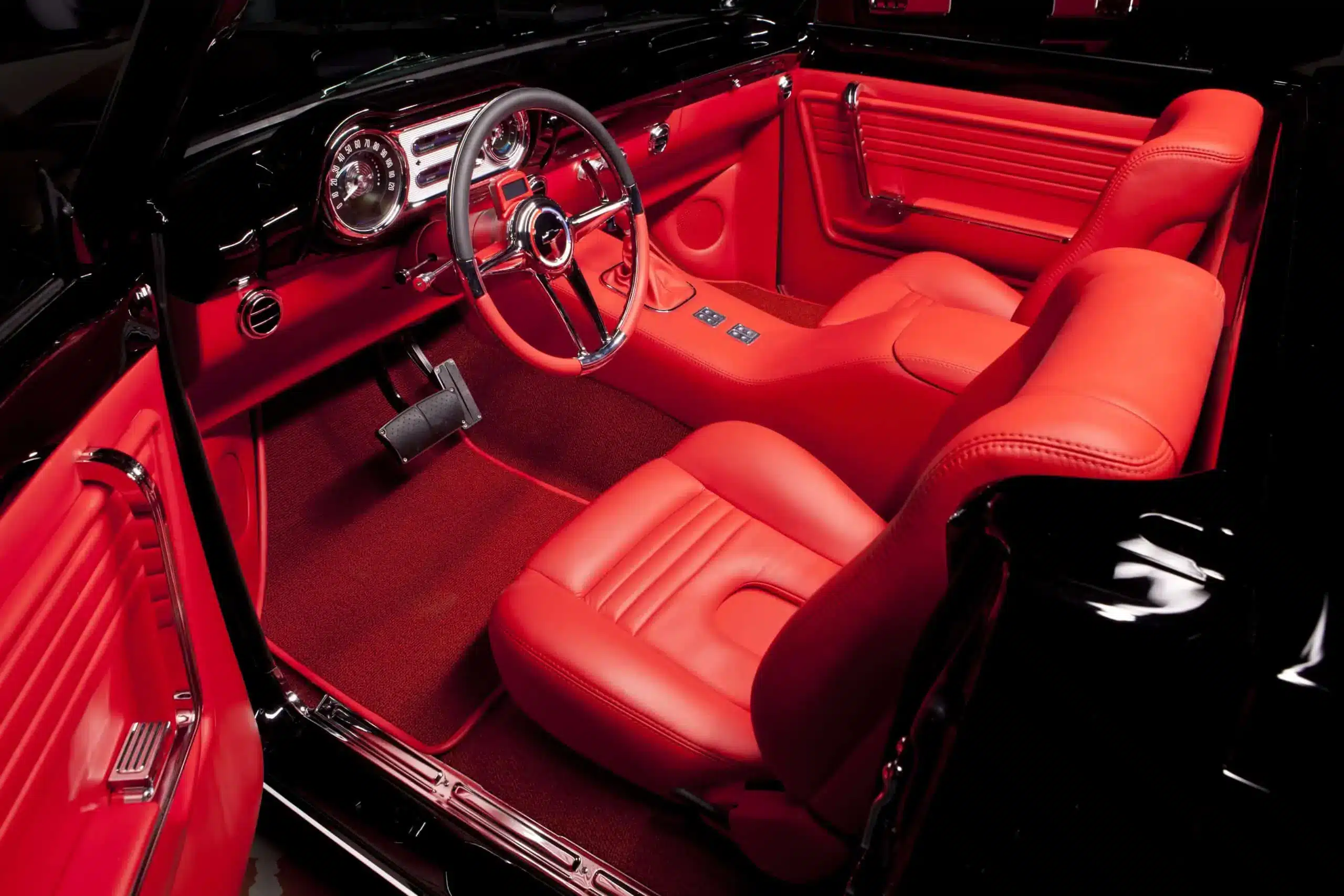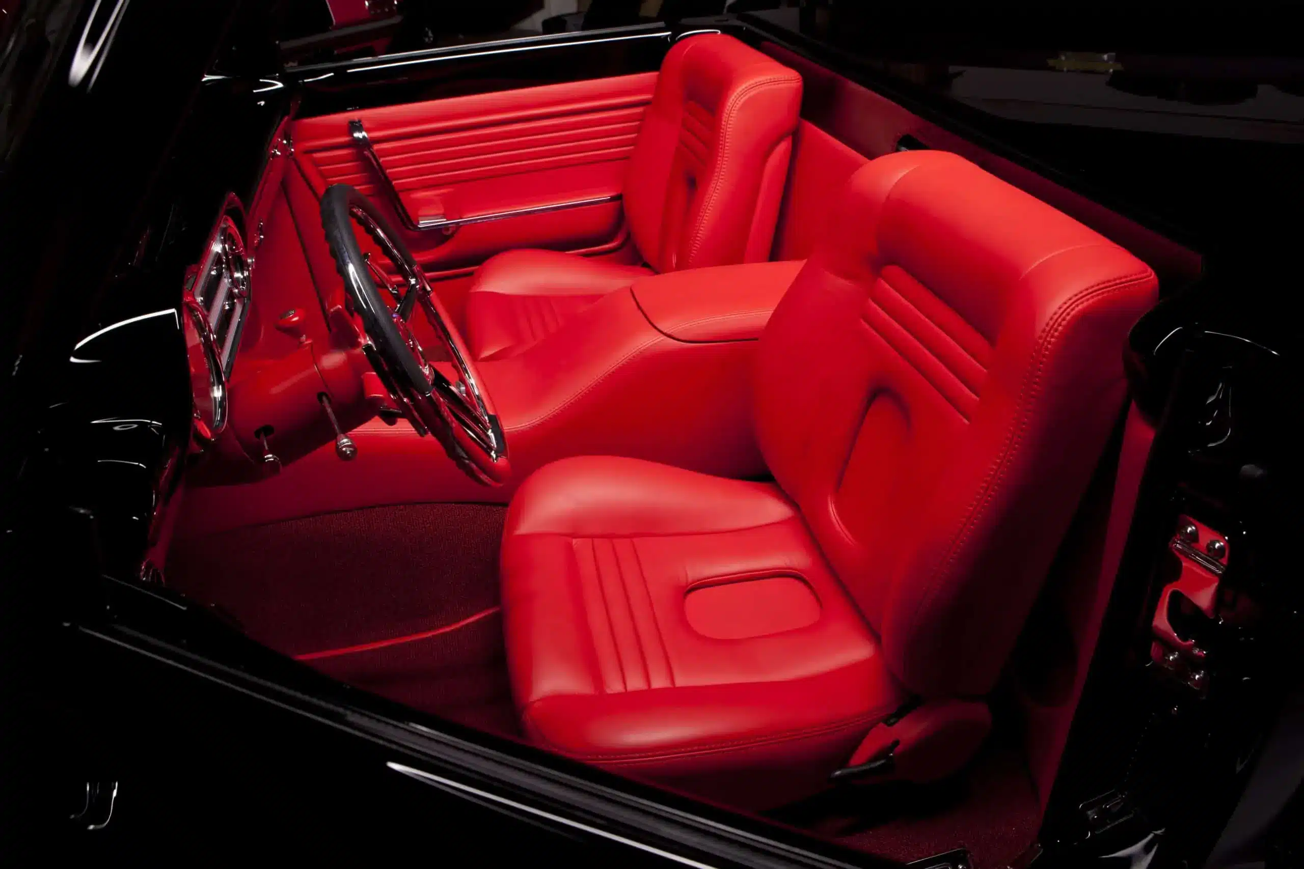 - Interior: Hyde’s Leather in “Rosso Red” by JS Custom Interiors. ‘59 Impala Dash with Custom Dakota Digital Gauges. Evod One-Off Steering Wheel.