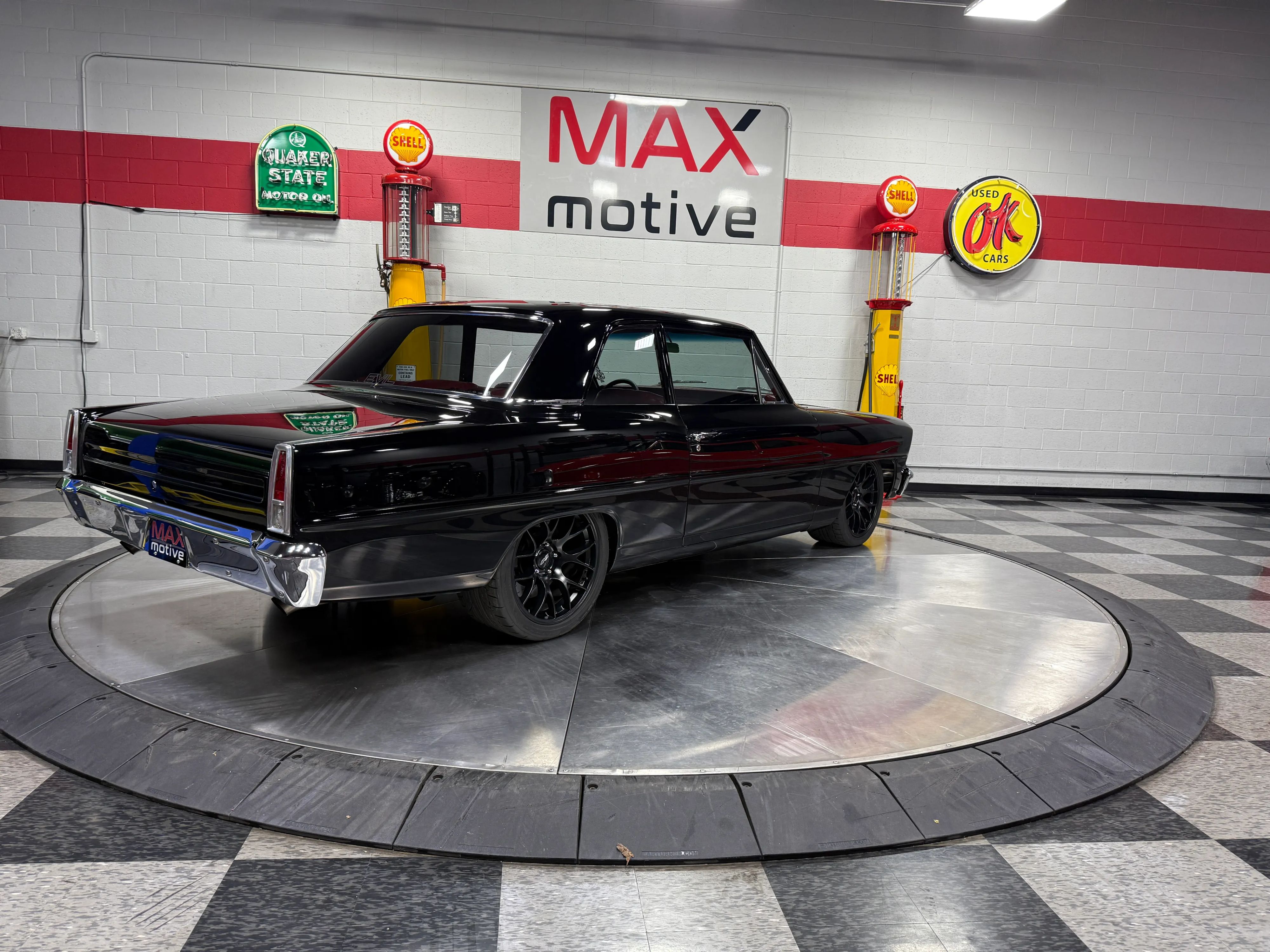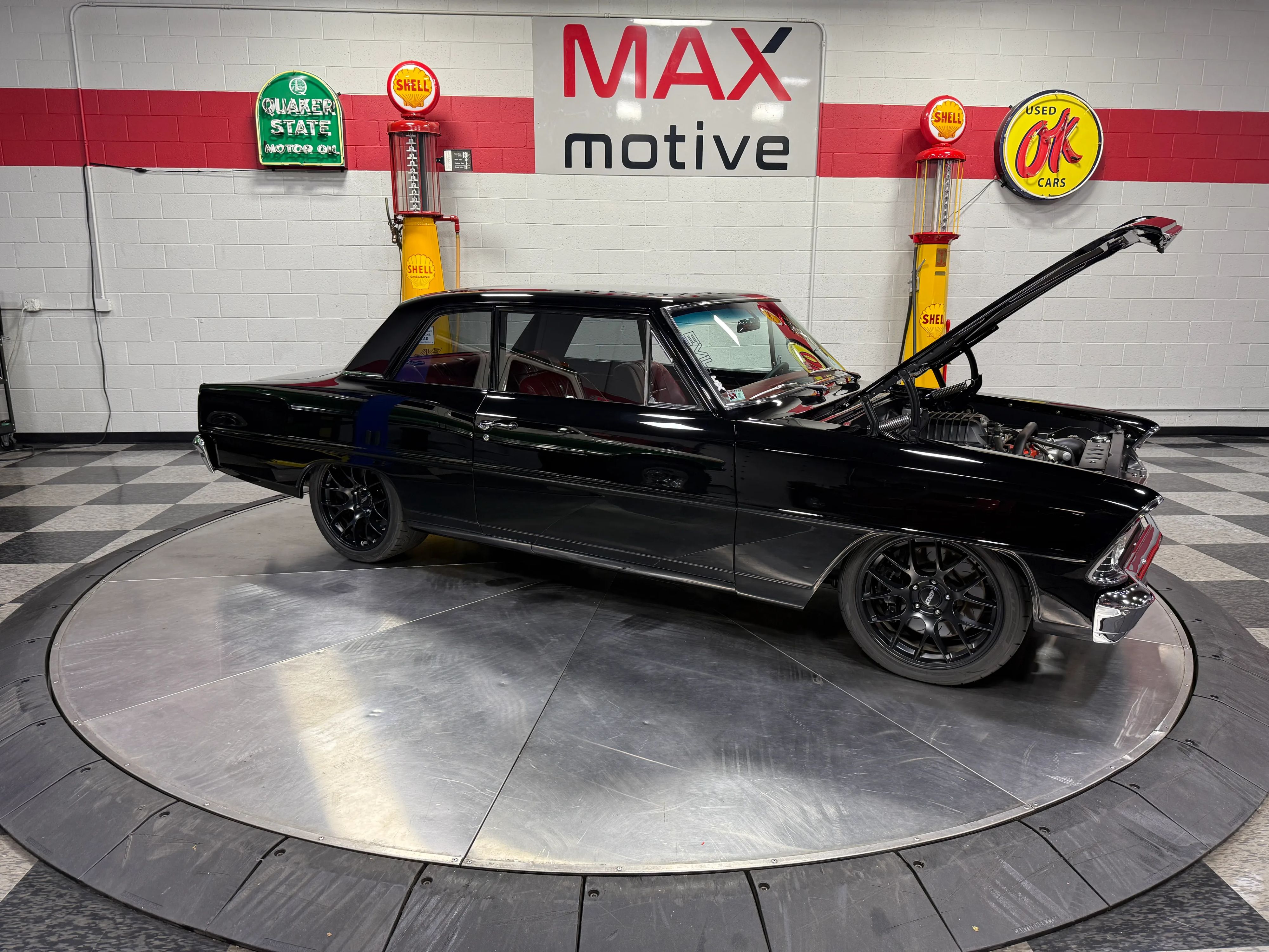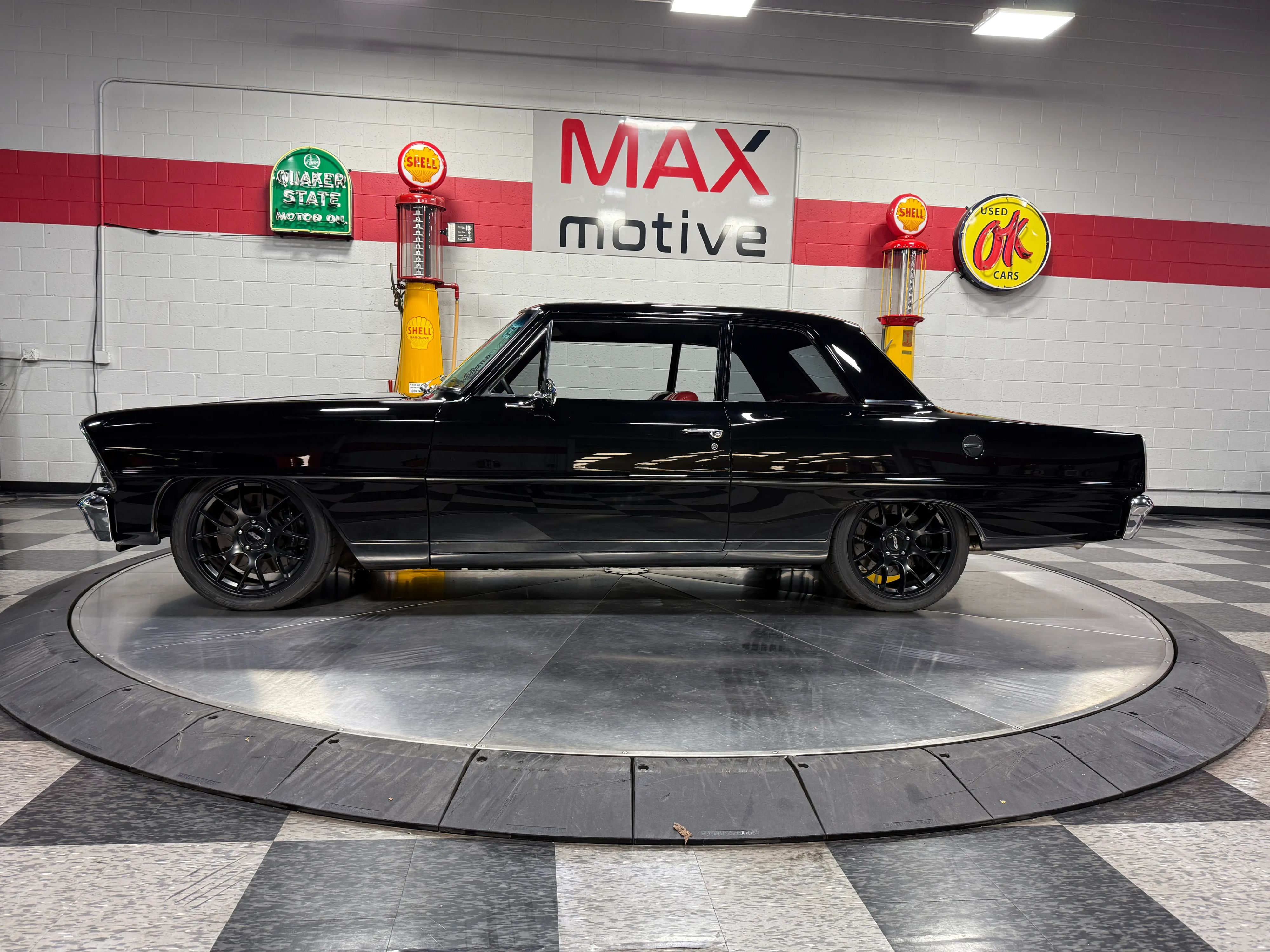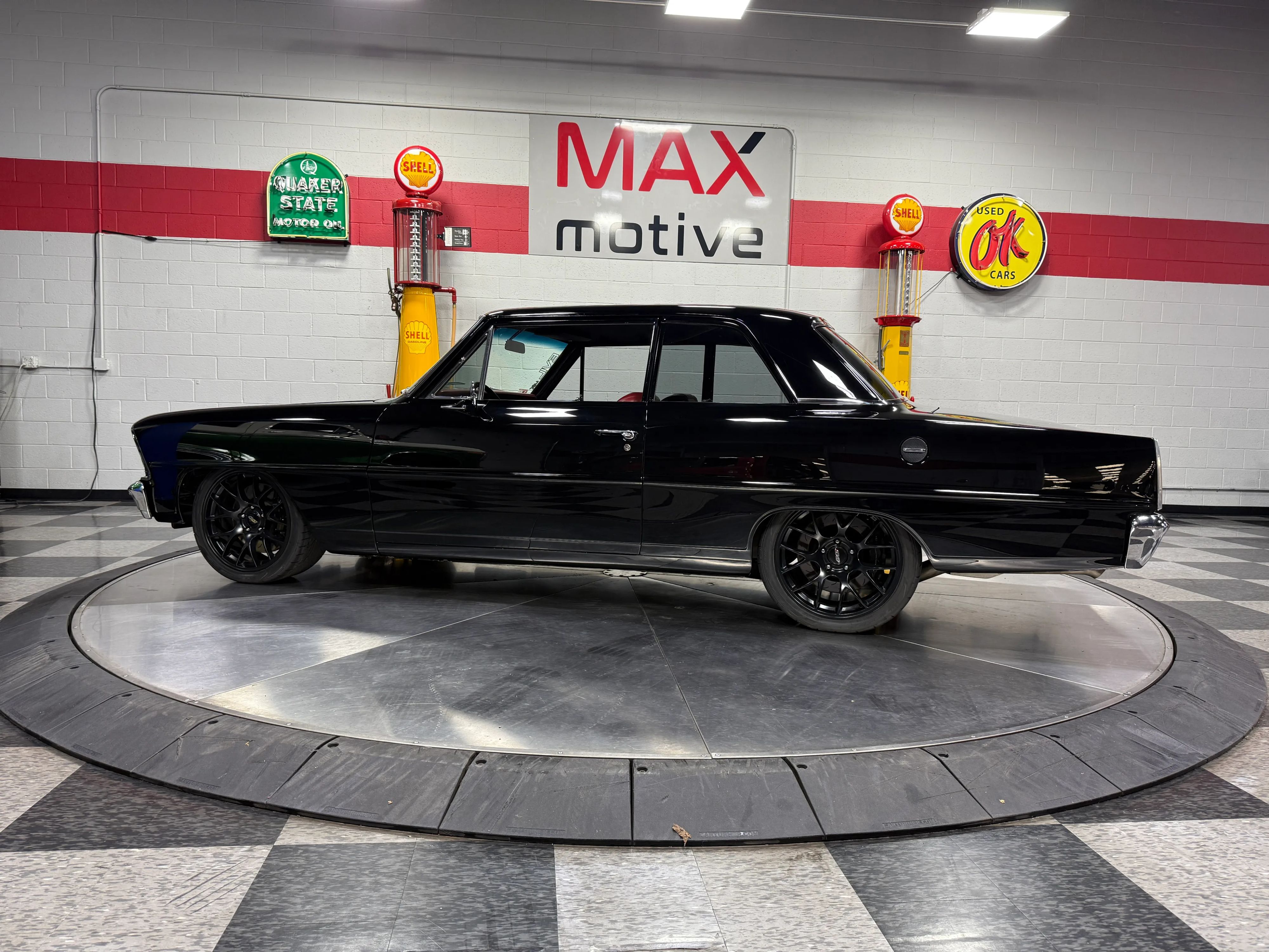 MaxMotive is proud to present this exceptional 1967 Chevrolet Nova a professionally built Pro-Touring machine that blends classic muscle car style with modern supercharged performance, premium suspension engineering, and luxury interior upgrades. Finished in striking gloss black with chrome bumpers and trim, the Nova sets an aggressive tone with a matte carbon-fiber lower valance and black Apex wheels wrapped in Nitto performance tires.