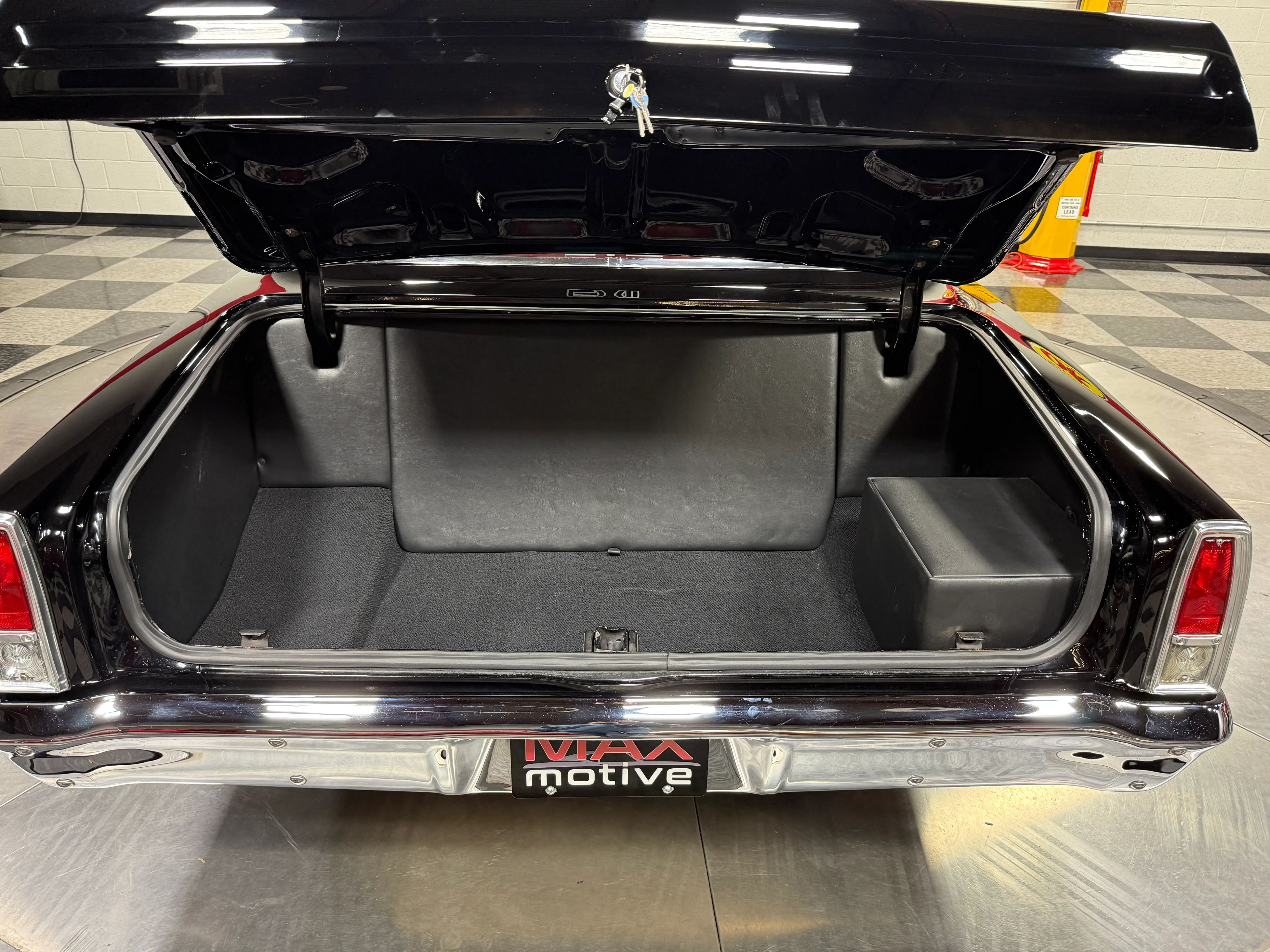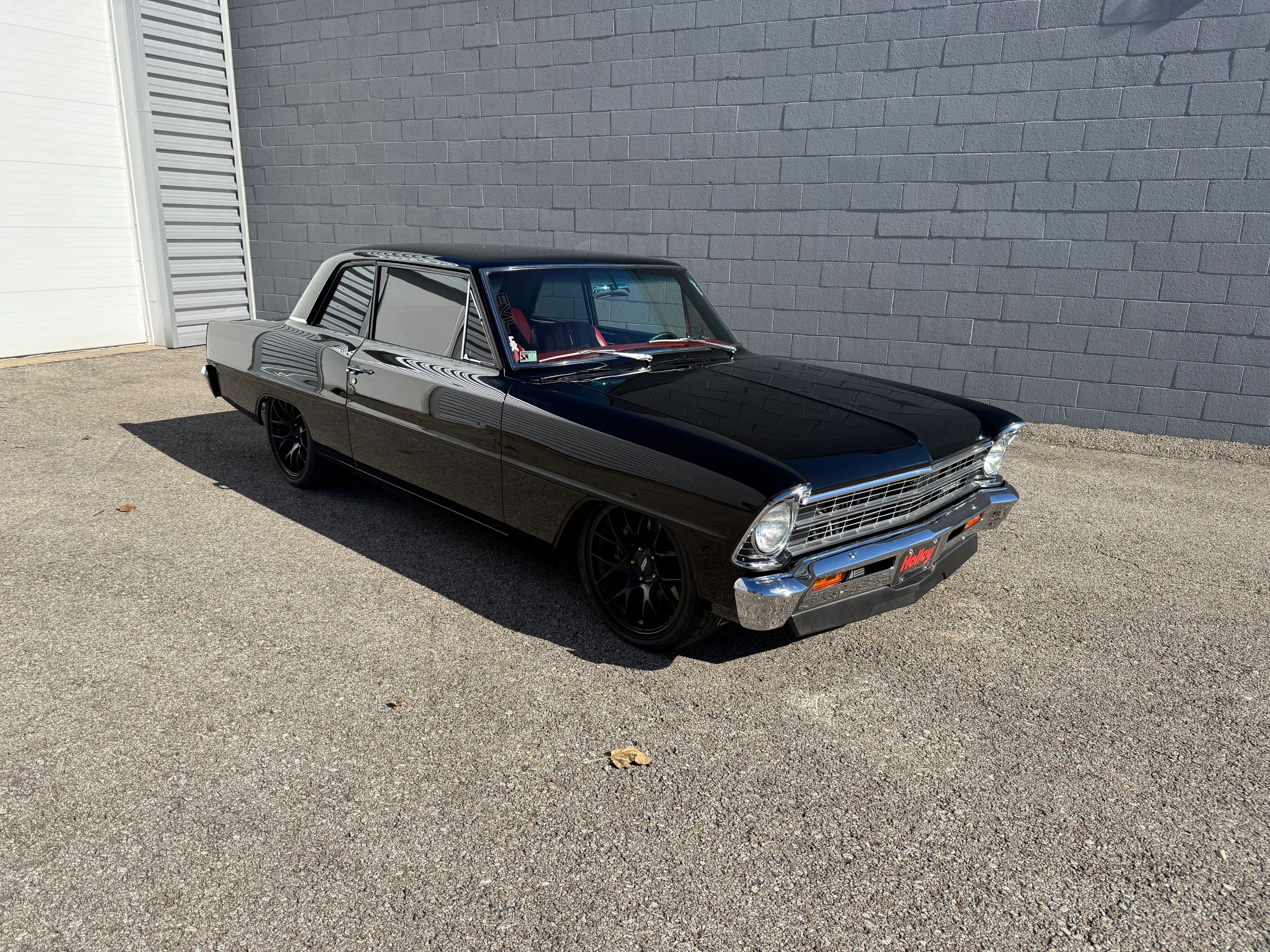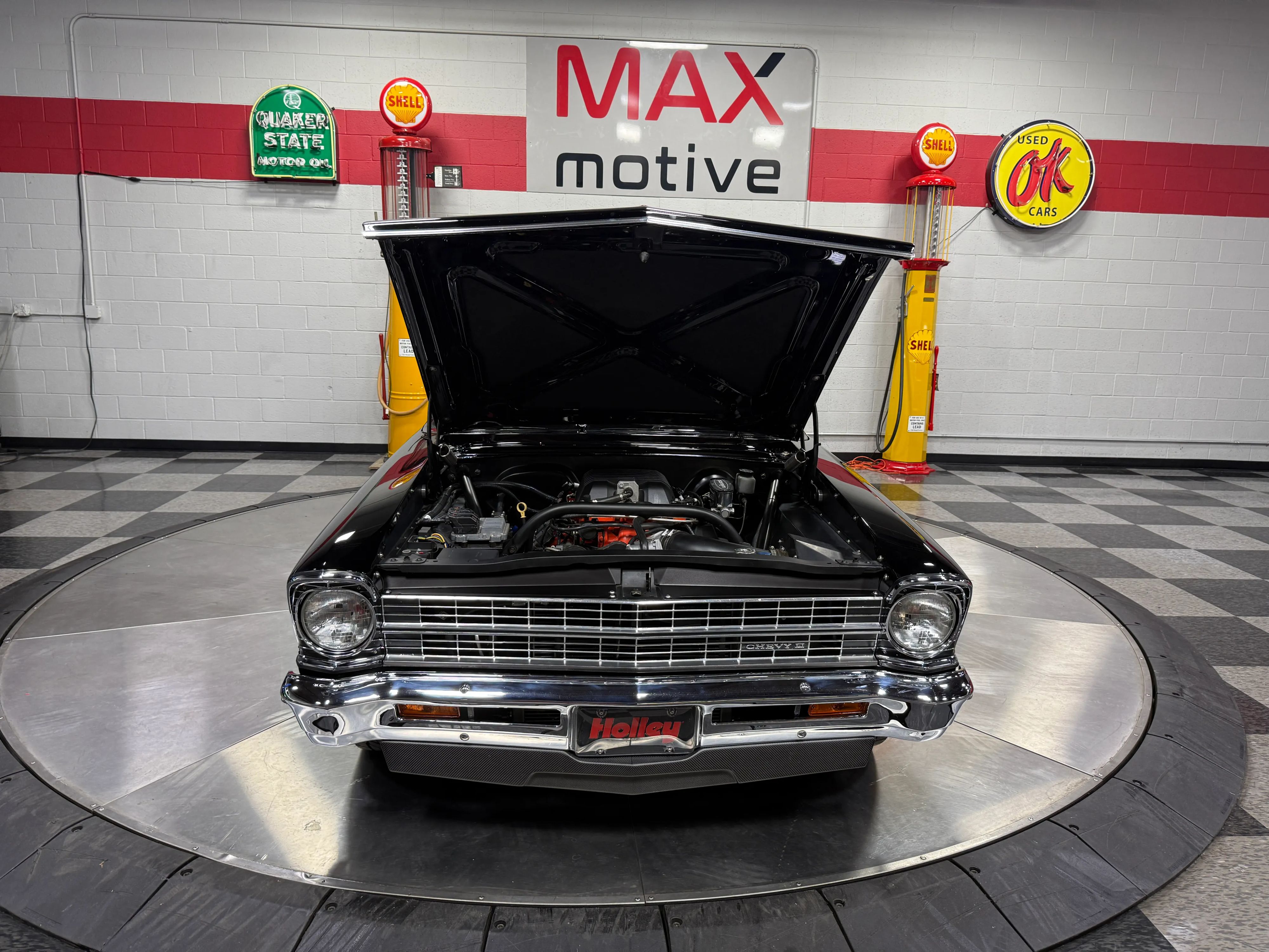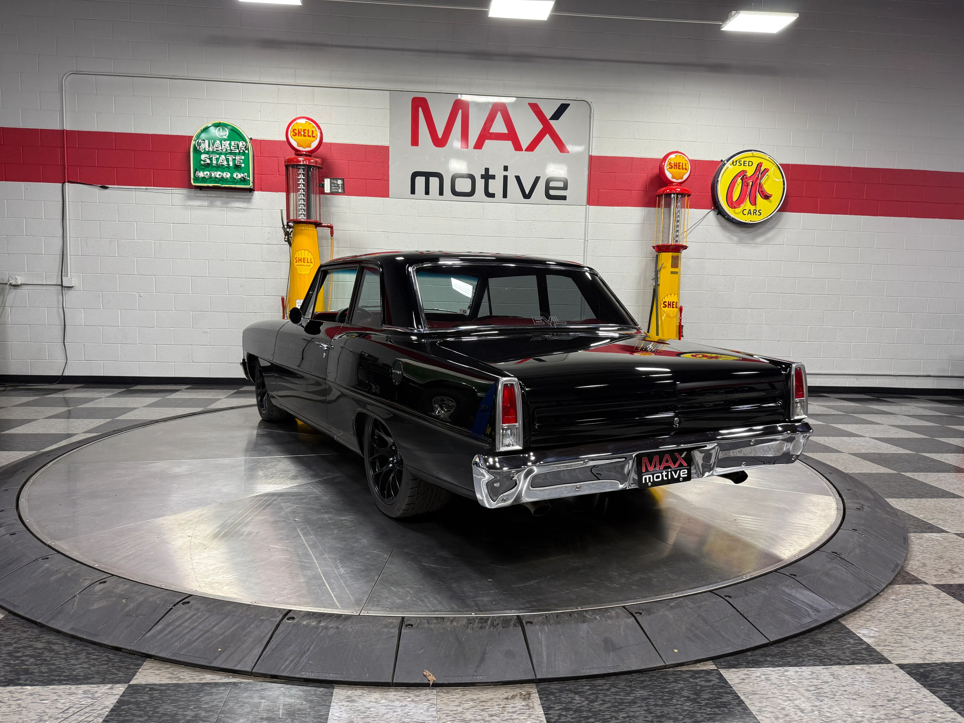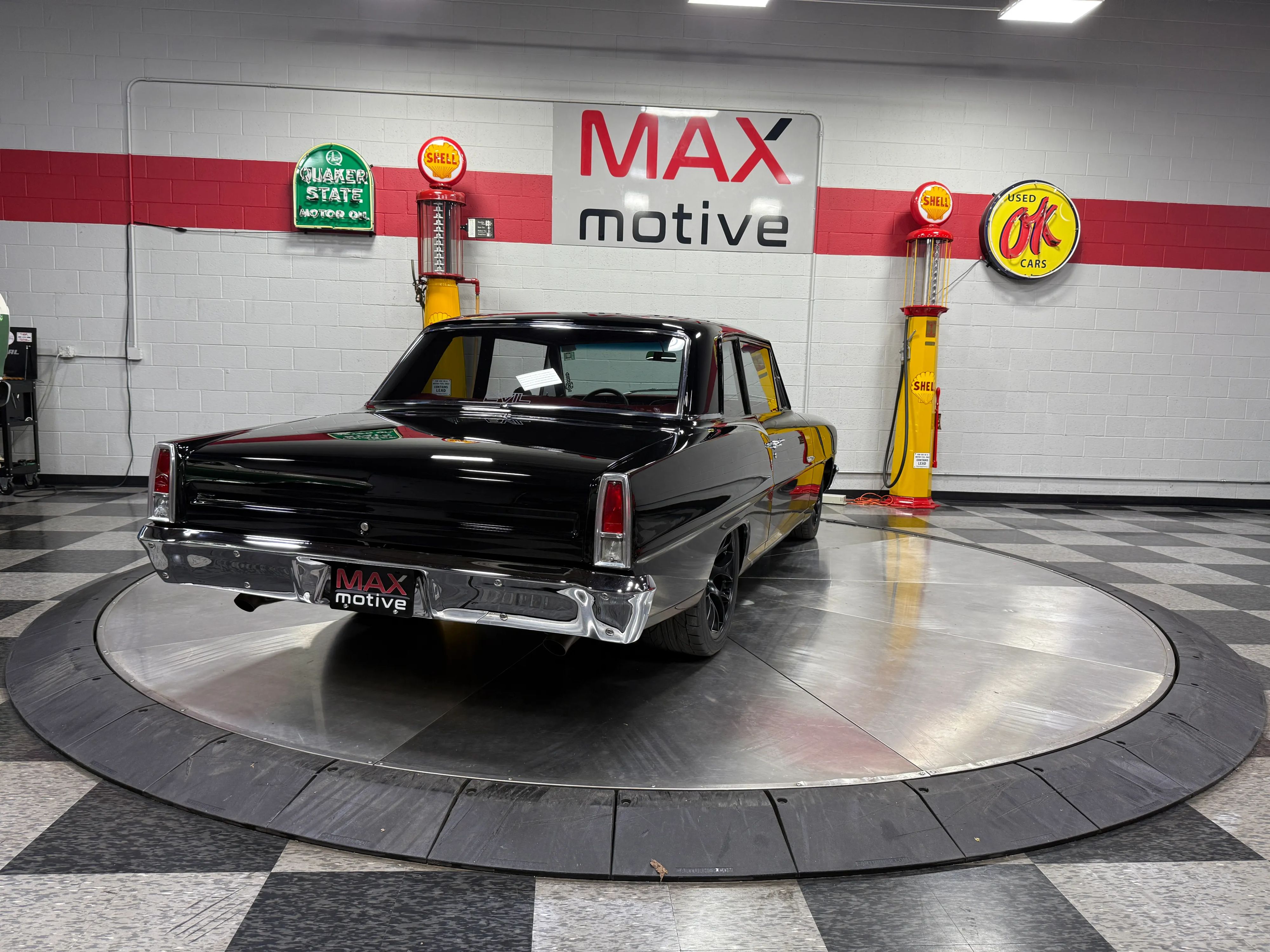 MaxMotive is proud to present this exceptional 1967 Chevrolet Nova a professionally built Pro-Touring machine that blends classic muscle car style with modern supercharged performance, premium suspension engineering, and luxury interior upgrades. Finished in striking gloss black with chrome bumpers and trim, the Nova sets an aggressive tone with a matte carbon-fiber lower valance and black Apex wheels wrapped in Nitto performance tires.