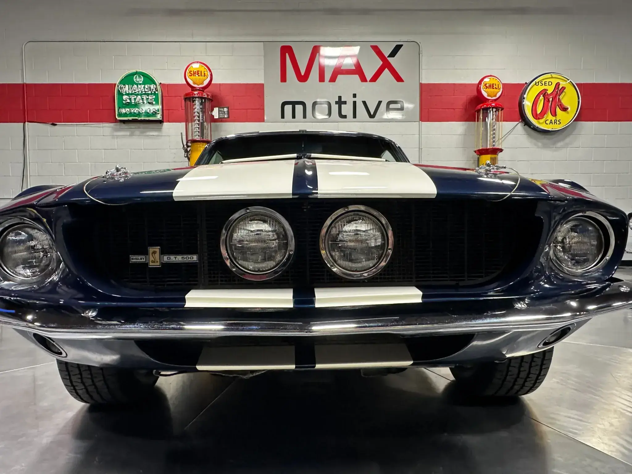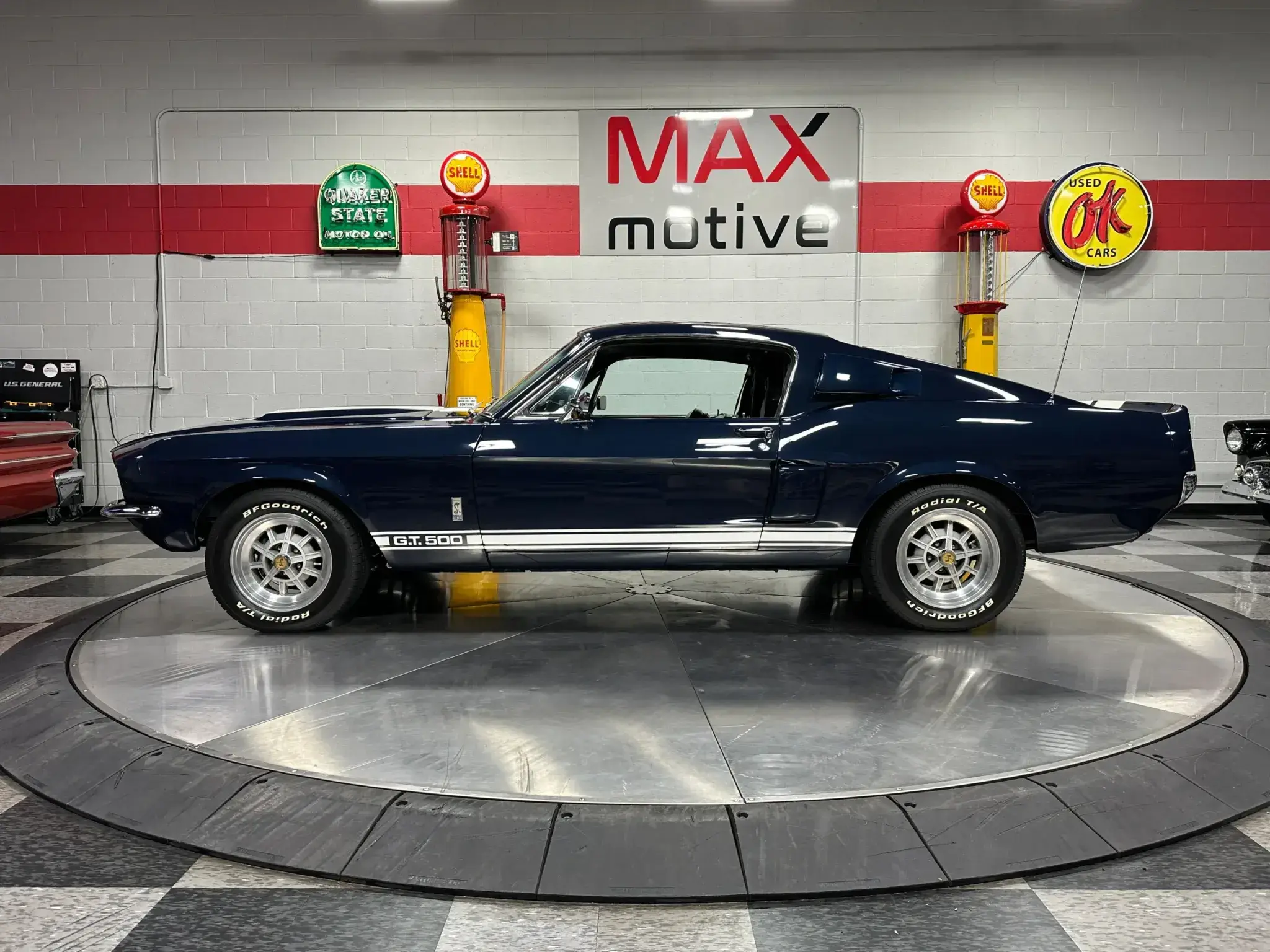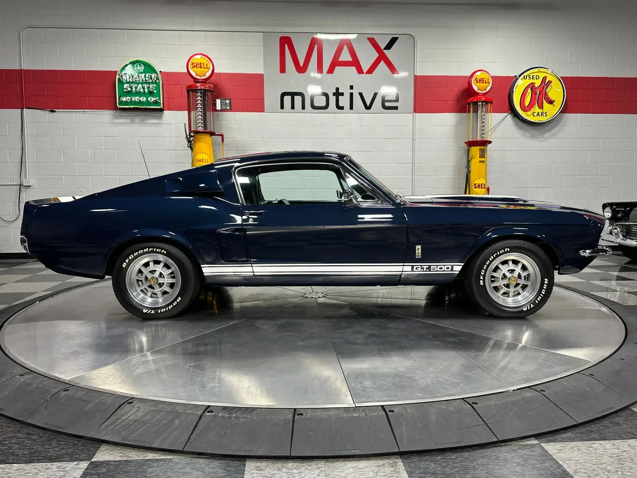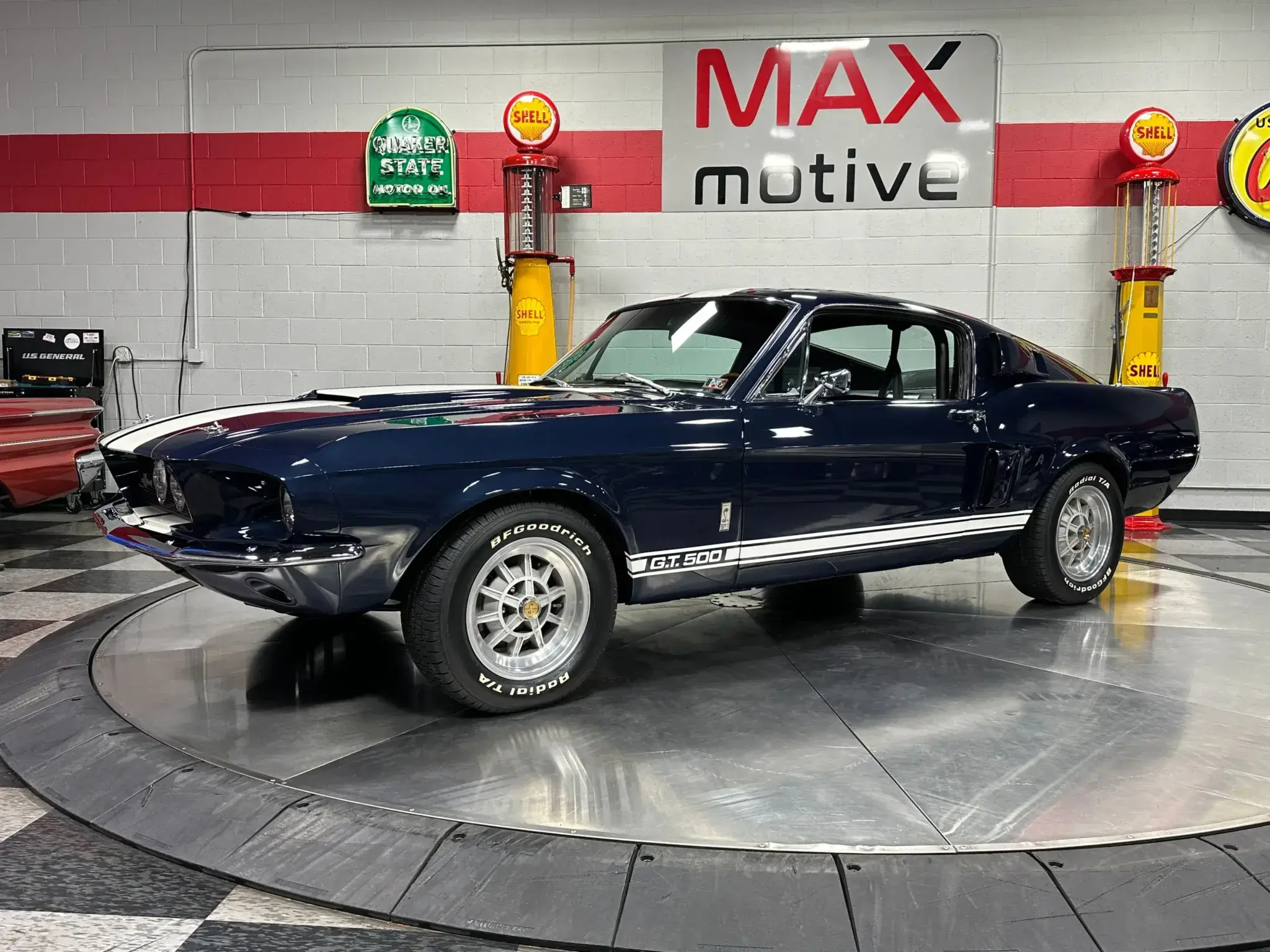 MaxMotive is proud to present this outstanding early production 1967 Shelby GT500 Fastback. The correct and highly esteemed 428ci Police Interceptor V8 engine was rebuilt, blueprinted, and dyno tested by Evanuik Performance. Helpful data like cam specs, plus cylinder head, valve train, block, crank and oil system specs are provided as well. On top are two 650cfm Holleys and it is dressed with the coveted finned aluminum Cobra LeMans valve covers and Cobra dual carb air cleaner. The entire car was lovingly restored over a 3-year period and completed in 1991. The engine rebuild was done in 2010 and the car has been driven about 3755 miles since. The top tier drivetrain features the rugged C6 automatic transmission and legendary 9-inch Ford rear axle. Restoration photos are included. As an early production model, it sports the distinctive inboard hi-beams, and along with the Nightmist Blue exterior paint, white LeMans stripes, and distinctive Kelsey-Hays Mag Star 10-spoke aluminum wheels, the car simply exudes Shelby-ness, and it is just gorgeous! In fact, the signature of Carroll Shelby himself is proudly displayed on the passenger sun visor. Once inside, you will also find a 140mph speedometer, 8000rpm tack, Shelby/SW auxiliary gauges, and even a fully functional analog clock It comes with build and service receipts documenting the quality of the work and care that has been lavished on this special car. Please look over the photos and details at maxmotive.com.This car also comes with an Elite Marti Report and a Mag report that verifies the credentials of this amazing car!