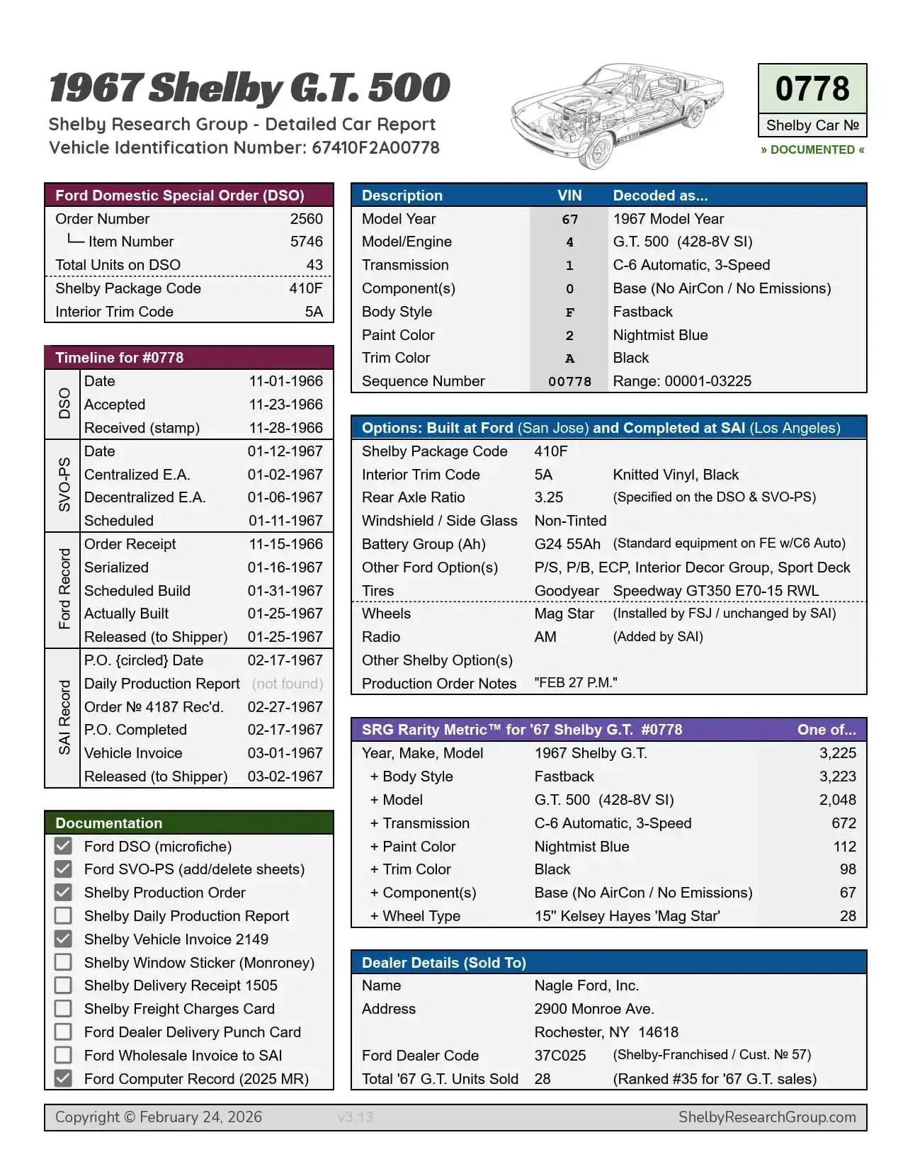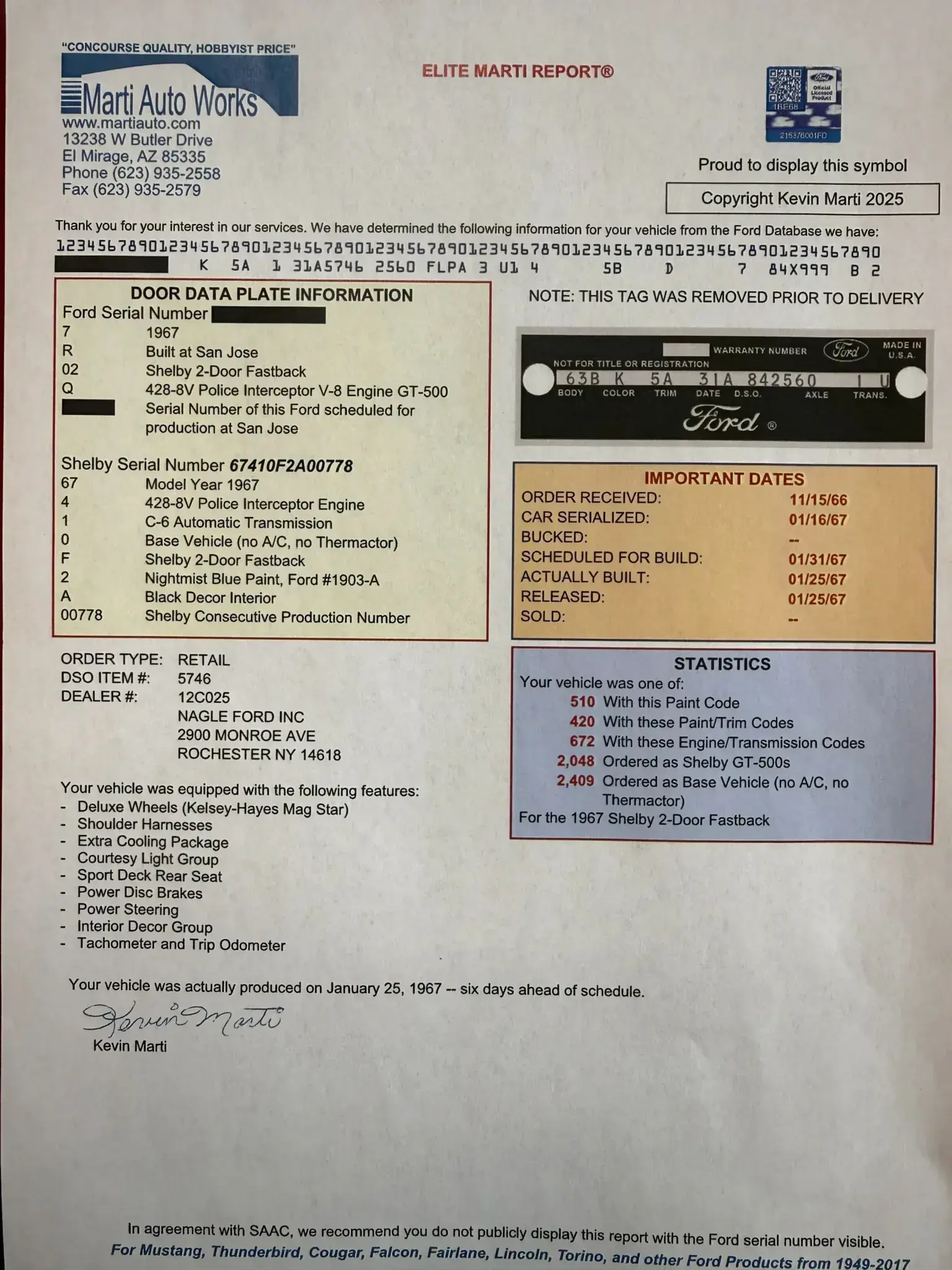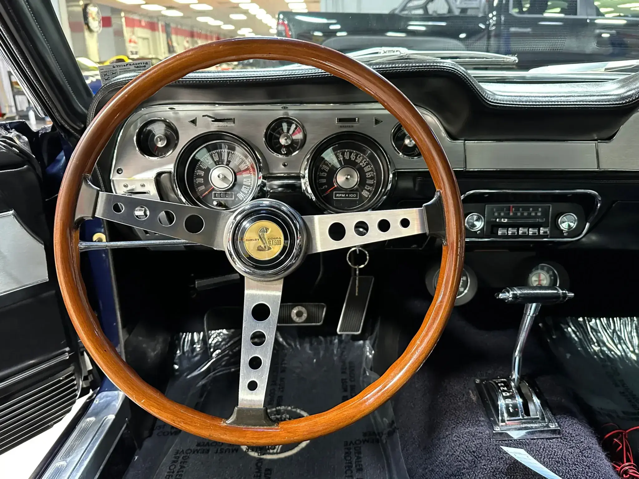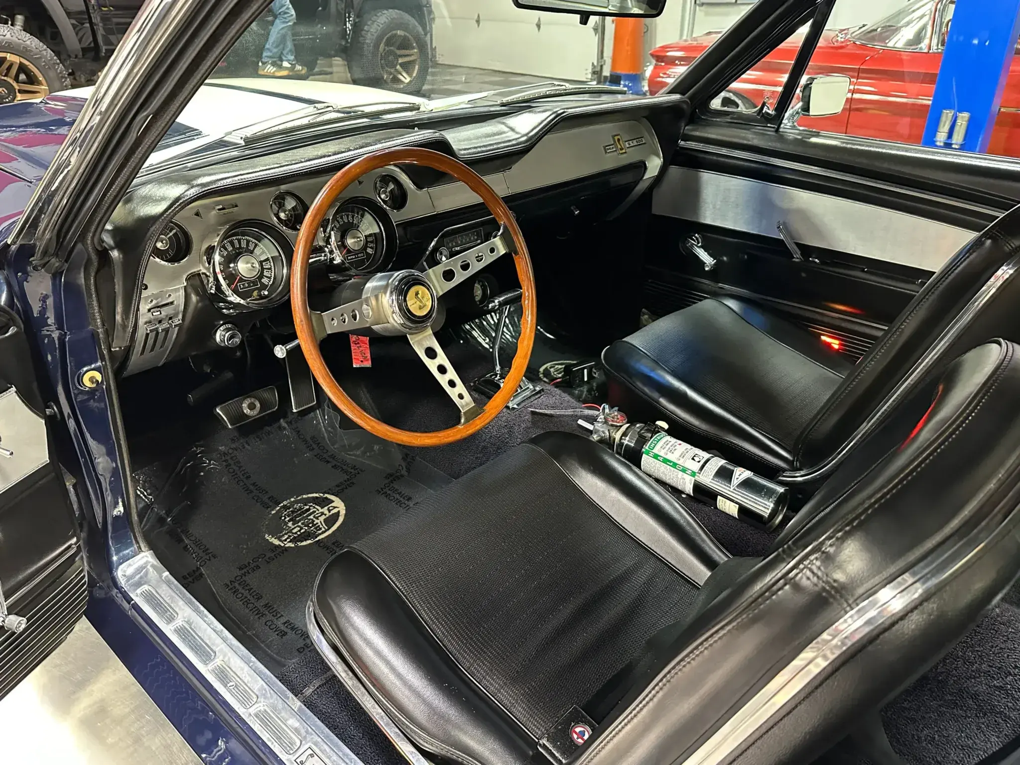 MaxMotive is proud to present this outstanding early production 1967 Shelby GT500 Fastback. The correct and highly esteemed 428ci Police Interceptor V8 engine was rebuilt, blueprinted, and dyno tested by Evanuik Performance. Helpful data like cam specs, plus cylinder head, valve train, block, crank and oil system specs are provided as well. On top are two 650cfm Holleys and it is dressed with the coveted finned aluminum Cobra LeMans valve covers and Cobra dual carb air cleaner. The entire car was lovingly restored over a 3-year period and completed in 1991. The engine rebuild was done in 2010 and the car has been driven about 3755 miles since. The top tier drivetrain features the rugged C6 automatic transmission and legendary 9-inch Ford rear axle. Restoration photos are included. As an early production model, it sports the distinctive inboard hi-beams, and along with the Nightmist Blue exterior paint, white LeMans stripes, and distinctive Kelsey-Hays Mag Star 10-spoke aluminum wheels, the car simply exudes Shelby-ness, and it is just gorgeous! In fact, the signature of Carroll Shelby himself is proudly displayed on the passenger sun visor. Once inside, you will also find a 140mph speedometer, 8000rpm tack, Shelby/SW auxiliary gauges, and even a fully functional analog clock It comes with build and service receipts documenting the quality of the work and care that has been lavished on this special car. Please look over the photos and details at maxmotive.com.This car also comes with an Elite Marti Report and a Mag report that verifies the credentials of this amazing car!