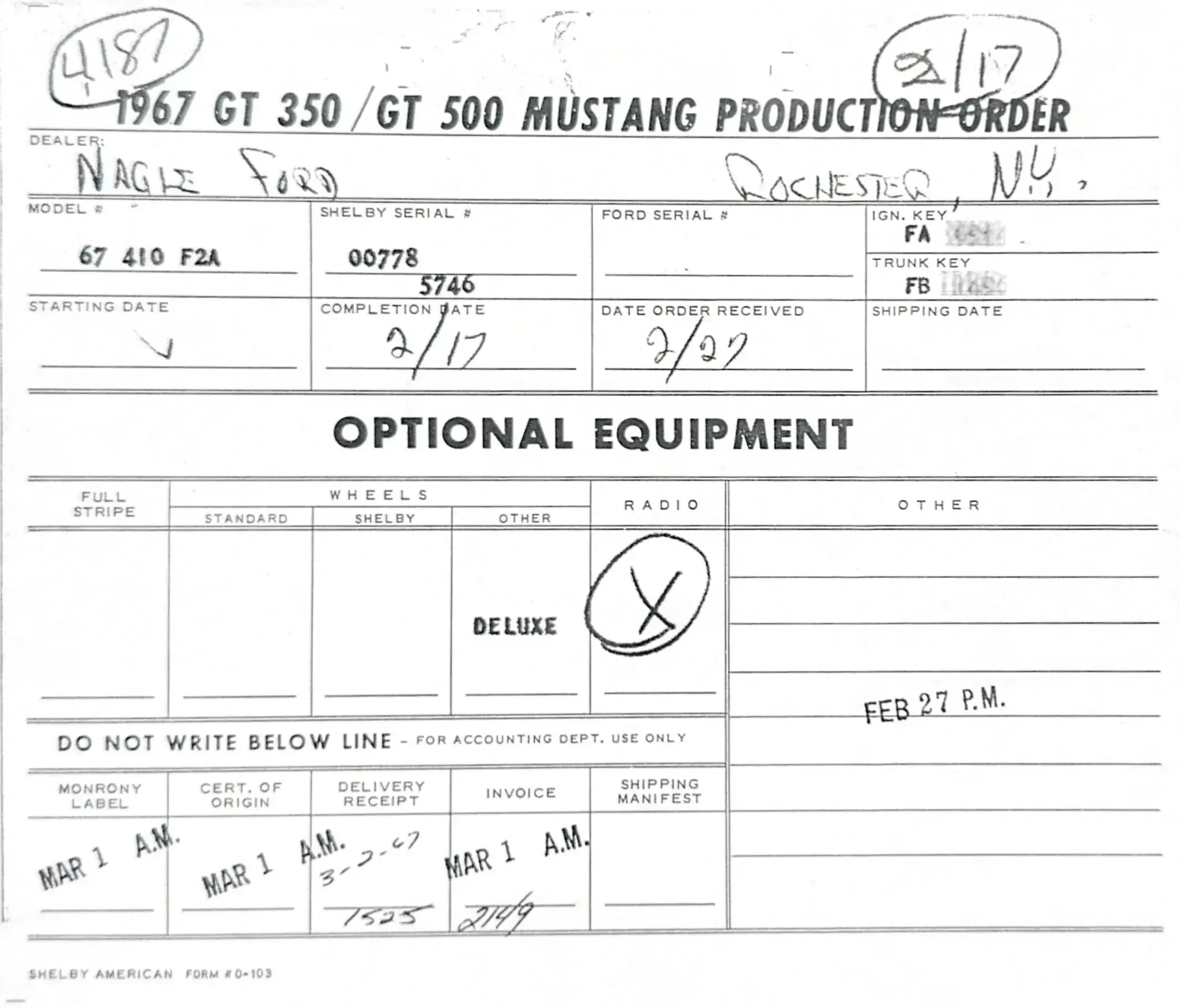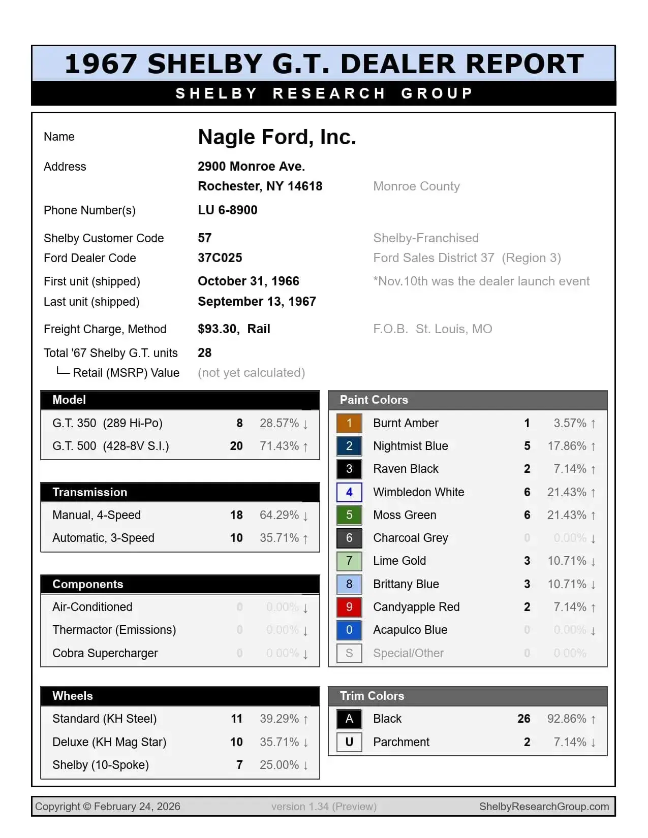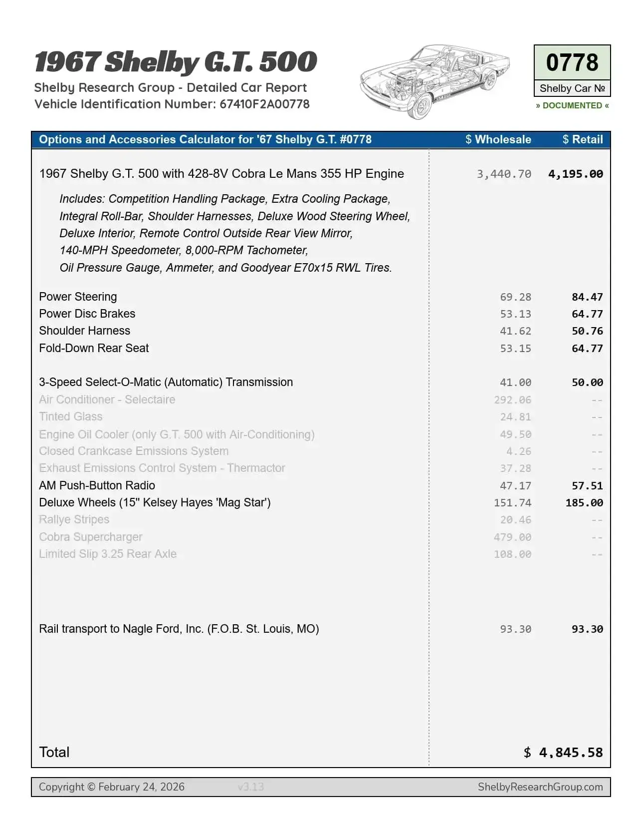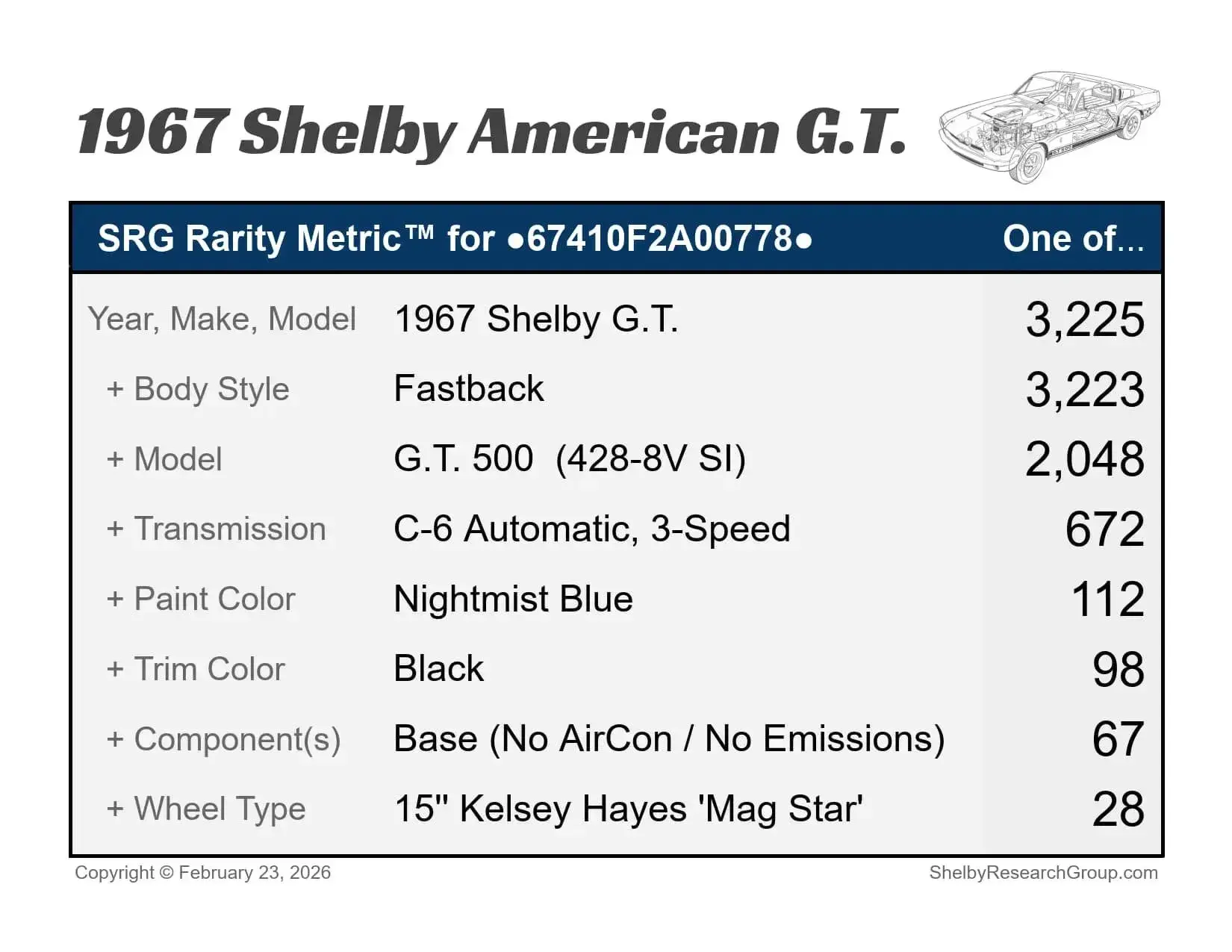 MaxMotive is proud to present this outstanding early production 1967 Shelby GT500 Fastback. The correct and highly esteemed 428ci Police Interceptor V8 engine was rebuilt, blueprinted, and dyno tested by Evanuik Performance. Helpful data like cam specs, plus cylinder head, valve train, block, crank and oil system specs are provided as well. On top are two 650cfm Holleys and it is dressed with the coveted finned aluminum Cobra LeMans valve covers and Cobra dual carb air cleaner. The entire car was lovingly restored over a 3-year period and completed in 1991. The engine rebuild was done in 2010 and the car has been driven about 3755 miles since. The top tier drivetrain features the rugged C6 automatic transmission and legendary 9-inch Ford rear axle. Restoration photos are included. As an early production model, it sports the distinctive inboard hi-beams, and along with the Nightmist Blue exterior paint, white LeMans stripes, and distinctive Kelsey-Hays Mag Star 10-spoke aluminum wheels, the car simply exudes Shelby-ness, and it is just gorgeous! In fact, the signature of Carroll Shelby himself is proudly displayed on the passenger sun visor. Once inside, you will also find a 140mph speedometer, 8000rpm tack, Shelby/SW auxiliary gauges, and even a fully functional analog clock It comes with build and service receipts documenting the quality of the work and care that has been lavished on this special car. Please look over the photos and details at maxmotive.com.This car also comes with an Elite Marti Report and a Mag report that verifies the credentials of this amazing car!
