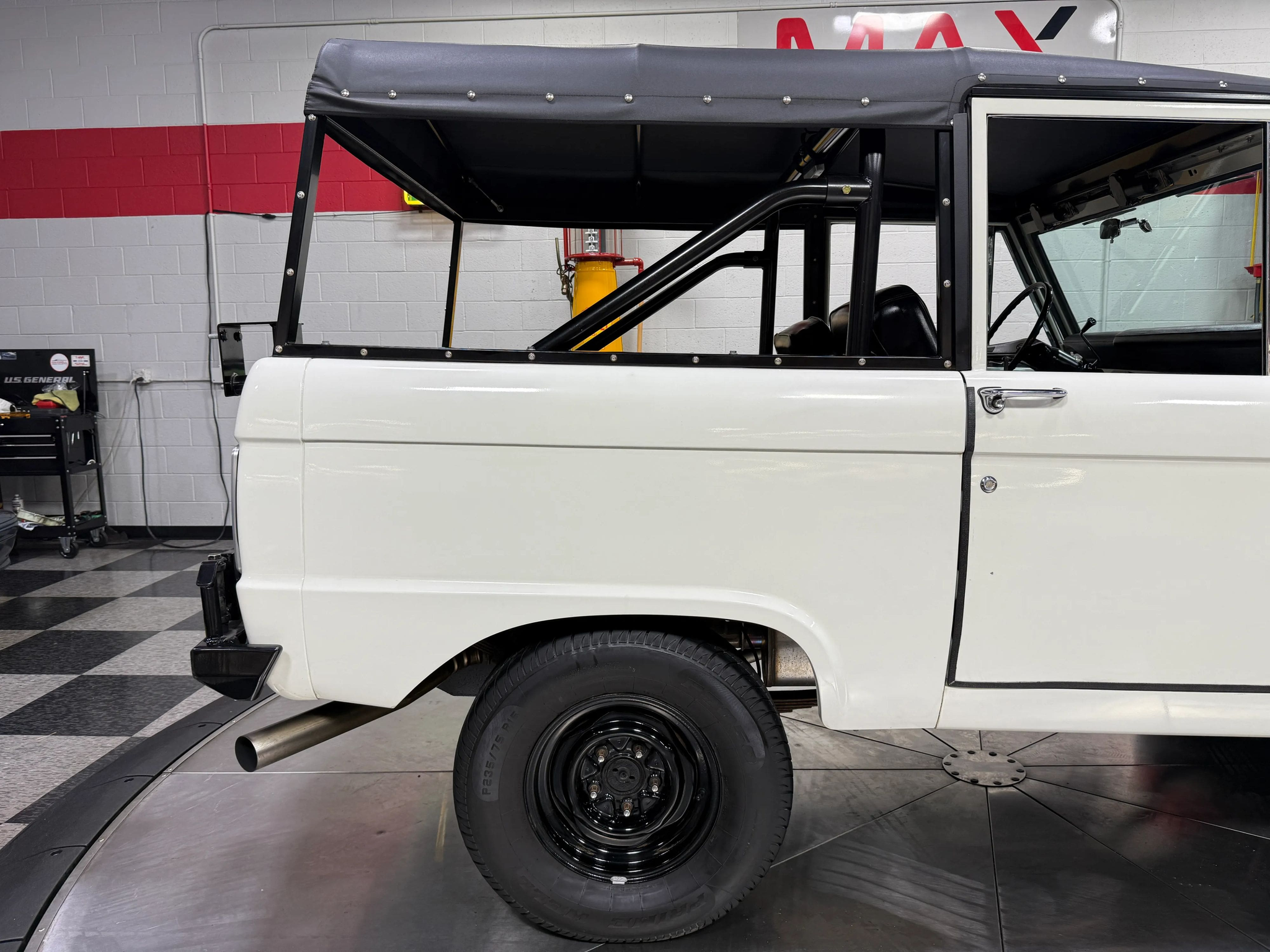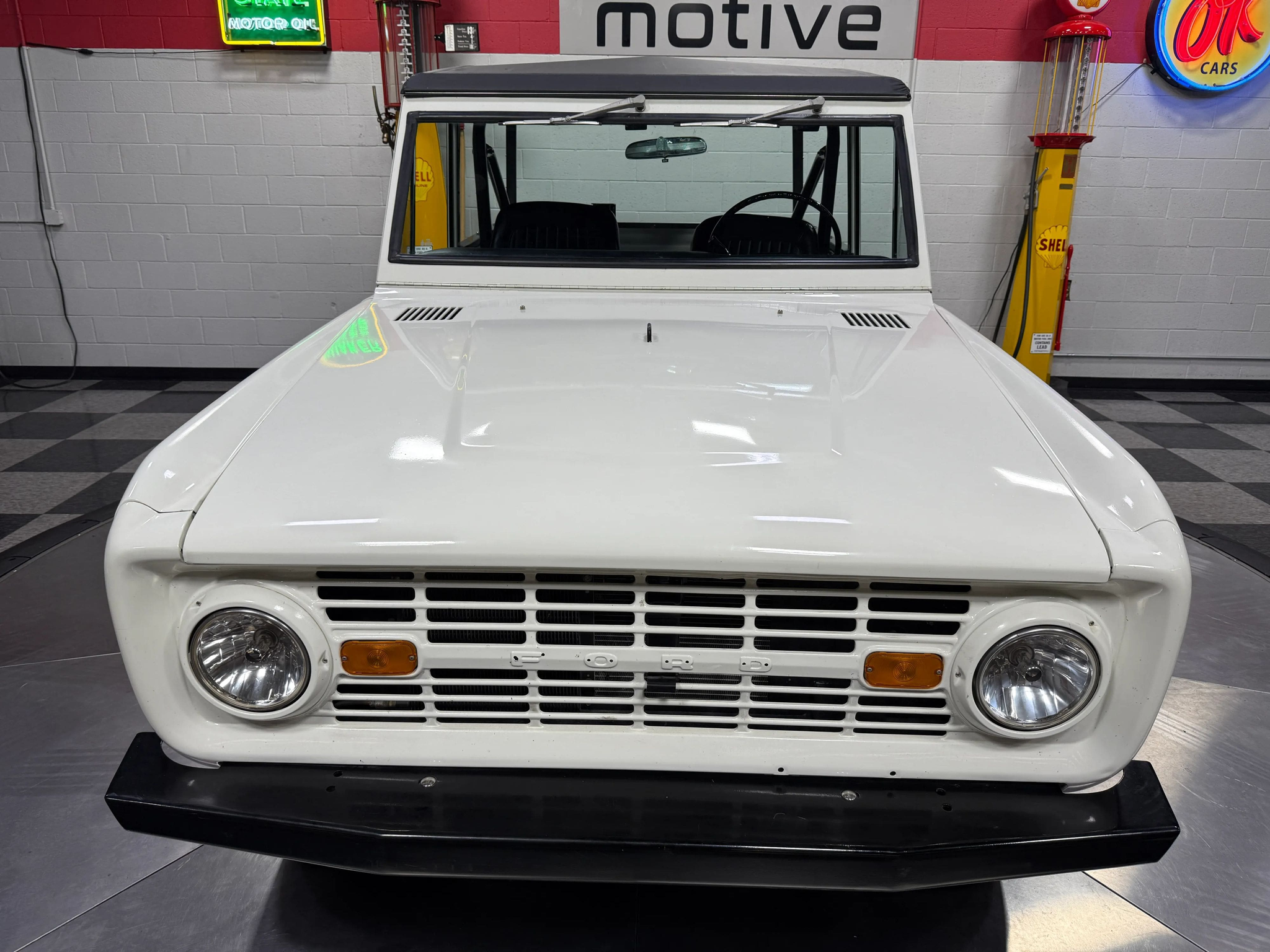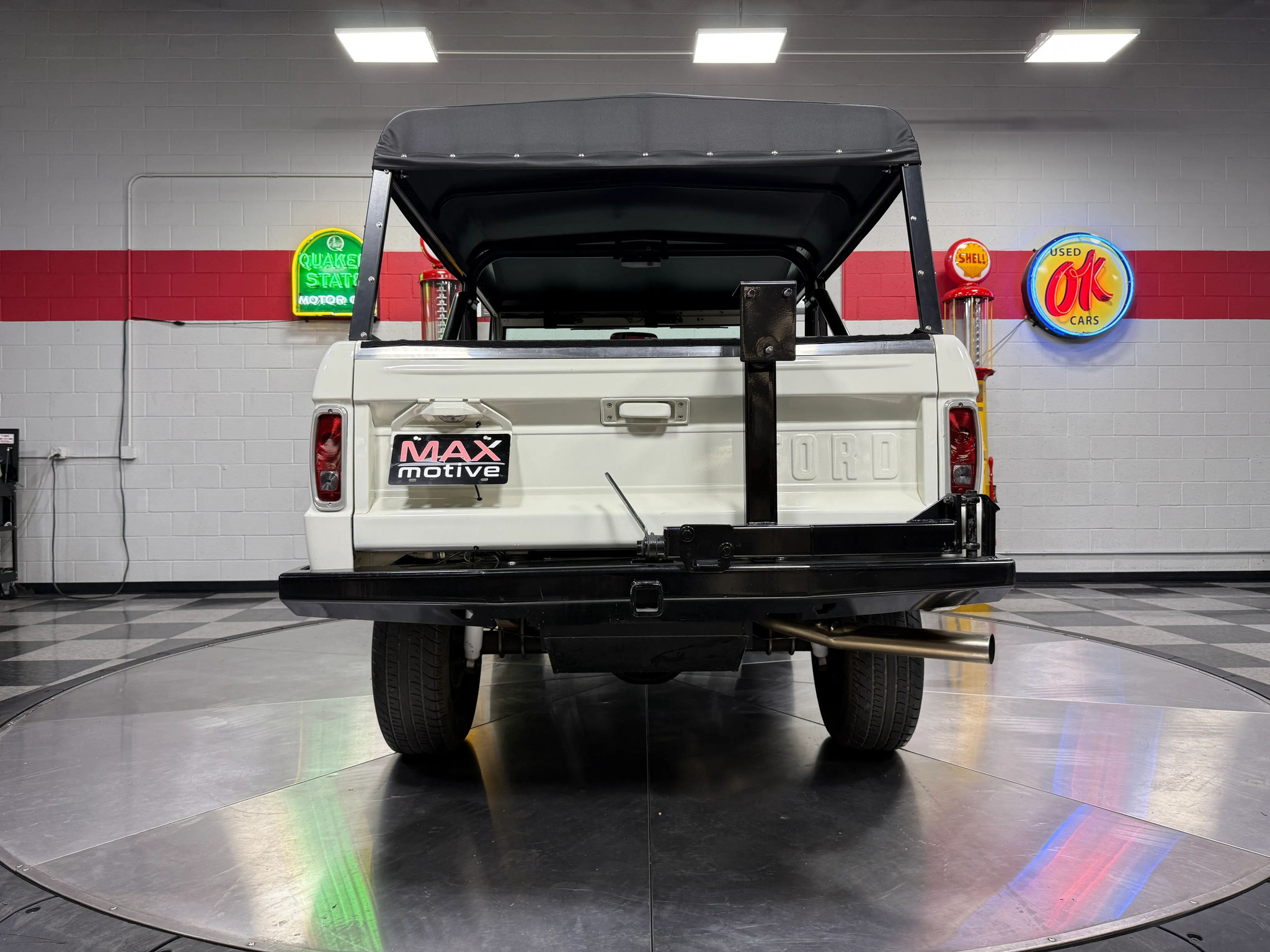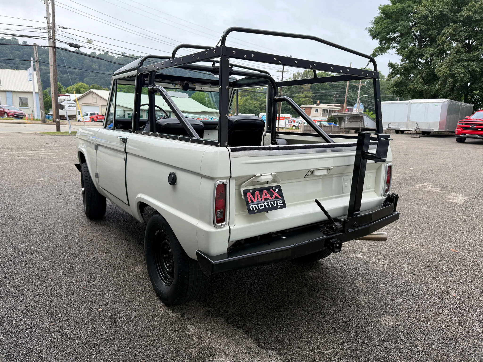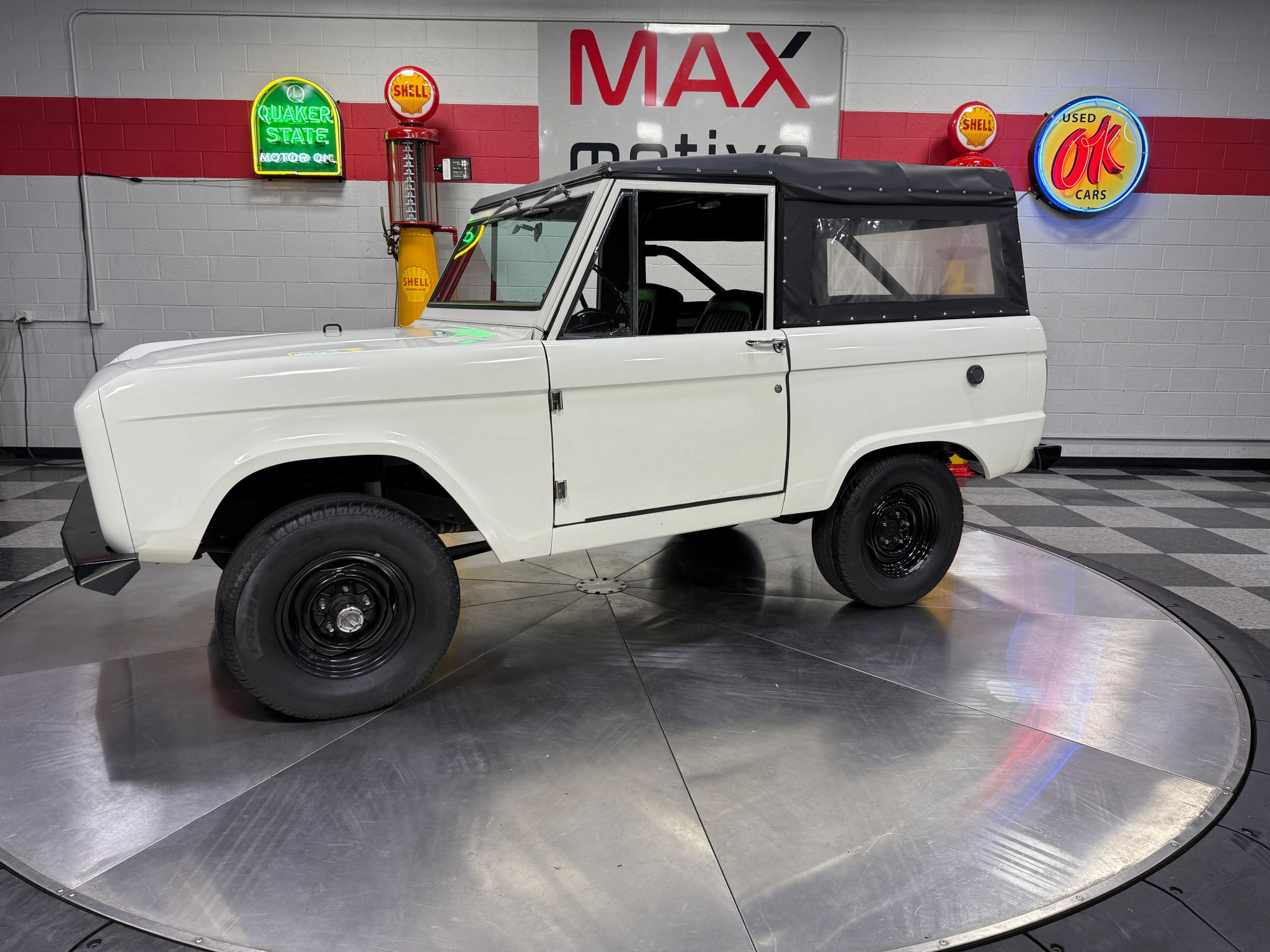 Maxmotive is pleased to offer this stunning, rugged, ready to turn heads 1968 Bronco. This Bronco has received a nice boost in horsepower from the Foxbody 5.0 V-8 engine that was swapped in from a 1989 Mustang. The top end of the engine was gone over prior to install, and shorty headers were added to ensure optimal performance and sound. Speaking of engine sound, the engine proudly rumbles through a Magnaflow muffler. Under the hood, an upgraded aluminum radiator makes sure that 5.0 engine stays nice and cool. The soft top is new, within the last 18 months. The inside rear wheel wells were texture sprayed in matching white paint. Heavy duty aftermarket bumpers front and rear, with a matching heavy duty fifth wheel spare in the back of the Bronco. New and updated front wiper motor system, Retrosound aftermarket radio, and aftermarket speakers make sure driving the Bronco is just as enjoyable as staring at the Bronco. The front driveshaft is not installed currently, so the Bronco is currently set up as a two wheel drive Bronco. For more pictures and information, please visit our website www.maxmotive.com