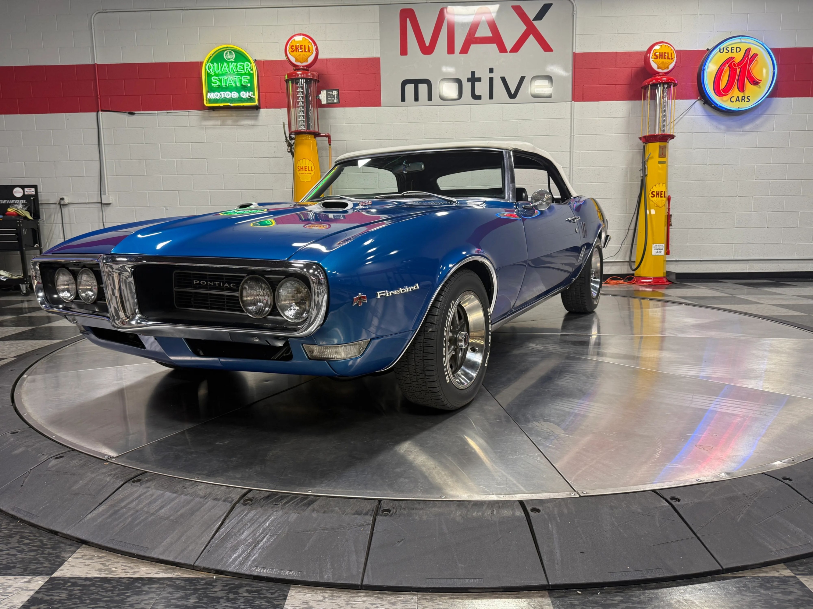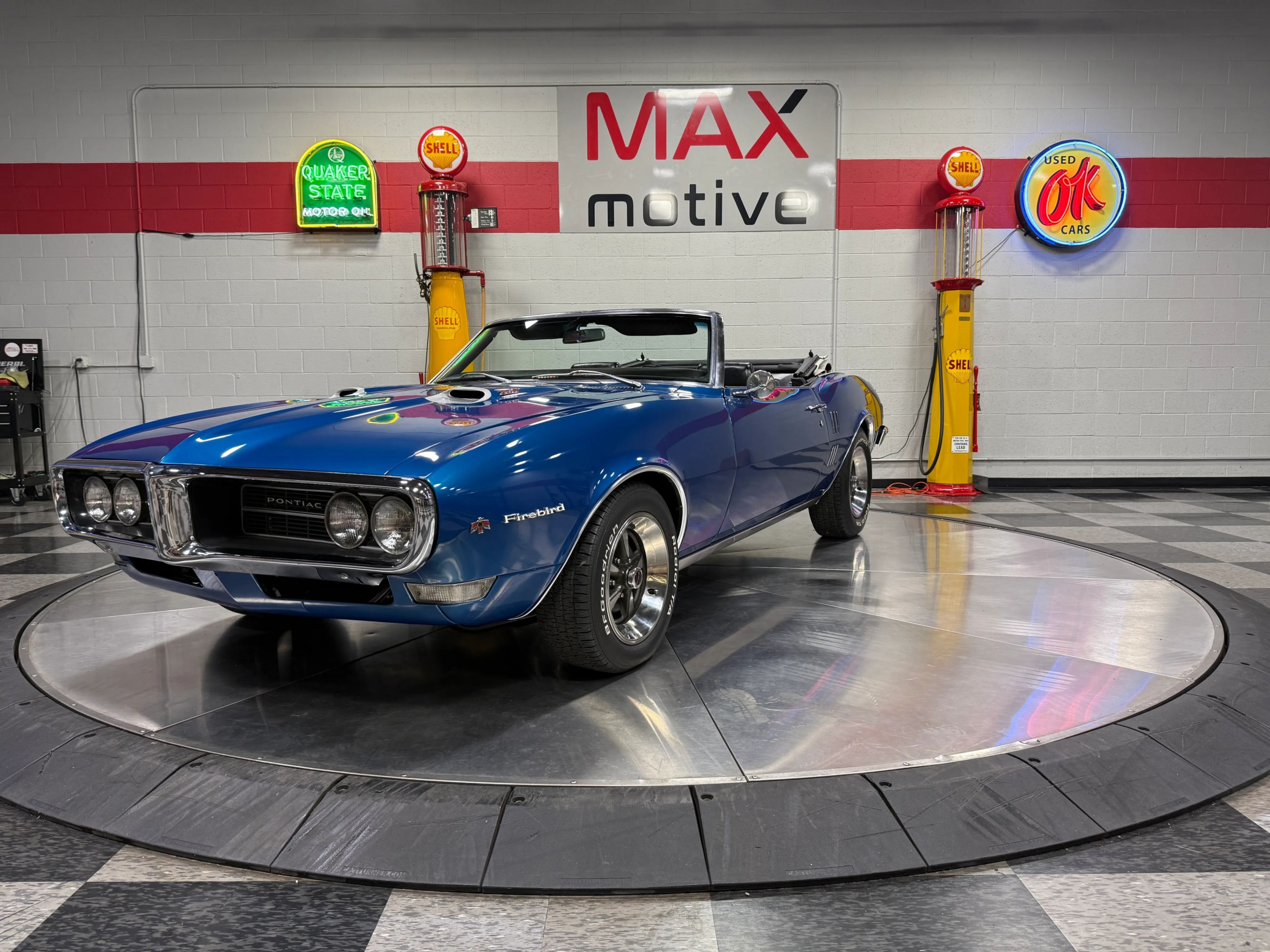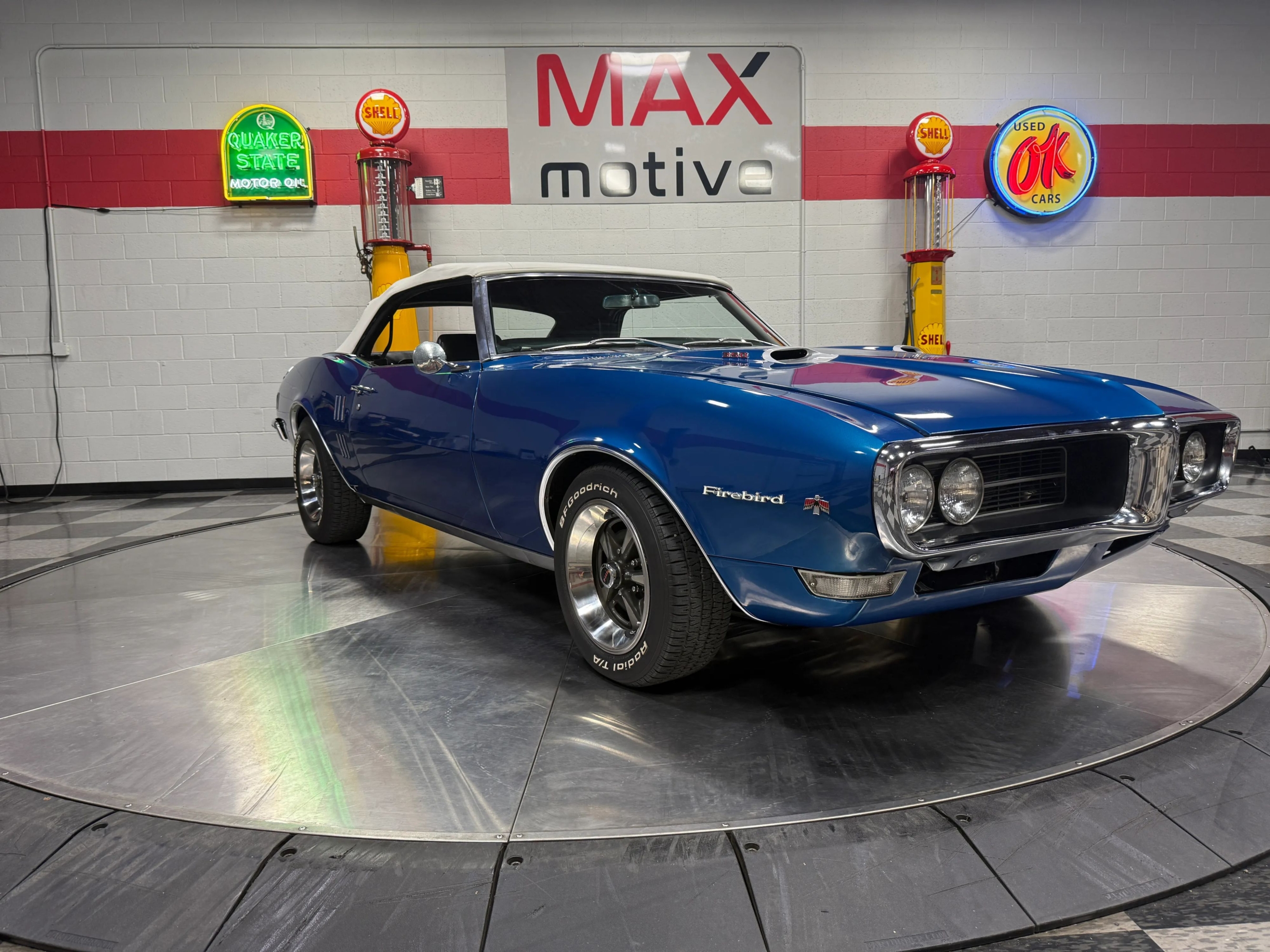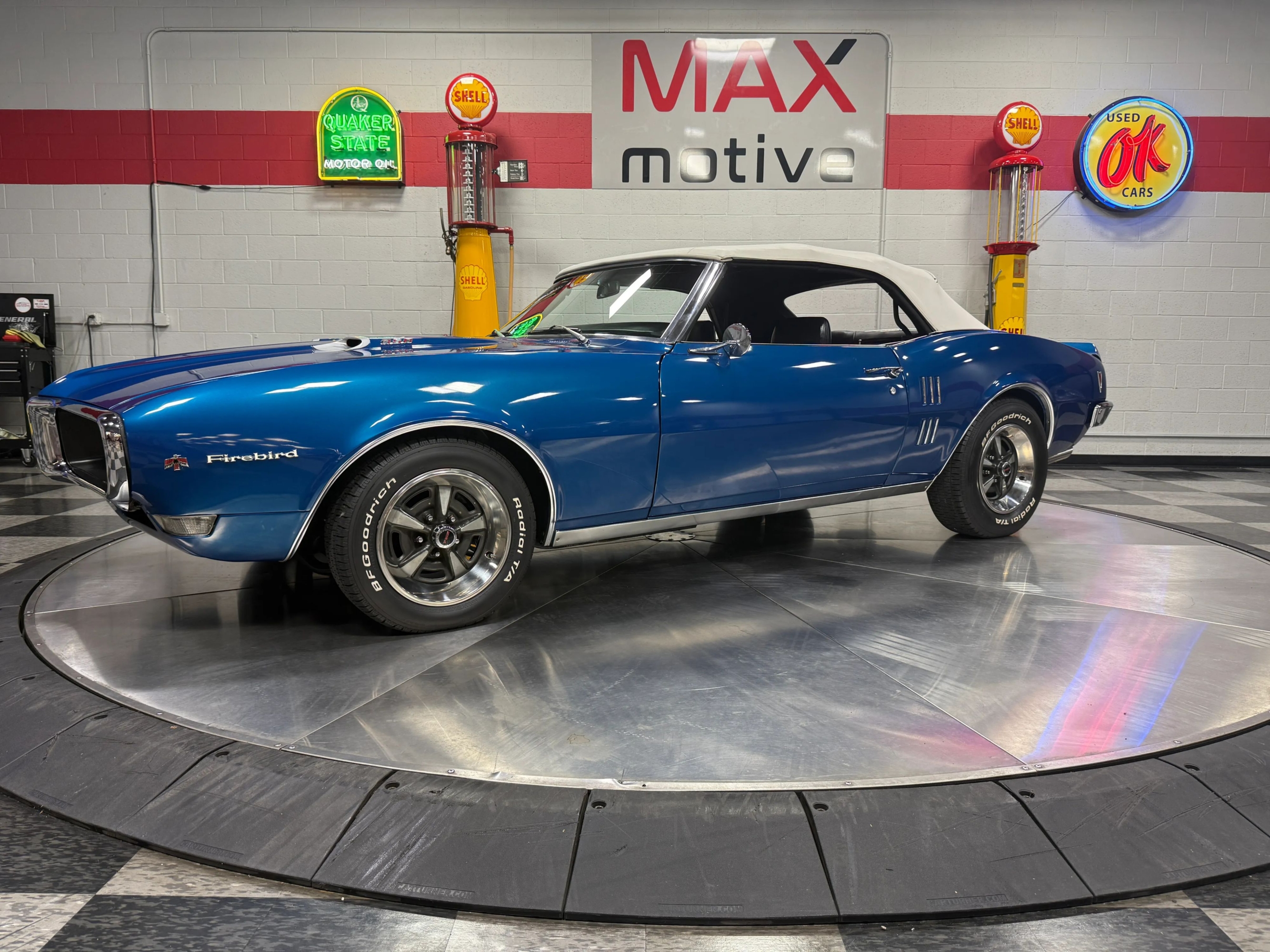 Maxmotive is proud to offer this stunning 1968 Firebird convertible. The current owner has been the caretaker of this classic since 2011. The Firebird has been impeccably cared for, with all sorts of documentation to back up the work. The documentation and receipts on this Firebird are immense, please contact us and we will be happy to share them with you. The body was stripped down, convertible top removed, and once the body work was completed, the Firebird was sprayed a stunning Aqua Blue Metallic. There was a new convertible top added at the same time of the paint and body work. The engine and transmission were removed, rebuilt, and completed in 2024. The original engine block (per the owner) was bored over .30. New pistons were paired to a 400 cam. The engine was painted while out as well. The turbo 350 automatic transmission was rebuilt as well at the same time. New long tube headers flow through the Pypes aftermarket mufflers. The underside is just as stunning as the top side. The underside was body worked and painted the same Aqua Blue Metallic as the top side. A new convertible top pump and lines were also added in 2024 at the same time. Aftermarket speakers and radio head unit complete the interior. This lovingly cared for, and beautifully restored Firebird is ready for its next chapter in life. The wiper motor can be inconsistent, and does not always work. Car was never driven in rain. Come in and test drive this beauty, all of the work has been done for you already! Any other pictures, or more info please visit our website www.maxmotive.com