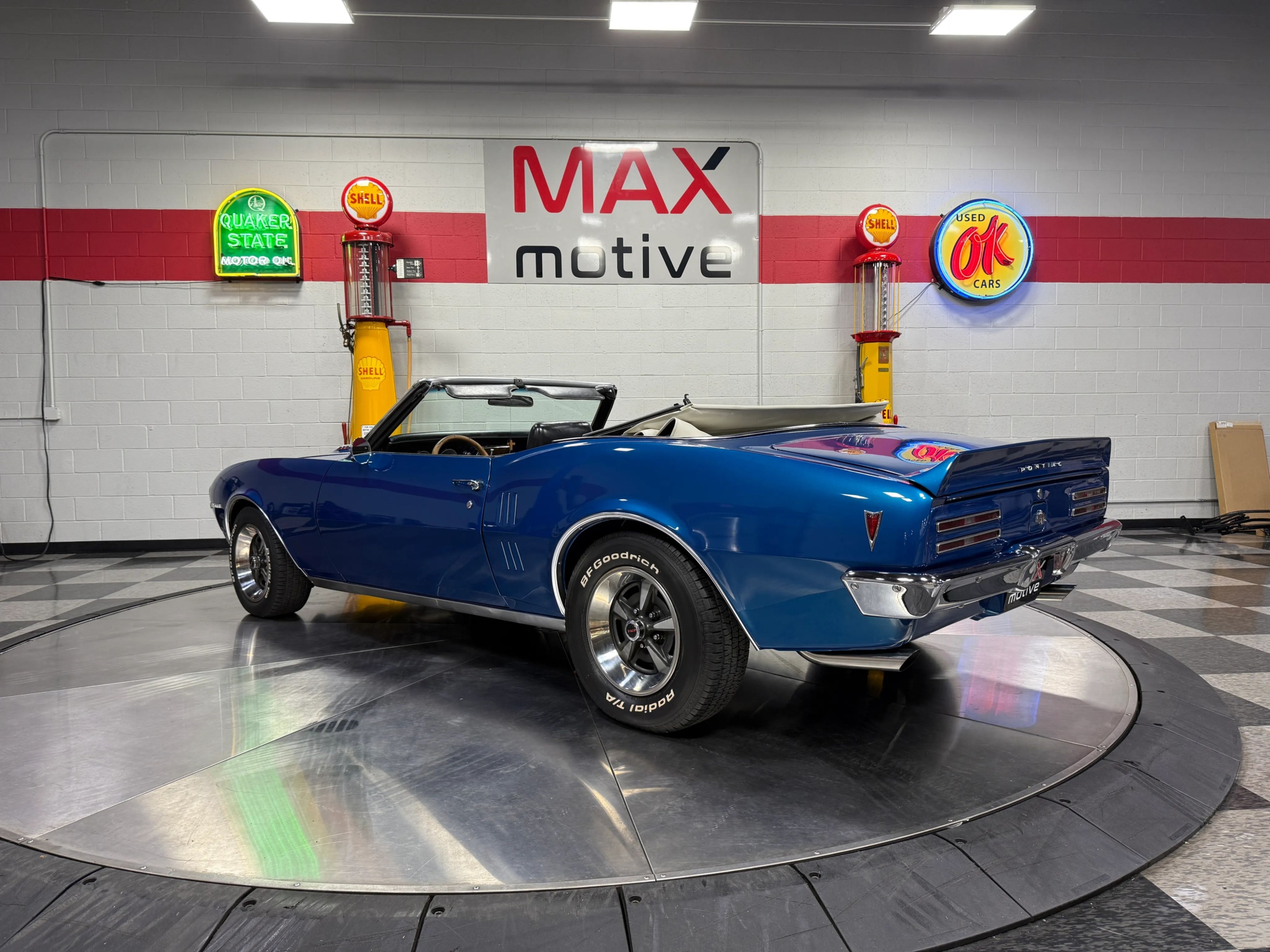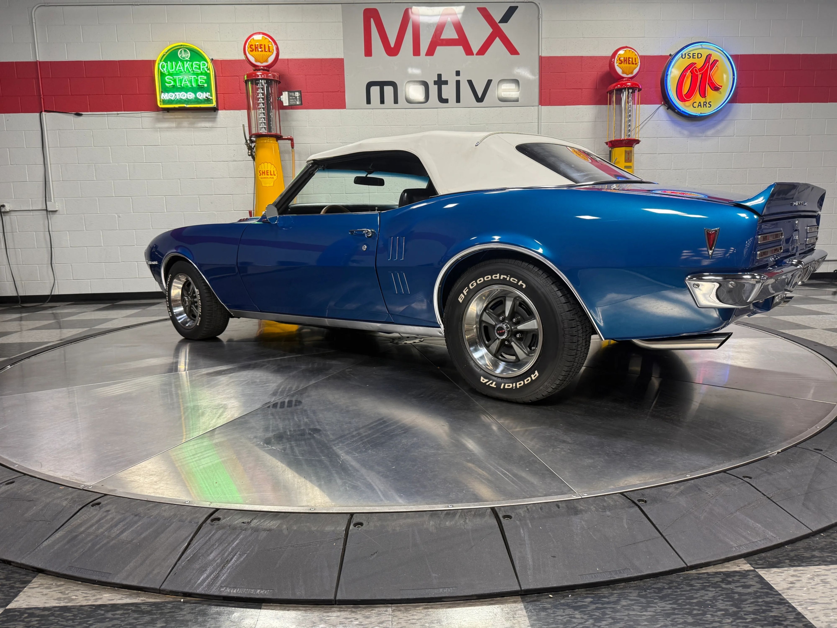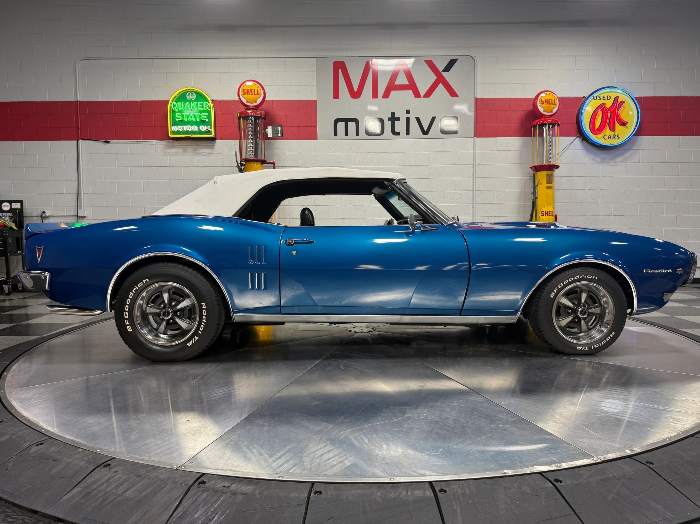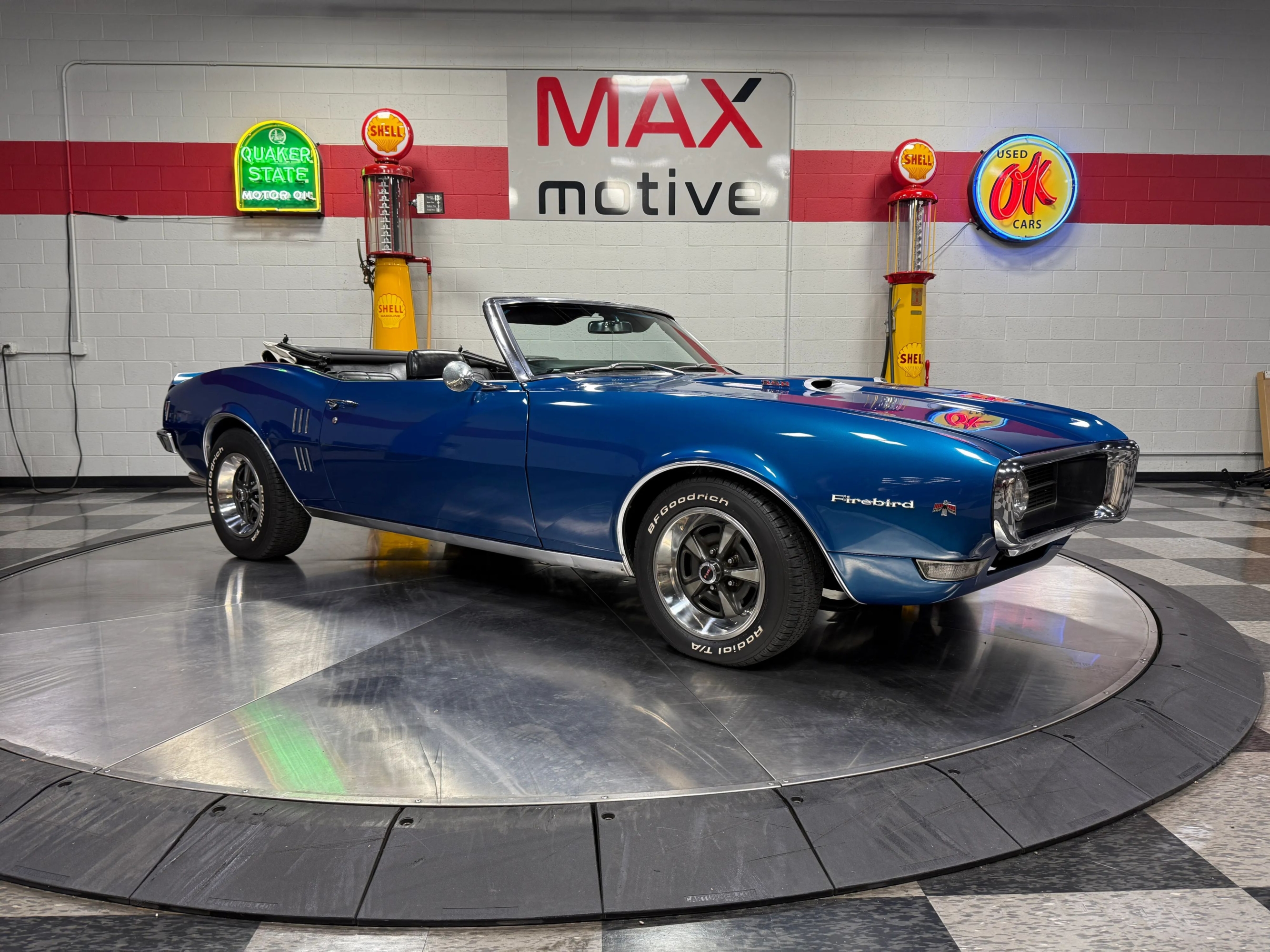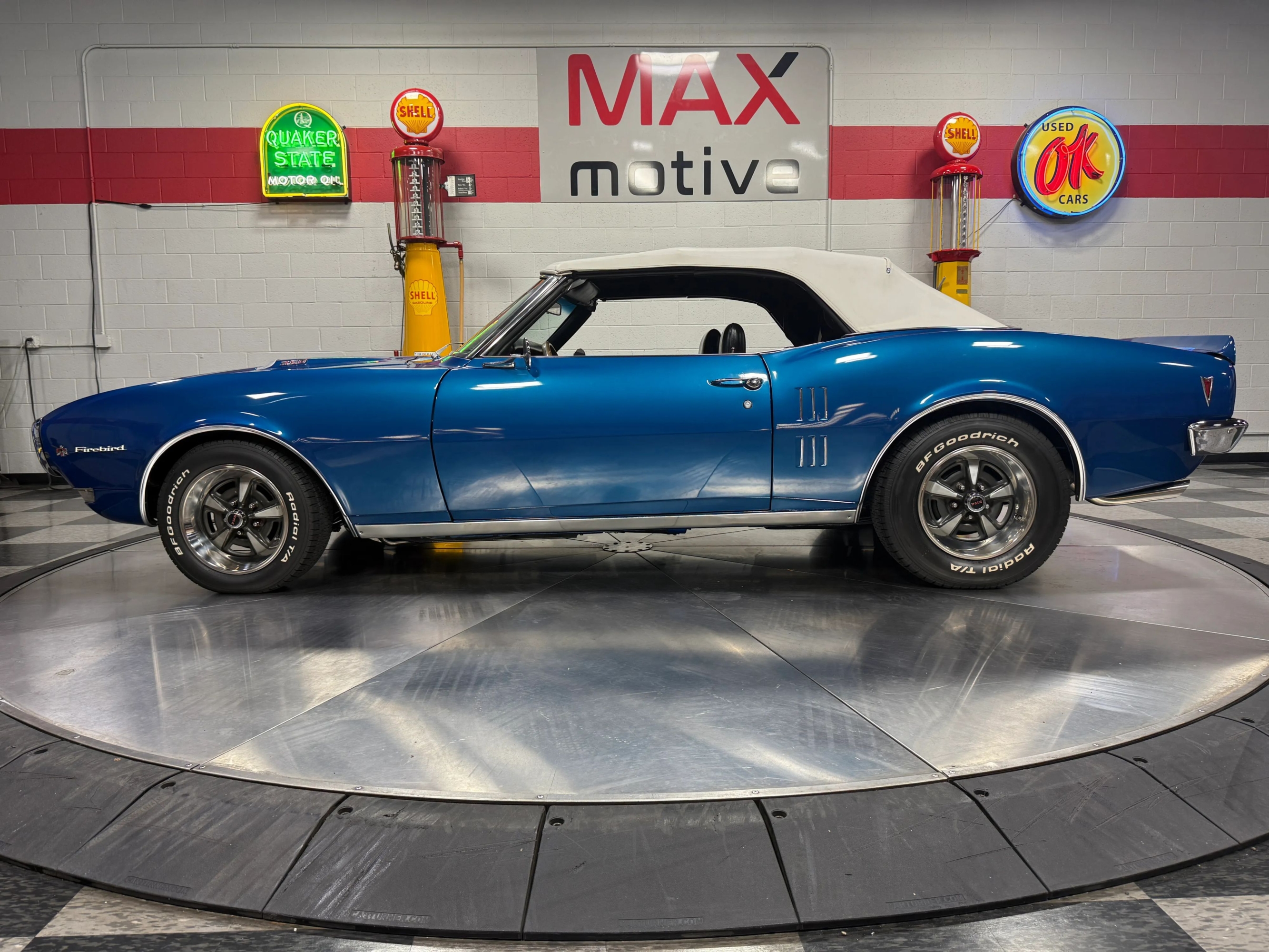 Maxmotive is proud to offer this stunning 1968 Firebird convertible. The current owner has been the caretaker of this classic since 2011. The Firebird has been impeccably cared for, with all sorts of documentation to back up the work. The documentation and receipts on this Firebird are immense, please contact us and we will be happy to share them with you. The body was stripped down, convertible top removed, and once the body work was completed, the Firebird was sprayed a stunning Aqua Blue Metallic. There was a new convertible top added at the same time of the paint and body work. The engine and transmission were removed, rebuilt, and completed in 2024. The original engine block (per the owner) was bored over .30. New pistons were paired to a 400 cam. The engine was painted while out as well. The turbo 350 automatic transmission was rebuilt as well at the same time. New long tube headers flow through the Pypes aftermarket mufflers. The underside is just as stunning as the top side. The underside was body worked and painted the same Aqua Blue Metallic as the top side. A new convertible top pump and lines were also added in 2024 at the same time. Aftermarket speakers and radio head unit complete the interior. This lovingly cared for, and beautifully restored Firebird is ready for its next chapter in life. The wiper motor can be inconsistent, and does not always work. Car was never driven in rain. Come in and test drive this beauty, all of the work has been done for you already! Any other pictures, or more info please visit our website www.maxmotive.com