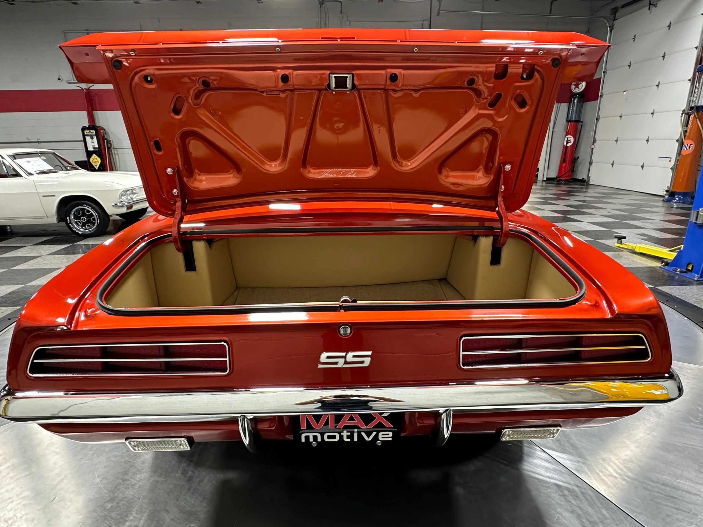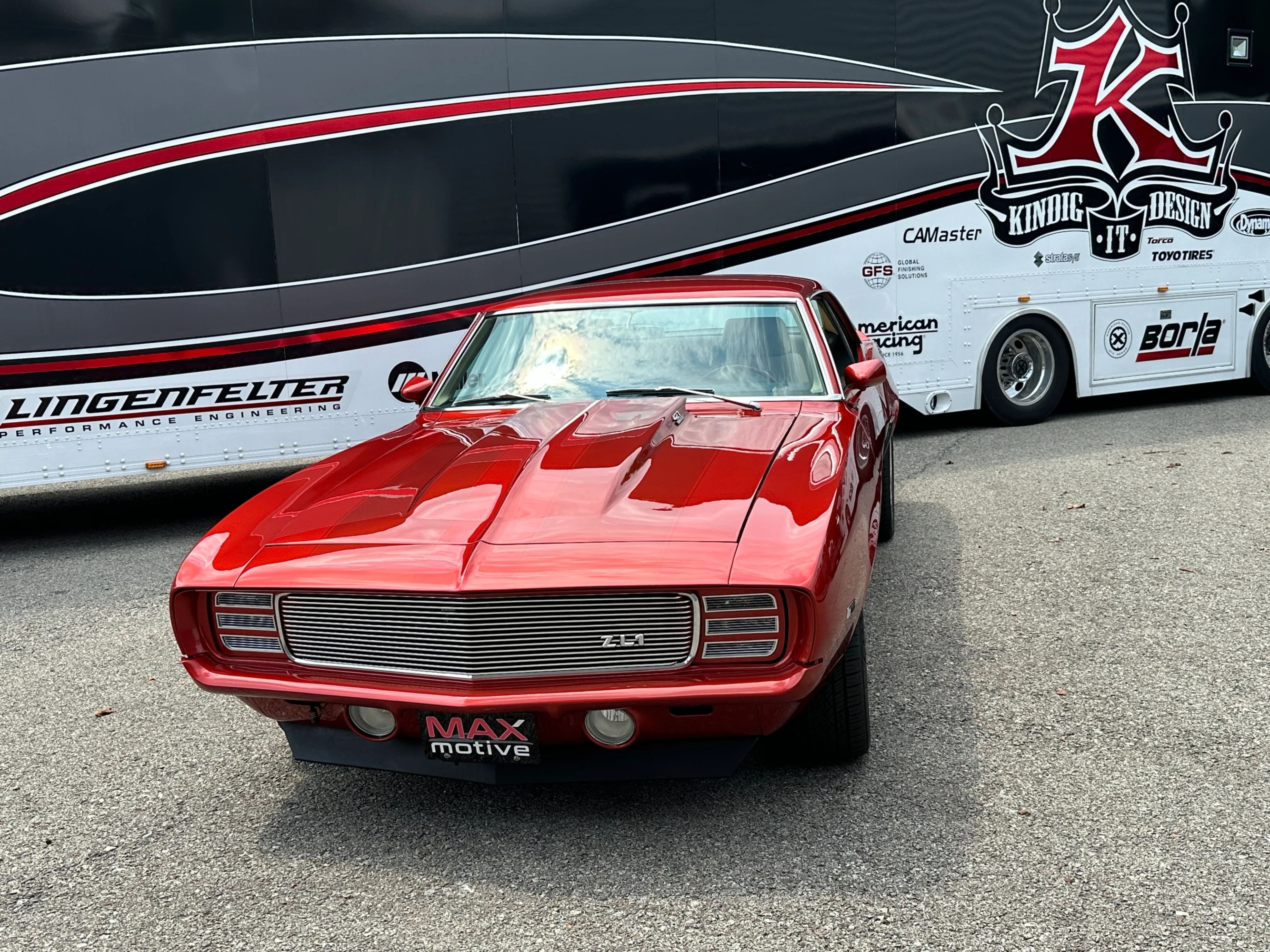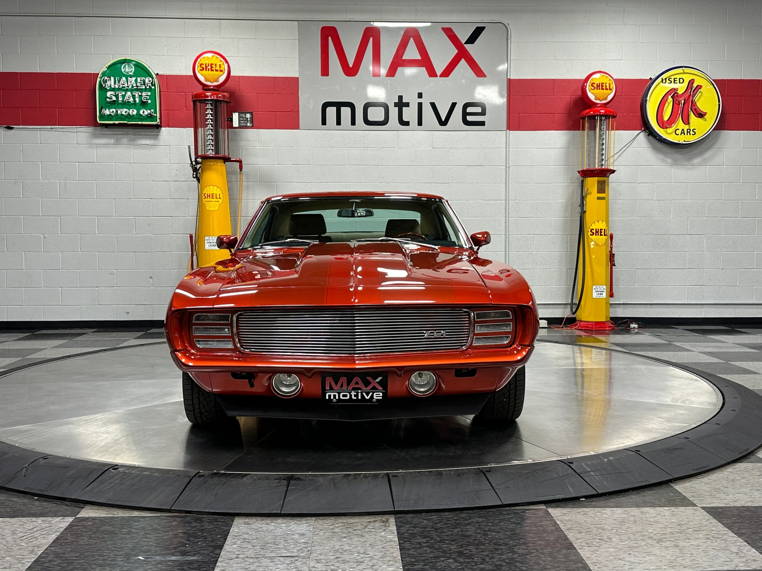 The build effectively combines vintage and modern elements. Up front is a custom grille flanked by the classic RS headlight doors. They operate smoothly thanks to the Detroit Speed door kit. Prowler Orange Pearlcoat paint with ghost graphics and stripes adorns the body while staggered Foose chrome wheels mount Continental ExtremeContact tires. Inside is a handsome tan vinyl interior with custom embroidered seats and custom center console, Specialty power windows, and air conditioning by Vintage Air. The instrument panel maintains the classic Camaro feel, but is packed with Dakota Digital Gauges and a RetroSound radio. Underneath youll find powdercoated frame components and tubular A-arms along with custom exhaust with crossover pipe and Magnaflow mufflers. Bolted in frame connectors reinforce the cars structure and classic Lakewood Traction Action traction bars are dutifully attached to the springs. This 1969 ZL-1 powered Chevrolet Camaro Coupe teams high quality modern components with the very best in classic high performance. Please be sure to see the detailed photos at www.maxmotive.com.
