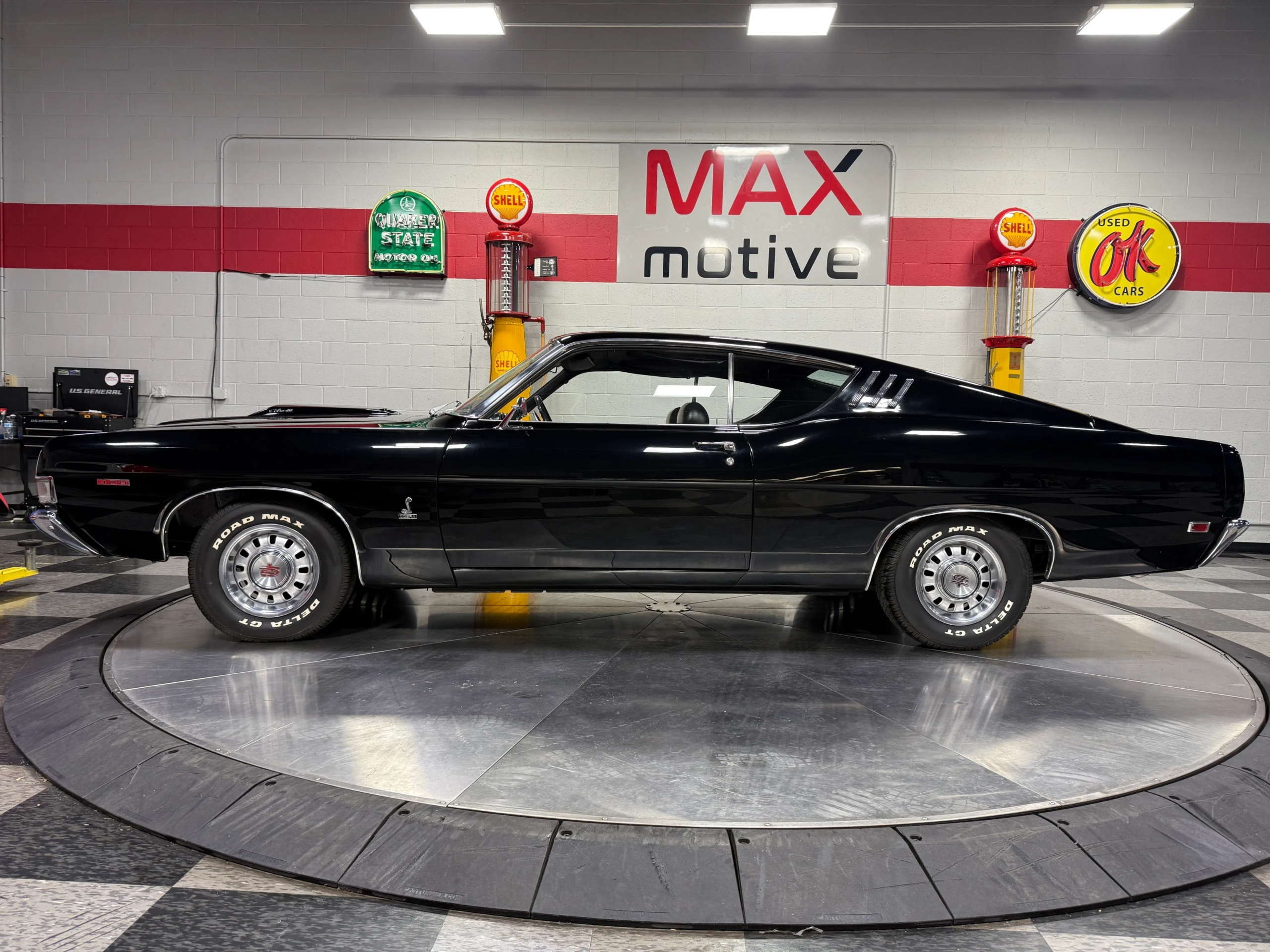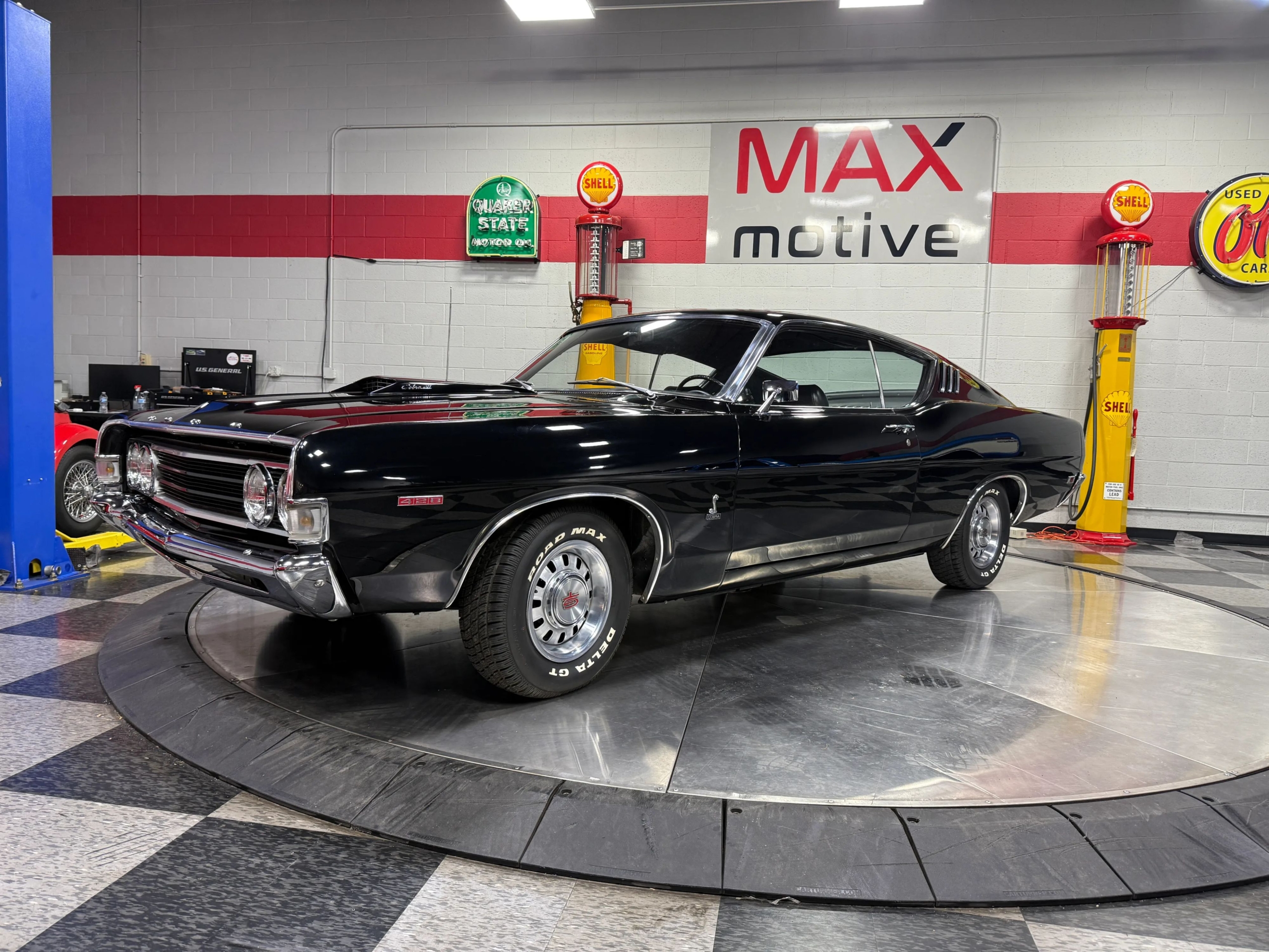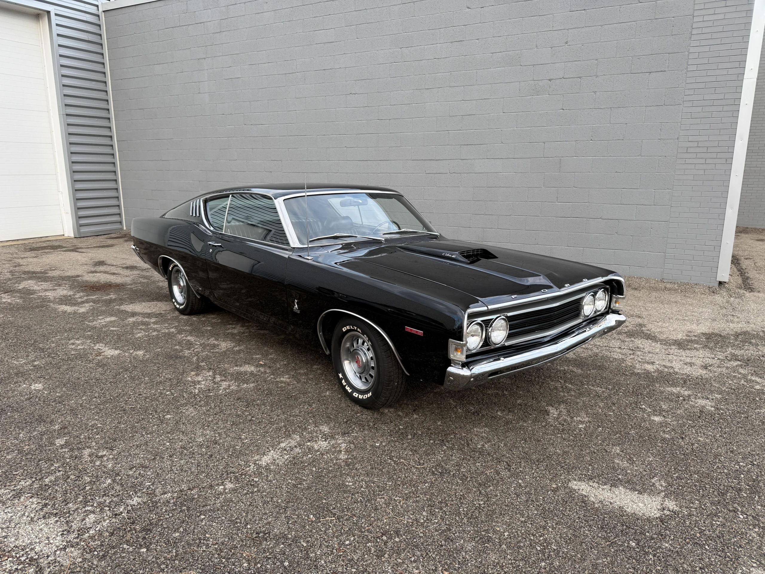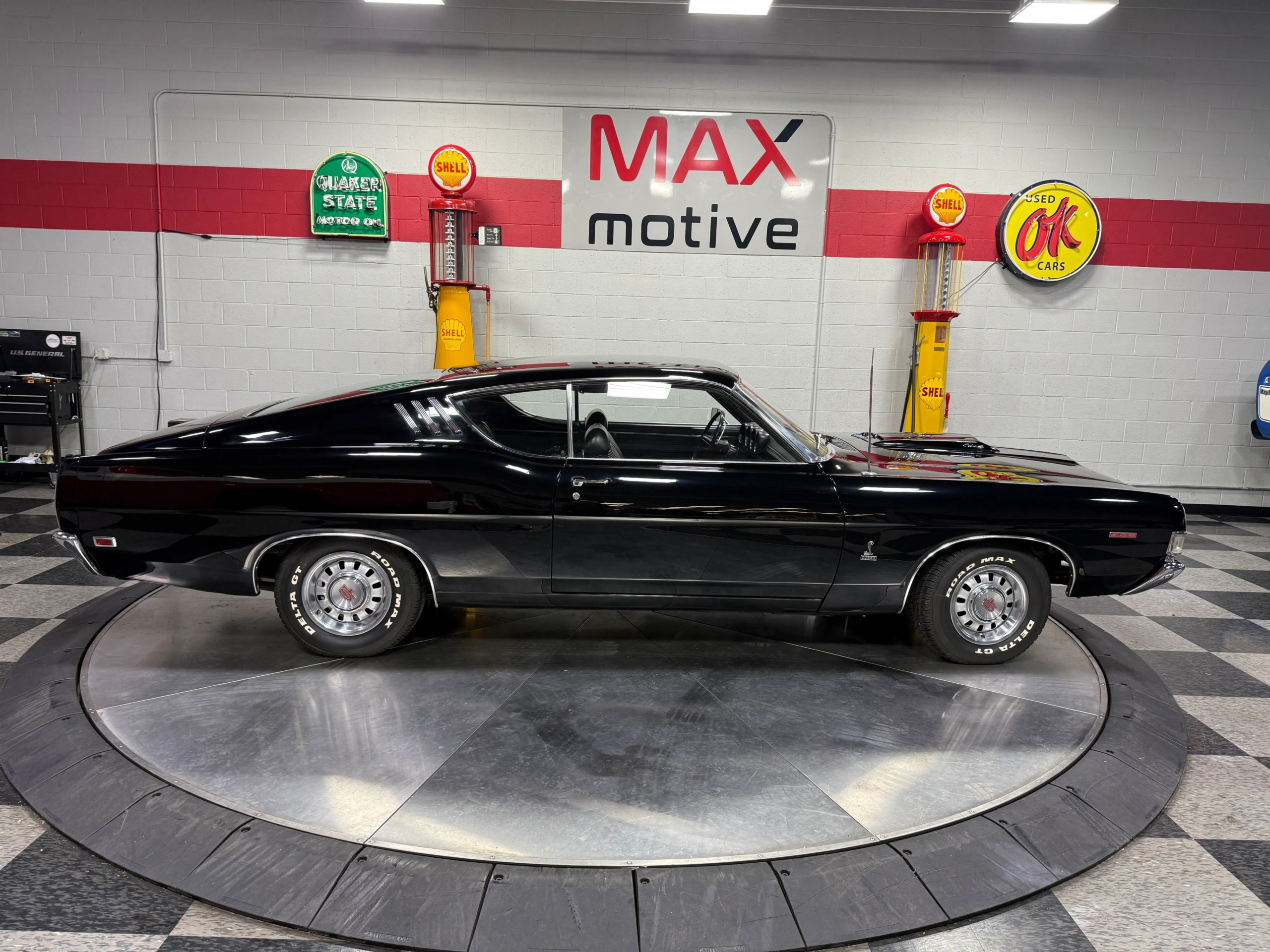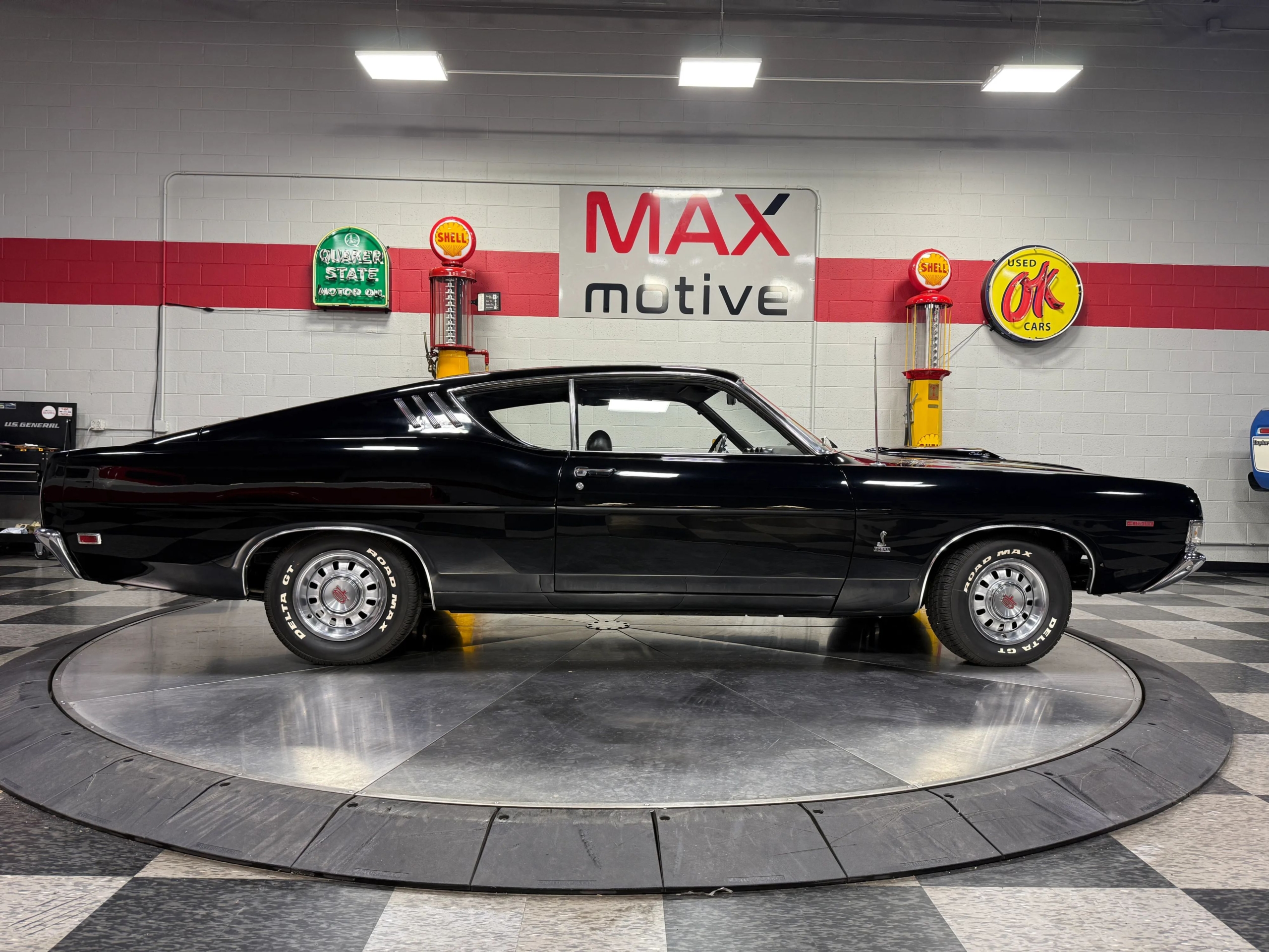 This 1969 Ford Torino Cobra Jet Torino is a formidable example of Detroits ‘Total Performance’ era, blending a sophisticated ‘sleeper’ aesthetic with world-class muscle. Documented by a Marti Report that serves as its factory birth certificate, this Torino maintains its historical integrity while benefiting from a recent, high-quality cosmetic restoration. Under the hood sits the car’s crown jewel: the numbers-matching 428 CI V8 Q-Code engine. Formidably equipped with a Holley 4-barrel carburetor, this legendary powerplant is paired with a 4-speed close-ratio manual transmission, offering a tactile and high-engagement driving experience. Power is sent to the pavement via a 3.25 conventional rear-axle, a versatile gear set that provides a perfect balance between aggressive off-the-line acceleration and comfortable highway cruising. Finished in deep Black Jade, the exterior highlights the Torinos sleek fastback lines, creating a subtle yet menacing presence on the road. The car sits correctly on 14 GT Wheels, completing its period-perfect stance. Inside, the Black interior remains true to its performance roots, offering a no-nonsense, driver-focused cockpit that looks and feels as fresh as it did in 1969.
