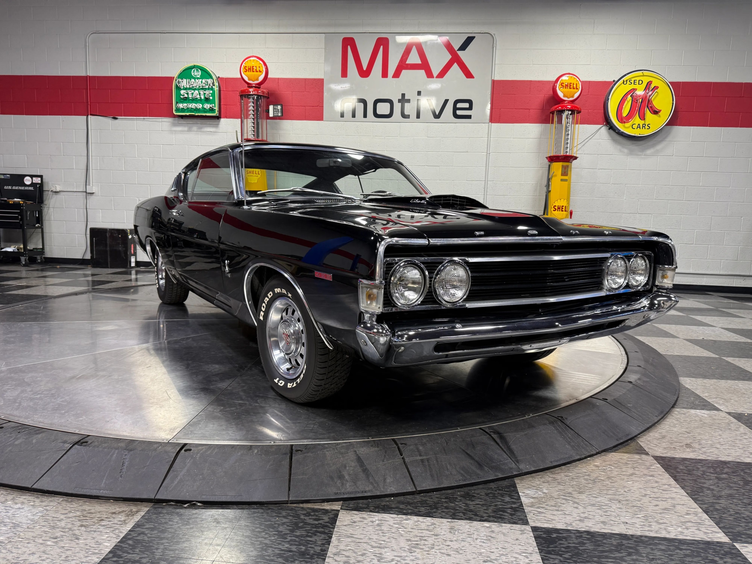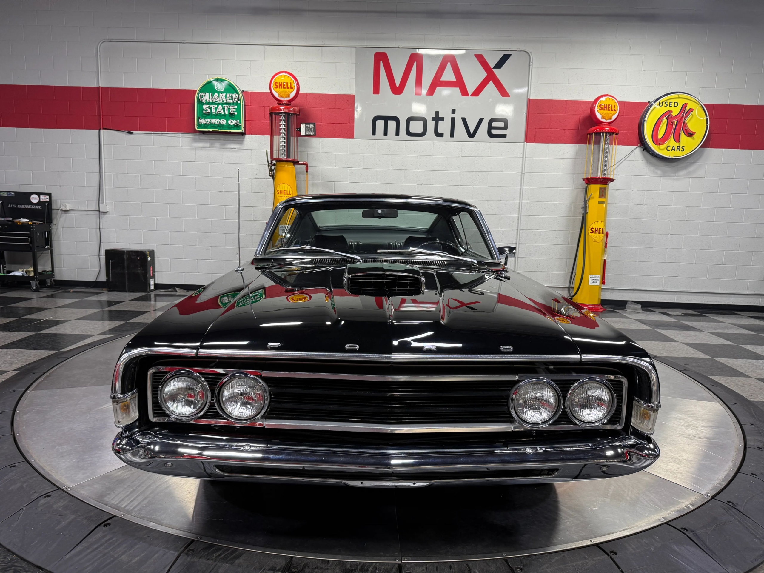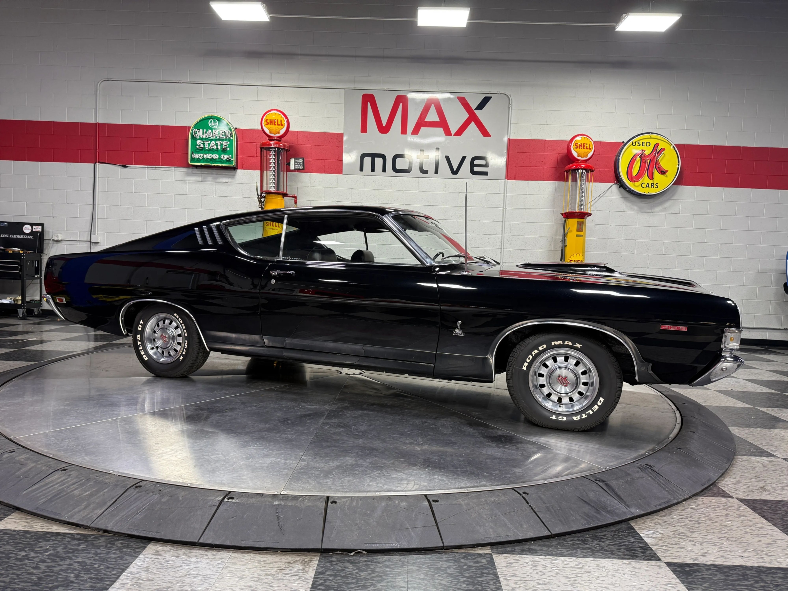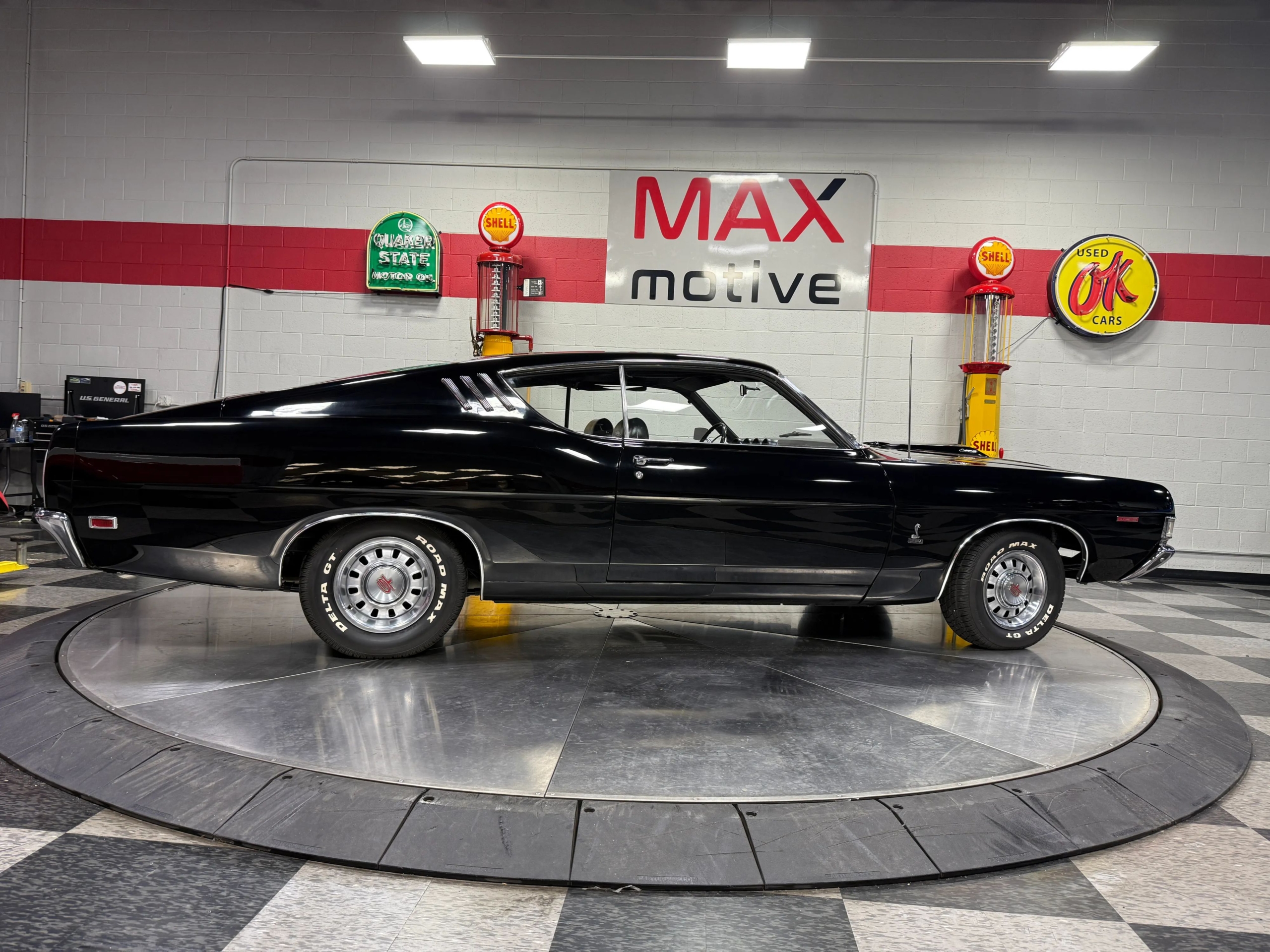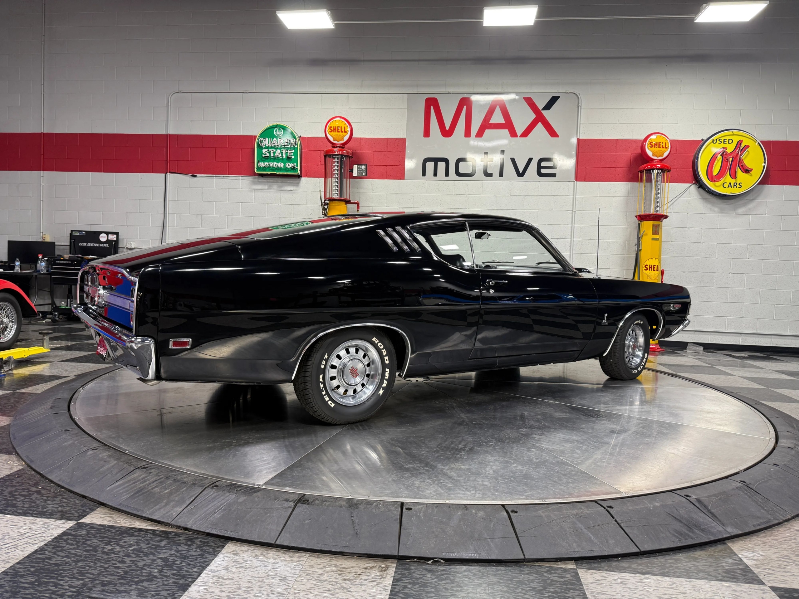 This 1969 Ford Torino Cobra Jet Torino is a formidable example of Detroits ‘Total Performance’ era, blending a sophisticated ‘sleeper’ aesthetic with world-class muscle. Documented by a Marti Report that serves as its factory birth certificate, this Torino maintains its historical integrity while benefiting from a recent, high-quality cosmetic restoration. Under the hood sits the car’s crown jewel: the numbers-matching 428 CI V8 Q-Code engine. Formidably equipped with a Holley 4-barrel carburetor, this legendary powerplant is paired with a 4-speed close-ratio manual transmission, offering a tactile and high-engagement driving experience. Power is sent to the pavement via a 3.25 conventional rear-axle, a versatile gear set that provides a perfect balance between aggressive off-the-line acceleration and comfortable highway cruising. Finished in deep Black Jade, the exterior highlights the Torinos sleek fastback lines, creating a subtle yet menacing presence on the road. The car sits correctly on 14 GT Wheels, completing its period-perfect stance. Inside, the Black interior remains true to its performance roots, offering a no-nonsense, driver-focused cockpit that looks and feels as fresh as it did in 1969.