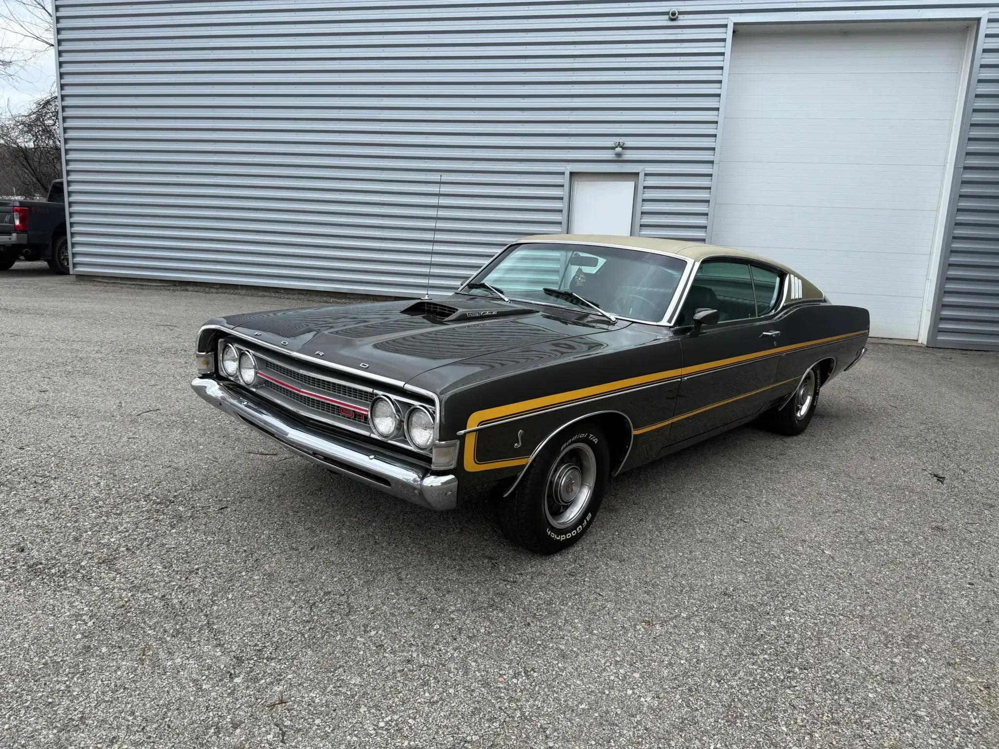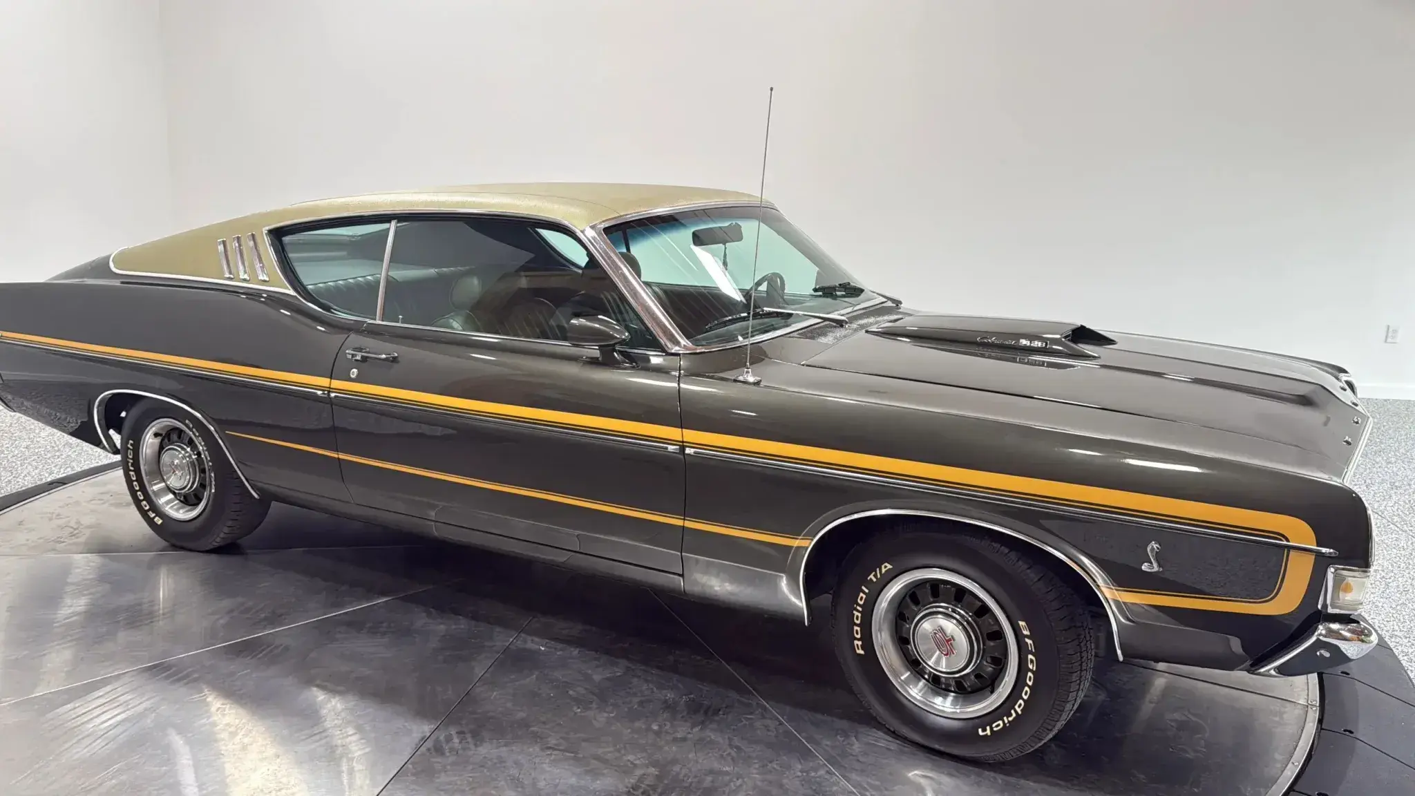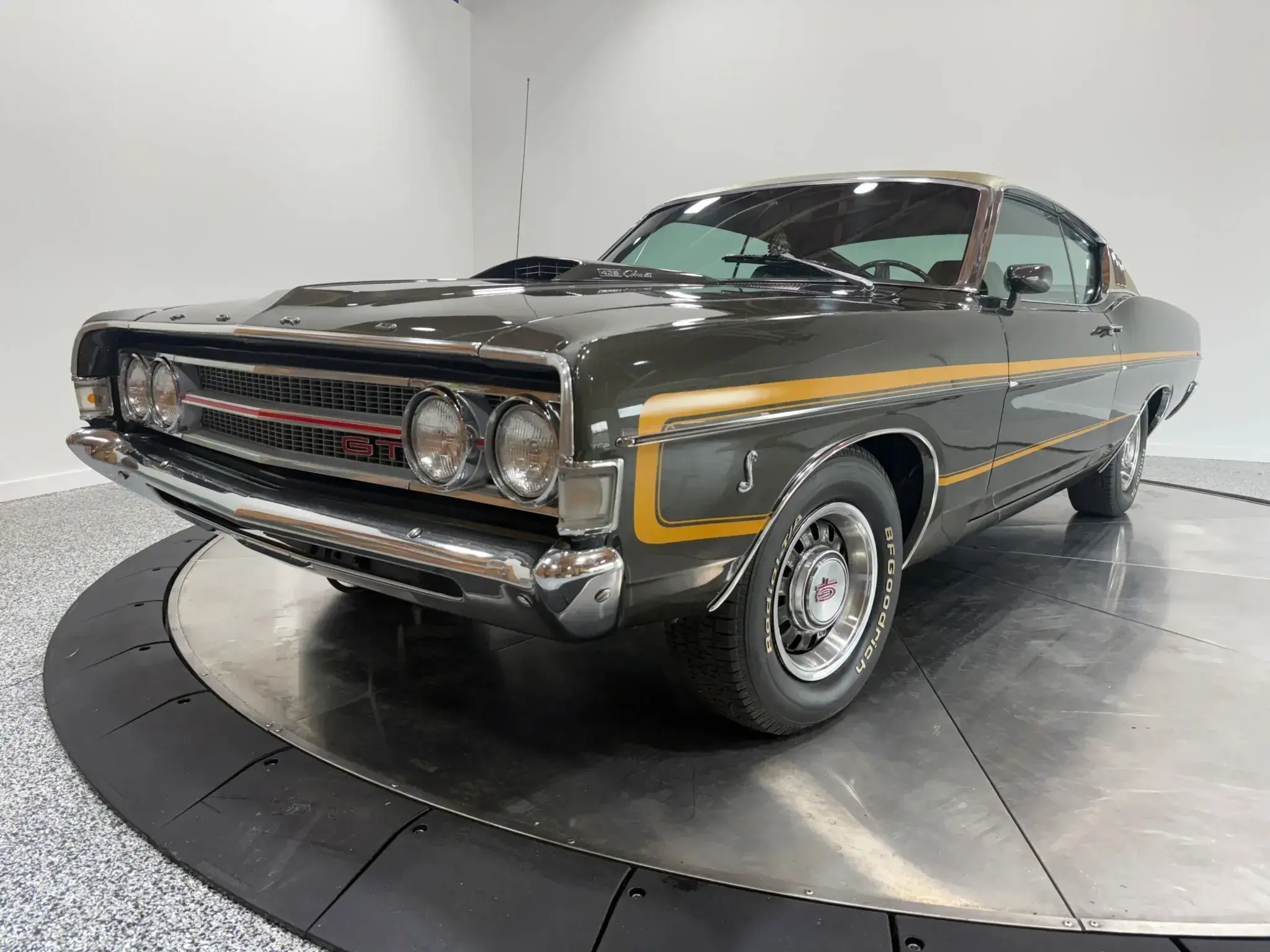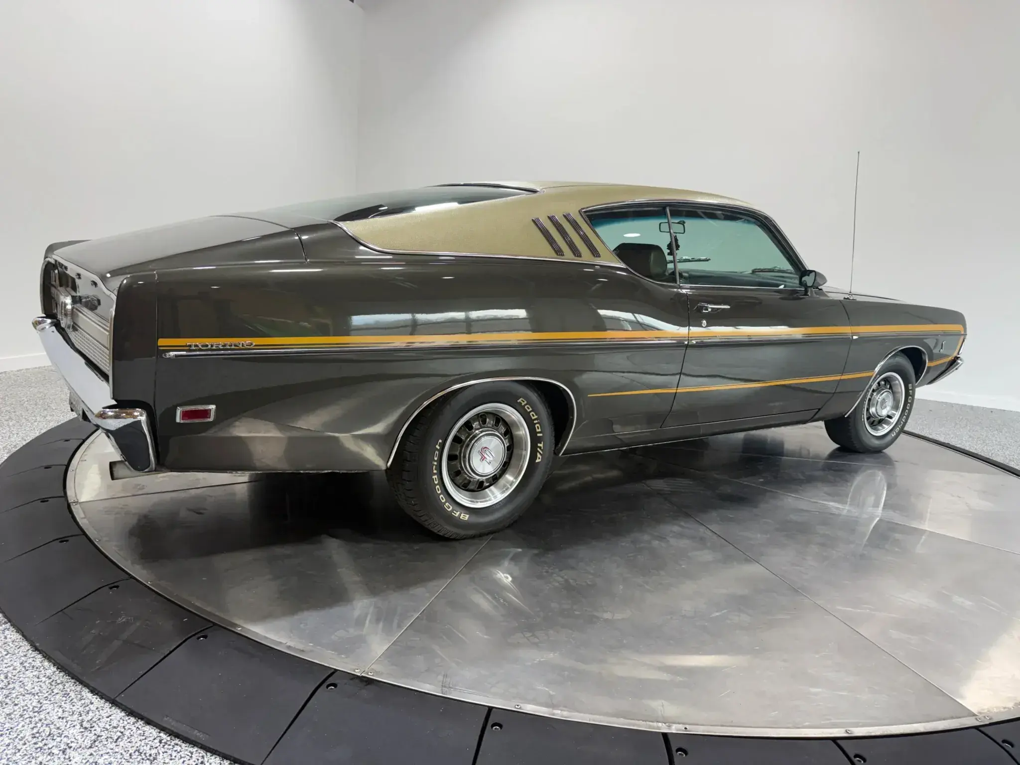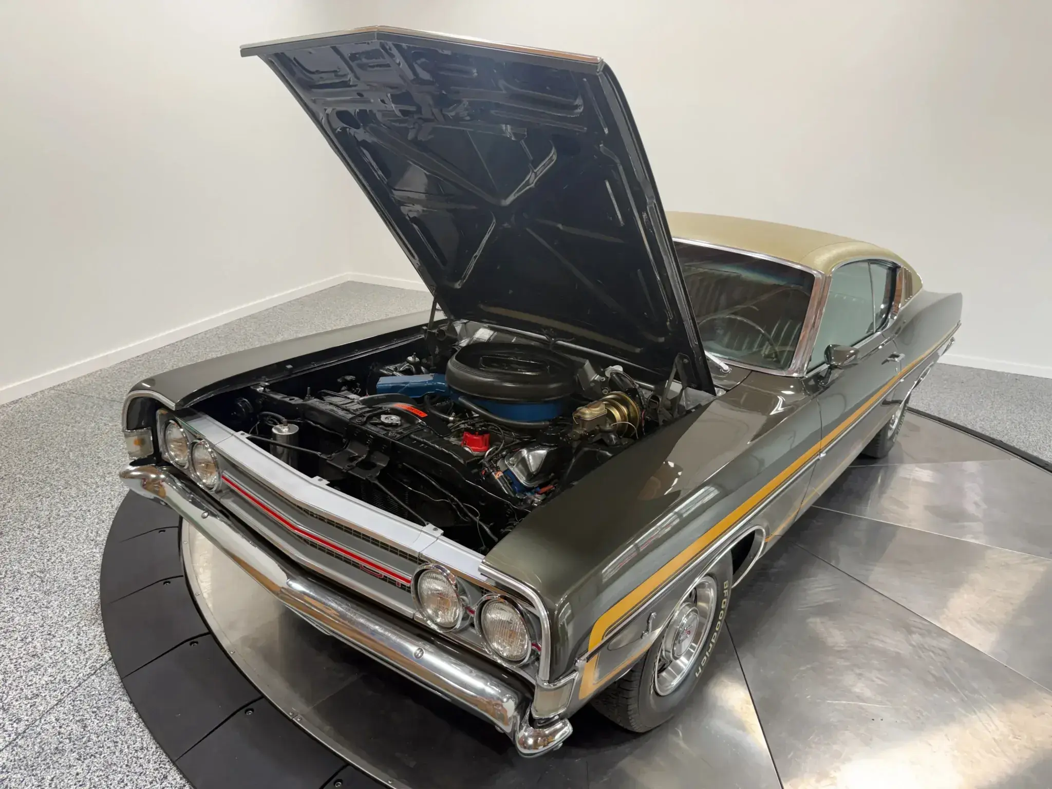 Max Motive is proud to present this 1969 Cobra Jet Torino. Finished in Jade black paint with gold stripes and a matching vinyl hard top this car cuts quite an appearance! Powered by the 428 R Code Ram air V8 engine, the build also features a Holley 600 CFM carburetor, aluminum intake, and a Ford C6 automatic transmission that delivers power to a 9-inch Posi read end.This classic muscle car is rounded out with 14-inch OEM wheels with Torino GT hubcaps wrapped in BFGoodrich Radial tires. The interior sports a unique green vinyl finish that is in great condition. Authenticated by an included Marti Report, this high performance classic is also equipped with power front disc brakes delivering confident stopping power whenever it is needed. This car is a time capsule to the American muscle car era ready for its next home!